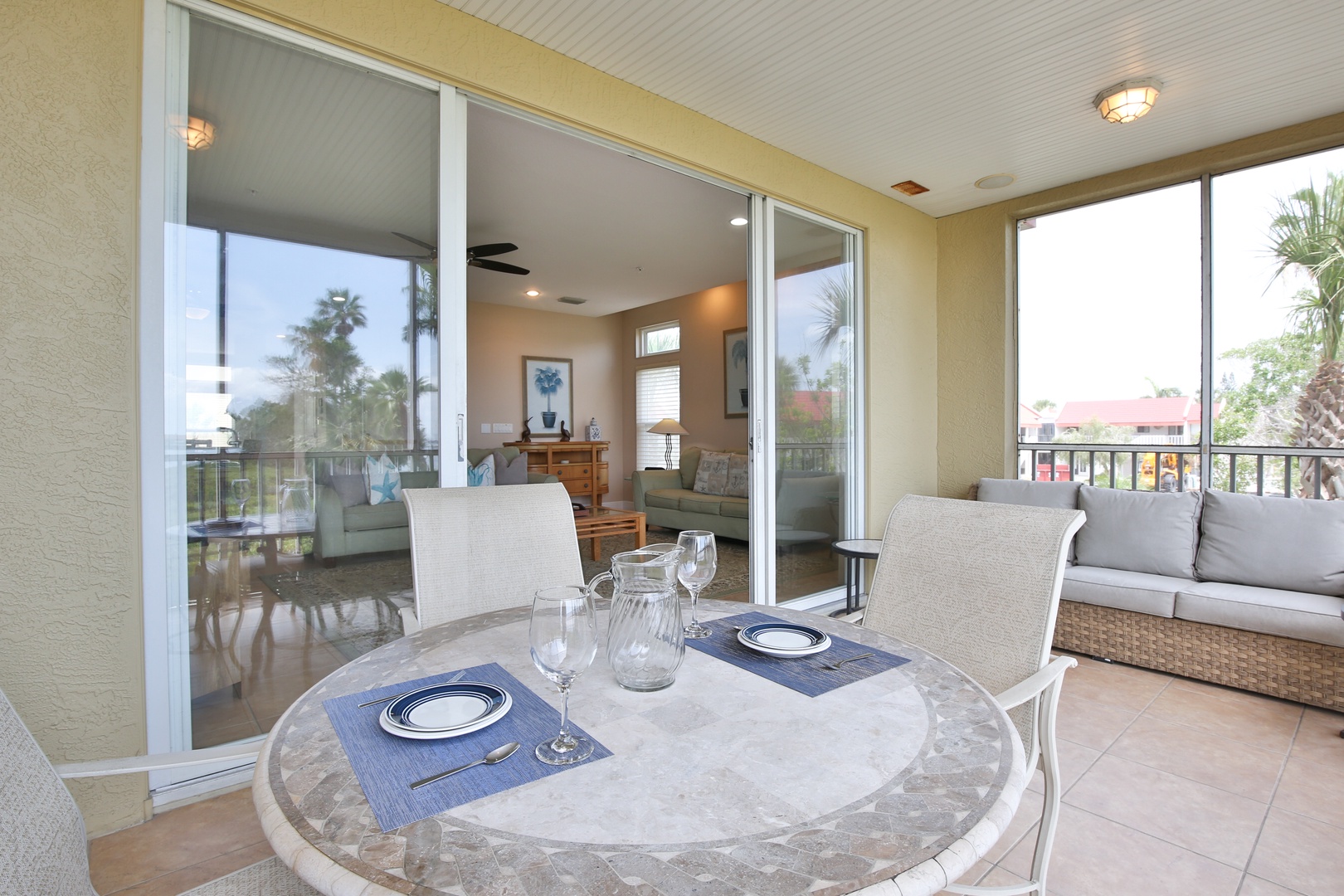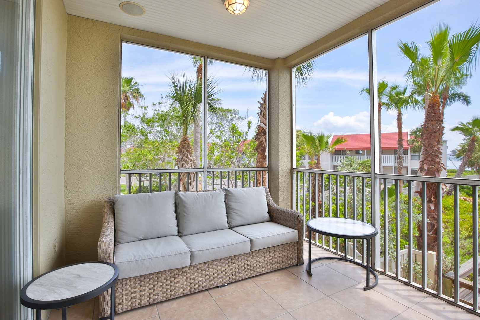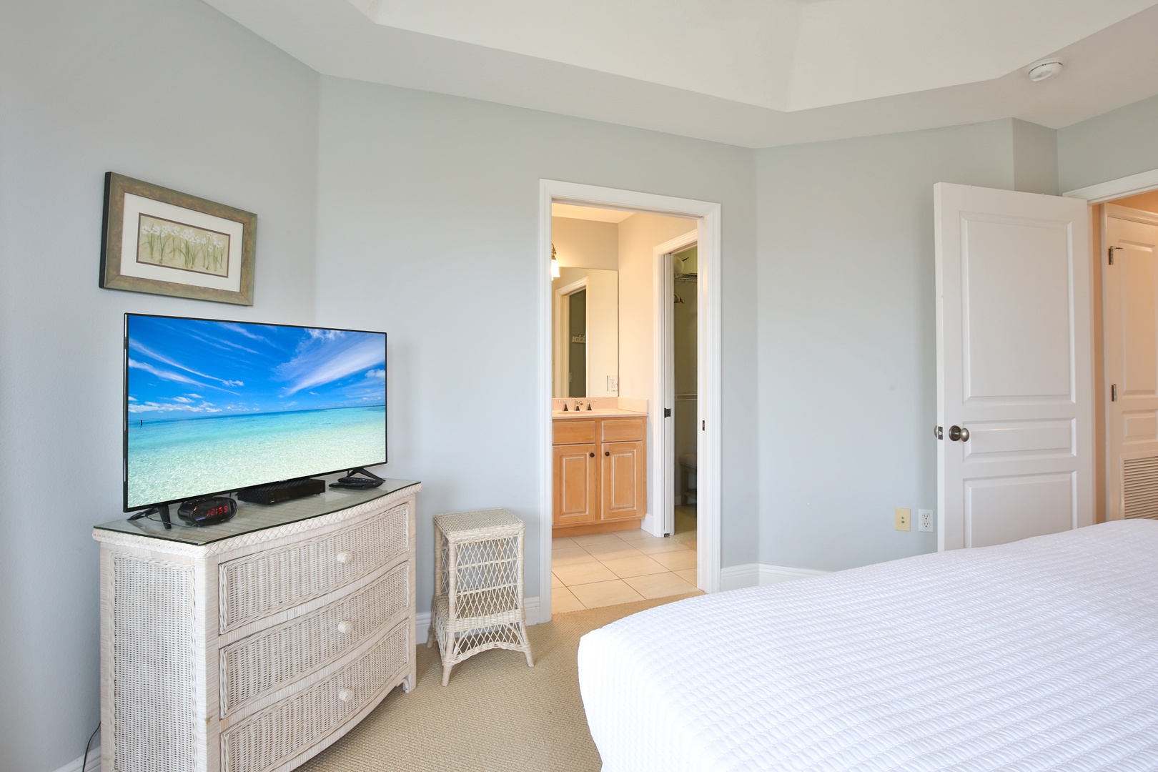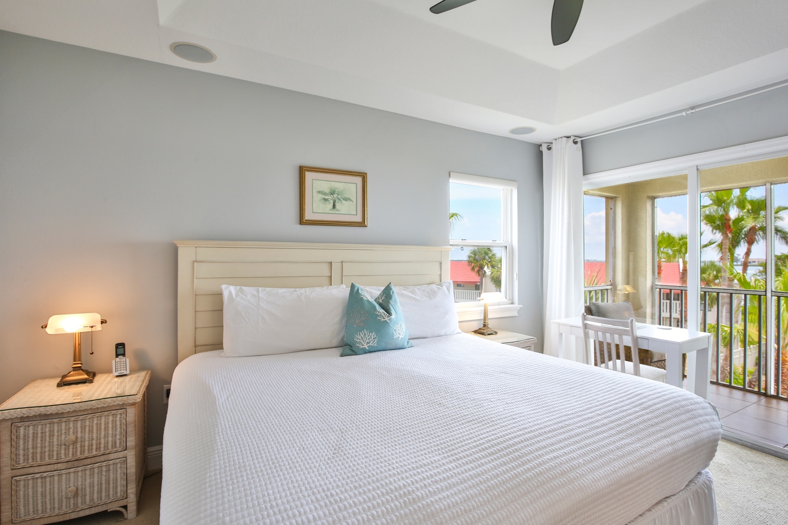 - Master bedroom with king bed, private screened-in balcony, and ensuite bathroom