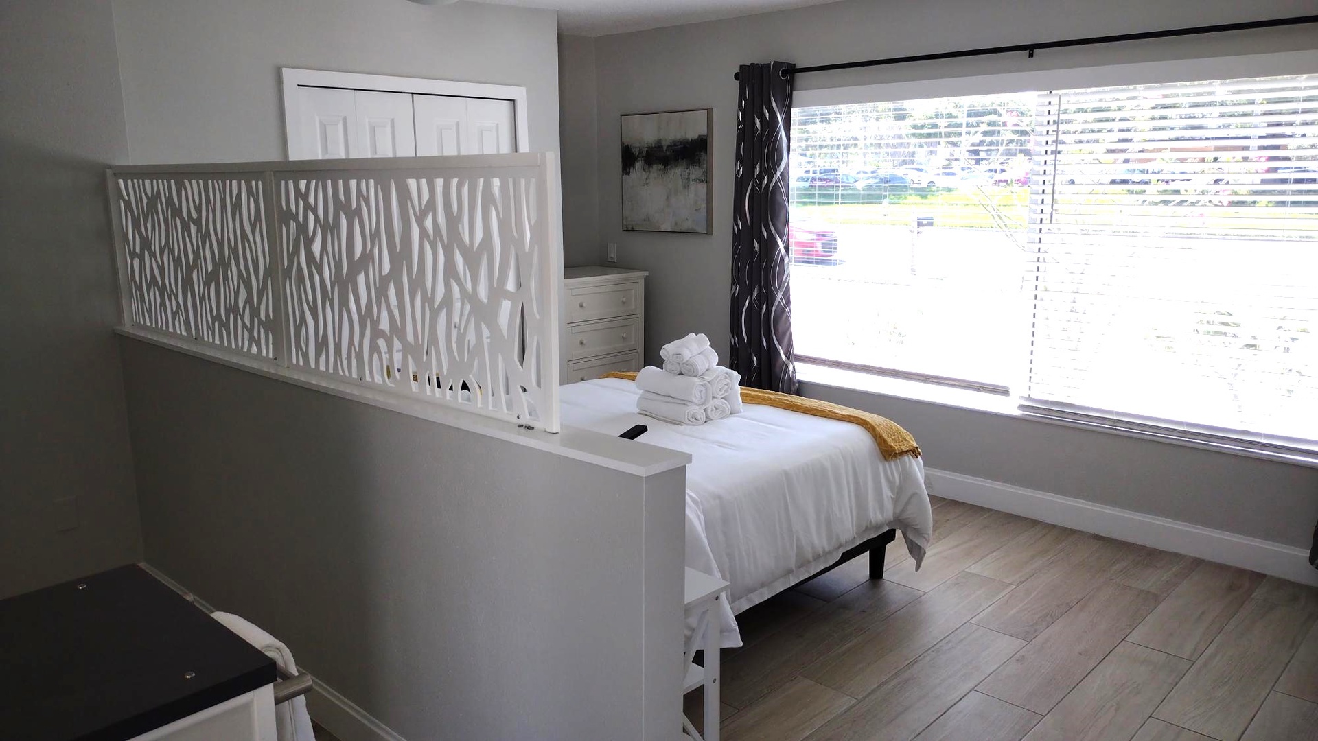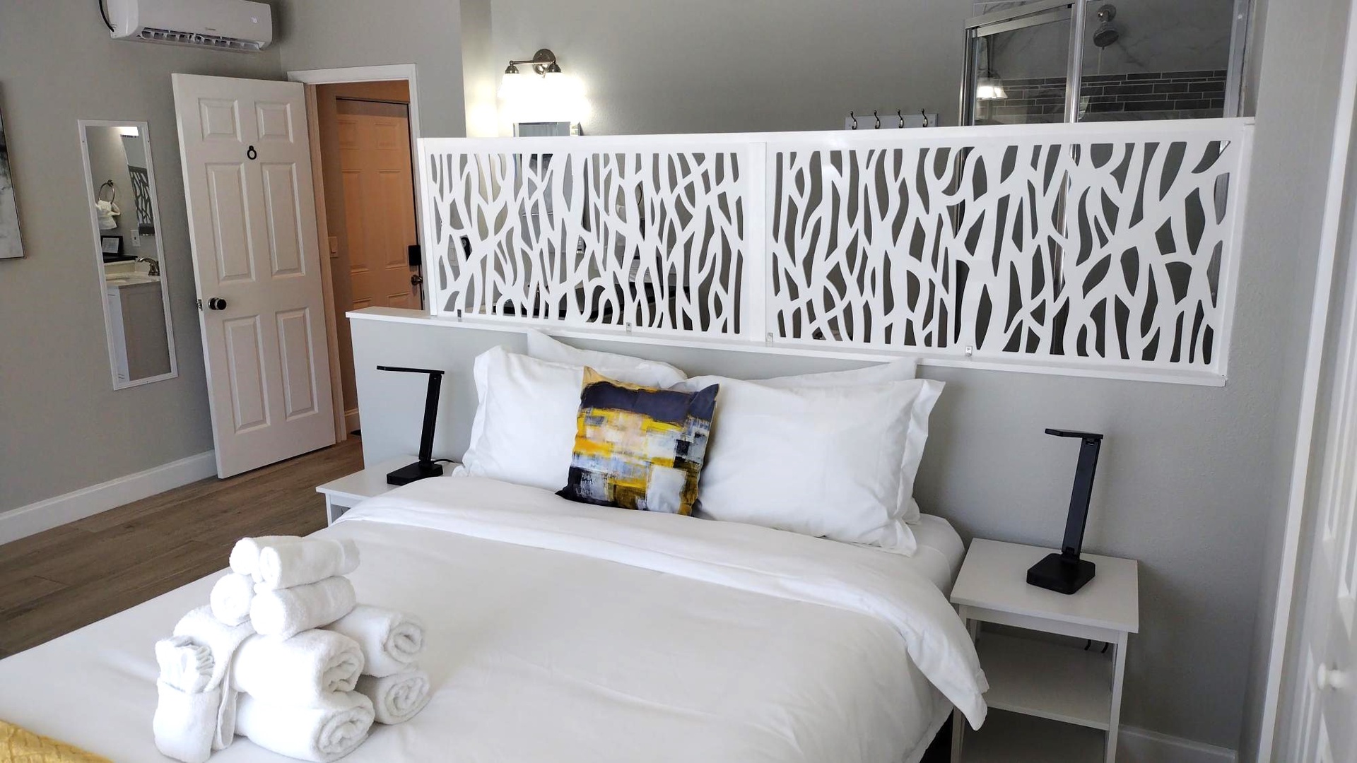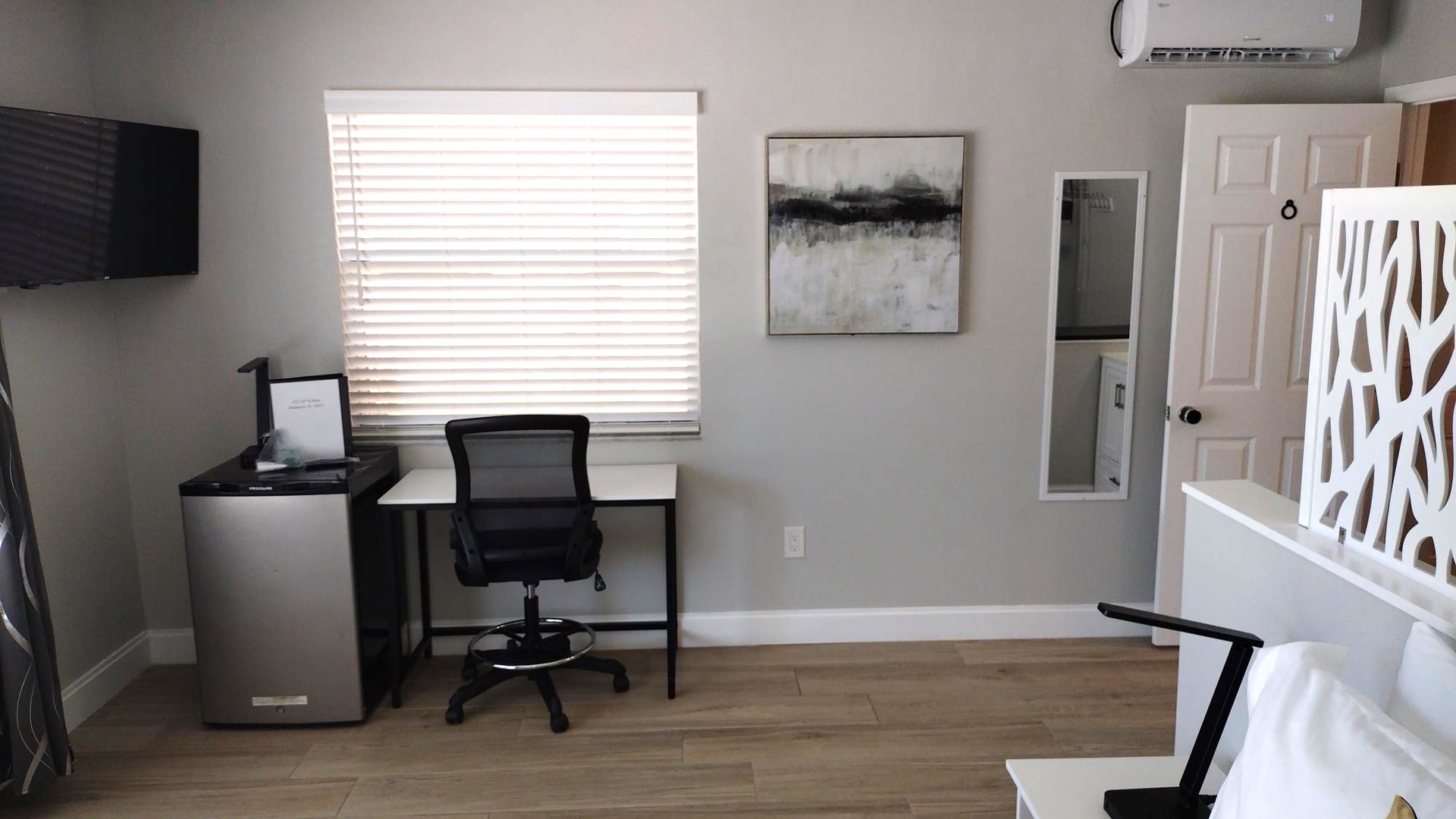 - Private in-room amenities include mini-fridge and 40” Roku TV