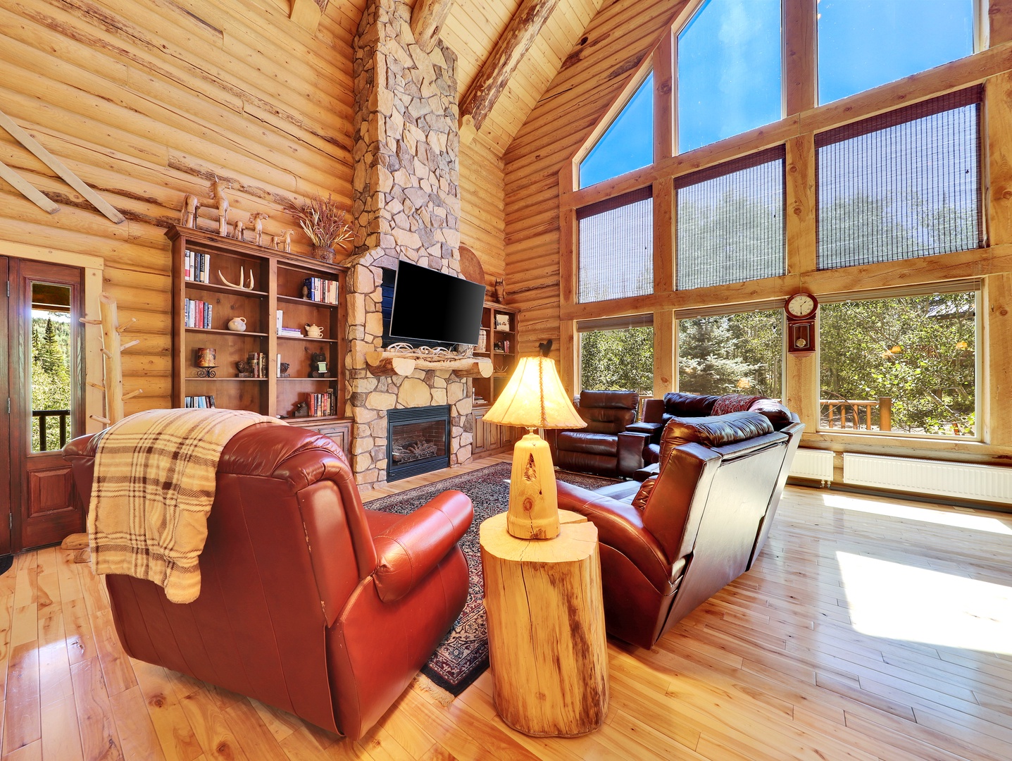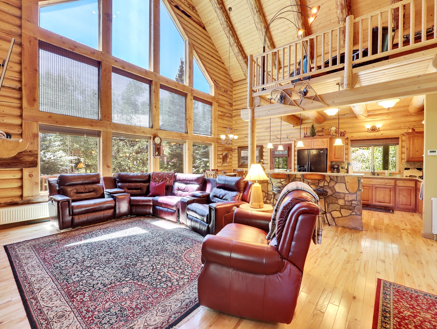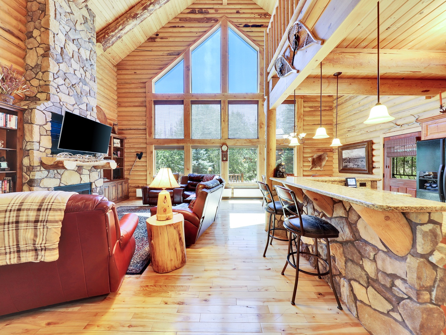 As you step inside, you’ll be greeted by the warm glow of natural light pouring through expansive floor-to-ceiling windows, framing breathtaking views of the surrounding mountains and forests. The spacious living area features plush leather seating arranged around the stone fireplace, creating a cozy atmosphere perfect for relaxing after a day of mountain adventures.
