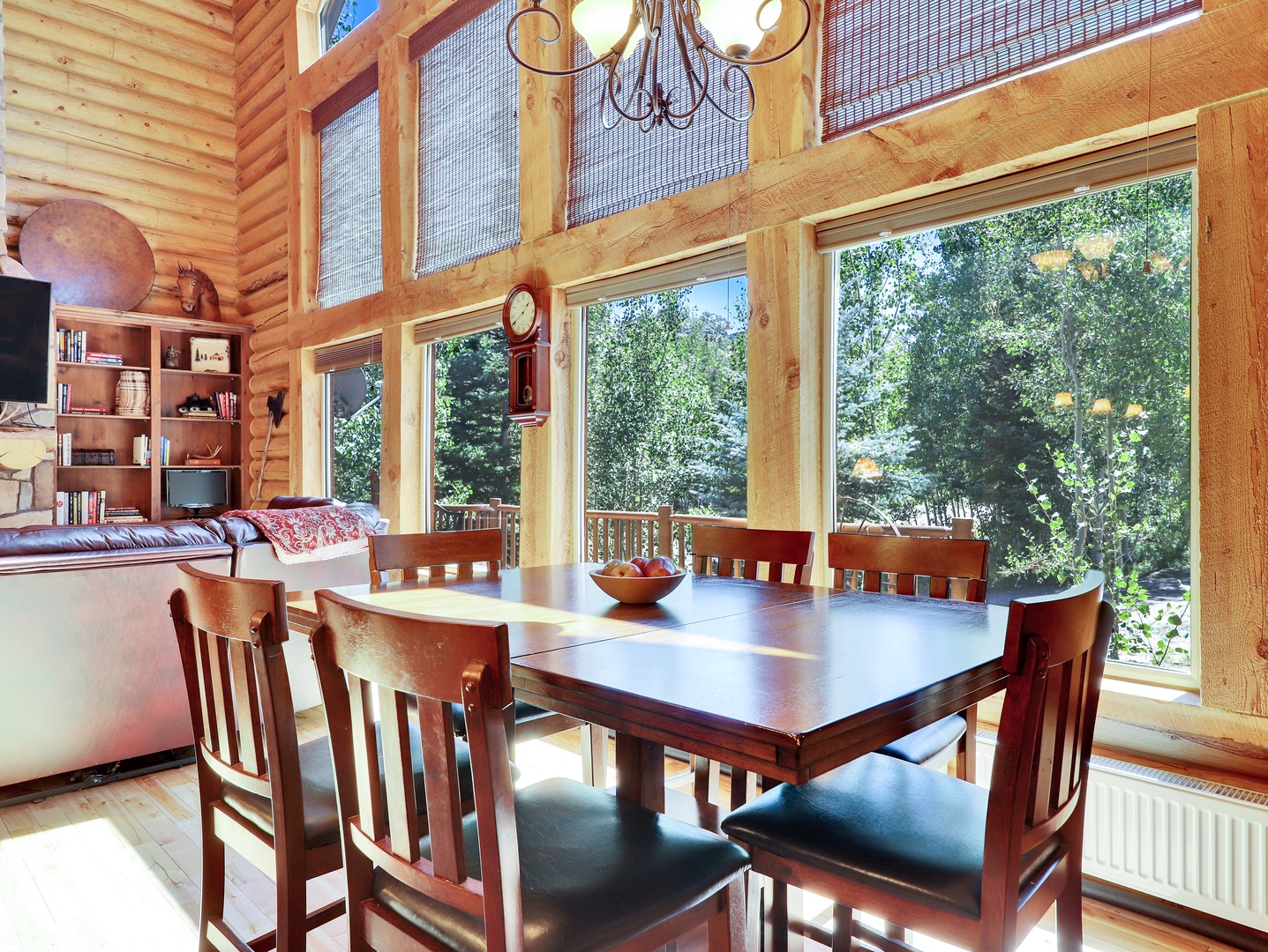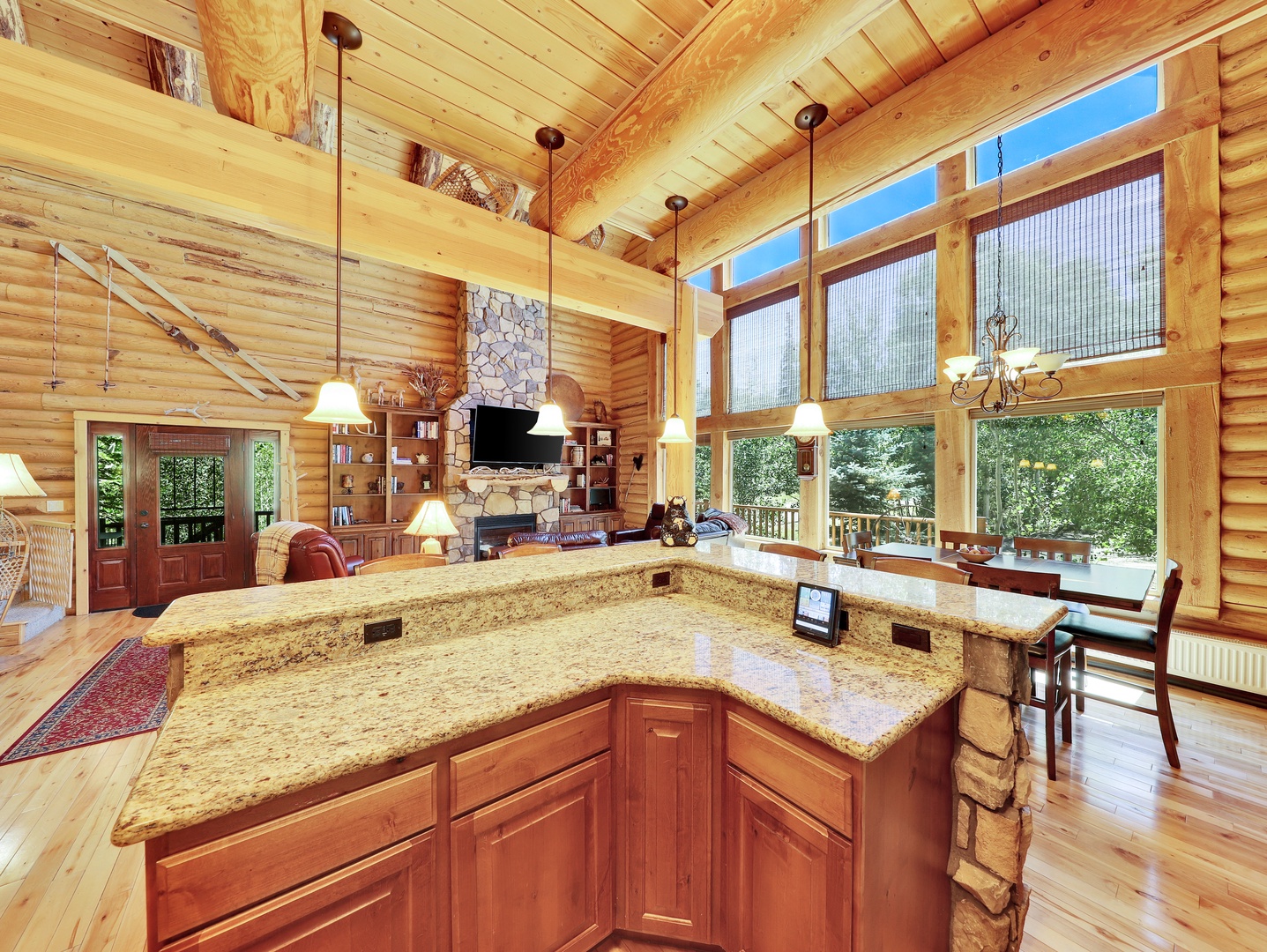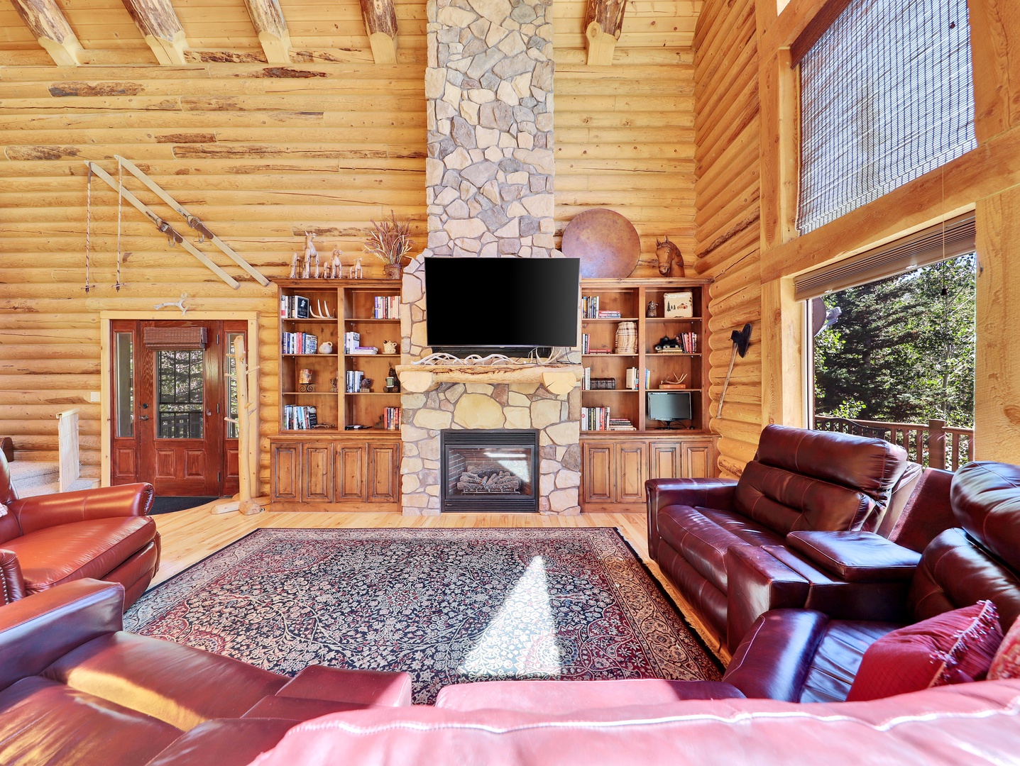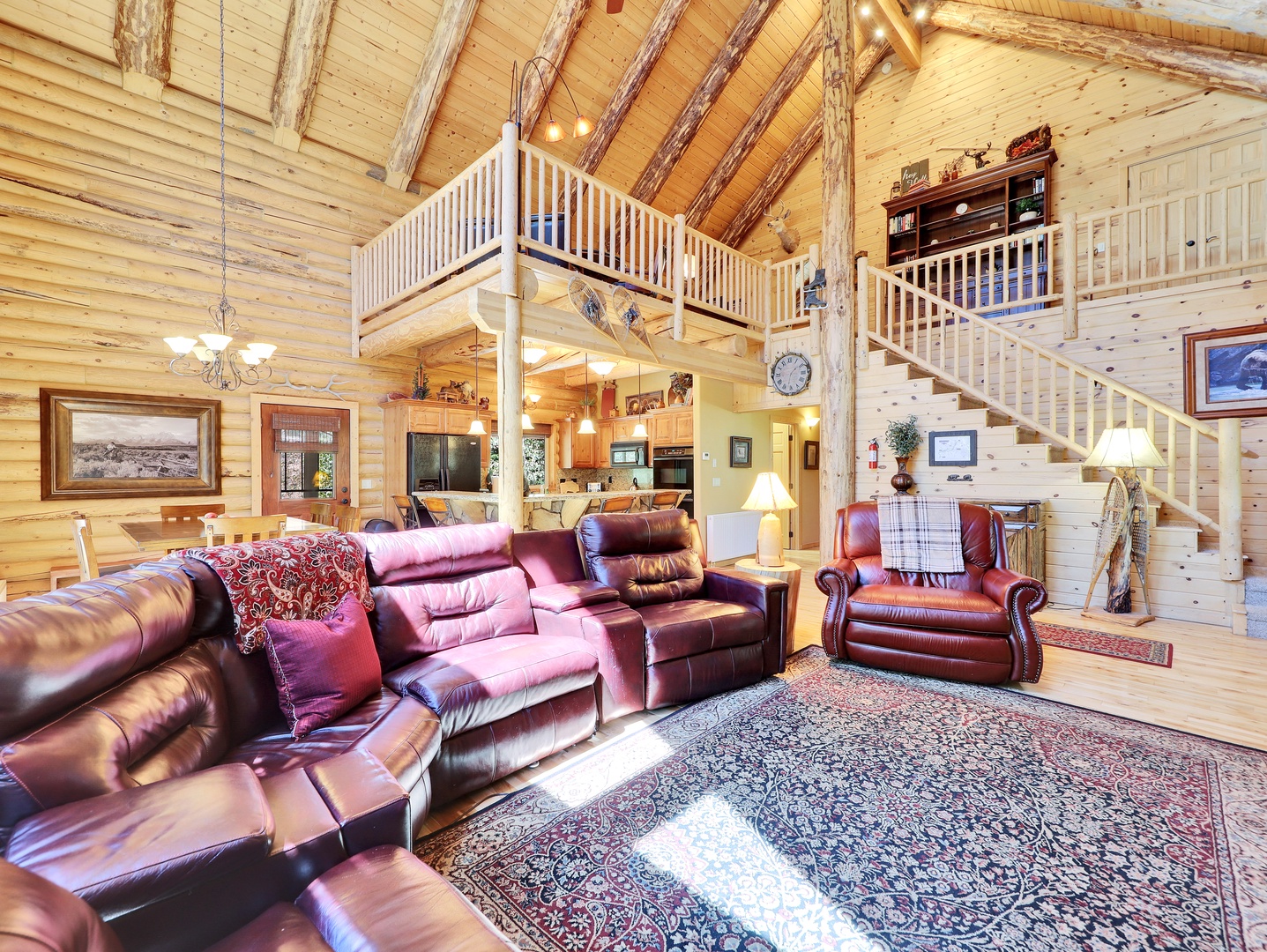 As you step inside, you’ll be greeted by the warm glow of natural light pouring through expansive floor-to-ceiling windows, framing breathtaking views of the surrounding mountains and forests. The spacious living area features plush leather seating arranged around the stone fireplace, creating a cozy atmosphere perfect for relaxing after a day of mountain adventures.