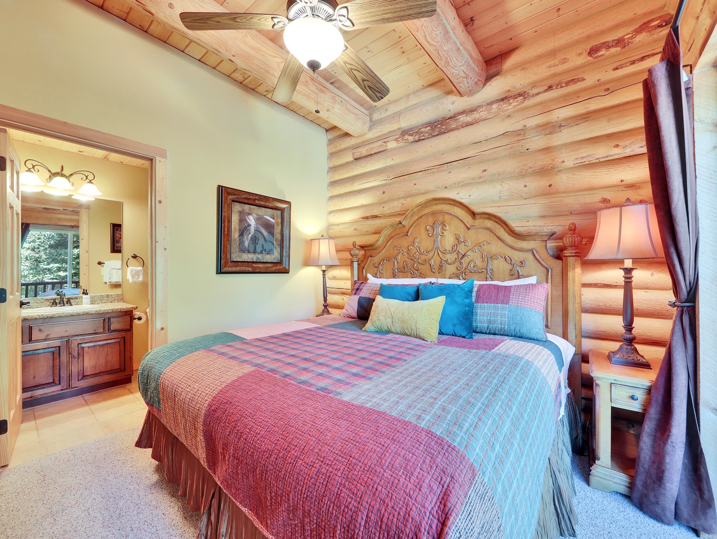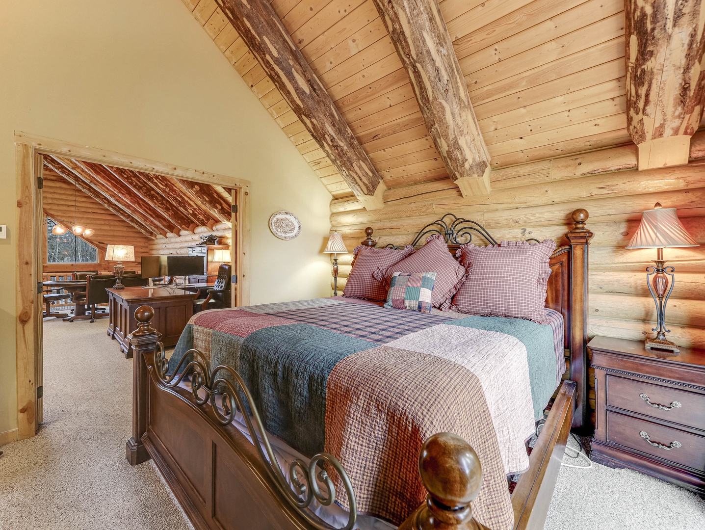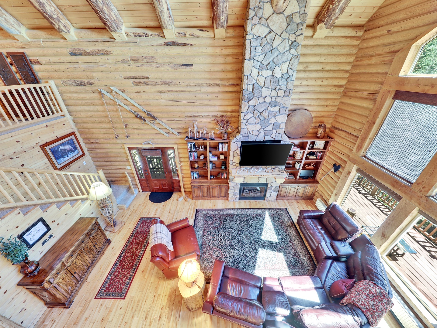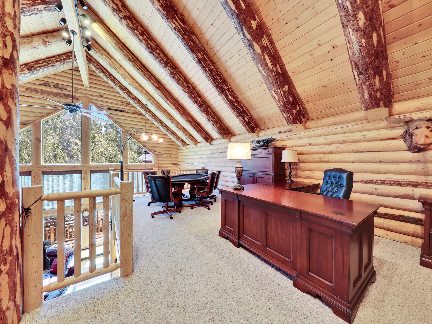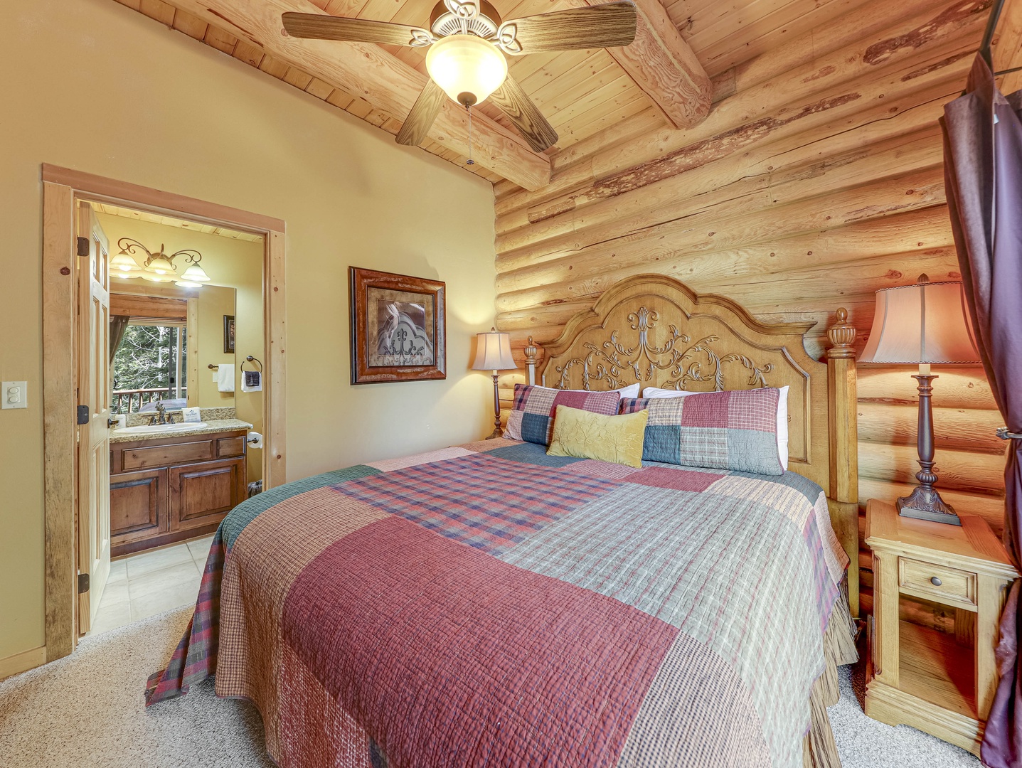 A loft overlooks the main living area, providing a cozy space for reading or simply taking in the beauty of the cabin’s architecture. The bedrooms are designed as serene retreats, with plush bedding and warm wood accents that enhance the cabin’s rustic elegance. Modern bathrooms offer a spa-like experience, with all the amenities you need for a luxurious stay.