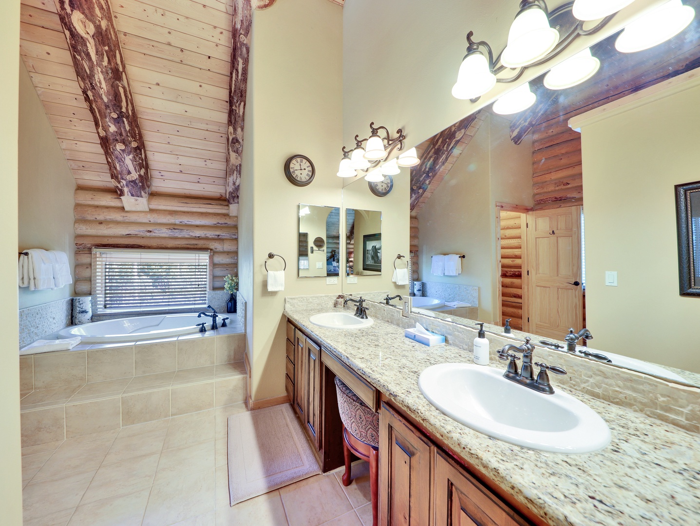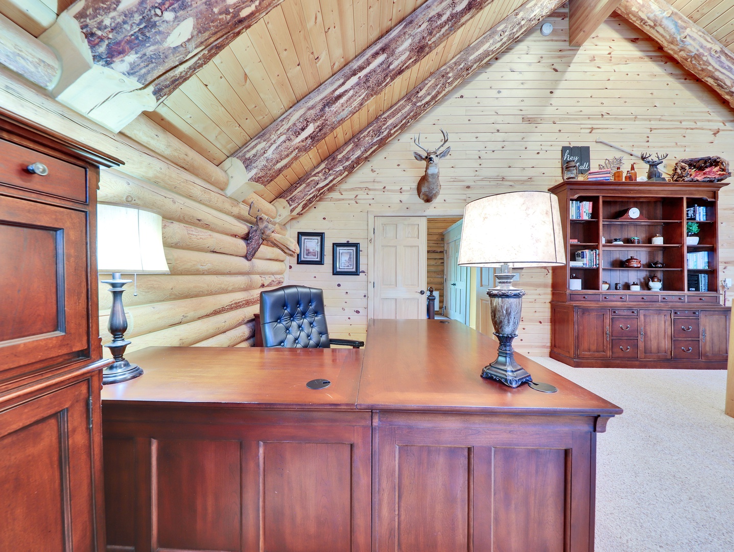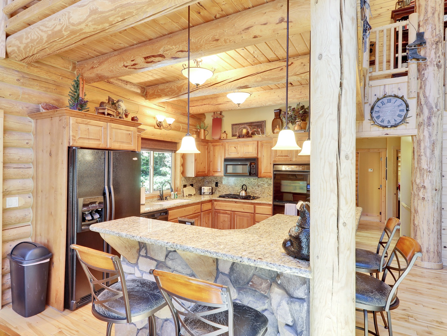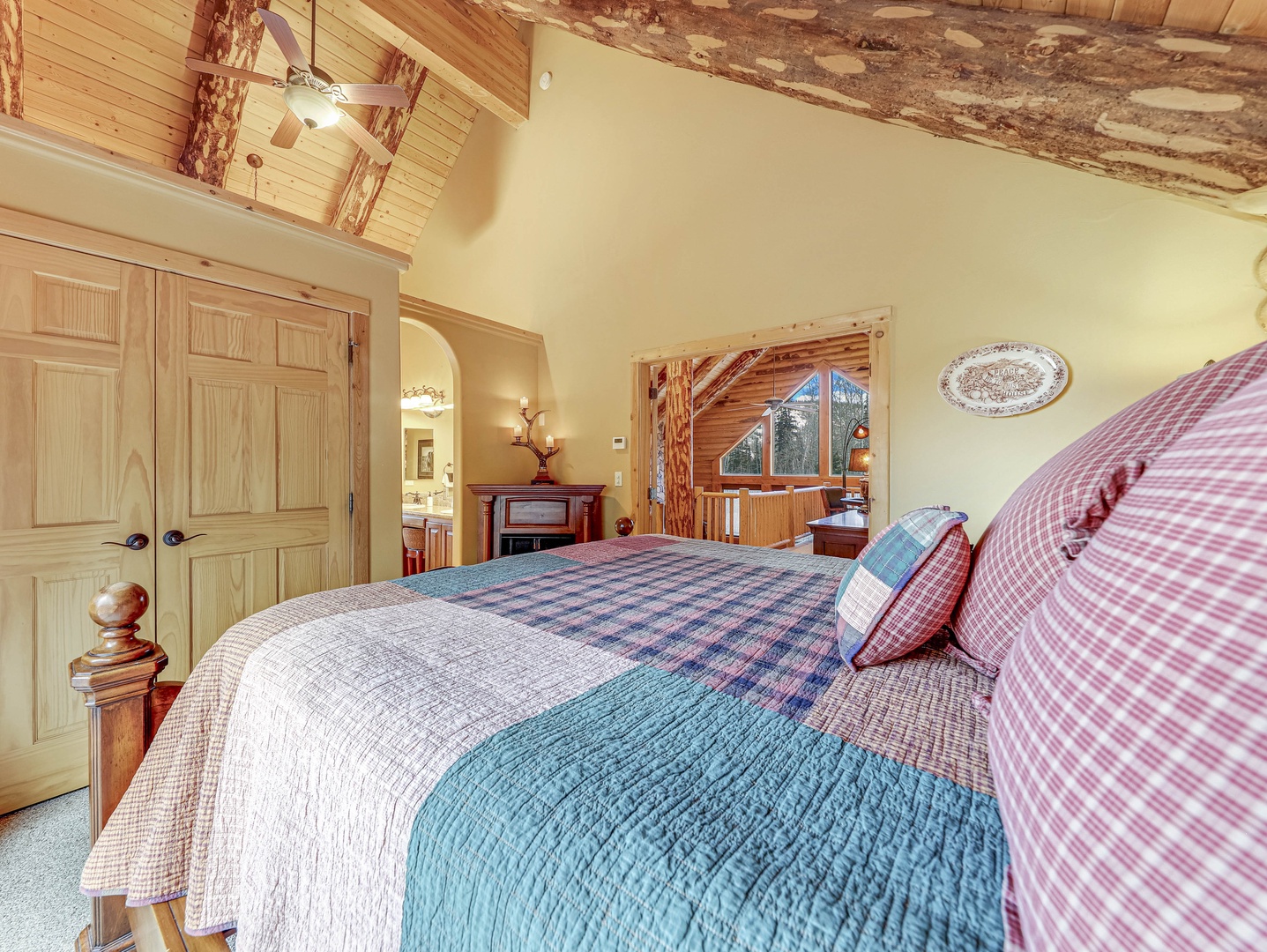 A loft overlooks the main living area, providing a cozy space for reading or simply taking in the beauty of the cabin’s architecture. The bedrooms are designed as serene retreats, with plush bedding and warm wood accents that enhance the cabin’s rustic elegance. Modern bathrooms offer a spa-like experience, with all the amenities you need for a luxurious stay.
