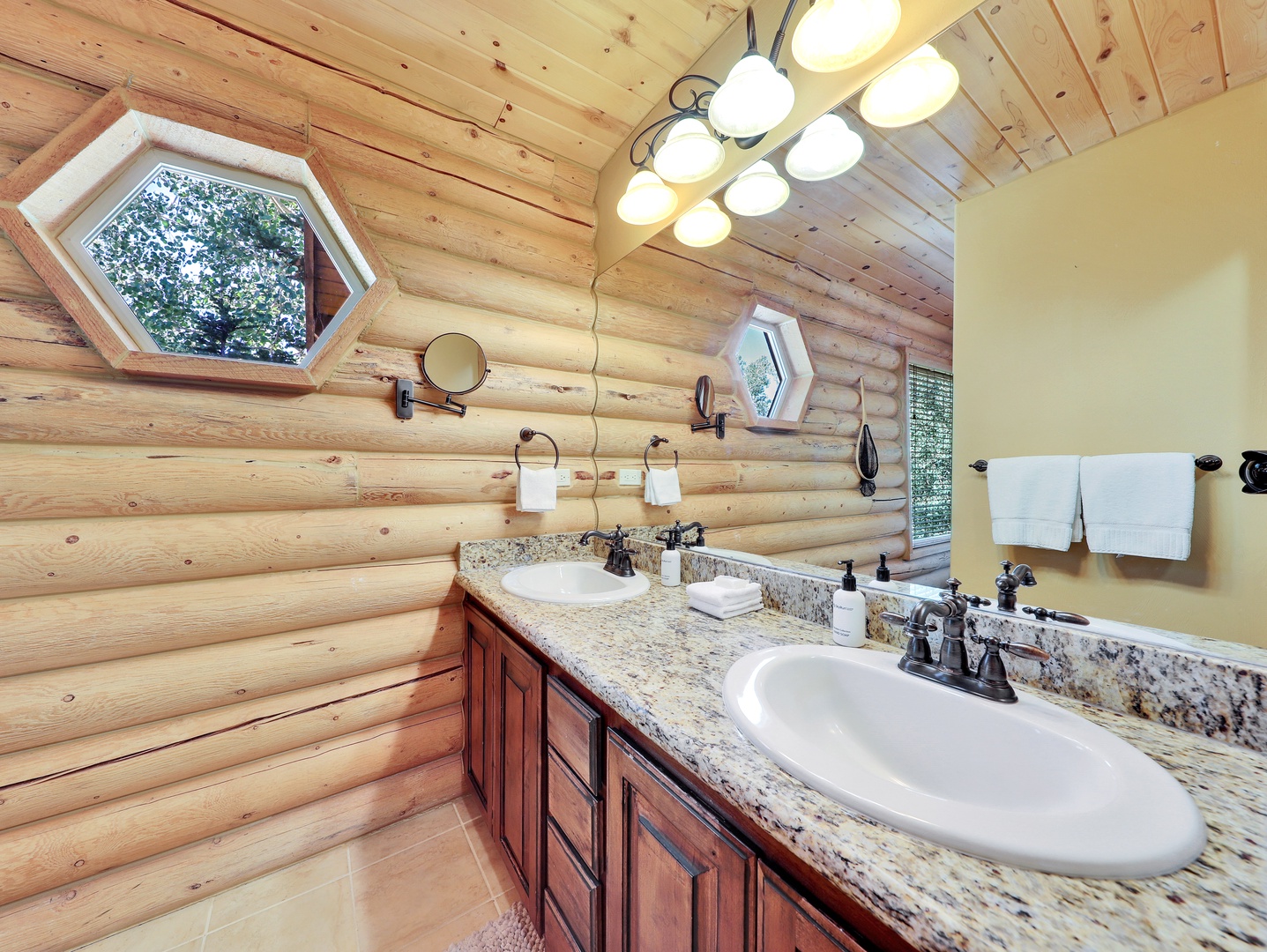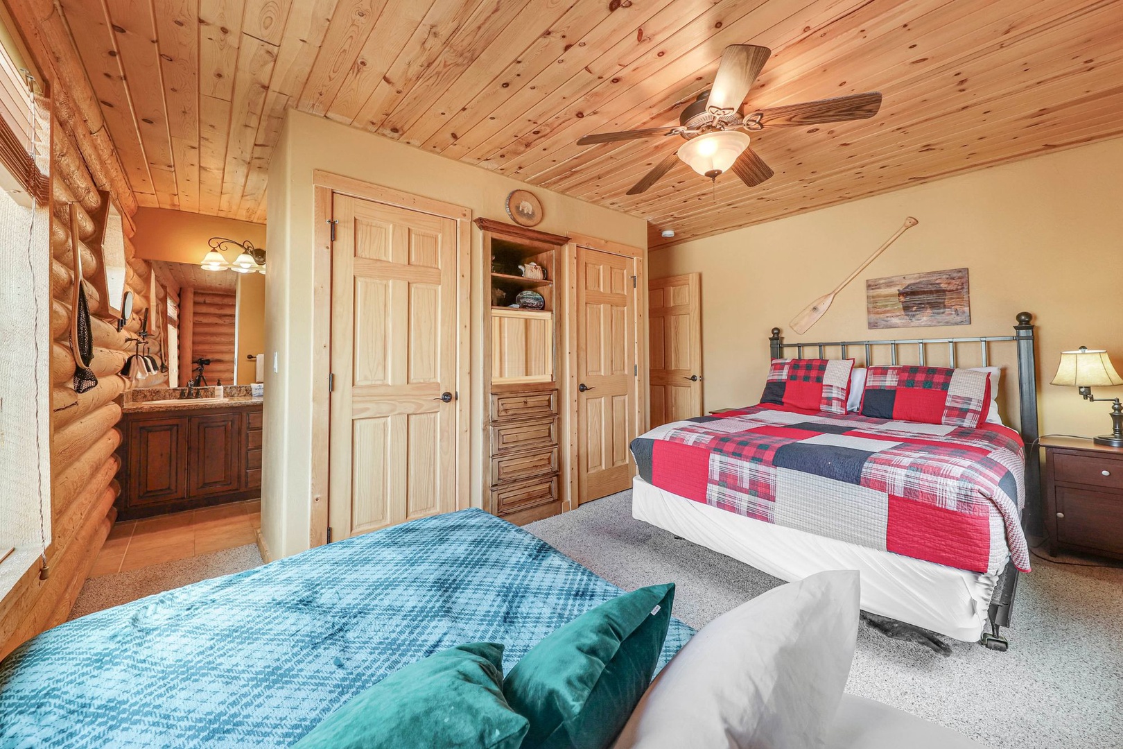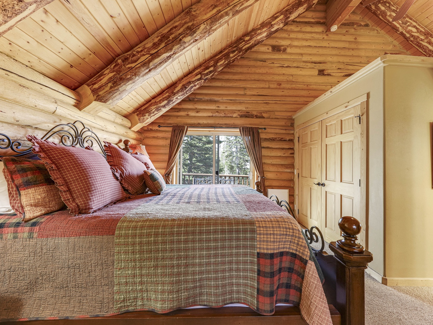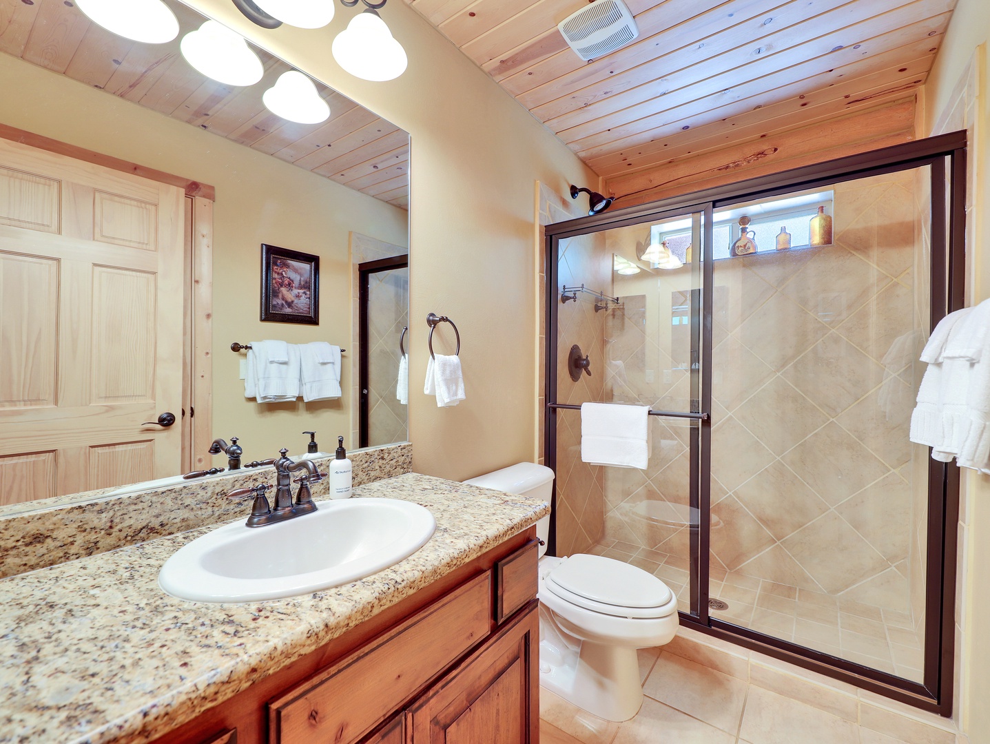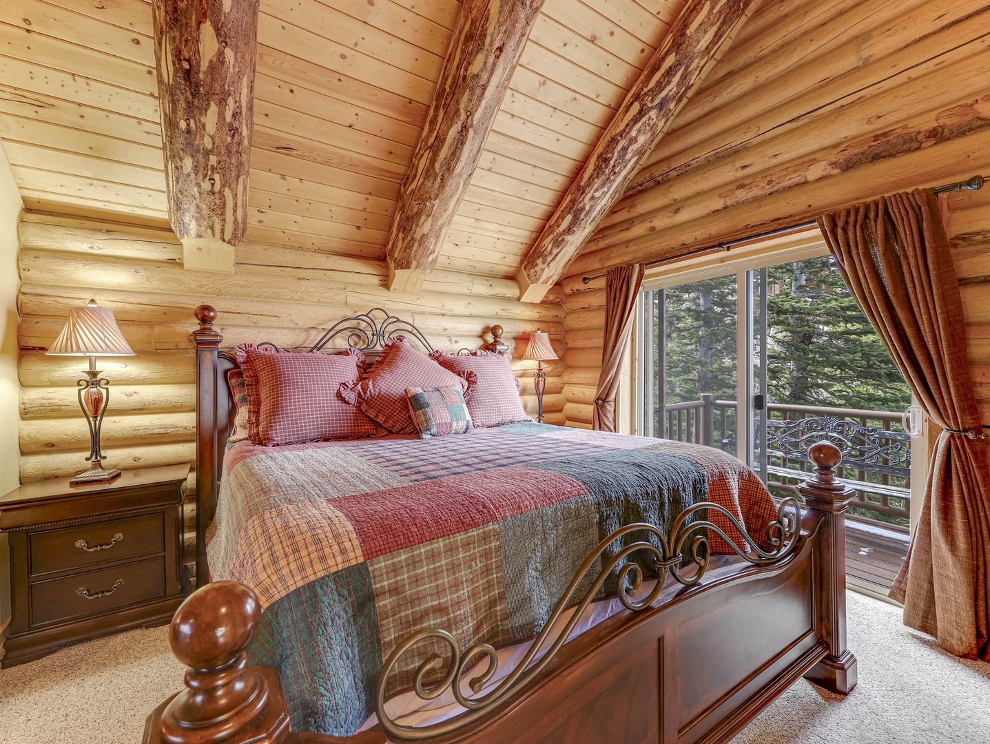 A loft overlooks the main living area, providing a cozy space for reading or simply taking in the beauty of the cabin’s architecture. The bedrooms are designed as serene retreats, with plush bedding and warm wood accents that enhance the cabin’s rustic elegance. Modern bathrooms offer a spa-like experience, with all the amenities you need for a luxurious stay.