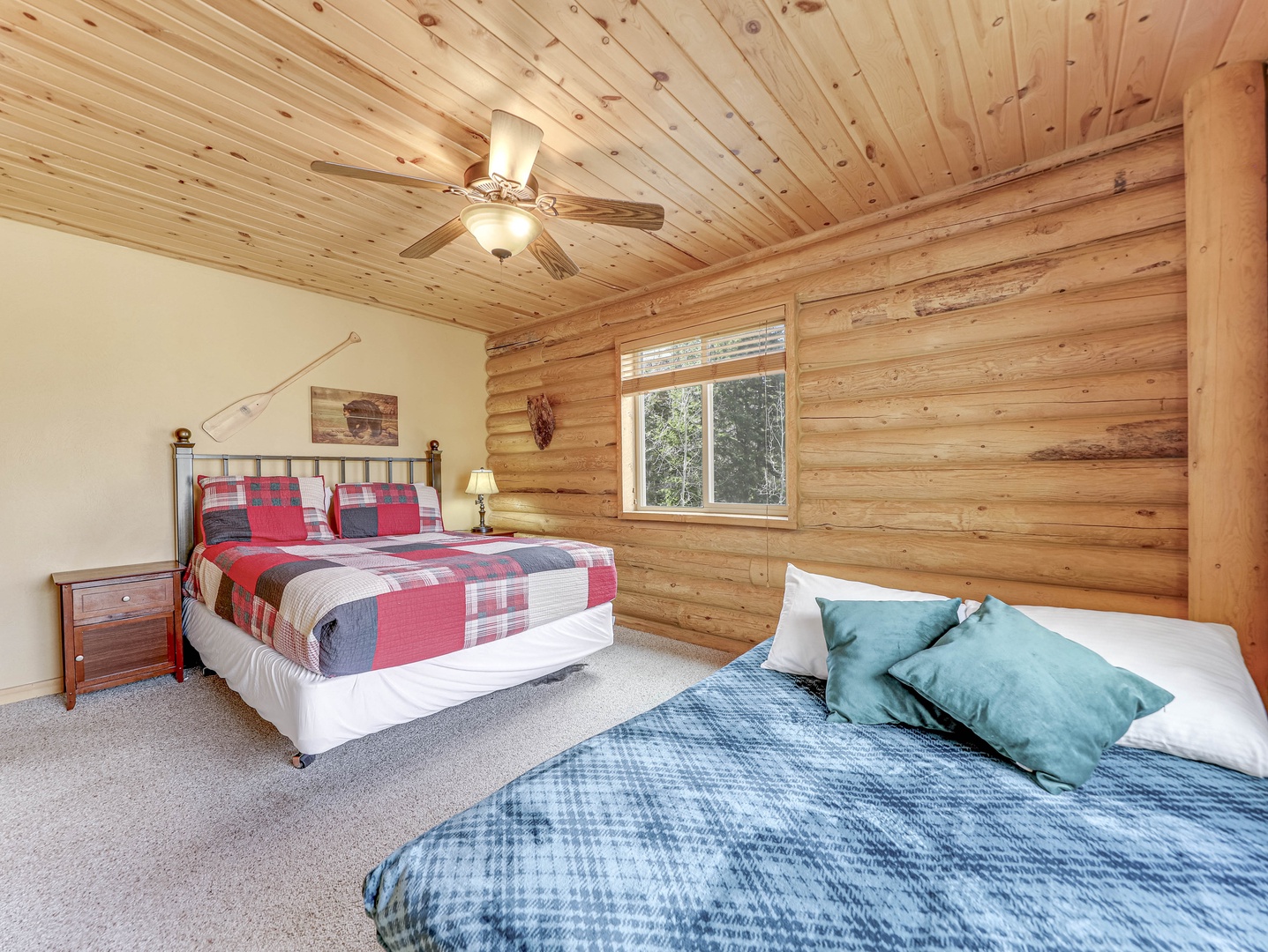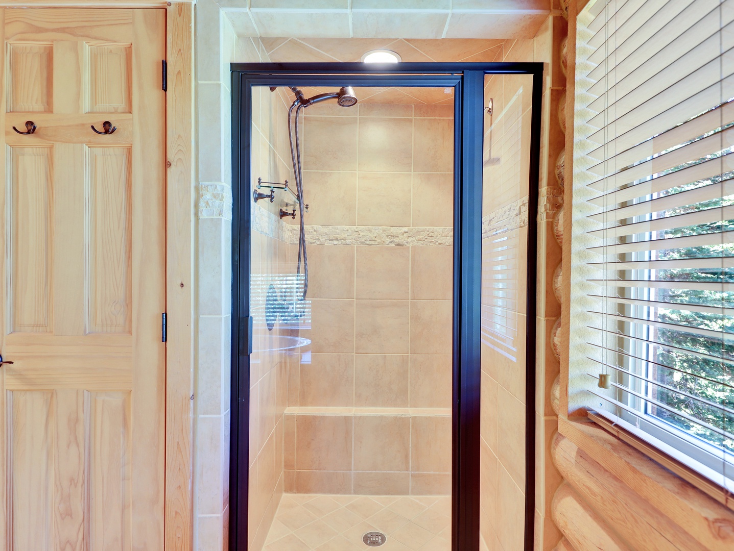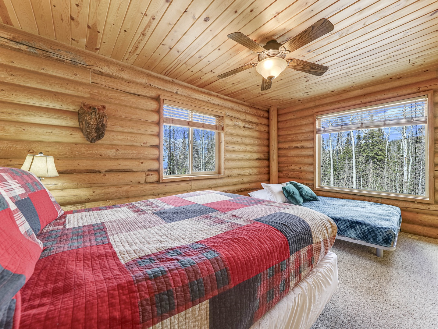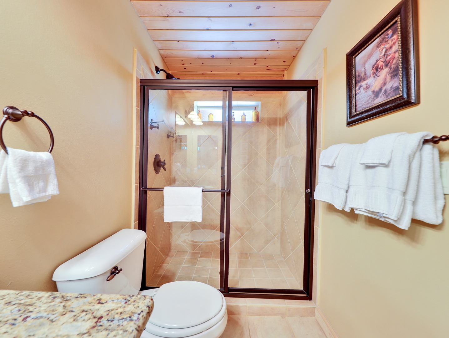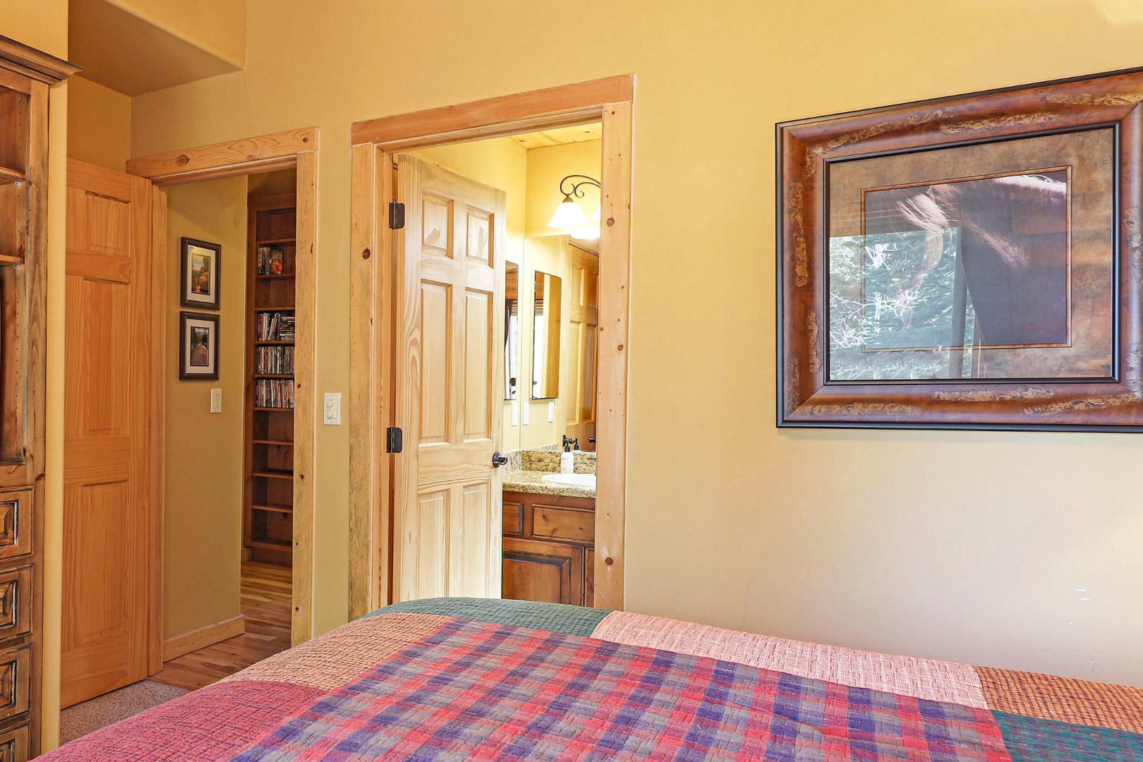 A loft overlooks the main living area, providing a cozy space for reading or simply taking in the beauty of the cabin’s architecture. The bedrooms are designed as serene retreats, with plush bedding and warm wood accents that enhance the cabin’s rustic elegance. Modern bathrooms offer a spa-like experience, with all the amenities you need for a luxurious stay.