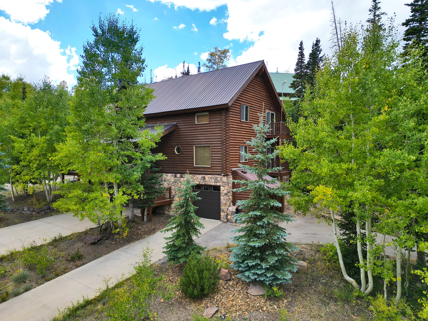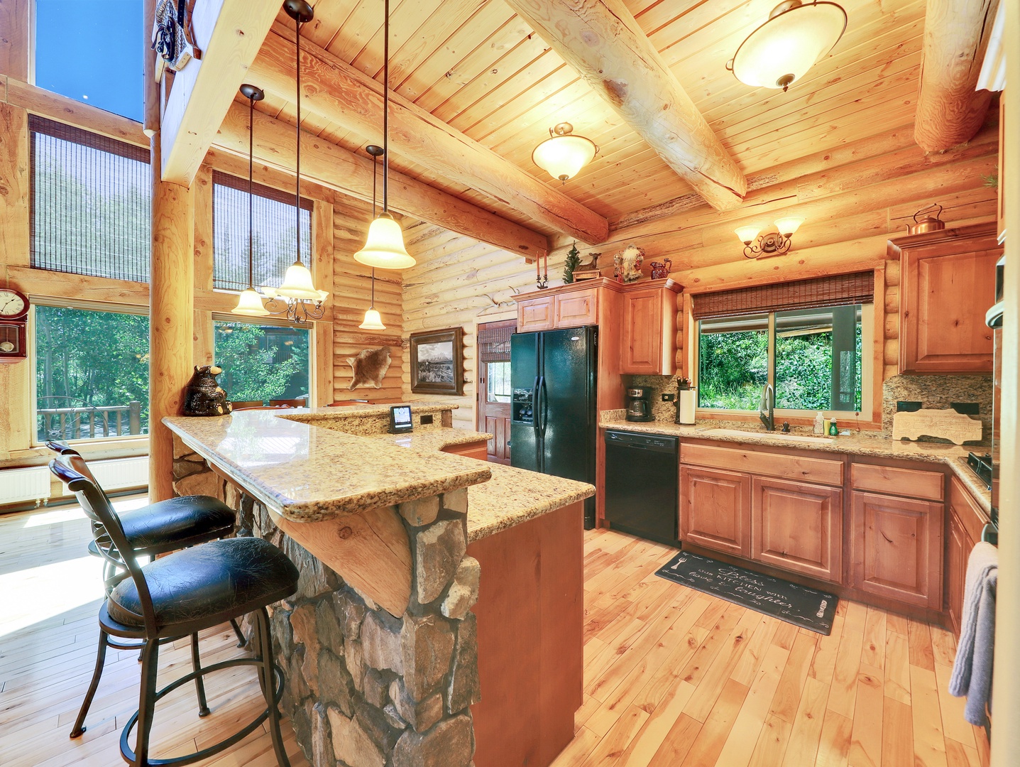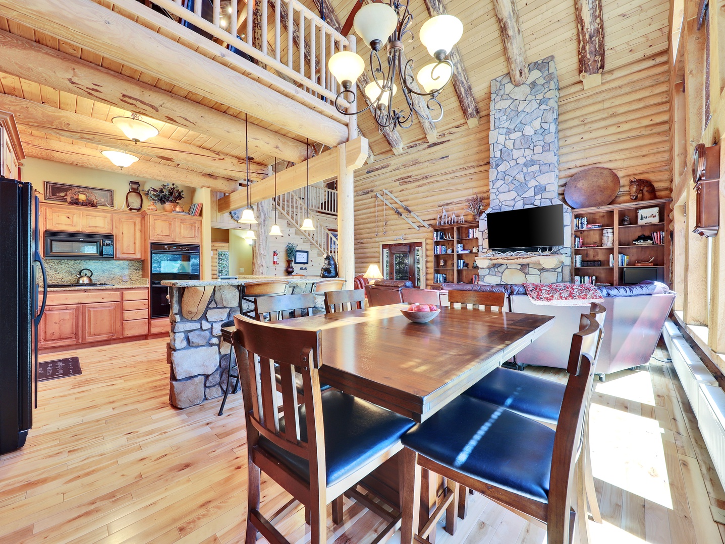 Welcome to Heavenly Haven, your luxurious mountain retreat in Brian Head, UT. This stunning 3-bedroom, 3-bathroom cabin beautifully blends rustic charm with modern comfort, offering an inviting space with exposed log walls and a majestic floor-to-ceiling stone fireplace as the centerpiece of the open-concept living area.