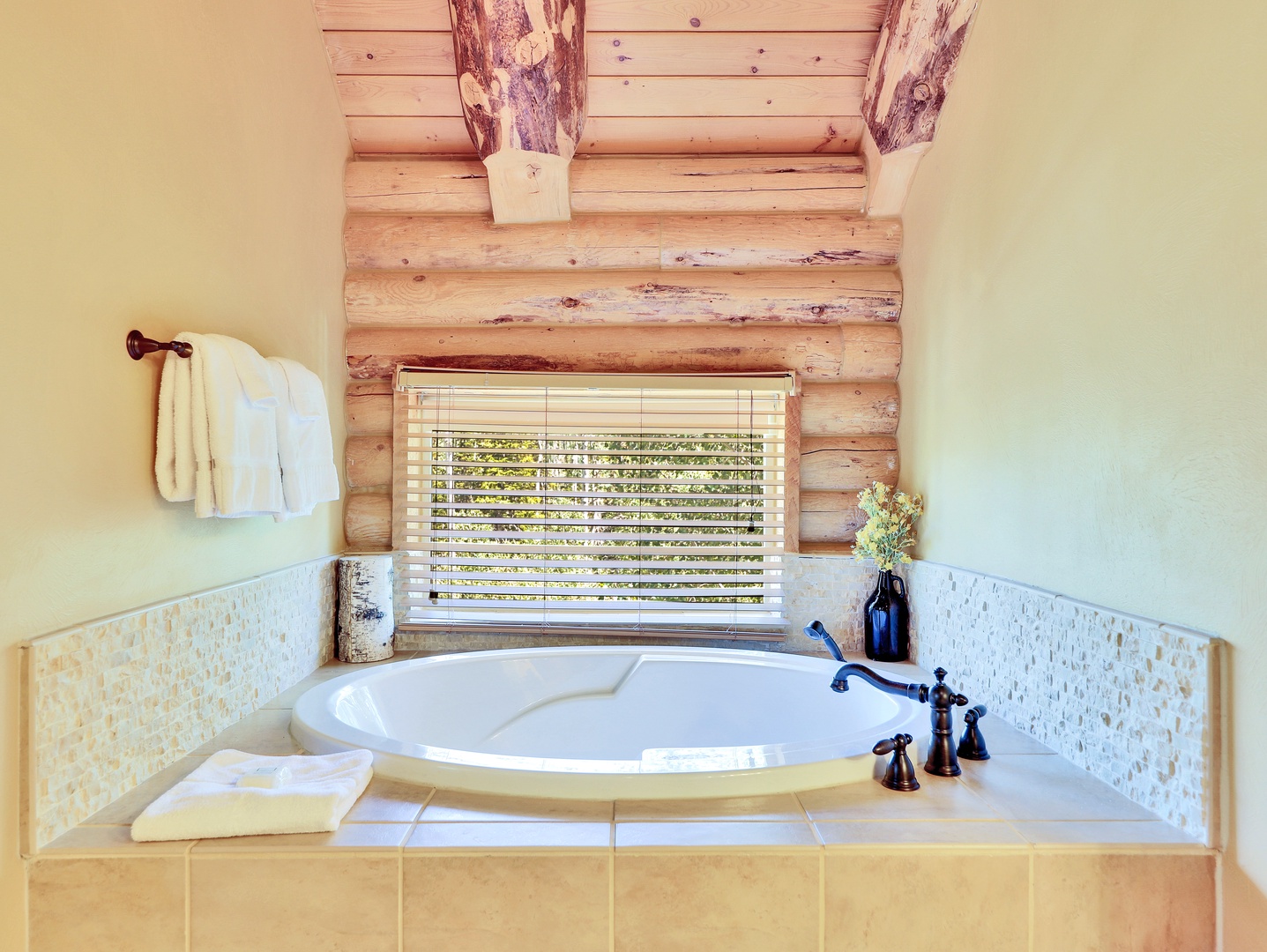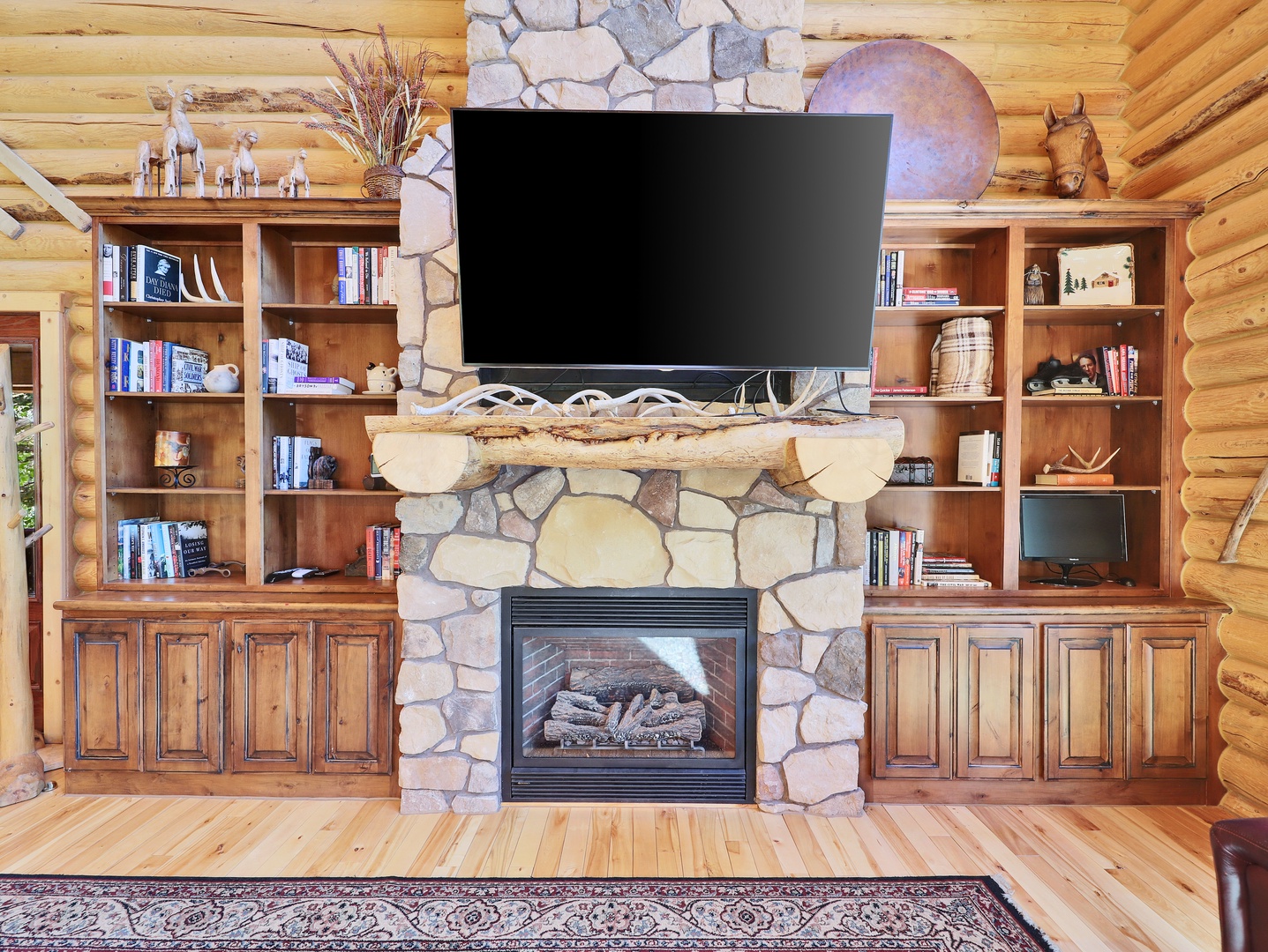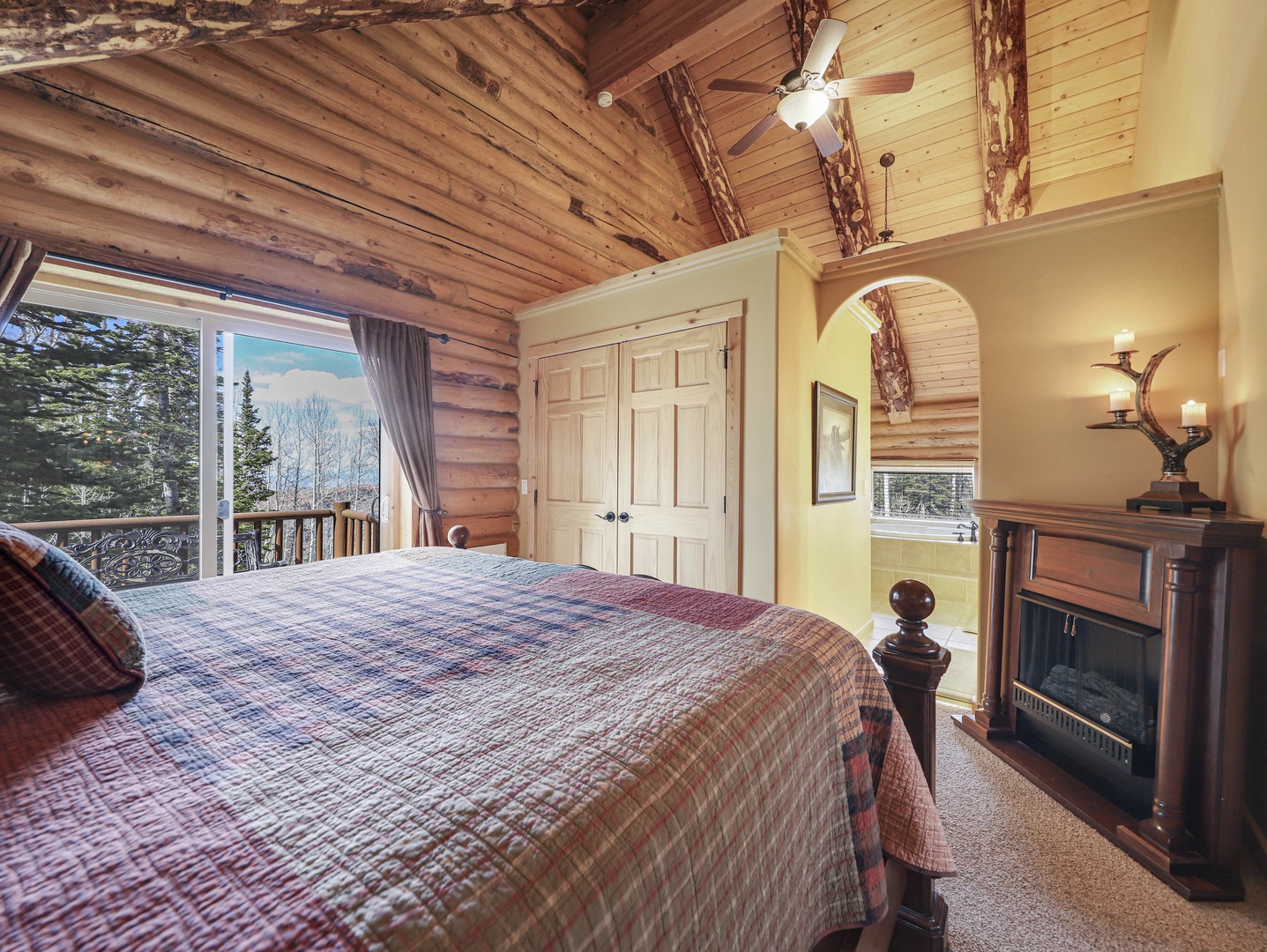 Welcome to Heavenly Haven, your luxurious mountain retreat in Brian Head, UT. This stunning 3-bedroom, 3-bathroom cabin beautifully blends rustic charm with modern comfort, offering an inviting space with exposed log walls and a majestic floor-to-ceiling stone fireplace as the centerpiece of the open-concept living area.