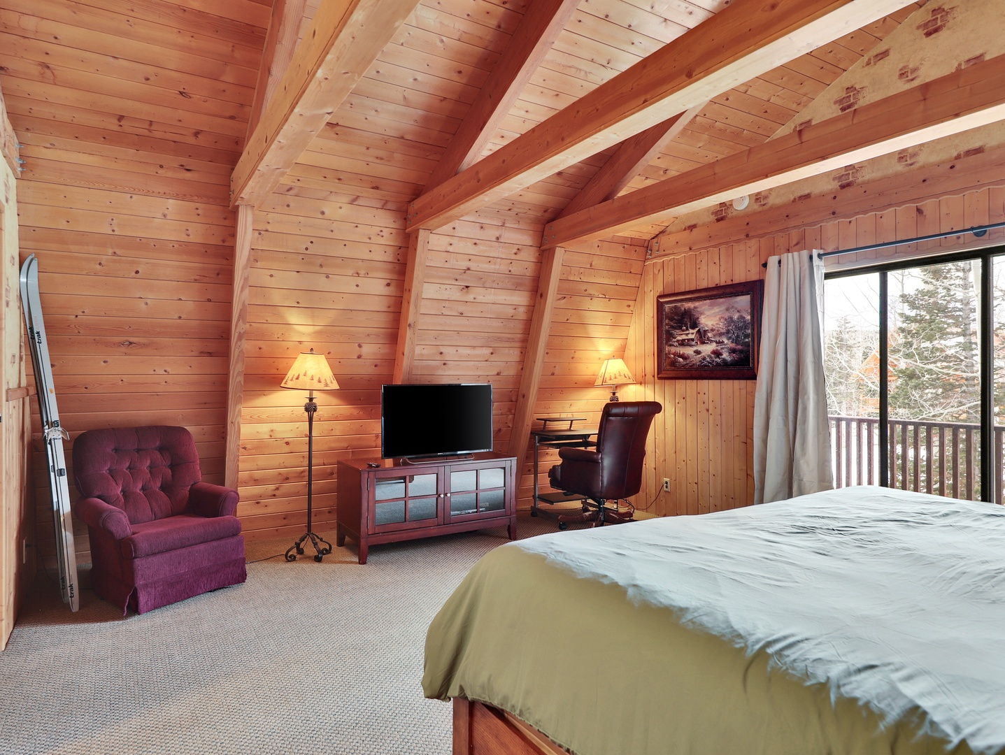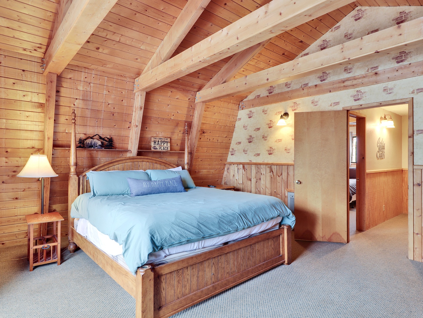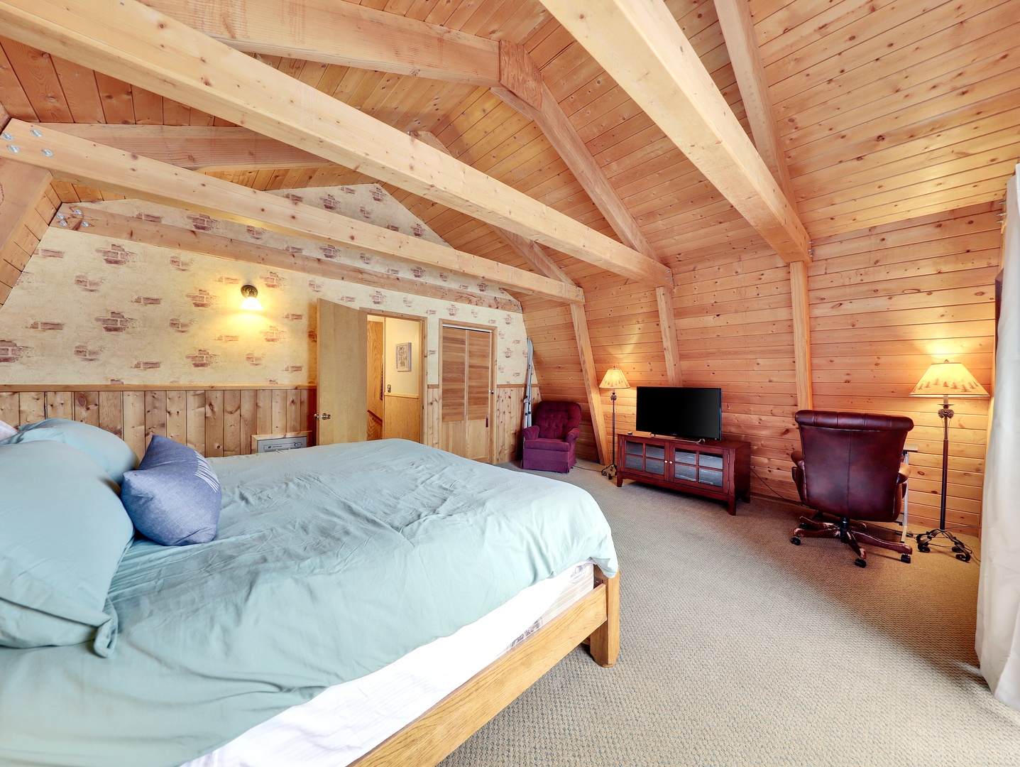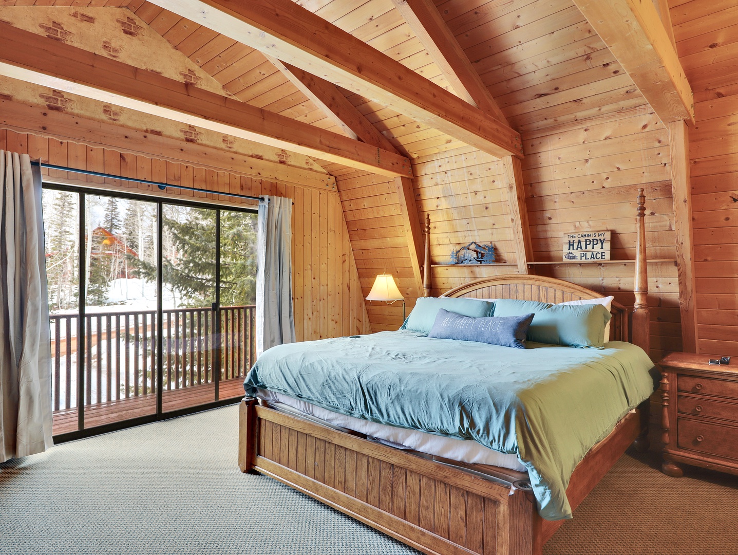 Each of the three bedrooms is designed for ultimate comfort, featuring soft bedding and serene decor. The master bedroom offers direct access to a private walk-out balcony where you can enjoy a cup of coffee while listening to the sounds of nature. Additional walk-out balconies throughout the home provide plenty of space to soak in the crisp mountain air and stunning forest surroundings.