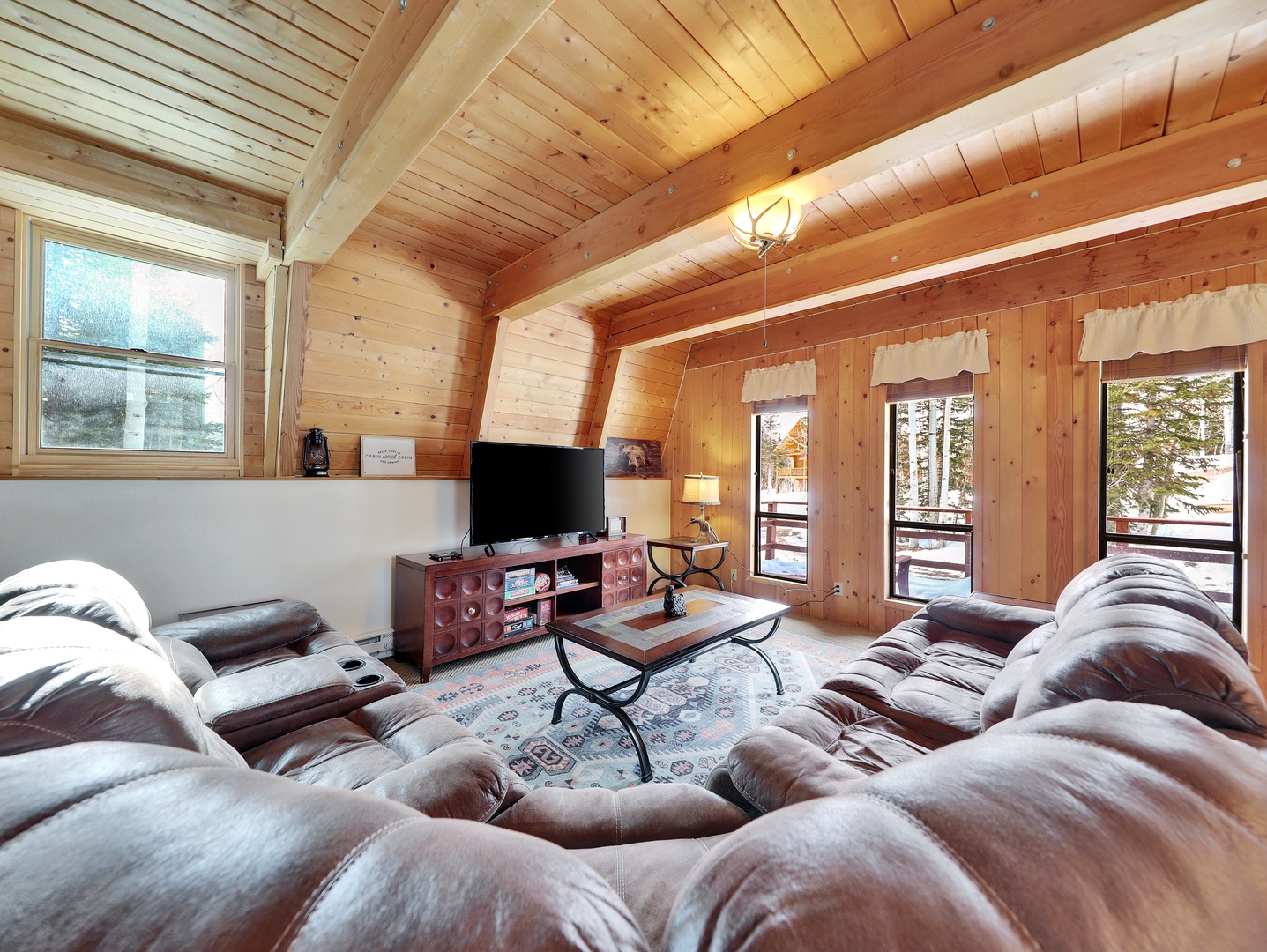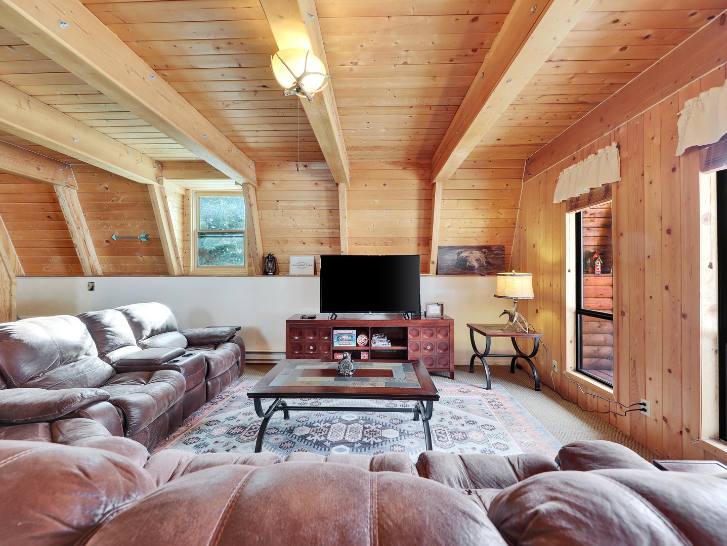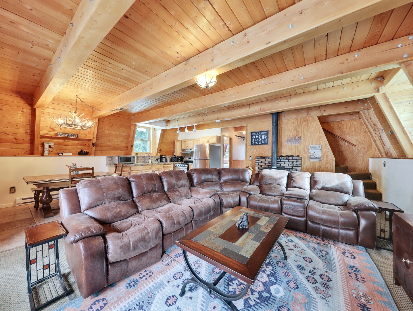 Step into the warm and inviting living room, where natural wood accents, vaulted ceilings, and a gas fireplace create a cozy ambiance. Relax on the plush sectional sofa while watching your favorite shows on the Smart TV or take in the tranquil forest views through the expansive windows.
