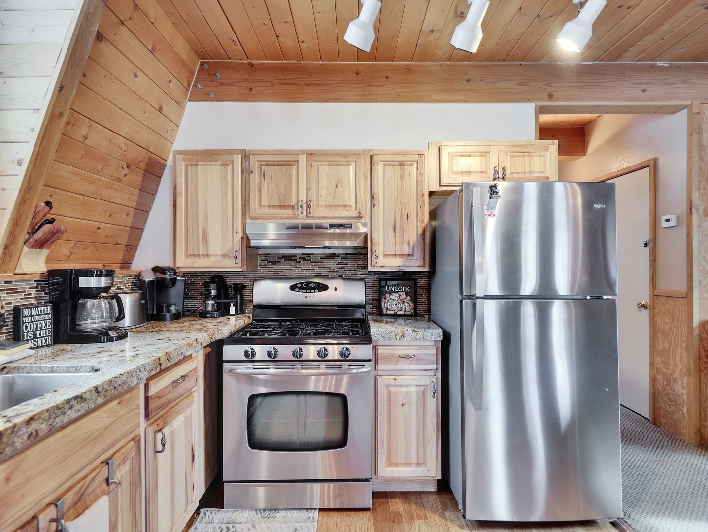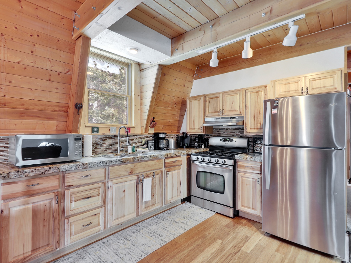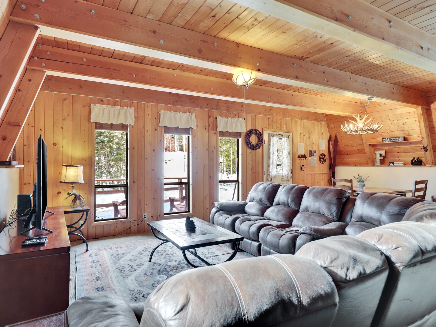 Step into the warm and inviting living room, where natural wood accents, vaulted ceilings, and a gas fireplace create a cozy ambiance. Relax on the plush sectional sofa while watching your favorite shows on the Smart TV or take in the tranquil forest views through the expansive windows.