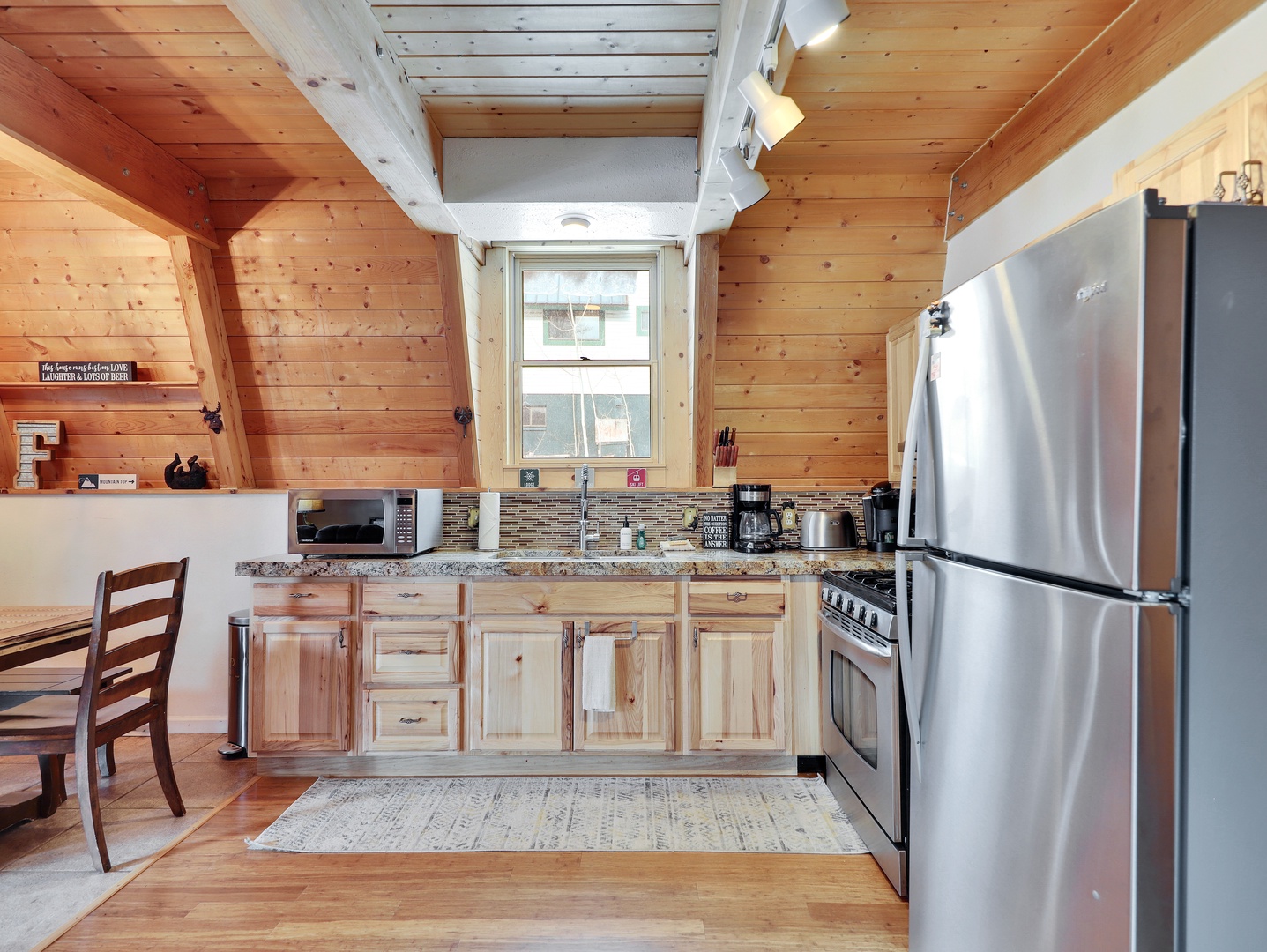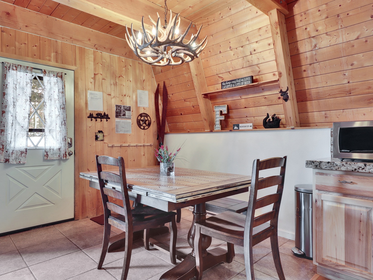 The fully equipped kitchen boasts modern appliances, open shelving, and all the essentials for preparing delicious meals. Adjacent to the kitchen, the dining area is perfect for gathering with family or friends to enjoy hearty breakfasts before hitting the slopes or leisurely dinners after a day of exploring.
