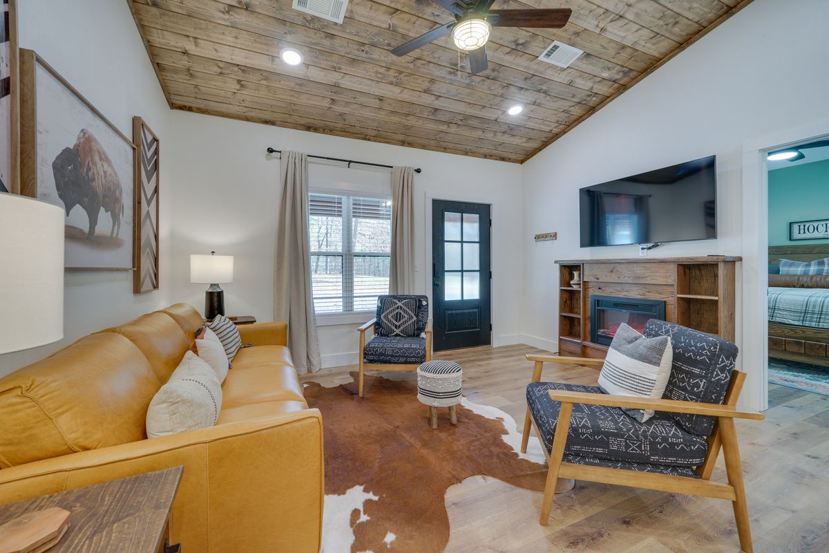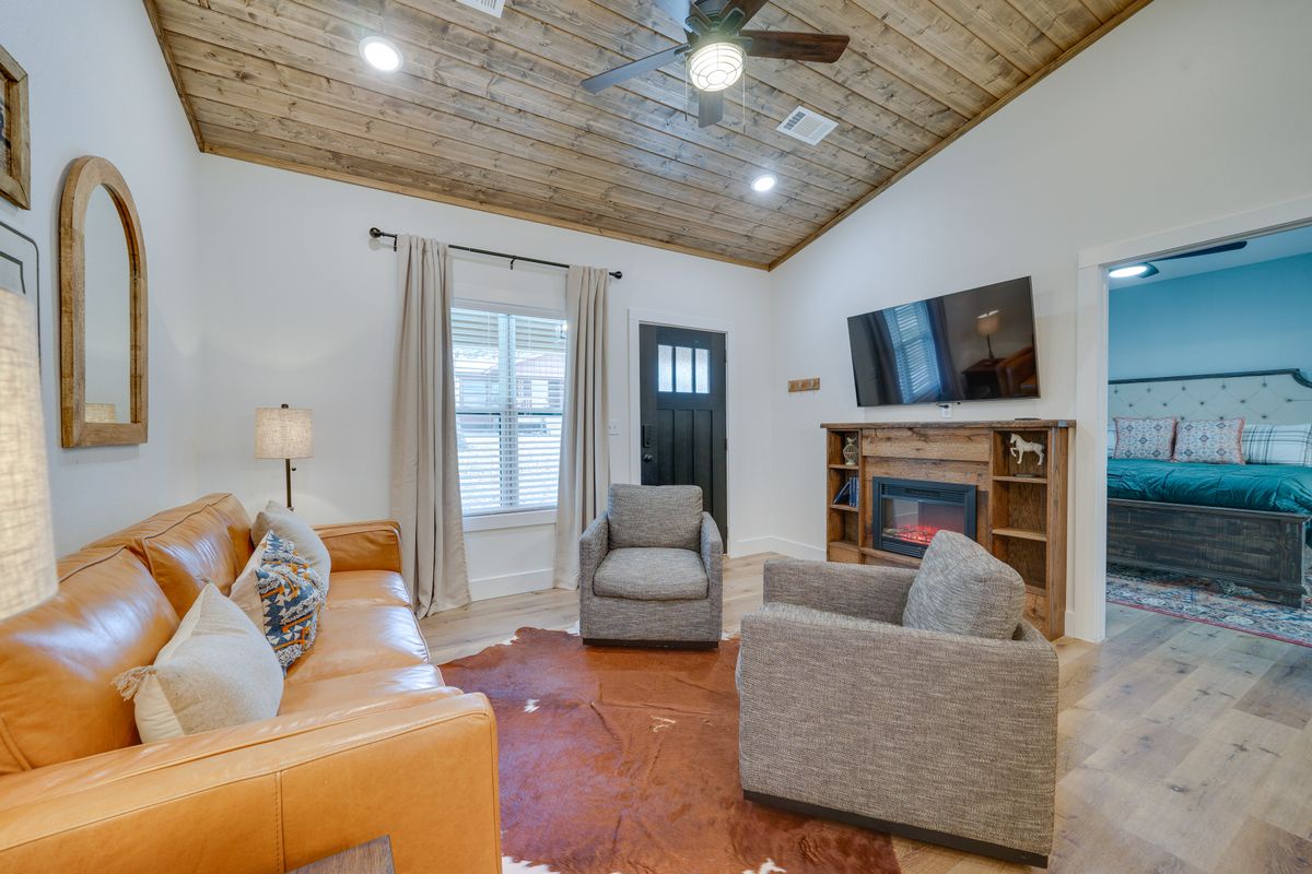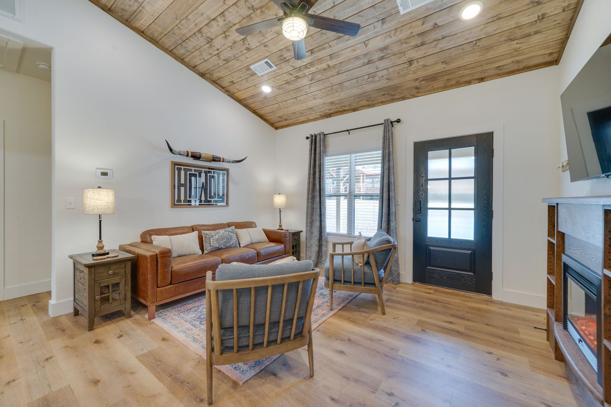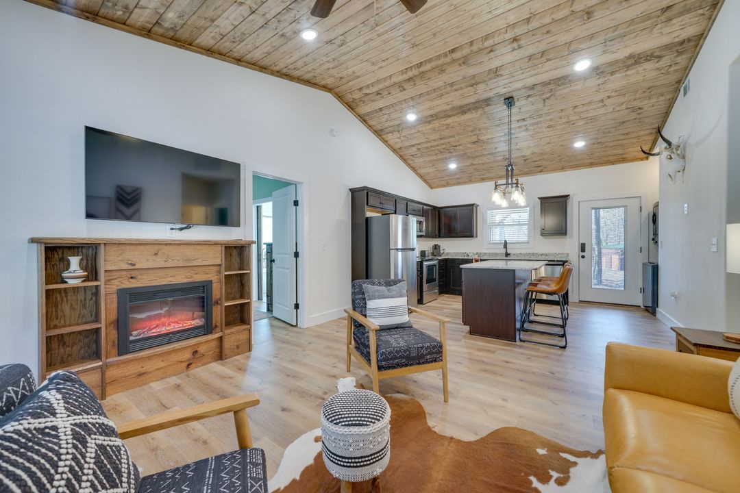 Spacious open floor plan with modern Western decor and an electric fireplace