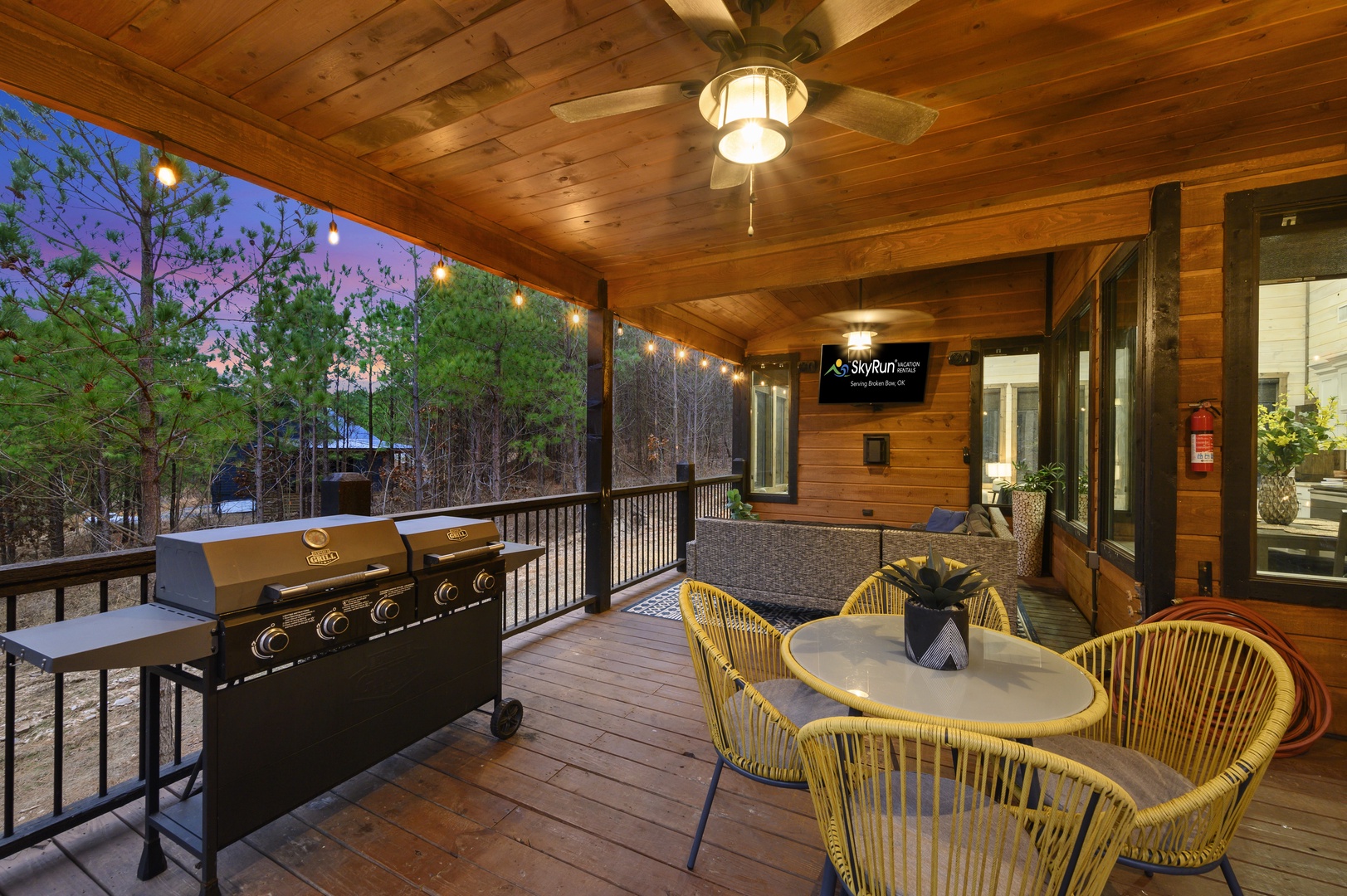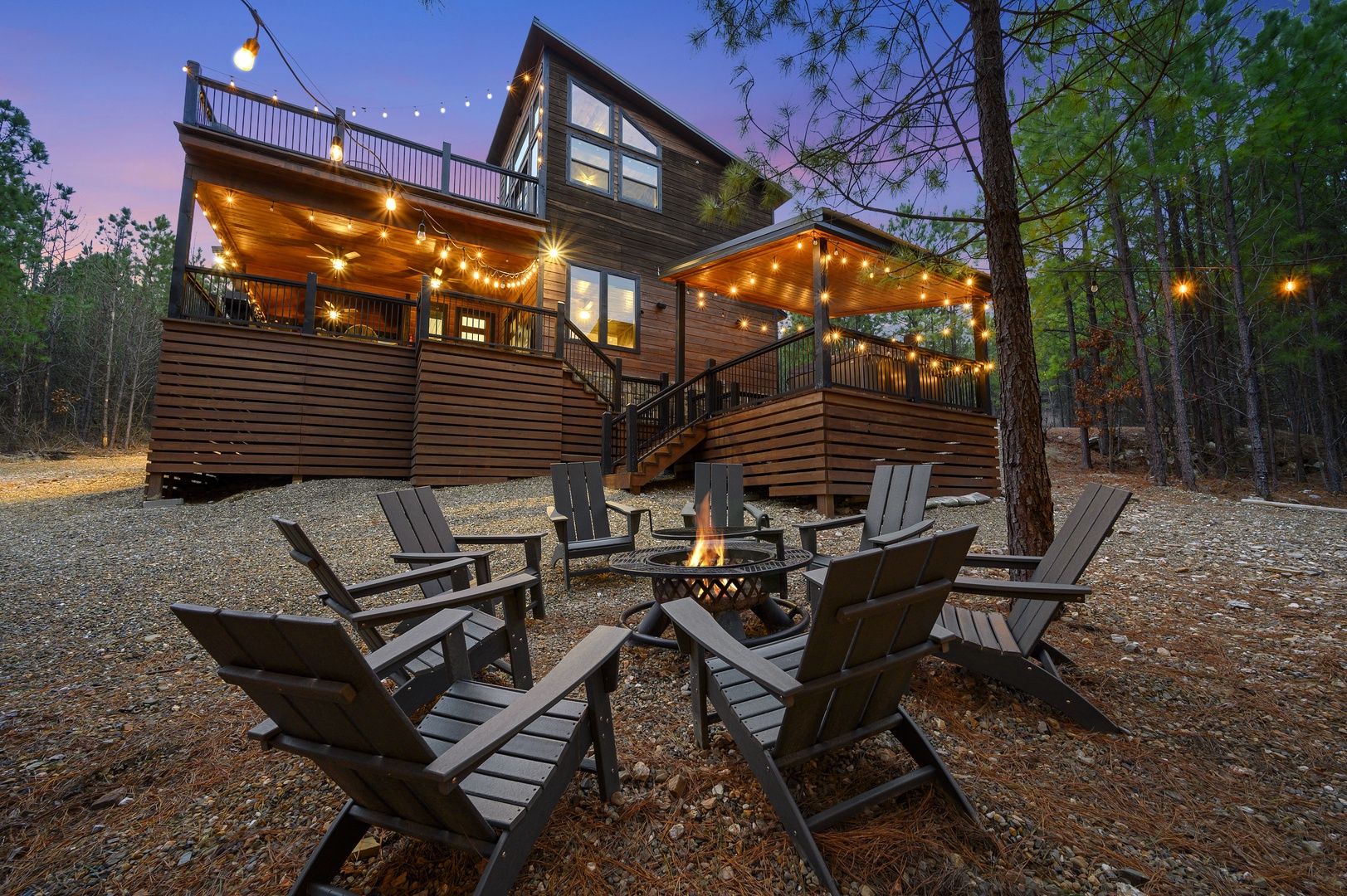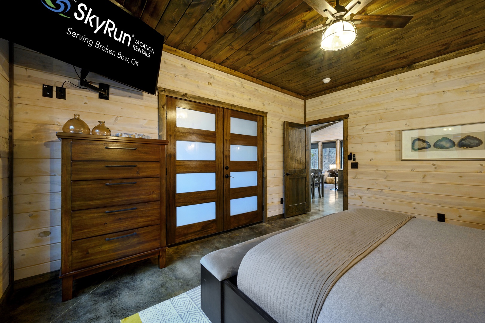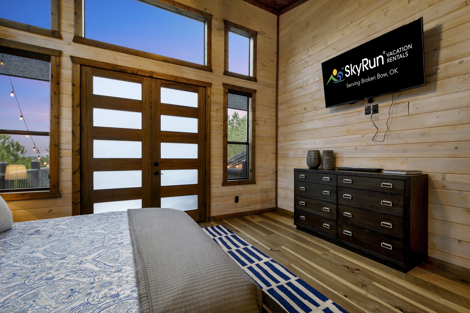 Counting Stars Home Broken Bow Counting Stars Counting Stars Outdoor firepit with adirondack chairs, string lighting and the back of the Counting Stars cabin in the background. Aerial view of the Counting Stars cabin. A modern living room with a fireplace, large sectional sofa, and flat-screen TV. The room features wooden walls, large windows, and a cowhide rug. Upstairs bedroom with doors leading out to rooftop deck. Ever wonder why they call it "Counting Stars"? Take a look at this elegantly decorated rooftop deck. This is where you will spend most of your evenings. Open Gallery Outdoor firepit with adirondack chairs, string lighting and the back of the Counting Stars cabin in the background. Aerial view of the Counting Stars cabin. A modern living room with a fireplace, large sectional sofa, and flat-screen TV. The room features wooden walls, large windows, and a cowhide rug. Upstairs bedroom with doors leading out to rooftop deck. Ever wonder why they call it "Counting Stars"? Take a look at this elegantly decorated rooftop deck. This is where you will spend most of your evenings. Ever wonder why they call it "Counting Stars"? Take a look at this elegantly decorated rooftop deck. This is where you will spend most of your evenings. A room with natural wood walls features a foosball table, a bunk bed, two large windows showing outdoor scenery, and a wall-mounted TV displaying "SkyRun Vacation Rentals" in Broken Bow, OK. A modern rustic bedroom with a large bed, wooden walls, a ceiling fan, a window with a view of pine trees. Natural light illuminates the room. A two sink vanity and walk-in shower serving the downstairs bedroom. A two sink vanity and walk-in shower serving the upstairs bedroom. Bathroom serving the bunkroom/gameroom. Private hot tub with string lights and surrounded by pines trees. Firepit with string lights and surrounded by pine tress. Aerial view of the Counting Stars cabin. Aerial view of the deck outside the upstairs bedroom. Front view of the Counting Stars cabin. Outdoor firepit with adirondack chairs, string lighting and the back of the Counting Stars cabin in the background. Firepit with string lights and surrounded by pine tress. Private hot tub with string lights and surrounded by pines trees. Private hot tub with string lights and surrounded by pines trees. A covered outdoor patio features a gas grill, a dining table with yellow chairs, a ceiling fan, and a seating area with a TV mounted on the wooden wall. Trees are visible in the background at dusk. Outdoor dining with the direct plumbed gas grill in the background. A cozy wooden porch with string lights features a corner sofa, a coffee table, a ceiling fan, and a wall-mounted TV. The porch overlooks a wooded area. A cozy wooden porch with string lights features a corner sofa, a coffee table, a ceiling fan. The porch overlooks a wooded area. Cornhole game for outdoor entertainment. Front view of the Counting Stars cabin. Entry to the cabin with elegant decor. Bunkroom/gameroom showing also the foosball game and ceiling fan. A rustic room with bunk beds, a foosball table, large windows, and a TV displaying "SkyRun Vacation Rentals" signage. Entry to the cabin with elegant decor. Downstairs bathroom. Bathroom serving the bunkroom/gameroom. Dining room that seats six encased with large windows to allow comtinually viewing of the surrounding forest. Dining room that seats six with living room and kitchen insland in the background. Livingroom sectional surrounded by large windows. Dining room that seats six with the kitchen in the background. Kitchen which is equipped with a refrigerator, oven/stove, microwave, dishwasher, and Keurig coffee maker. Kitchen which is equipped with a refrigerator, oven/stove, microwave, dishwasher, and Keurig coffee maker. Kitchen island also seats 4 additional people. Kitchen island also seats 4 additional people. A Keurig coffee maker placed on a kitchen counter with a basket of coffee filters, two white mugs, and assorted coffee pods nearby. Kitchen which is equipped with a refrigerator, oven/stove, microwave, dishwasher, and Keurig coffee maker. A cozy living room with a fireplace, flat-screen TV, and large sectional sofa. The room features wood-paneled walls and ceiling, large windows with a nature view, and modern furnishings. Living room has a large corner sectional that is surrounded by large windows allowing in light and beautiful views. Living room has a large corner sectional that is surrounded by large windows allowing in light and beautiful views. Downstairs bedroom and stairway leading to the upstairs bedroom and upper deck. A rustic bedroom with wooden walls and ceiling, a comfortable bed with gray bedding, a ceiling fan, a window with a forest view, and a TV mounted on the wall. Downstairs bedroom. A bedroom with wooden walls and ceiling, a comfortable bed, a dresser with decor items, a wall-mounted TV, and double door windows. The TV displays the SkyRun Vacation Rentals logo and “Serving Broken Bow, OK. A two sink vanity and walk-in shower serving the downstairs bedroom. Walk-in shower serving the downstairs bedroom. Upstairs bedroom with doors leading out to rooftop deck. Upstairs bedroom with bathroom entry in the background. A two sink vanity and walk-in shower serving the upstairs bedroom. Walk-in shower for the upstairs bedroom. A cozy wooden bedroom features a bed, dresser, and mounted TV displaying "SkyRun Vacation Rentals" with windows showcasing an outdoor view. Ever wonder why they call it "Counting Stars"? Take a look at this elegantly decorated rooftop deck. This is where you will spend most of your evenings. Ever wonder why they call it "Counting Stars"? Take a look at this elegantly decorated rooftop deck. This is where you will spend most of your evenings. Aerial view of the firepit with string lights. Aerial view of the Counting Stars cabin. Gallery View Broken Bow, Oklahoma 3 Bedrooms 3 full Baths 8 Guests Pets OK (4.9) Description Rooms Amenitie