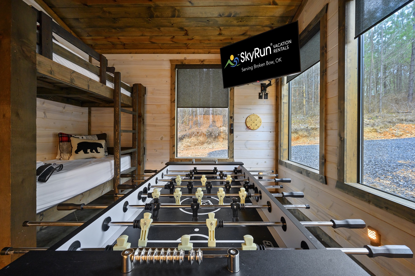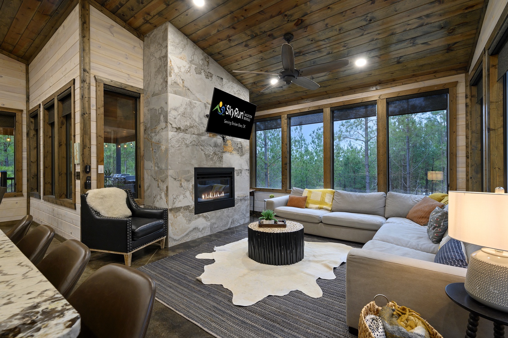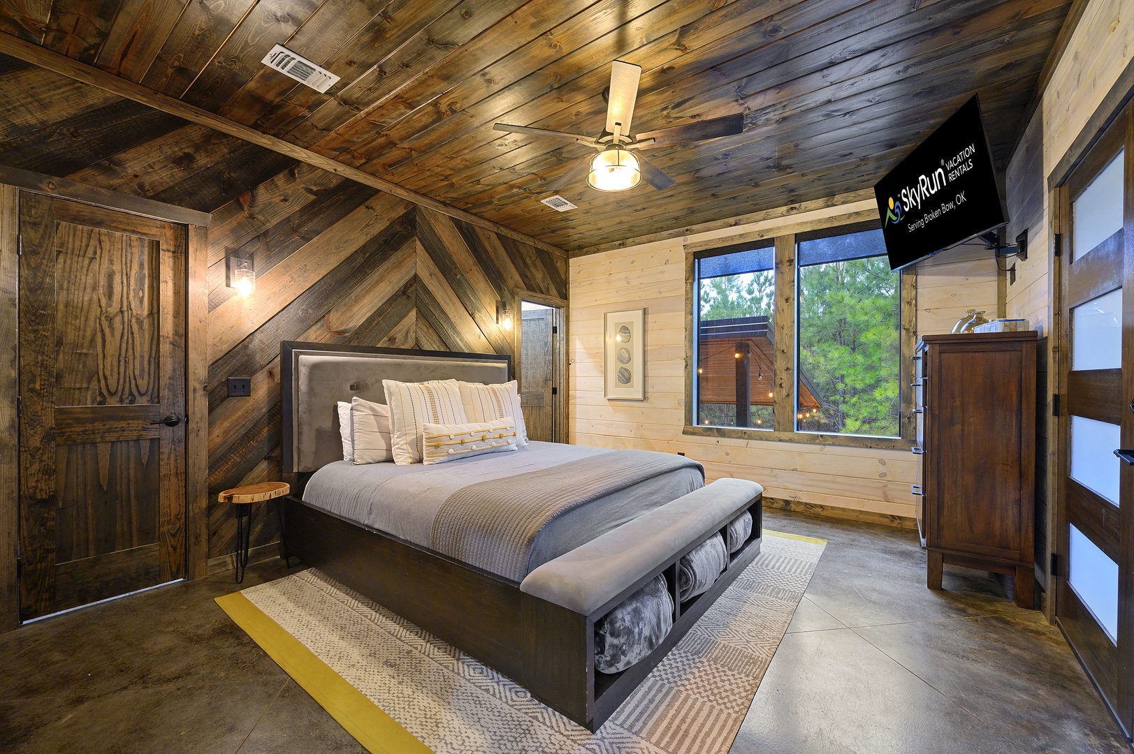 Counting Stars Home Broken Bow Counting Stars Counting Stars Outdoor firepit with adirondack chairs, string lighting and the back of the Counting Stars cabin in the background. Aerial view of the Counting Stars cabin. A modern living room with a fireplace, large sectional sofa, and flat-screen TV. The room features wooden walls, large windows, and a cowhide rug. Upstairs bedroom with doors leading out to rooftop deck. Ever wonder why they call it "Counting Stars"? Take a look at this elegantly decorated rooftop deck. This is where you will spend most of your evenings. Open Gallery Outdoor firepit with adirondack chairs, string lighting and the back of the Counting Stars cabin in the background. Aerial view of the Counting Stars cabin. A modern living room with a fireplace, large sectional sofa, and flat-screen TV. The room features wooden walls, large windows, and a cowhide rug. Upstairs bedroom with doors leading out to rooftop deck. Ever wonder why they call it "Counting Stars"? Take a look at this elegantly decorated rooftop deck. This is where you will spend most of your evenings. Ever wonder why they call it "Counting Stars"? Take a look at this elegantly decorated rooftop deck. This is where you will spend most of your evenings. A room with natural wood walls features a foosball table, a bunk bed, two large windows showing outdoor scenery, and a wall-mounted TV displaying "SkyRun Vacation Rentals" in Broken Bow, OK. A modern rustic bedroom with a large bed, wooden walls, a ceiling fan, a window with a view of pine trees. Natural light illuminates the room. A two sink vanity and walk-in shower serving the downstairs bedroom. A two sink vanity and walk-in shower serving the upstairs bedroom. Bathroom serving the bunkroom/gameroom. Private hot tub with string lights and surrounded by pines trees. Firepit with string lights and surrounded by pine tress. Aerial view of the Counting Stars cabin. Aerial view of the deck outside the upstairs bedroom. Front view of the Counting Stars cabin. Outdoor firepit with adirondack chairs, string lighting and the back of the Counting Stars cabin in the background. Firepit with string lights and surrounded by pine tress. Private hot tub with string lights and surrounded by pines trees. Private hot tub with string lights and surrounded by pines trees. A covered outdoor patio features a gas grill, a dining table with yellow chairs, a ceiling fan, and a seating area with a TV mounted on the wooden wall. Trees are visible in the background at dusk. Outdoor dining with the direct plumbed gas grill in the background. A cozy wooden porch with string lights features a corner sofa, a coffee table, a ceiling fan, and a wall-mounted TV. The porch overlooks a wooded area. A cozy wooden porch with string lights features a corner sofa, a coffee table, a ceiling fan. The porch overlooks a wooded area. Cornhole game for outdoor entertainment. Front view of the Counting Stars cabin. Entry to the cabin with elegant decor. Bunkroom/gameroom showing also the foosball game and ceiling fan. A rustic room with bunk beds, a foosball table, large windows, and a TV displaying "SkyRun Vacation Rentals" signage. Entry to the cabin with elegant decor. Downstairs bathroom. Bathroom serving the bunkroom/gameroom. Dining room that seats six encased with large windows to allow comtinually viewing of the surrounding forest. Dining room that seats six with living room and kitchen insland in the background. Livingroom sectional surrounded by large windows. Dining room that seats six with the kitchen in the background. Kitchen which is equipped with a refrigerator, oven/stove, microwave, dishwasher, and Keurig coffee maker. Kitchen which is equipped with a refrigerator, oven/stove, microwave, dishwasher, and Keurig coffee maker. Kitchen island also seats 4 additional people. Kitchen island also seats 4 additional people. A Keurig coffee maker placed on a kitchen counter with a basket of coffee filters, two white mugs, and assorted coffee pods nearby. Kitchen which is equipped with a refrigerator, oven/stove, microwave, dishwasher, and Keurig coffee maker. A cozy living room with a fireplace, flat-screen TV, and large sectional sofa. The room features wood-paneled walls and ceiling, large windows with a nature view, and modern furnishings. Living room has a large corner sectional that is surrounded by large windows allowing in light and beautiful views. Living room has a large corner sectional that is surrounded by large windows allowing in light and beautiful views. Downstairs bedroom and stairway leading to the upstairs bedroom and upper deck. A rustic bedroom with wooden walls and ceiling, a comfortable bed with gray bedding, a ceiling fan, a window with a forest view, and a TV mounted on the wall. Downstairs bedroom. A bedroom with wooden walls and ceiling, a comfortable bed, a dresser with decor items, a wall-mounted TV, and double door windows. The TV displays the SkyRun Vacation Rentals logo and “Serving Broken Bow, OK. A two sink vanity and walk-in shower serving the downstairs bedroom. Walk-in shower serving the downstairs bedroom. Upstairs bedroom with doors leading out to rooftop deck. Upstairs bedroom with bathroom entry in the background. A two sink vanity and walk-in shower serving the upstairs bedroom. Walk-in shower for the upstairs bedroom. A cozy wooden bedroom features a bed, dresser, and mounted TV displaying "SkyRun Vacation Rentals" with windows showcasing an outdoor view. Ever wonder why they call it "Counting Stars"? Take a look at this elegantly decorated rooftop deck. This is where you will spend most of your evenings. Ever wonder why they call it "Counting Stars"? Take a look at this elegantly decorated rooftop deck. This is where you will spend most of your evenings. Aerial view of the firepit with string lights. Aerial view of the Counting Stars cabin. Gallery View Broken Bow, Oklahoma 3 Bedrooms 3 full Baths 8 Guests Pets OK (4.9) Description Rooms Amenitie