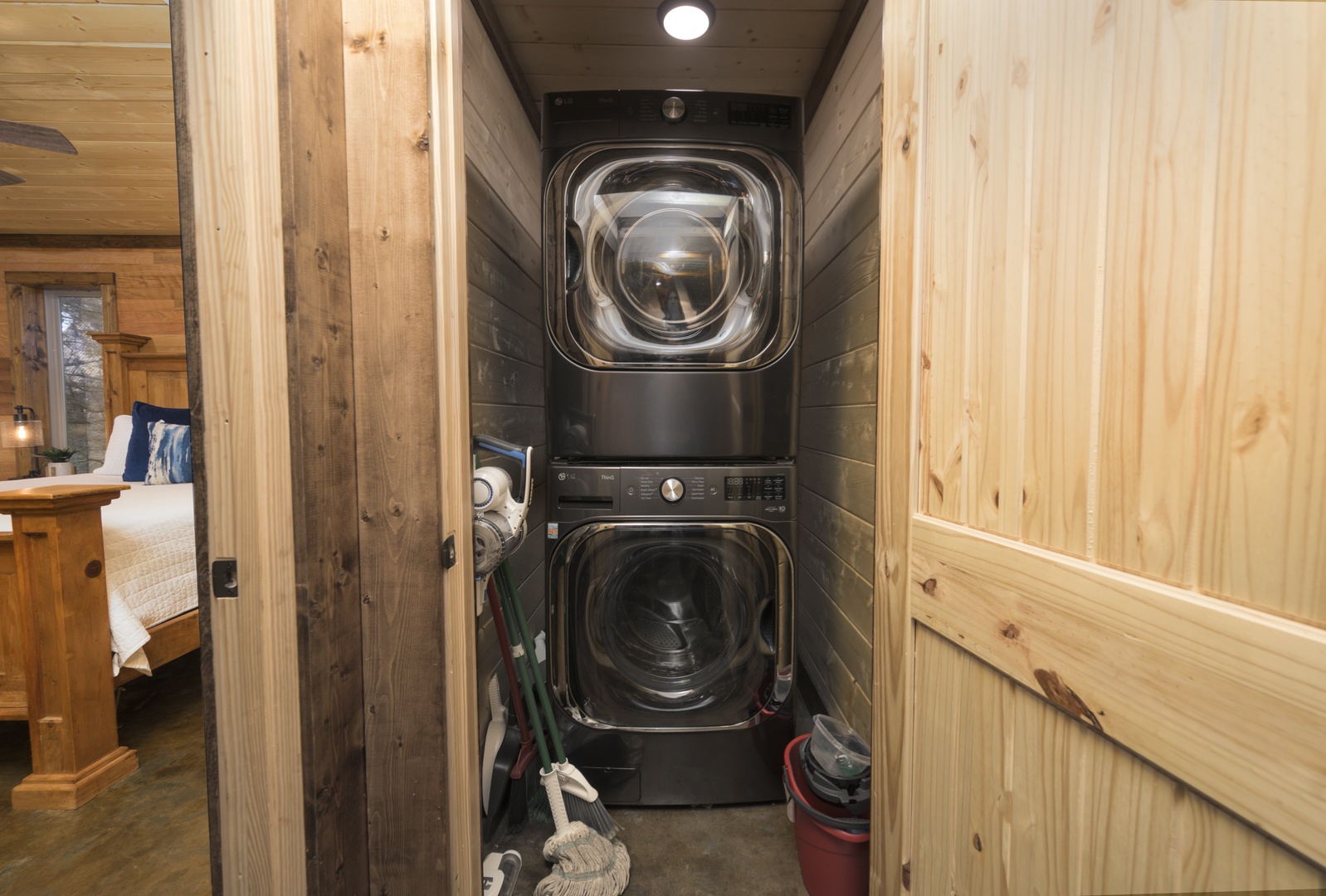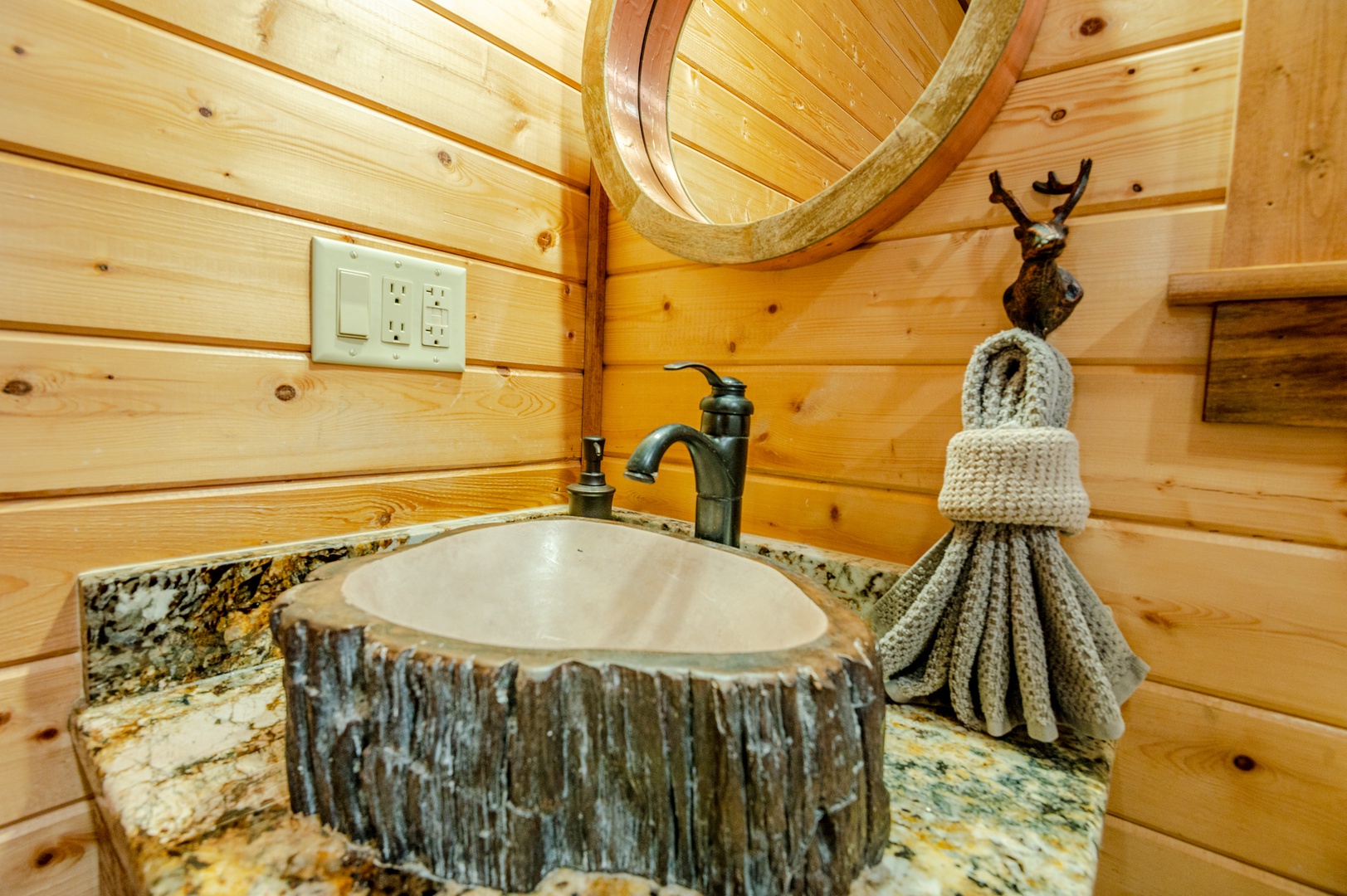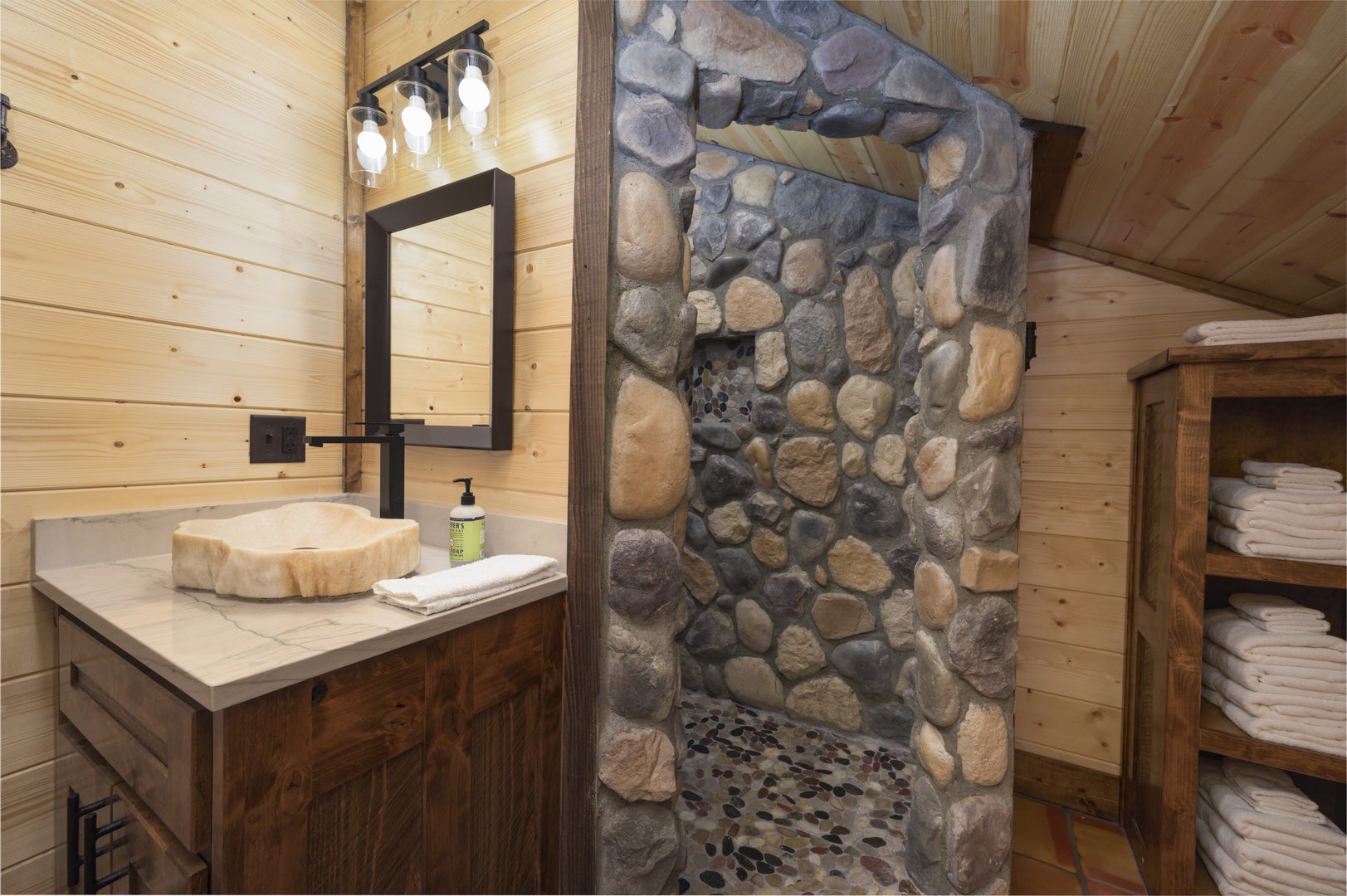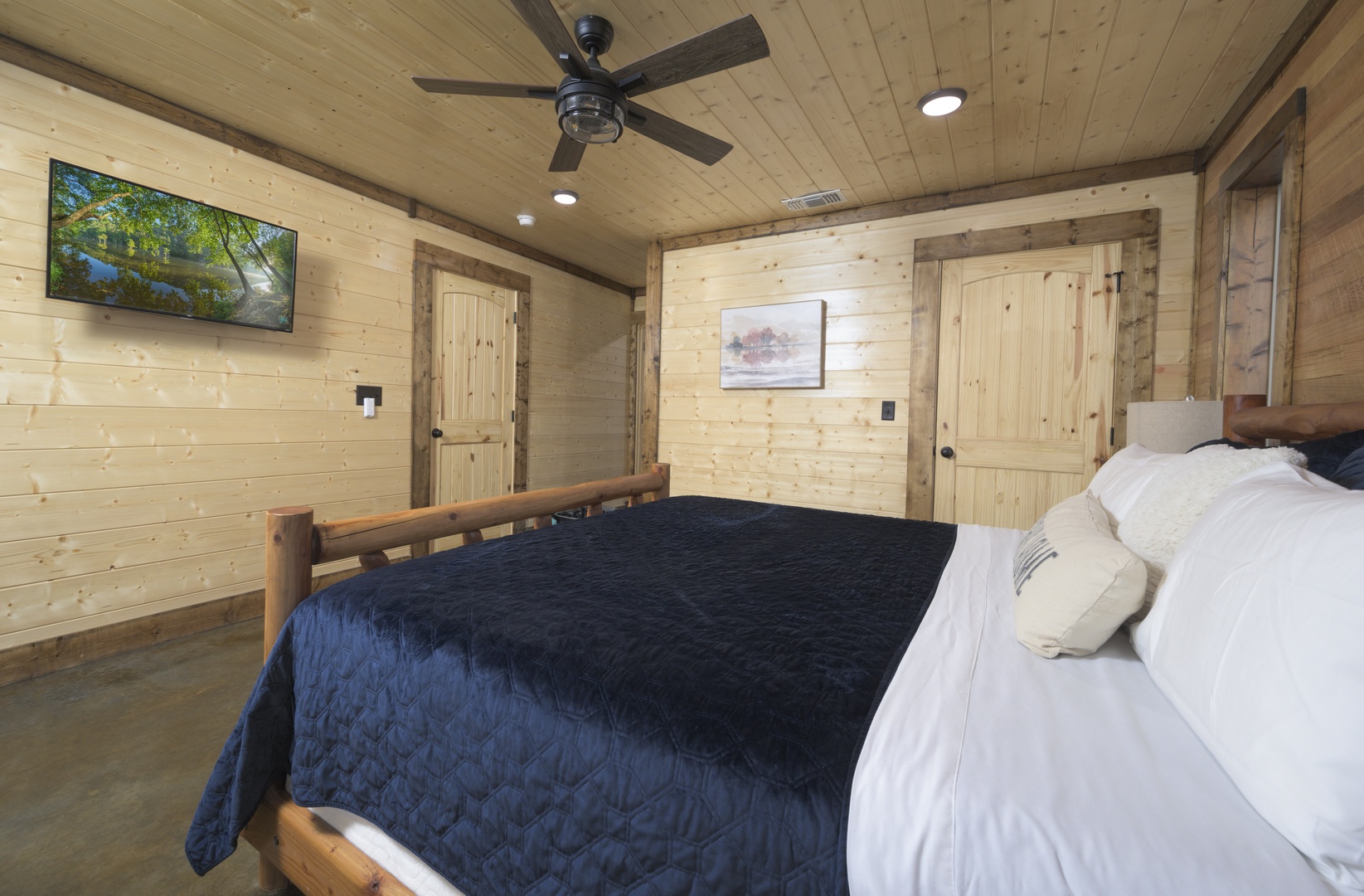 Located just 50 yards away, Heaven on the River offers even more space for your group to spread out while enjoying shared amenities. The cabin's back covered patio overlooks the river, providing a stunning setting for morning coffee or evening cocktails. while a cozy gas fireplace sits inside the grand living room with a large Smart TV for movie nights, a mini-pool table in the loft, and a fully stocked kitchen with ample prep space.