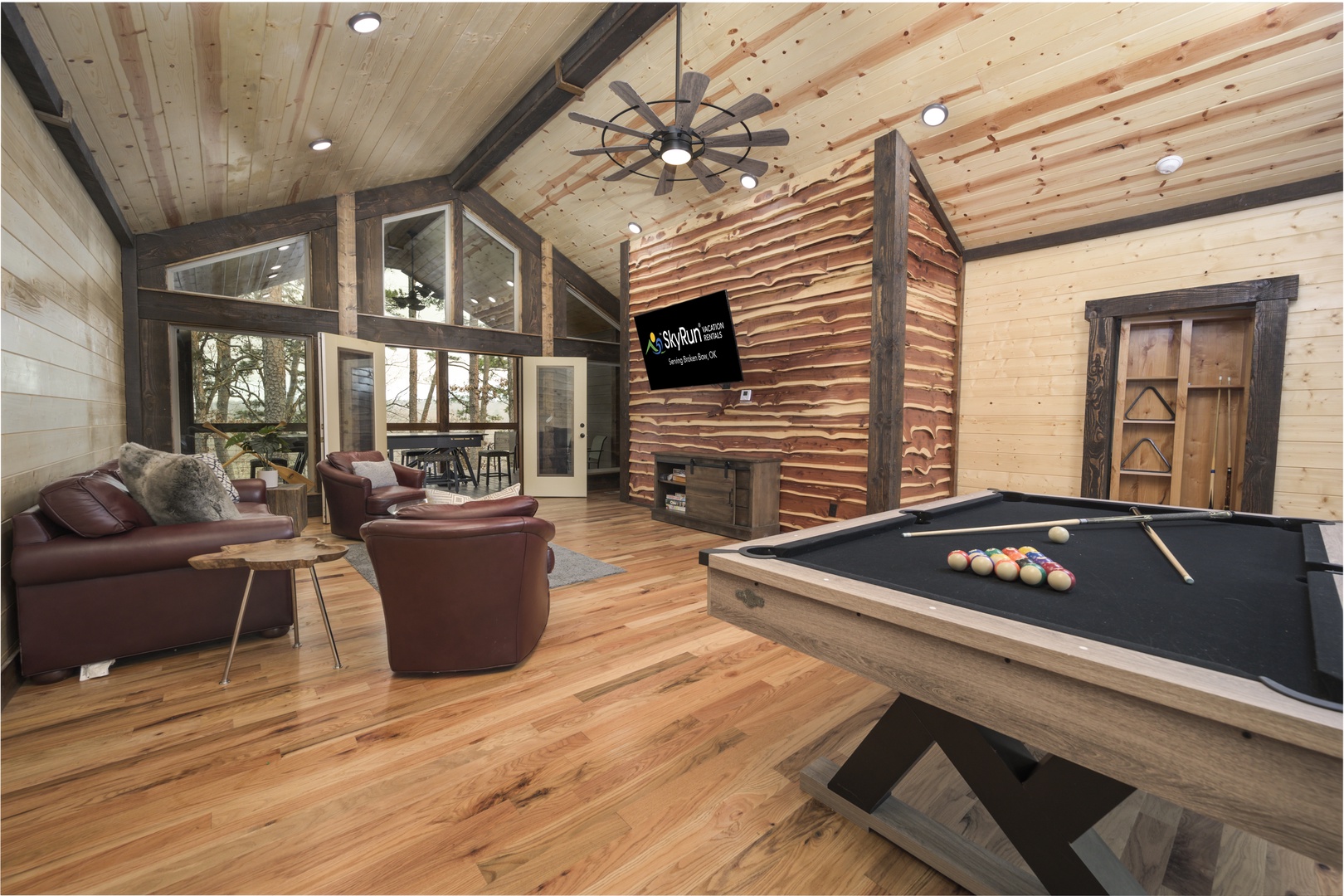 Welcome to Enchantment on the River, A one-of-a-Kind R I V E R F R O N T retreat for large groups, accommodating up to 29 guests across two luxurious cabins: Paradise on the River and Heaven on the River. Together, these neighboring retreats offer 8 bedrooms, 6 bathrooms, 2 full kitchens, 2 hot tubs, 7 free kayaks, 2 pool tables and a shuffle board in multiple game areas, and exclusive access to your very own private island on the river below!