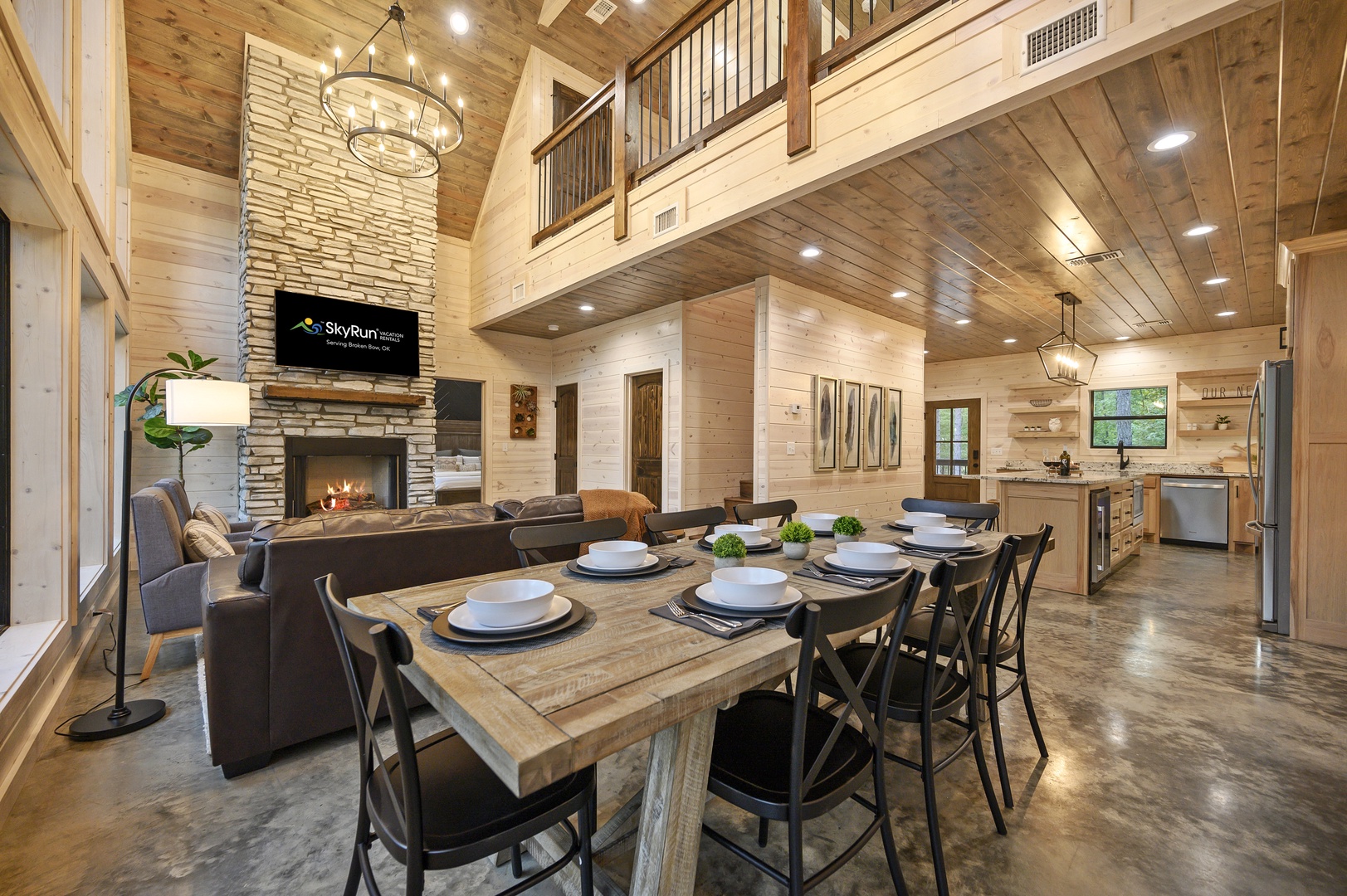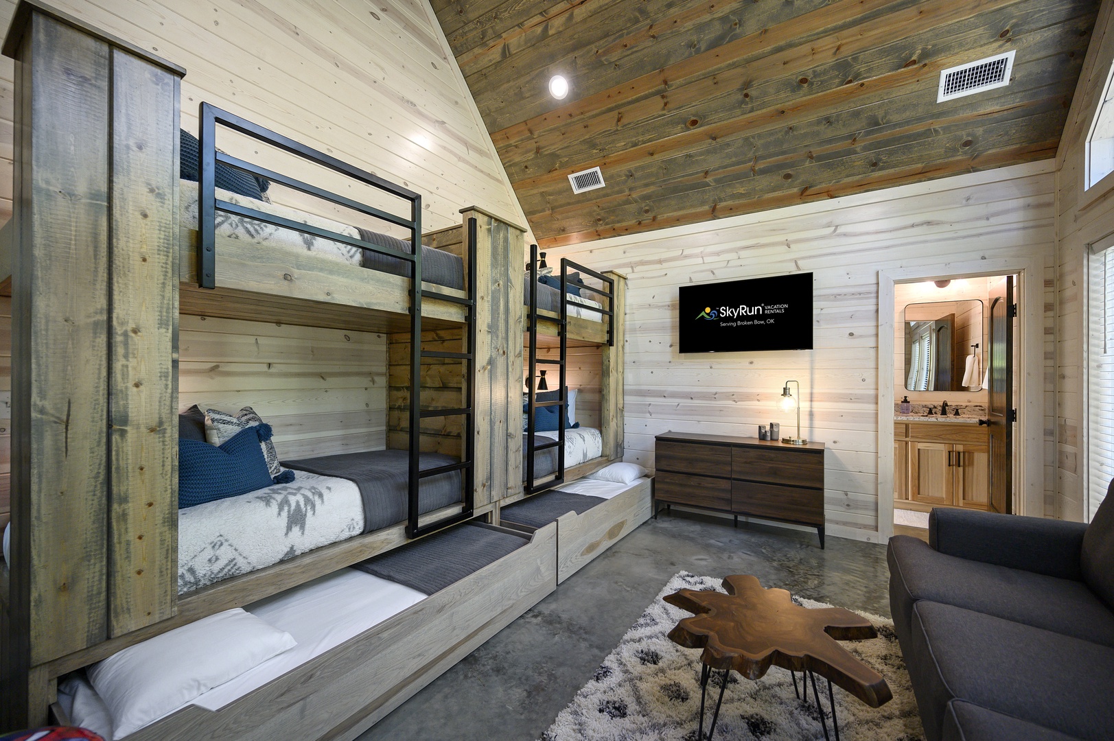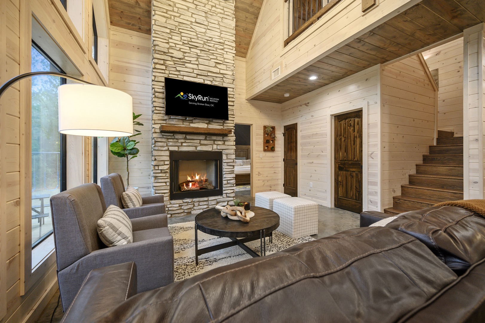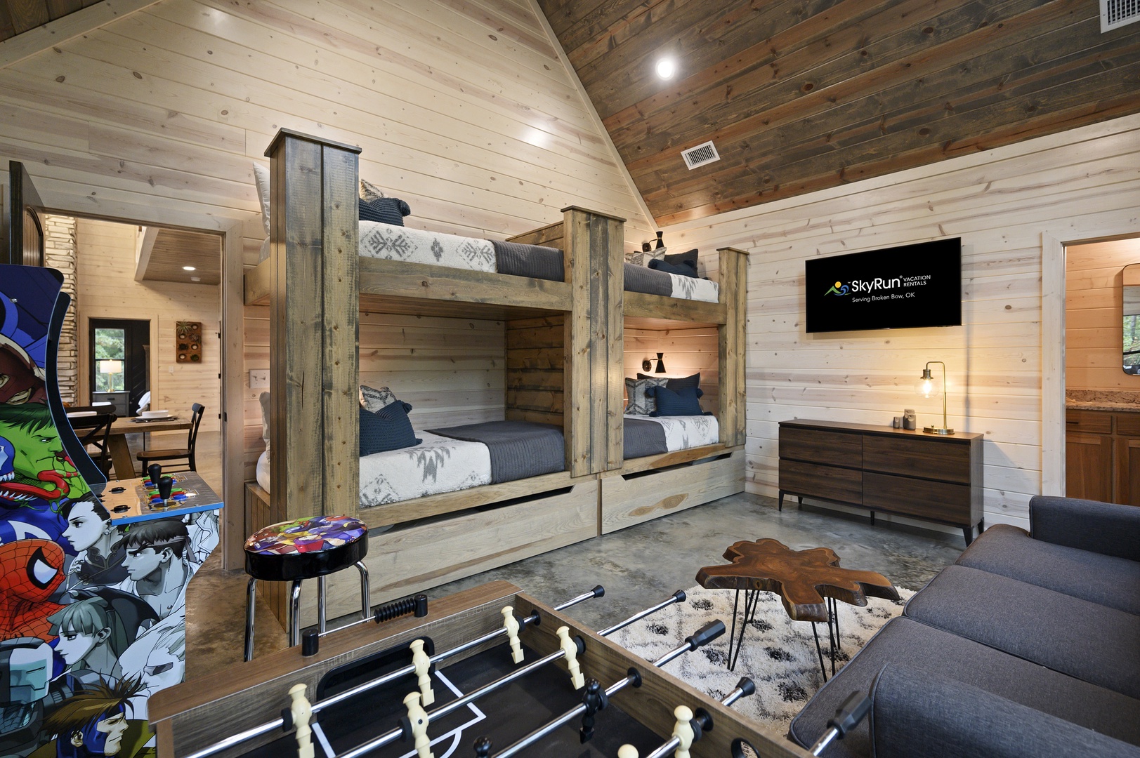 Night Owl Home Broken Bow Night Owl Back to Search Results Night Owl Open Gallery Gallery View Broken Bow, Oklahoma 3 Bedrooms 3 full, 1 half Baths 14 Guests Pets OK Description Rooms Amenities Reviews Calendar Location Night Owl is a luxurious, brand-new cabin nestled in a secluded cul-de-sac in Cedar Hills, Broken Bow, Oklahoma. Surrounded by a serene tree farm, this two-story retreat comfortably sleeps 14 guests and is perfect for families and friends seeking a peaceful escape (bring those furry friends with you too, because this cabin is pet friendly - see the end of this description for fee info and services you can add to your stay)! The cabin features two king suites with en-suite bathrooms, a spacious bunk room, and an open-concept living area with a stone fireplace and floor-to-ceiling windows. Guests will love the en suite sanctuaries, tastefully decked out bunk room, and chef’s kitchen, while the outdoor space offers a large porch with a gas-log fireplace, hot tub, propane grill, playscape, and outdoor games like cornhole, yard Yahtzee, and bocce ball. A stone fire pit for roasting marshmallows and gathering together as family or friends (or both) adds extra fun to the experience. Conveniently located for short drives to Hochatown, downtown Broken Bow, Beavers Bend State Park, the new Choctaw Landing casino, and a quick trip to Broken Bow Lake, Night Owl is the ideal base for both relaxation and adventure. Whether you’re soaking in the hot tub or exploring the nearby attractions, this spacious retreat has everything you need for an unforgettable stay. As soon as you step through the front door, you’re greeted by a chef’s kitchen that will inspire any culinary enthusiast. Featuring quartz countertops, stainless steel appliances, and a wine fridge, this kitchen is the perfect space to gather and create memorable meals. With its open floor plan and walls of windows, the living area fills with natural light, offering a seamless connection between indoor and outdoor living. The living room, with its stone fireplace and cozy seating, is ideal for unwinding after a day of exploring the nearby Beavers Bend State Park or Broken Bow Lake. Whether you’re dining at the eight-seat table or snacking at the kitchen island, you’ll never feel disconnected from the group, thanks to the cabin’s inviting, communal design. Night Owl boasts two king suites, each offering a private sanctuary with plush bedding, 55-inch smart TVs, and spa-like en-suite bathrooms. These bathrooms are designed for ultimate relaxation, featuring soaking tubs, walk-in showers, and spacious vanities. One suite is conveniently located on the ground floor, while the second suite upstairs comes with its own game loft, perfect for poker nights or board games with the family. For the younger (or young-at-heart) guests, the downstairs bunk room is a dream come true. With two twin-over-twin built-in bunk beds, complete with pull-out trundles, and a sleeper sofa, this room comfortably sleeps up to 8. The bunk room isn’t just for sleeping—it’s a fun zone equipped with a game console and foosball table, ready to spark some friendly competition. At Night Owl, the outdoor experience is just as incredible as the indoor one. Step out onto the expansive back porch and take in the serene views of the lush tree farm that stretches endlessly before you. Whether you're sipping your morning coffee or enjoying an evening drink by the outdoor gas-log fireplace, this peaceful setting will quickly become your favorite spot. When it’s time to dine al fresco, fire up the propane grill and enjoy meals at the outdoor dining table, surrounded by the beauty of nature. Afterward, relax in the large hot tub, perfectly positioned in front of the outdoor TV and fireplace—a perfect way to unwind after a day of adventure. For those who love a little friendly competition, the outdoor area is packed with fun activities, including a playscape, yard Yahtzee, cornhole, horseshoes and bocce ball. And no cabin getaway is complete without a stone fire pit, where you can roast marshmallows, tell stories, and create memories that will last a lifetime. Night Owl is designed with families in mind. Kids will love the outdoor playscape, and parents will appreciate the desk tucked into the downstairs king suite, offering a quiet spot to work remotely or catch up on emails. With reliable Wi-Fi and smart TVs throughout the cabin, you’ll have all the modern amenities you need while still feeling far from the hustle and bustle of everyday life. Located just a short drive from Hochatown, Beavers Bend State Park, and Broken Bow Lake, Night Owl is perfectly situated for those looking to explore the natural beauty of southeast Oklahoma. Whether you’re hiking, boating, or dining at local restaurants, everything is within reach while still allowing you to return to the privacy and tranquility of your secluded cabin. Come experience the luxury, comfort, and natural beauty that Night Owl offers. This isn’t just a cabin; it’s a retreat where cherished memories are made. Whether you’re relaxing by the fire, soaking in the hot tub, or enjoying a game night in the loft, Night Owl provides the perfect backdrop for your Broken Bow getaway. Book your stay today and immerse yourself in the unparalleled serenity of this one-of-a-kind luxury cabin. Guest notes and added services:  P e t s : *There is a flat fee of $50/night if you are bringing pet(s). Pet limit is 2. Please reach out to us if you have a special request. F i r e w o o d:  You can opt for bundles of firewood to be delivered to your cabin for your stay. 6-8 pieces (depending on size) for $20. Fee is collected after the reservation confirmation has been sent. E a r l y / L a t e: We may be able to offer early check-in or late check-out (2 additional hours) for $50 unless there is another reservation within 24 hours of your reservation. This must be requested and approved by your SkyRun host!