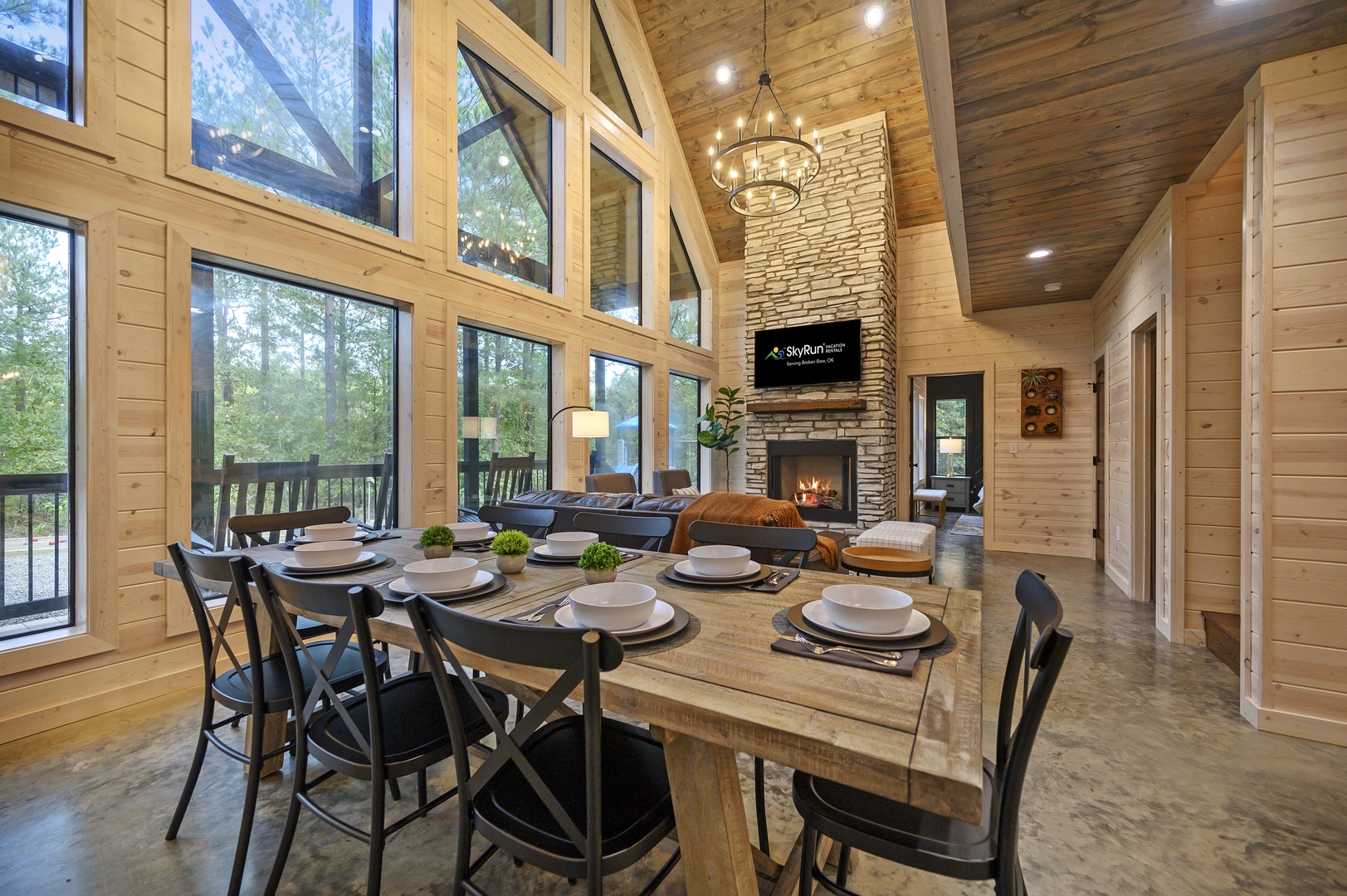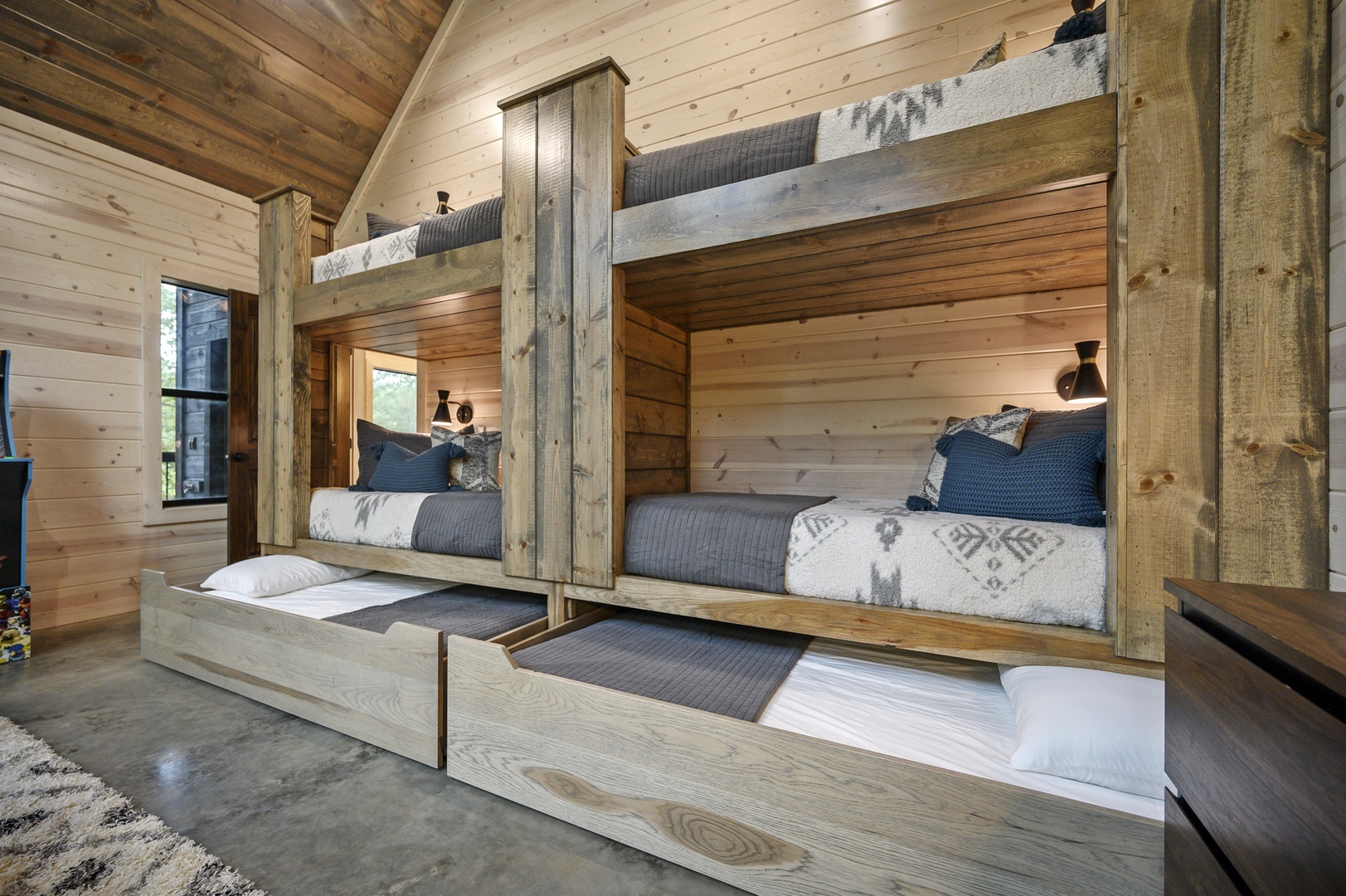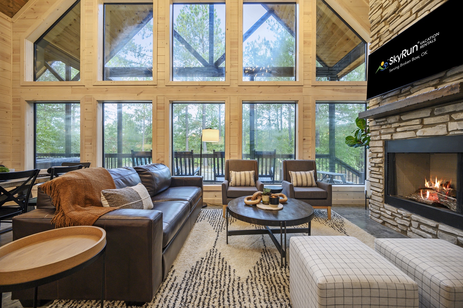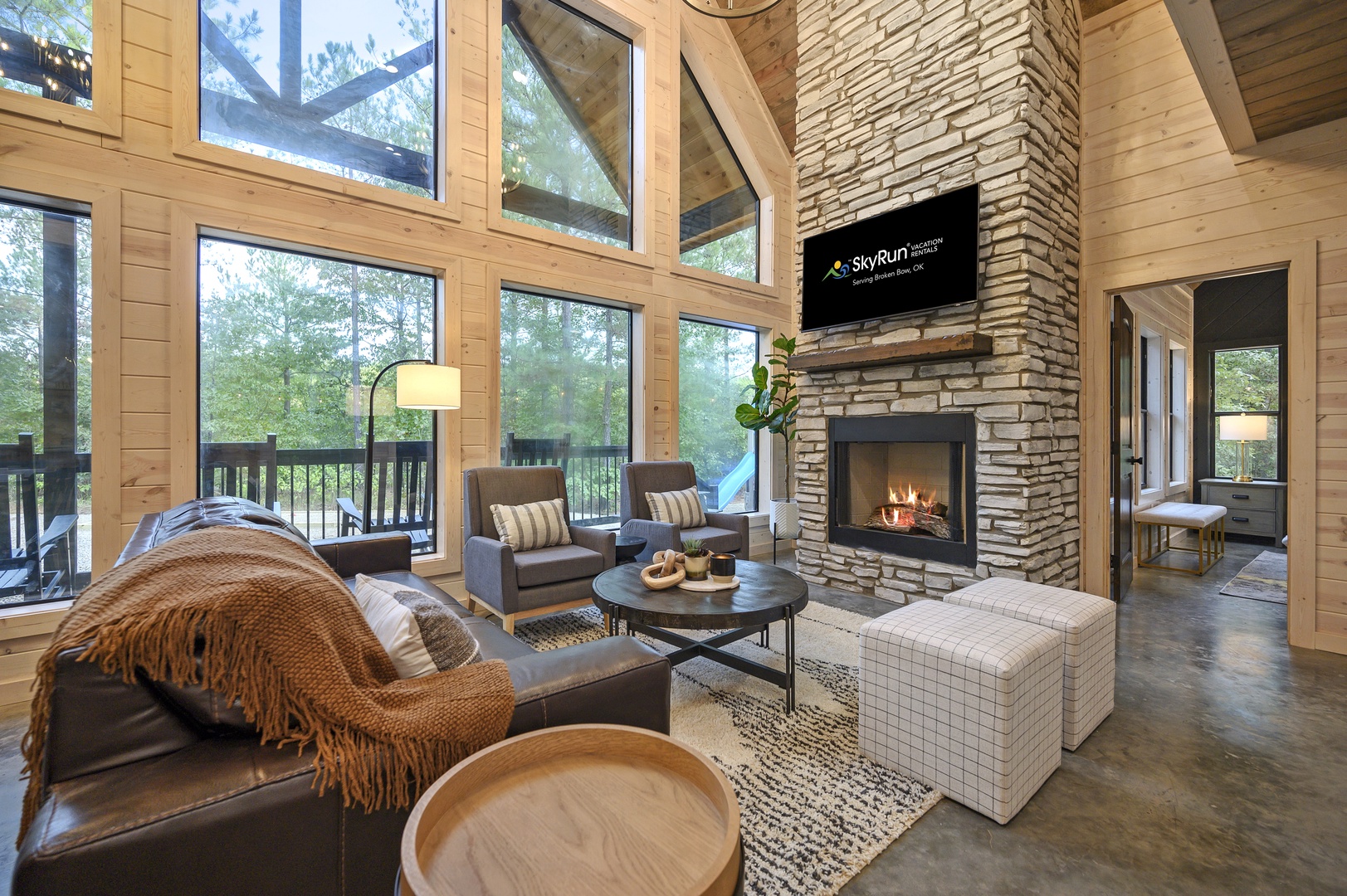 Night Owl Home Broken Bow Night Owl Back to Search Results Night Owl Open Gallery Gallery View Broken Bow, Oklahoma 3 Bedrooms 3 full, 1 half Baths 14 Guests Pets OK Description Rooms Amenities Reviews Calendar Location Night Owl is a luxurious, brand-new cabin nestled in a secluded cul-de-sac in Cedar Hills, Broken Bow, Oklahoma. Surrounded by a serene tree farm, this two-story retreat comfortably sleeps 14 guests and is perfect for families and friends seeking a peaceful escape (bring those furry friends with you too, because this cabin is pet friendly - see the end of this description for fee info and services you can add to your stay)! The cabin features two king suites with en-suite bathrooms, a spacious bunk room, and an open-concept living area with a stone fireplace and floor-to-ceiling windows. Guests will love the en suite sanctuaries, tastefully decked out bunk room, and chef’s kitchen, while the outdoor space offers a large porch with a gas-log fireplace, hot tub, propane grill, playscape, and outdoor games like cornhole, yard Yahtzee, and bocce ball. A stone fire pit for roasting marshmallows and gathering together as family or friends (or both) adds extra fun to the experience. Conveniently located for short drives to Hochatown, downtown Broken Bow, Beavers Bend State Park, the new Choctaw Landing casino, and a quick trip to Broken Bow Lake, Night Owl is the ideal base for both relaxation and adventure. Whether you’re soaking in the hot tub or exploring the nearby attractions, this spacious retreat has everything you need for an unforgettable stay. As soon as you step through the front door, you’re greeted by a chef’s kitchen that will inspire any culinary enthusiast. Featuring quartz countertops, stainless steel appliances, and a wine fridge, this kitchen is the perfect space to gather and create memorable meals. With its open floor plan and walls of windows, the living area fills with natural light, offering a seamless connection between indoor and outdoor living. The living room, with its stone fireplace and cozy seating, is ideal for unwinding after a day of exploring the nearby Beavers Bend State Park or Broken Bow Lake. Whether you’re dining at the eight-seat table or snacking at the kitchen island, you’ll never feel disconnected from the group, thanks to the cabin’s inviting, communal design. Night Owl boasts two king suites, each offering a private sanctuary with plush bedding, 55-inch smart TVs, and spa-like en-suite bathrooms. These bathrooms are designed for ultimate relaxation, featuring soaking tubs, walk-in showers, and spacious vanities. One suite is conveniently located on the ground floor, while the second suite upstairs comes with its own game loft, perfect for poker nights or board games with the family. For the younger (or young-at-heart) guests, the downstairs bunk room is a dream come true. With two twin-over-twin built-in bunk beds, complete with pull-out trundles, and a sleeper sofa, this room comfortably sleeps up to 8. The bunk room isn’t just for sleeping—it’s a fun zone equipped with a game console and foosball table, ready to spark some friendly competition. At Night Owl, the outdoor experience is just as incredible as the indoor one. Step out onto the expansive back porch and take in the serene views of the lush tree farm that stretches endlessly before you. Whether you're sipping your morning coffee or enjoying an evening drink by the outdoor gas-log fireplace, this peaceful setting will quickly become your favorite spot. When it’s time to dine al fresco, fire up the propane grill and enjoy meals at the outdoor dining table, surrounded by the beauty of nature. Afterward, relax in the large hot tub, perfectly positioned in front of the outdoor TV and fireplace—a perfect way to unwind after a day of adventure. For those who love a little friendly competition, the outdoor area is packed with fun activities, including a playscape, yard Yahtzee, cornhole, horseshoes and bocce ball. And no cabin getaway is complete without a stone fire pit, where you can roast marshmallows, tell stories, and create memories that will last a lifetime. Night Owl is designed with families in mind. Kids will love the outdoor playscape, and parents will appreciate the desk tucked into the downstairs king suite, offering a quiet spot to work remotely or catch up on emails. With reliable Wi-Fi and smart TVs throughout the cabin, you’ll have all the modern amenities you need while still feeling far from the hustle and bustle of everyday life. Located just a short drive from Hochatown, Beavers Bend State Park, and Broken Bow Lake, Night Owl is perfectly situated for those looking to explore the natural beauty of southeast Oklahoma. Whether you’re hiking, boating, or dining at local restaurants, everything is within reach while still allowing you to return to the privacy and tranquility of your secluded cabin. Come experience the luxury, comfort, and natural beauty that Night Owl offers. This isn’t just a cabin; it’s a retreat where cherished memories are made. Whether you’re relaxing by the fire, soaking in the hot tub, or enjoying a game night in the loft, Night Owl provides the perfect backdrop for your Broken Bow getaway. Book your stay today and immerse yourself in the unparalleled serenity of this one-of-a-kind luxury cabin. Guest notes and added services:  P e t s : *There is a flat fee of $50/night if you are bringing pet(s). Pet limit is 2. Please reach out to us if you have a special request. F i r e w o o d:  You can opt for bundles of firewood to be delivered to your cabin for your stay. 6-8 pieces (depending on size) for $20. Fee is collected after the reservation confirmation has been sent. E a r l y / L a t e: We may be able to offer early check-in or late check-out (2 additional hours) for $50 unless there is another reservation within 24 hours of your reservation. This must be requested and approved by your SkyRun host!