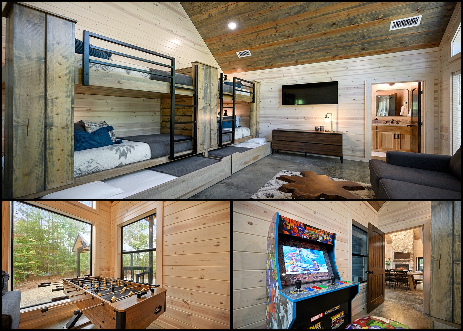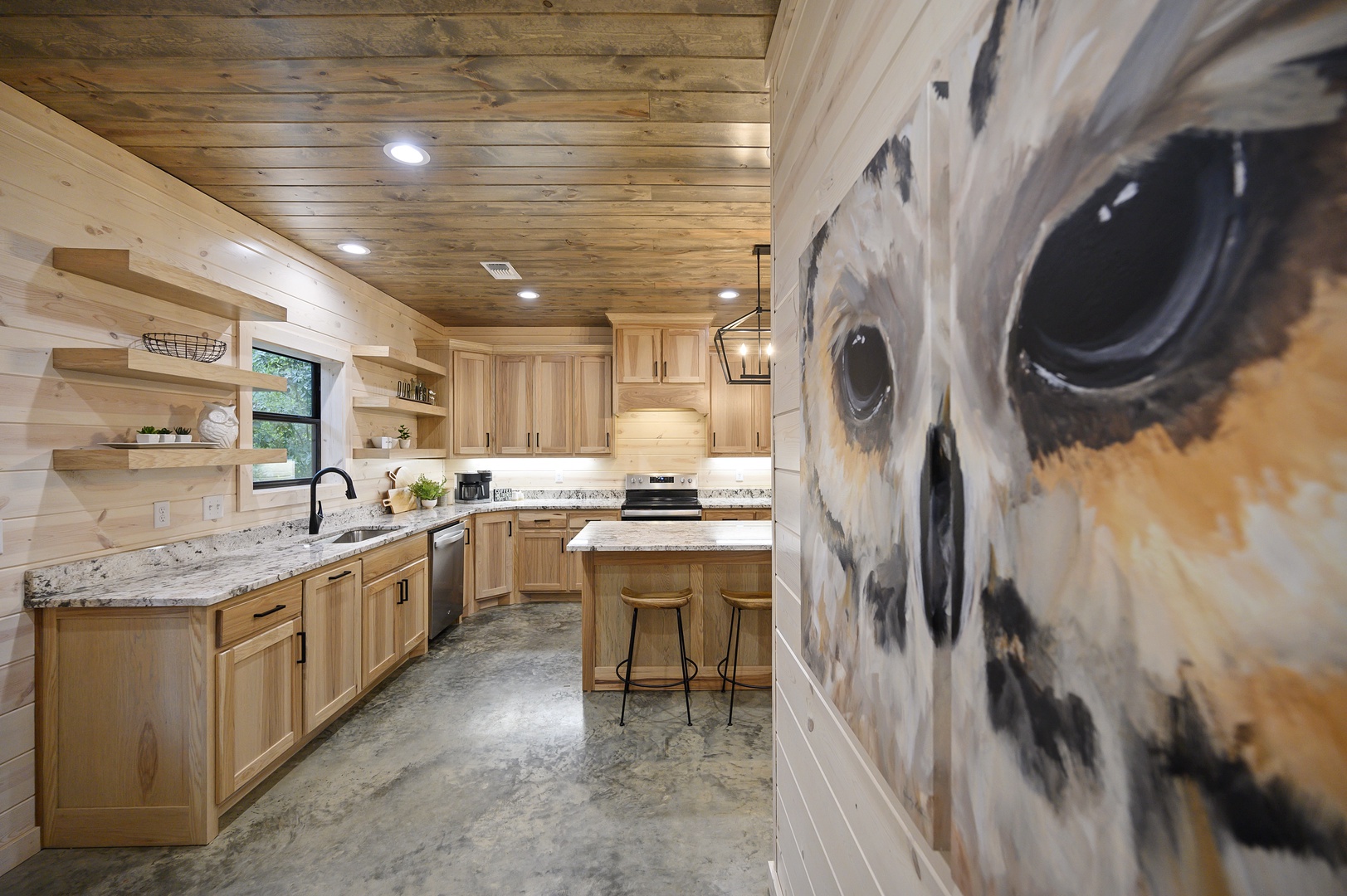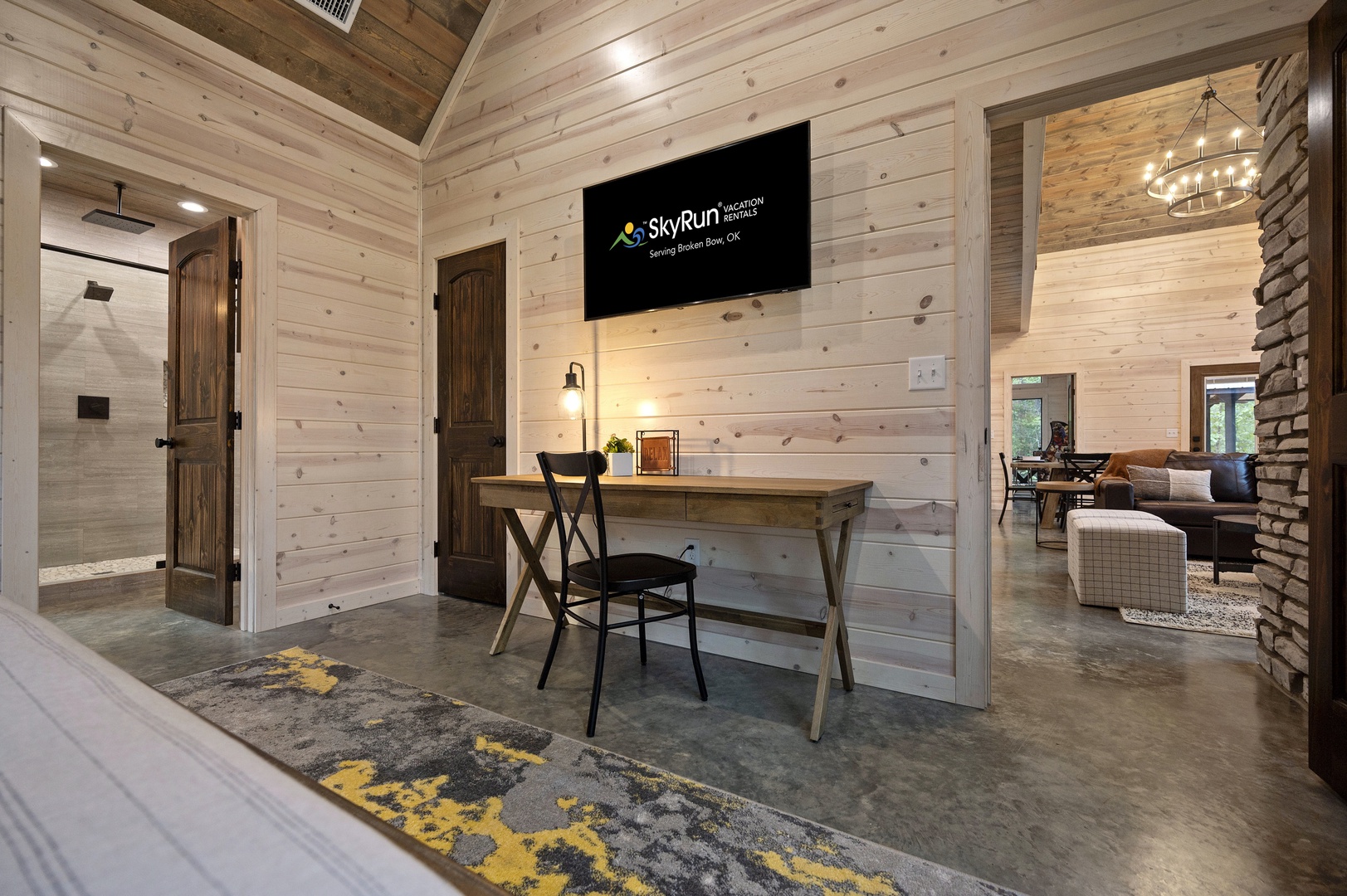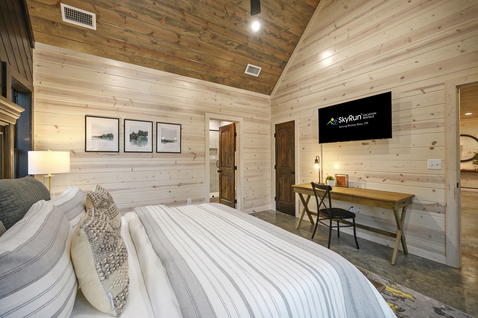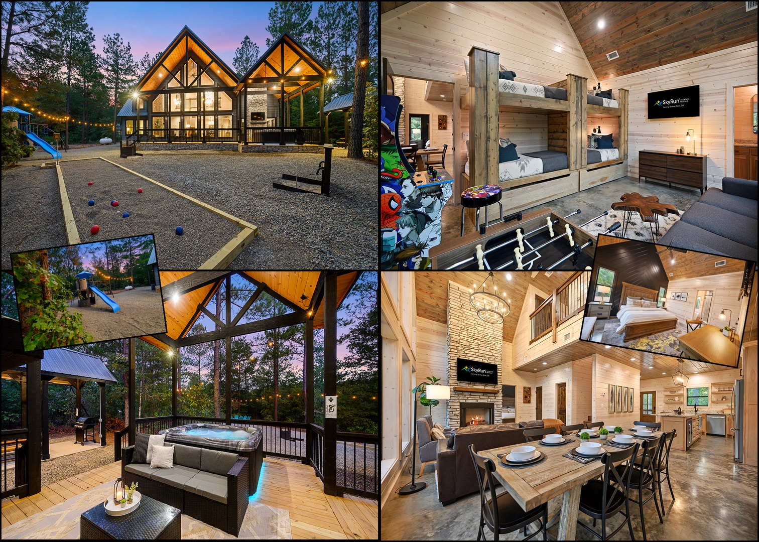 Night Owl Home Broken Bow Night Owl Back to Search Results Night Owl Open Gallery Gallery View Broken Bow, Oklahoma 3 Bedrooms 3 full, 1 half Baths 14 Guests Pets OK Description Rooms Amenities Reviews Calendar Location Night Owl is a luxurious, brand-new cabin nestled in a secluded cul-de-sac in Cedar Hills, Broken Bow, Oklahoma. Surrounded by a serene tree farm, this two-story retreat comfortably sleeps 14 guests and is perfect for families and friends seeking a peaceful escape (bring those furry friends with you too, because this cabin is pet friendly - see the end of this description for fee info and services you can add to your stay)! The cabin features two king suites with en-suite bathrooms, a spacious bunk room, and an open-concept living area with a stone fireplace and floor-to-ceiling windows. Guests will love the en suite sanctuaries, tastefully decked out bunk room, and chef’s kitchen, while the outdoor space offers a large porch with a gas-log fireplace, hot tub, propane grill, playscape, and outdoor games like cornhole, yard Yahtzee, and bocce ball. A stone fire pit for roasting marshmallows and gathering together as family or friends (or both) adds extra fun to the experience. Conveniently located for short drives to Hochatown, downtown Broken Bow, Beavers Bend State Park, the new Choctaw Landing casino, and a quick trip to Broken Bow Lake, Night Owl is the ideal base for both relaxation and adventure. Whether you’re soaking in the hot tub or exploring the nearby attractions, this spacious retreat has everything you need for an unforgettable stay. As soon as you step through the front door, you’re greeted by a chef’s kitchen that will inspire any culinary enthusiast. Featuring quartz countertops, stainless steel appliances, and a wine fridge, this kitchen is the perfect space to gather and create memorable meals. With its open floor plan and walls of windows, the living area fills with natural light, offering a seamless connection between indoor and outdoor living. The living room, with its stone fireplace and cozy seating, is ideal for unwinding after a day of exploring the nearby Beavers Bend State Park or Broken Bow Lake. Whether you’re dining at the eight-seat table or snacking at the kitchen island, you’ll never feel disconnected from the group, thanks to the cabin’s inviting, communal design. Night Owl boasts two king suites, each offering a private sanctuary with plush bedding, 55-inch smart TVs, and spa-like en-suite bathrooms. These bathrooms are designed for ultimate relaxation, featuring soaking tubs, walk-in showers, and spacious vanities. One suite is conveniently located on the ground floor, while the second suite upstairs comes with its own game loft, perfect for poker nights or board games with the family. For the younger (or young-at-heart) guests, the downstairs bunk room is a dream come true. With two twin-over-twin built-in bunk beds, complete with pull-out trundles, and a sleeper sofa, this room comfortably sleeps up to 8. The bunk room isn’t just for sleeping—it’s a fun zone equipped with a game console and foosball table, ready to spark some friendly competition. At Night Owl, the outdoor experience is just as incredible as the indoor one. Step out onto the expansive back porch and take in the serene views of the lush tree farm that stretches endlessly before you. Whether you're sipping your morning coffee or enjoying an evening drink by the outdoor gas-log fireplace, this peaceful setting will quickly become your favorite spot. When it’s time to dine al fresco, fire up the propane grill and enjoy meals at the outdoor dining table, surrounded by the beauty of nature. Afterward, relax in the large hot tub, perfectly positioned in front of the outdoor TV and fireplace—a perfect way to unwind after a day of adventure. For those who love a little friendly competition, the outdoor area is packed with fun activities, including a playscape, yard Yahtzee, cornhole, horseshoes and bocce ball. And no cabin getaway is complete without a stone fire pit, where you can roast marshmallows, tell stories, and create memories that will last a lifetime. Night Owl is designed with families in mind. Kids will love the outdoor playscape, and parents will appreciate the desk tucked into the downstairs king suite, offering a quiet spot to work remotely or catch up on emails. With reliable Wi-Fi and smart TVs throughout the cabin, you’ll have all the modern amenities you need while still feeling far from the hustle and bustle of everyday life. Located just a short drive from Hochatown, Beavers Bend State Park, and Broken Bow Lake, Night Owl is perfectly situated for those looking to explore the natural beauty of southeast Oklahoma. Whether you’re hiking, boating, or dining at local restaurants, everything is within reach while still allowing you to return to the privacy and tranquility of your secluded cabin. Come experience the luxury, comfort, and natural beauty that Night Owl offers. This isn’t just a cabin; it’s a retreat where cherished memories are made. Whether you’re relaxing by the fire, soaking in the hot tub, or enjoying a game night in the loft, Night Owl provides the perfect backdrop for your Broken Bow getaway. Book your stay today and immerse yourself in the unparalleled serenity of this one-of-a-kind luxury cabin. Guest notes and added services:  P e t s : *There is a flat fee of $50/night if you are bringing pet(s). Pet limit is 2. Please reach out to us if you have a special request. F i r e w o o d:  You can opt for bundles of firewood to be delivered to your cabin for your stay. 6-8 pieces (depending on size) for $20. Fee is collected after the reservation confirmation has been sent. E a r l y / L a t e: We may be able to offer early check-in or late check-out (2 additional hours) for $50 unless there is another reservation within 24 hours of your reservation. This must be requested and approved by your SkyRun host!
