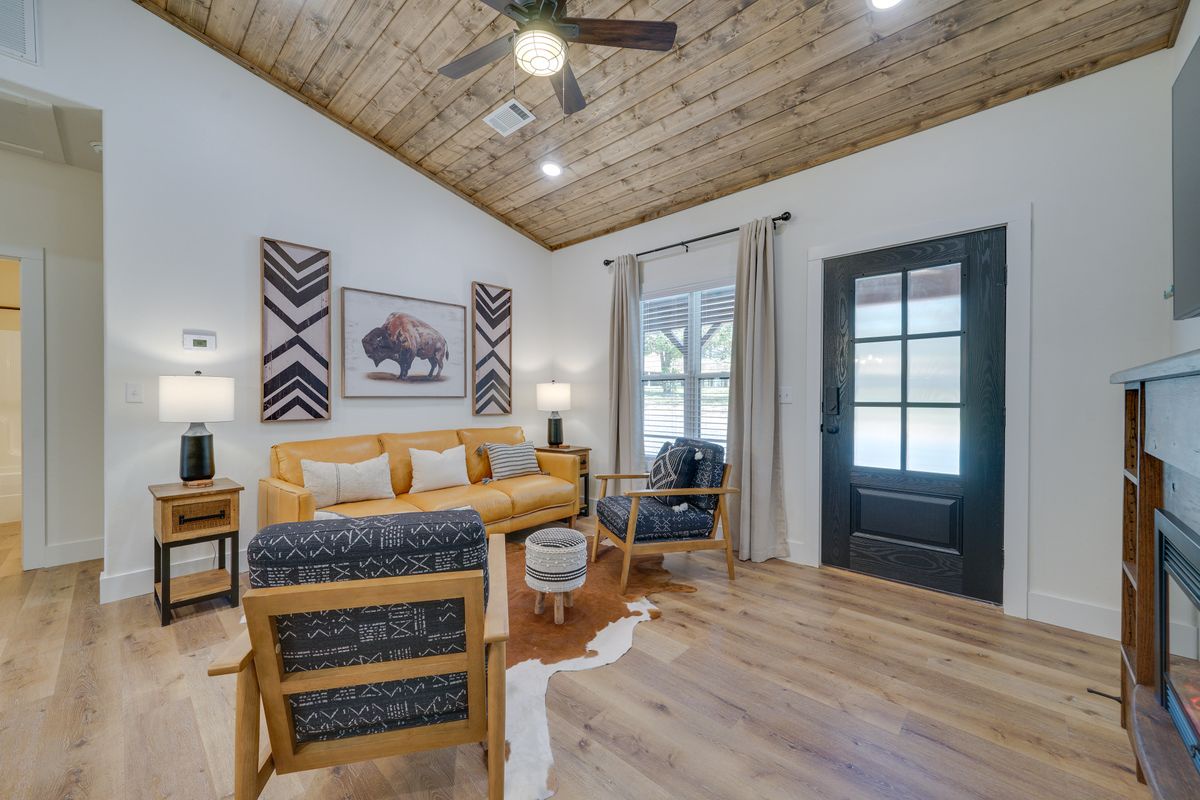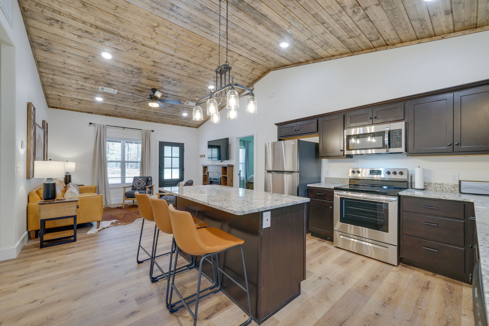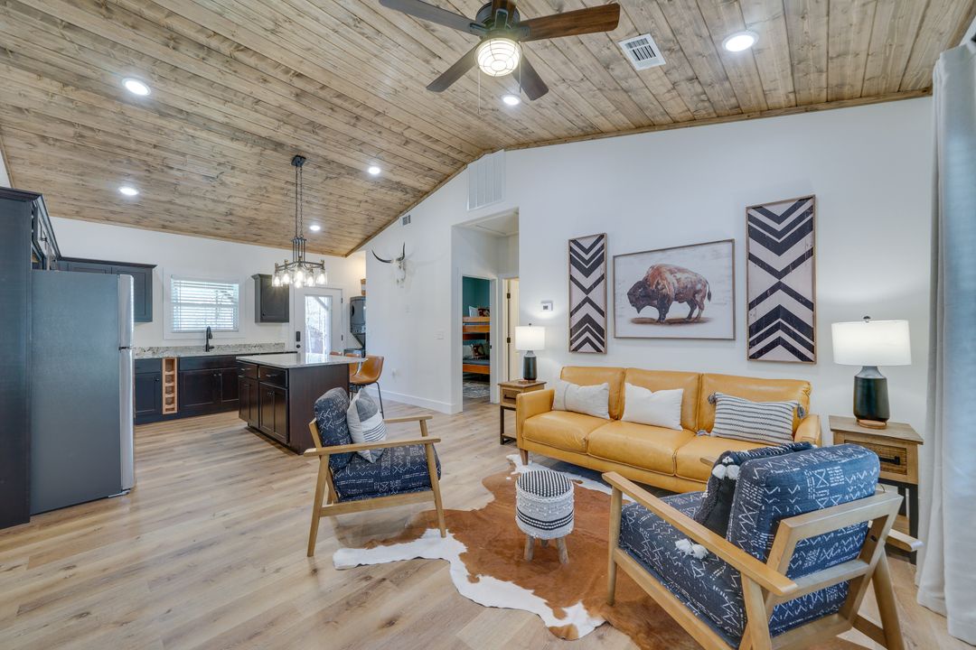 Western Wild Home Broken Bow Western Wild Western Wild Open Gallery 3 Gallery View Broken Bow, Oklahoma 3 Bedrooms 2 full Baths 7 Guests Pets OK Description Rooms Amenities Reviews Calendar Location Welcome to Western Wild — your perfect getaway to the scenic beauty and endless adventure of Broken Bow, Oklahoma! This 3-bedroom, 2-bathroom cabin is thoughtfully designed to offer a relaxing, stylish, and adventure-filled escape for up to 7 guests and your furry friends (see the end of this description for related fee and add-on services). With nearby scenic hiking trails, serene lakeside beaches, and the excitement of the new Choctaw Landing Casino just across the road, you'll have access to the best of Broken Bow right at your fingertips. The Property SLEEPING ARRANGEMENTS: Bedroom 1: King Bed Bedroom 2: Queen Bed Bedroom 3: 1 Bunk - Twin over Full Whether you’re traveling with family or friends, the thoughtfully curated sleeping arrangements ensure everyone has a comfortable retreat at the end of the day. INDOOR LIVING - Spacious open floor plan with modern Western-inspired decor - Electric fireplace to create a warm and cozy ambiance - Large Smart TVs for streaming your favorite shows and movies - Relaxing garden tub and a sleek walk-in shower for a spa-like experience The open-concept design provides an ideal space for gathering, relaxing, and unwinding together. Curl up by the electric fireplace with a good book, watch a movie on the large Smart TV, or enjoy a soak in the tranquil garden tub after a day of adventure. OUTDOOR LIVING: - 2 Covered Patios with lounge seating, perfect for morning coffee or evening chats - Adirondack Chairs to sit back and take in the stunning forest views Start your day with a cup of coffee on the covered patio while gazing at the tranquil forest views. In the evening, settle in under the stars for fresh air and relaxation in the inviting lounge spaces. KITCHEN & DINING: - Fully equipped kitchen with a stove/oven, refrigerator, and dishwasher - Small appliances including a microwave and Keurig coffee maker - Stocked with essential cookware, dishware, flatware, and cooking basics - Starter supply of trash bags, paper towels, and other essentials provided (please note they are not replenished during your stay) Cook up a family favorite or try a new recipe in the updated kitchen. Enjoy your meals together at the dining table or step outside to dine alfresco on the patio while savoring the sounds of nature. GENERAL AMENITIES: - High-speed WiFi - Keyless entry for easy, contact-free check-in - Linens and towels provided for your convenience - Central A/C and heat, plus ceiling fans for year-round comfort - Washer and dryer for mid-stay laundry needs From fresh linens to high-speed WiFi, you’ll have everything you need for a stress-free vacation. PARKING: - Shared driveway with space for up to 3 vehicles - Additional shared parking available on-site - Boat and trailer parking available for added convenience Ample parking makes it easy to bring along your boat, trailer, or multiple vehicles, ensuring a hassle-free arrival and departure. ADDITIONAL ACCOMMODATIONS: This property is one of four cabins on the same lot; all 4 properties can be booked together for large groups or multi-family getaways so that each group can have their own cabin and accommodations! Reach out to us for more information on booking the other cabins! IMPORTANT INFORMATION - There are other bookable vacation rentals on-site, so you may encounter other travelers from afar, during your stay. Western Wild combines rustic charm with modern convenience, providing a home away from home where you can create unforgettable memories. Whether you’re here for hiking, fishing, or trying your luck at the casino, this Broken Bow retreat offers the perfect base for your adventure-filled escape. Book your stay today and experience the magic of Western Wild! GUEST NOTES AND ADDED SERVICES: P E T S : There is a flat fee of $50/night if you are bringing pet(s). Please reach out to us if you have a special request. F I R E W O O D : You can opt for bundles of firewood to be delivered to your cabin for your stay. 6-8 pieces (depending on size) for $20. Fee is collected after the reservation confirmation has been sent. E A R L Y / L A T E: We may be able to offer early check-in or late check-out (2 additional hours) for $50 unless there is another reservation within 24 hours of your reservation. This must be requested and approved by your SkyRun host! We compensate our team additional funds for accommodating guest requests and coordinating their daily schedules and/or working after hours to help make this happen for our valued guests. Fee is collected after the reservation confirmation has been sent. F i r e p l a c e s : Fireplaces are free to be enjoyed seasonally October 1st through April 30th. WIFI AVAILABILITY: Wi-Fi is provided as a complimentary convenience for our guest; however, it is not considered an essential part of the rental. Refunds will not be issued for Wi-Fi-related issues including connectivity, speed, local outages, or accessibility. What We Provide To help you settle in comfortably, we provide a starter supply of the following essentials: Kitchen • Paper towels • Garbage bags • Kitchen dish soap • Hand soap • Dishwashing pods or detergent • Dish sponge Drinks • Coffee • Creamer • Coffee filters Bathrooms • Shampoo • Conditioner • Body wash • Hand soap • Toilet paper Laundry • Laundry detergent Please note: These items are provided as a starter supply to get you through the first part of your stay. Guests may need to provide or purchase additional toiletries and supplies as needed. Rooms Primary En Suite Bedroom 1 King Queen Bedroom 1 Queen Bunkroom 1 Twin 1 Double Amenities Location & Attractions Marina Zoo Family Themed Health Beauty Spa Rural Sports, Leisure & Adventure Antiquing Horseback Riding Jet Skiing Paddle Boating Water Skiing Water Tubing Bird 