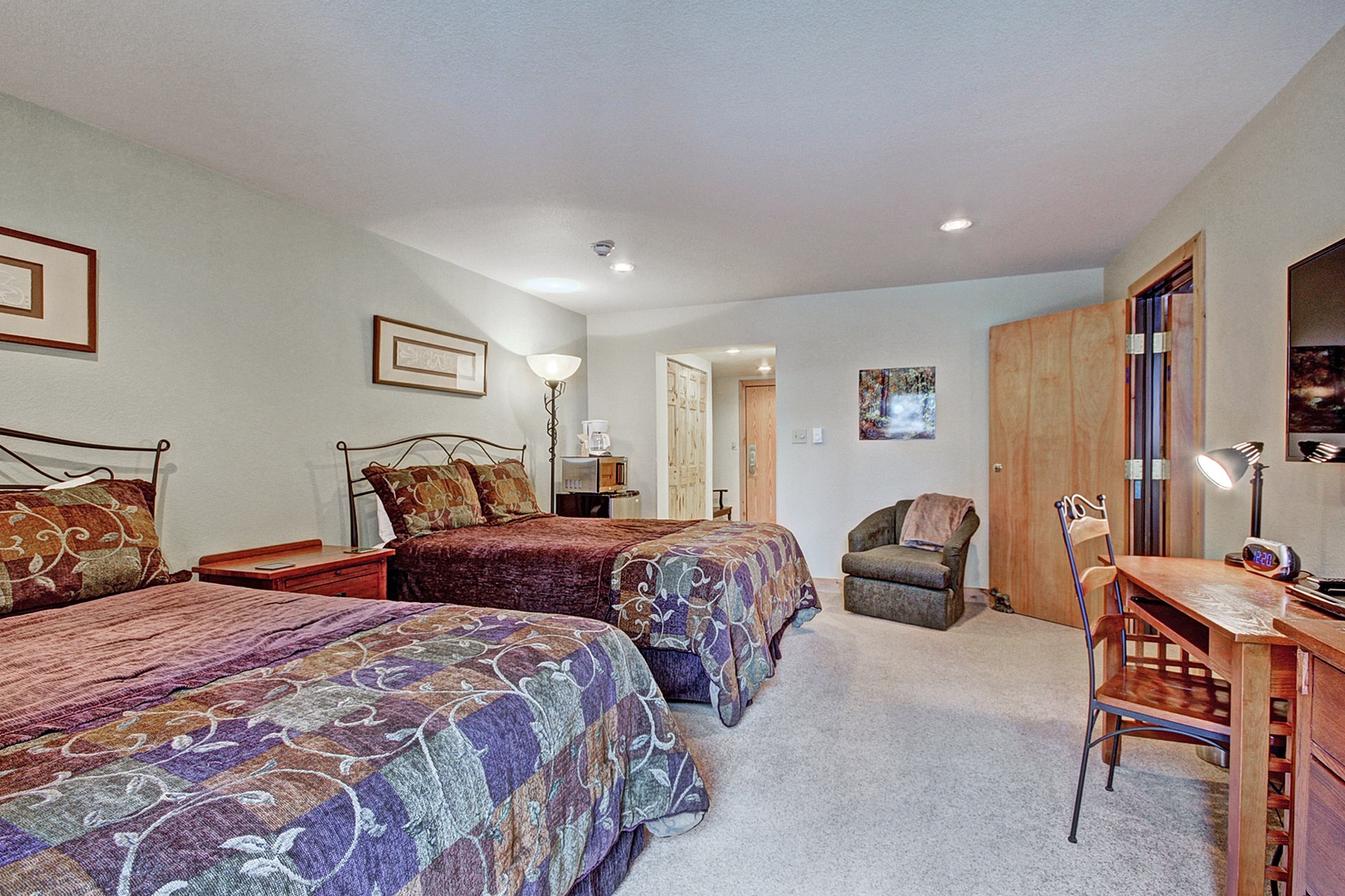 This fantastic second floor, ski-in/ski-out hotel room sleeps up to 4 people. It is easy to catch the first chair! Ski down to the base of the American Eagle Lift or the Green Acres learning area. Enjoy stunning views of towering lodge pole pine trees and Center Village from your private balcony. There are 2 Queen Beds, a TV, mini fridge, microwave, coffee maker, and a private balcony. There is a separate sink area and vanity just out side of the bathroom for extra space to get ready.