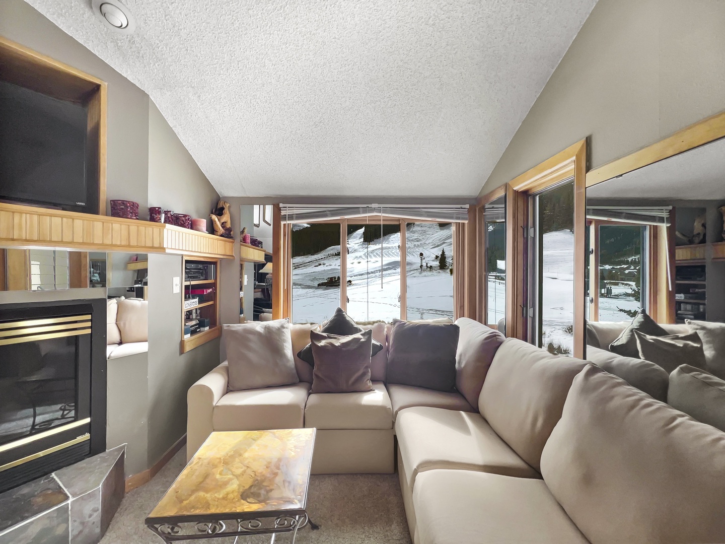 FP310 Foxpine Inn – Pet Friendly Home Colorado Copper Mountain FP310 Foxpine Inn - Pet Friendly FP310 Foxpine Inn - Pet Friendly A spacious living room with beige and teal seating, a fireplace, large windows, and a spiral staircase. Walls are adorned with decorative wooden accents. foxPineinn_common_005 A living room with two green chairs, a beige couch, a fireplace with a TV above it, a large framed mirror, lamps, and wall decor. The carpet is light-colored, and the walls are painted beige. A cozy living room with beige sofas, green chairs, a fireplace, a TV, and a spiral staircase. Large windows and a door provide natural light and a view outside. Open Gallery A spacious living room with beige and teal seating, a fireplace, large windows, and a spiral staircase. Walls are adorned with decorative wooden accents. foxPineinn_common_005 A living room with two green chairs, a beige couch, a fireplace with a TV above it, a large framed mirror, lamps, and wall decor. The carpet is light-colored, and the walls are painted beige. A cozy living room with beige sofas, green chairs, a fireplace, a TV, and a spiral staircase. Large windows and a door provide natural light and a view outside. A living room with beige and green seating, a metal spiral staircase, large mirrors, and a wooden door with glass panels. The space is well-lit, featuring decor items on the walls and shelves. A cozy living room with a beige sectional sofa, a small coffee table, a fireplace, and a large TV. Sunlight streams through a window that offers a snowy outdoor view. A cozy living room with a beige sectional sofa, a mirrored wall, a fireplace, and a large window offering a view of a snowy mountain landscape. Two chairs on a balcony overlook a snowy mountain landscape with ski slopes and evergreen trees under a blue sky with clouds. A dining area with a wooden table and chairs, next to a living space with a couch. A spiral staircase leads to an upper level. The room features wall art, a chandelier, and a large mirror. A dining area with a wooden table and black chairs is adjacent to a living room with beige sofas. A spiral staircase leads to an upper level. There are frames and a decorative piece on the walls. A living space features a spiral staircase, wooden dining table with chairs, and a living room with beige sofas. The room has large mirrors and wall-mounted decorations. Natural light filters in from windows. Dining area with a wooden table and six chairs, overlooking a kitchen with stainless steel appliances. A chandelier hangs above the table, and a large mirror is mounted on the wall to the right. A compact kitchen featuring stainless steel appliances, light wooden cabinets, tiled backsplash and beige countertops, complete with a sink, stovetop, oven, microwave, and small appliances. A modern living room with a spiral staircase, dark furniture, and a marble countertop in the foreground. The walls are adorned with artwork and a chandelier hangs from the ceiling. A modern kitchen with light wood cabinets, stainless steel refrigerator, stove, microwave, and granite countertops. The counter has a sink and various kitchen items. A kitchen with granite countertops, light wood cabinets, stainless steel refrigerator, black microwave, stovetop, and a colorful tile backsplash featuring flowers and a hummingbird. A small kitchen with light wood cabinets, stainless steel appliances, including a refrigerator, oven, and dishwasher, and a granite countertop part of which forms a breakfast bar. A bedroom with a wooden bed frame, multicolored striped bedding, two wooden nightstands with lamps, and a painting of red trees on the wall. Mirrors are on both sides, and an ensuite bathroom is visible. A cozy bedroom with a wooden bed, striped bedding, a patterned chair, a dresser holding a TV, and a window displaying snow-covered trees outside. A table lamp stands on a nightstand beside the bed. A cozy room with two green chairs, a wooden desk, and a chair by large windows that overlook a snowy mountain landscape. A lamp, framed picture, and small table are also present. A bedroom with two wooden bunk beds, a TV on a small cabinet, a wooden chair, and a desk with a lit lamp in the adjoining room. The beds have plaid and camo-patterned bedding. A bathroom features a hexagonal glass shower, a vanity with a sink and large mirror, and towels hanging on a wooden rack. Simple decor includes framed pictures on the walls. A small bathroom with a light-colored vanity, tiled countertop, large mirror, and overhead lighting. It includes a shower-tub combination with a curtain and a towel on a brushed nickel rack. A bathroom with a single sink vanity, a lighted mirror, and a hairdryer. Adjacent to the vanity is a bathtub with a wall-mounted showerhead and a dark shower curtain. A bathroom featuring a bathtub with tile walls, a purple shower curtain, a framed picture on the wall, a toilet, and a white towel hanging on a hook. A cozy bedroom with two beds, plaid bedding, an overhead lamp, wall-mounted TV, airplane decor on the walls, a lamp, and a window with curtains leading to a balcony. A bedroom with two beds dressed in plaid bedding, a wooden cabinet, mirrored closet doors, a lamp, and wall-mounted decorations. View from a green metal building balcony overlooking a snow-covered landscape with hills and some evergreen trees under a partly cloudy sky. Snow-covered ski slopes surrounded by pine trees on a partly cloudy day. A bedroom with a bed, a bunk bed, a desk and chair by the window, a painting on the wall, and a doorway leading to another room. A bedroom with a plaid comforter on the bed, a painting of a motorcycle on one wall, two snowshoes mounted on another wall, and wooden closet doors. A bedroom with a cozy bed, plaid quilt, and snowshoes mounted on the wall above the headboard. The room has a nightstand with a lamp, a wall-mounted TV, and a balcony with sliding glass doors. Small bathroom with a sink, mirror, towel rack, hairdryer, an