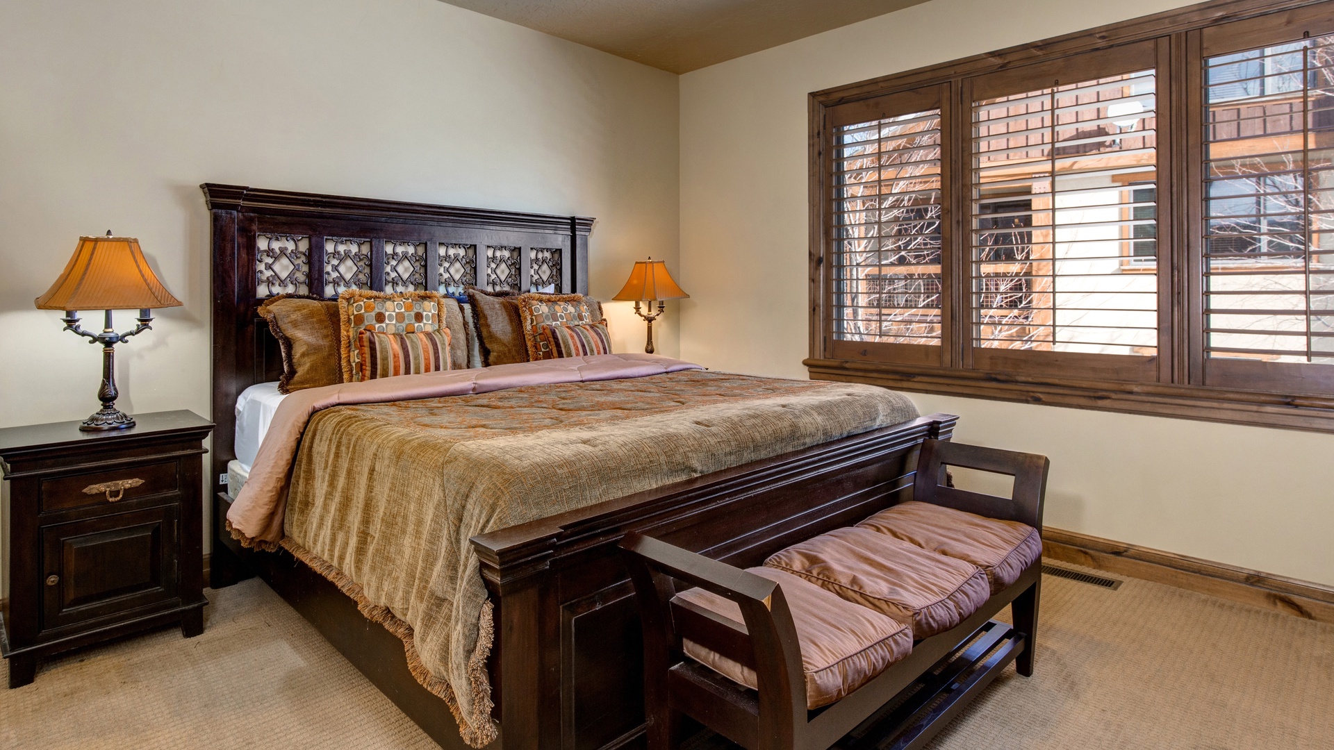 First Master Bedroom: On this level, you'll find the first master bedroom, replete with a king-sized bed sporting a comfortable memory-foam mattress. It also offers a walk-in closet with ample storage space and an attached full bathroom, featuring a jetted tub and separate shower.