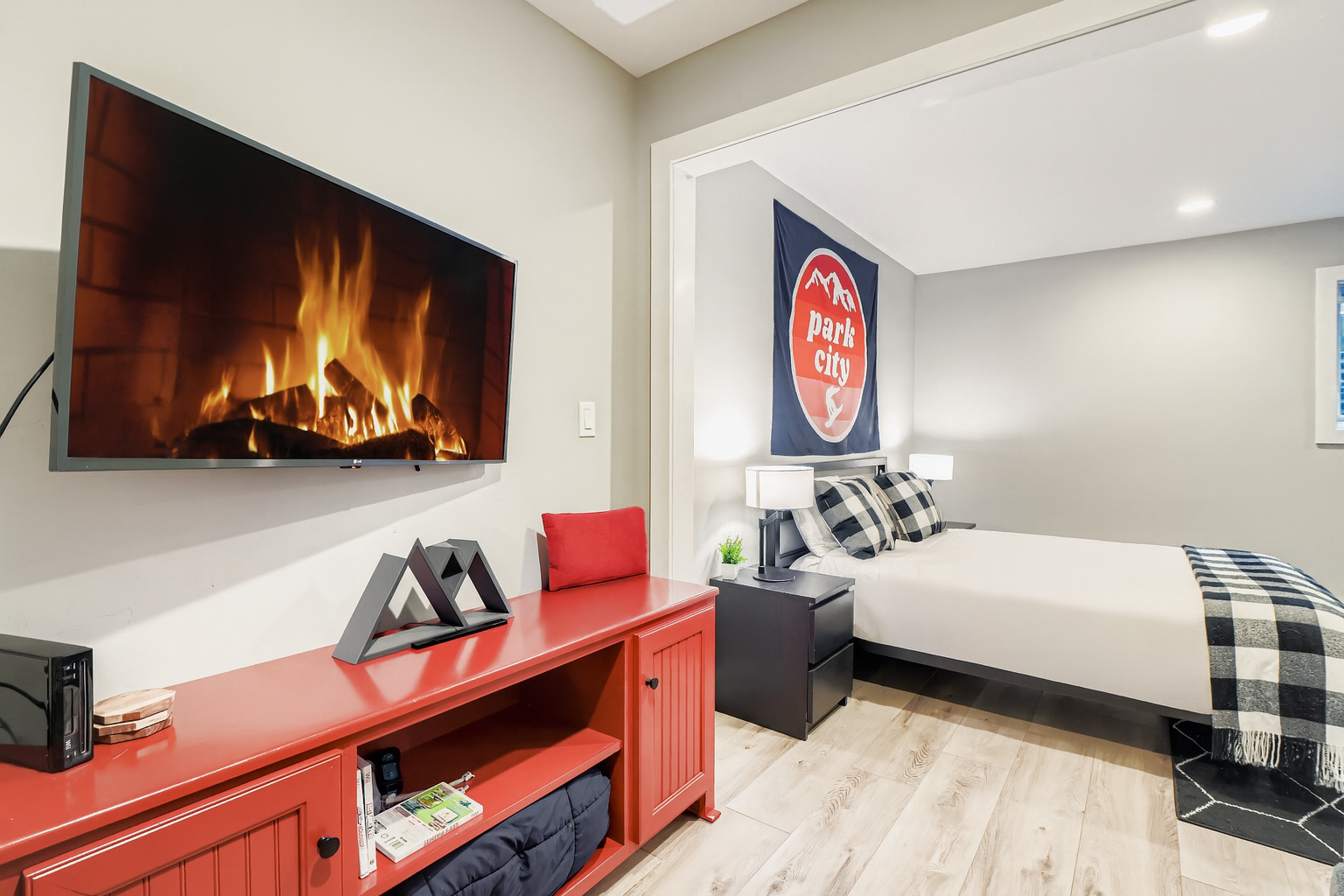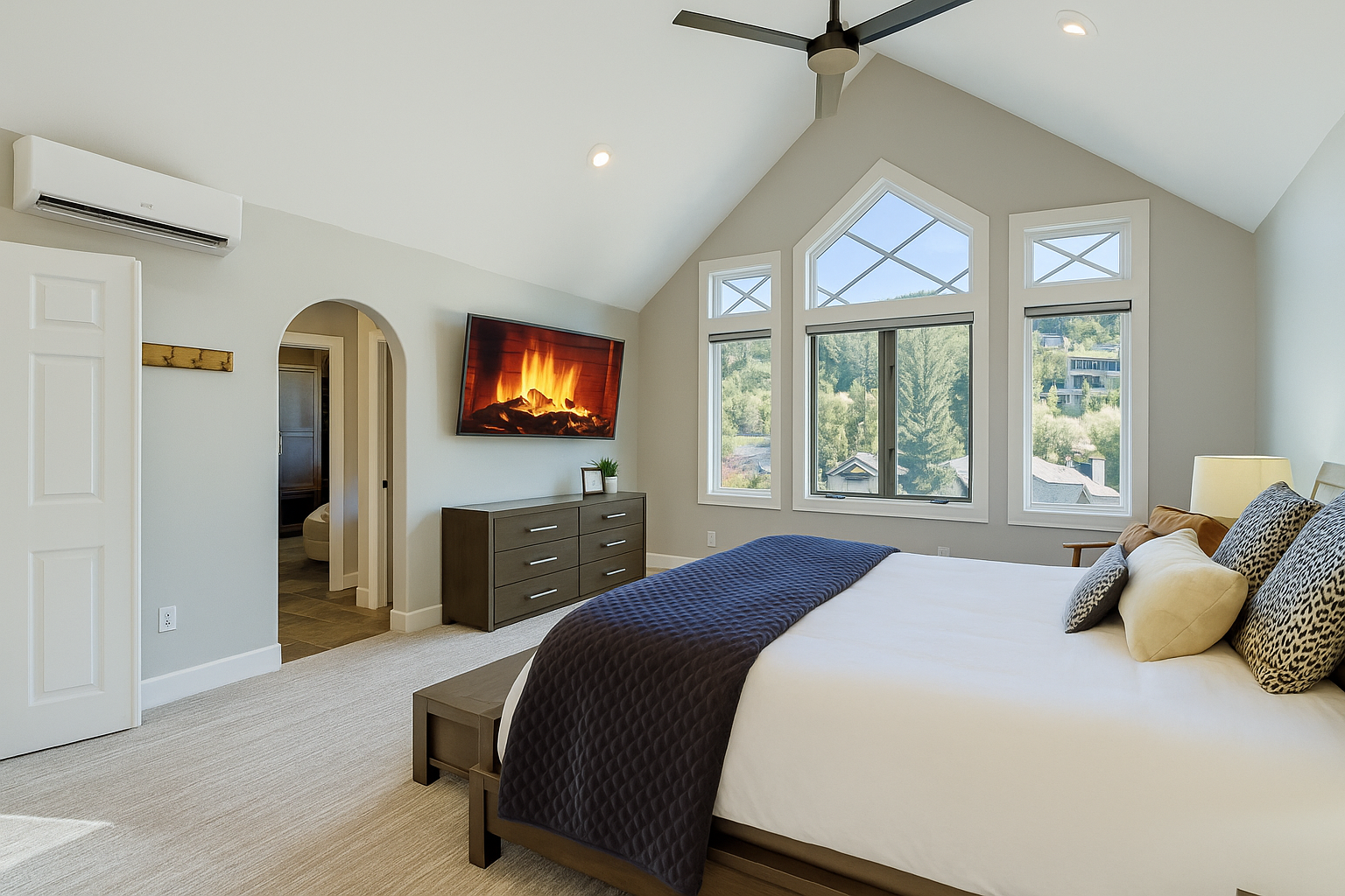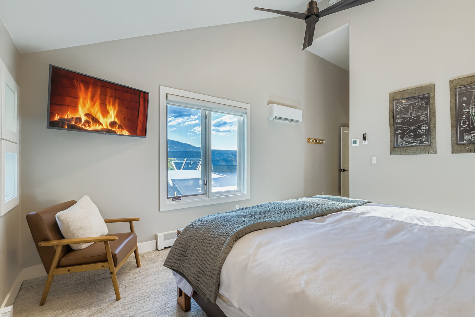 Upstairs, each of the three bedrooms offers privacy and relaxation, with its own full en suite bathroom. The luxurious master suite is a true retreat, featuring a plush king bed, large windows, and a second wood-burning fireplace—perfect for cozy nights in. The spa-inspired master bath includes a jetted soaking tub, dual vanities, and a walk-in shower for a truly indulgent experience. The additional bedrooms are equally well-appointed, ensuring that every guest enjoys restful nights and refined comfort.
