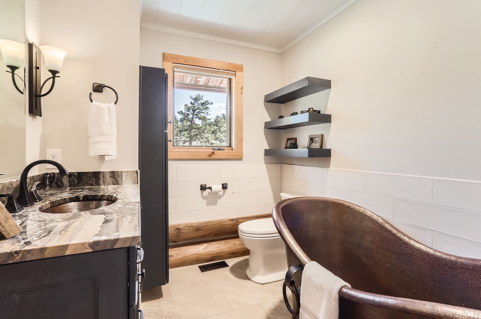 Down the short hall from the kitchen is a bathroom with a deep copper soaking tub offering a great place to soak away the day in solitude. Next to the bathroom is a cozy bedroom with a queen bed for a peaceful night’s sleep at the end of the day.