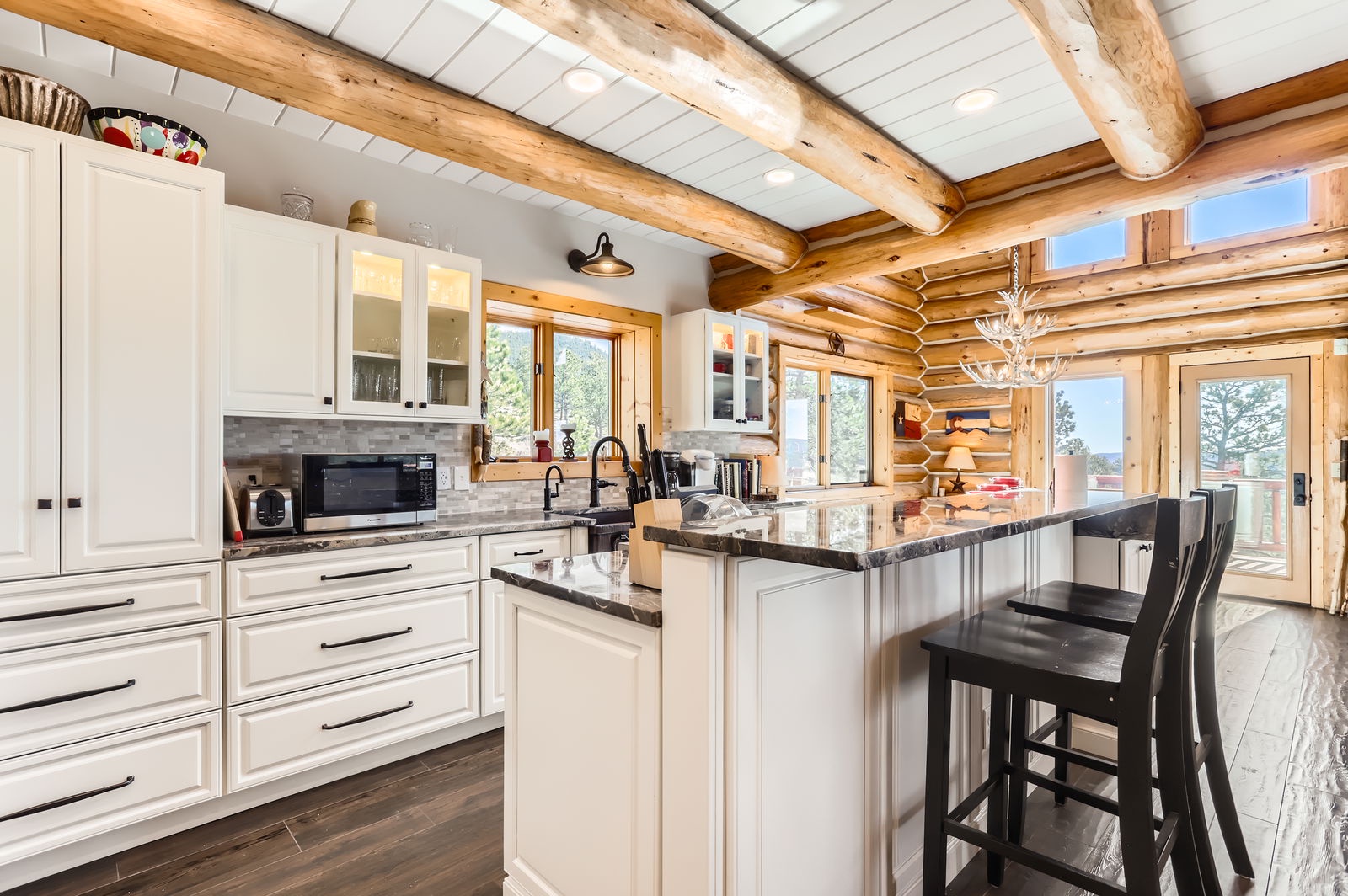 One flight of stairs takes you to the cozy open concept great room. The amazing 2-story floor to ceiling stone fireplace is the focal point of this beautiful home. Build a fire and snuggle in for a relaxing evening.
