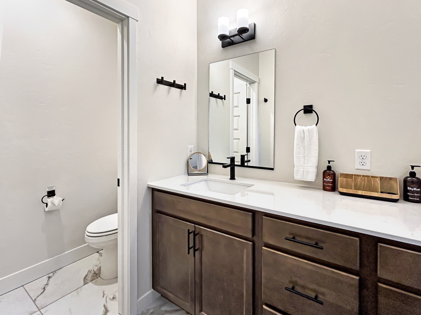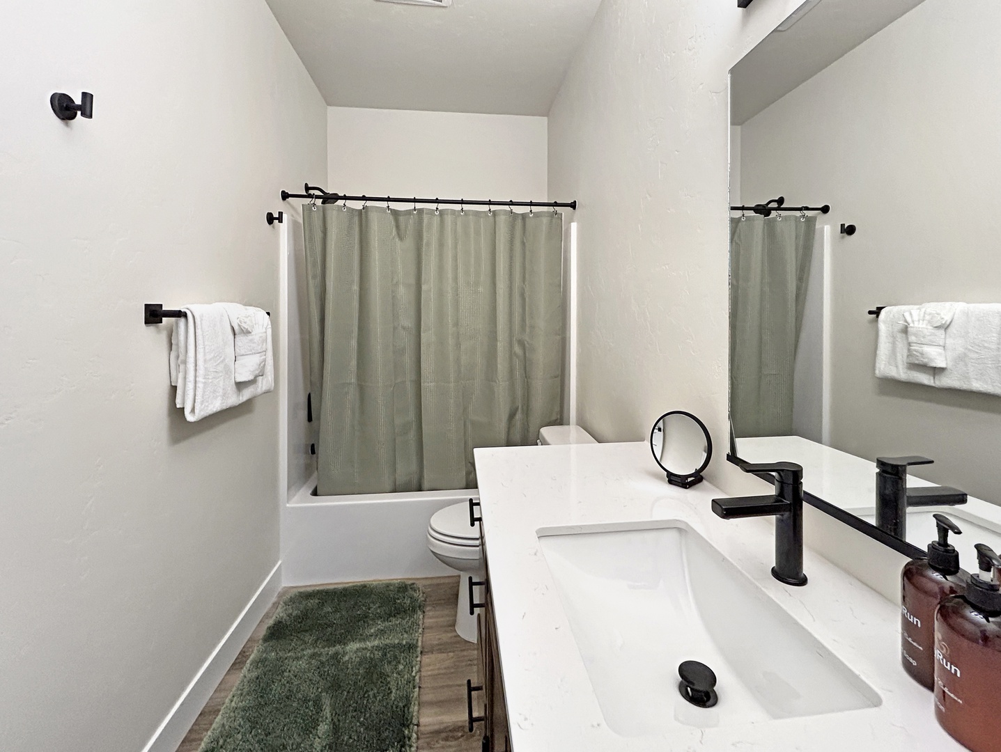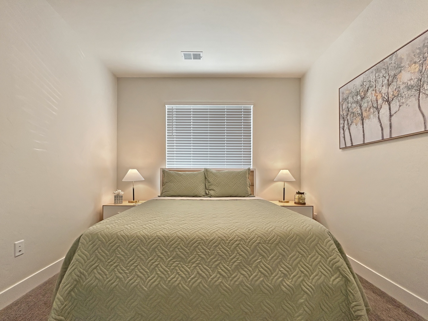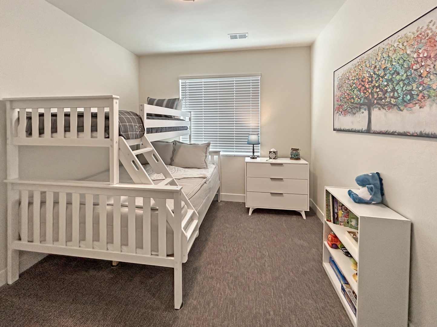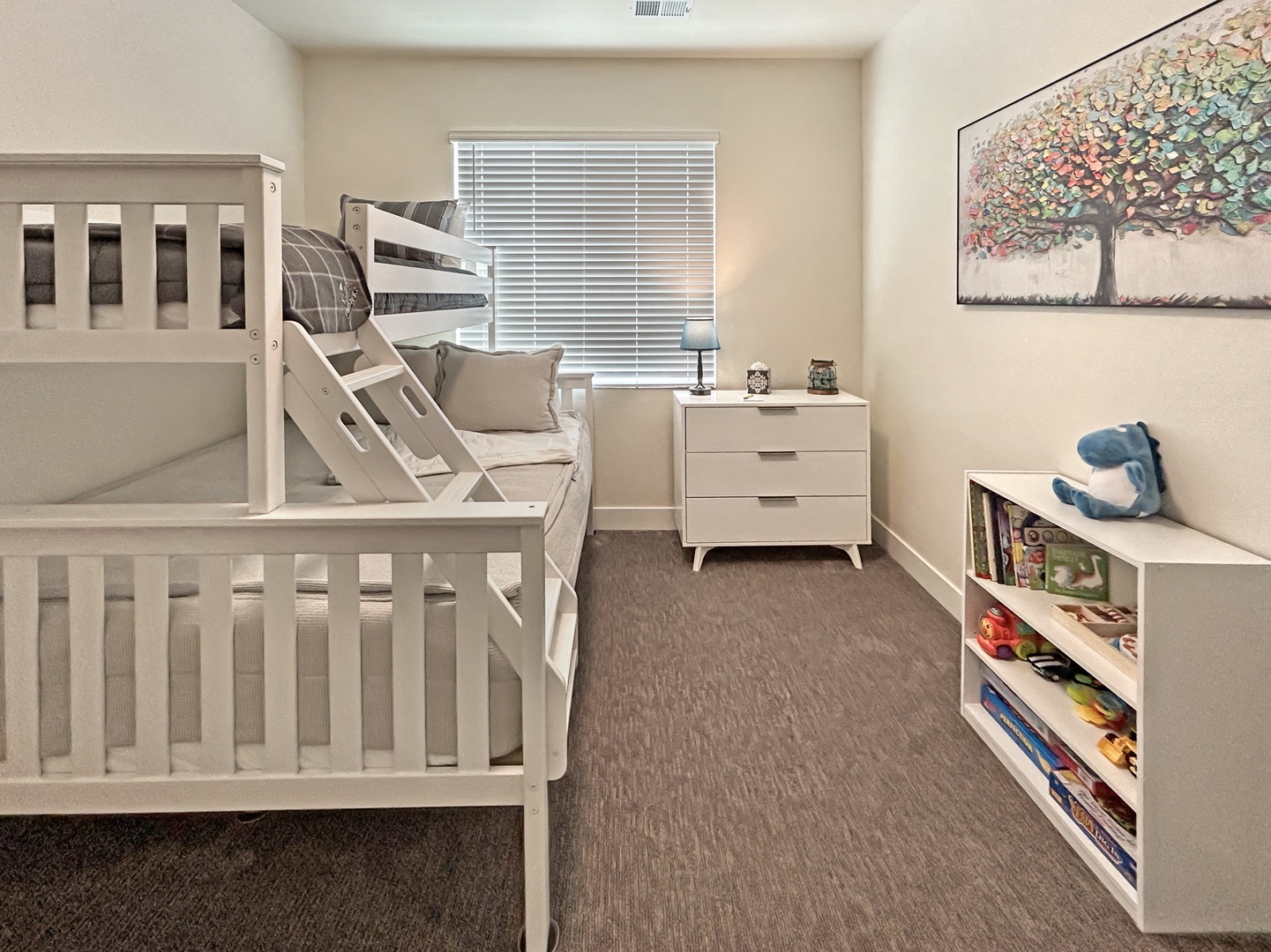 Two additional guest rooms are stationed at the front of the home: one with a plush queen bed, the other with a queen-over-twin bunk, ideal for additional guests or families with young revolutionaries in tow. A second full bath ensures comfort and privacy for all.