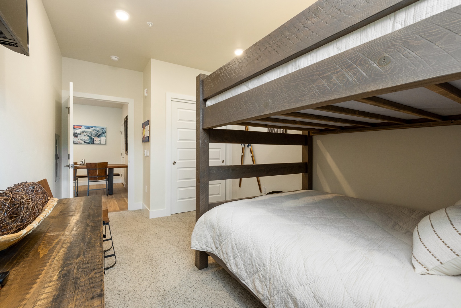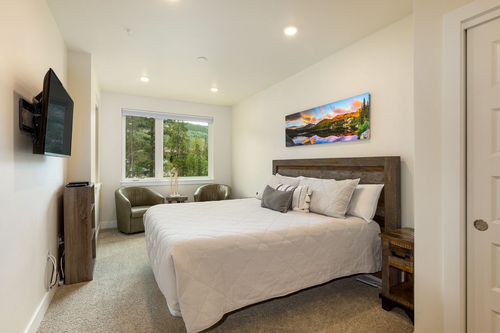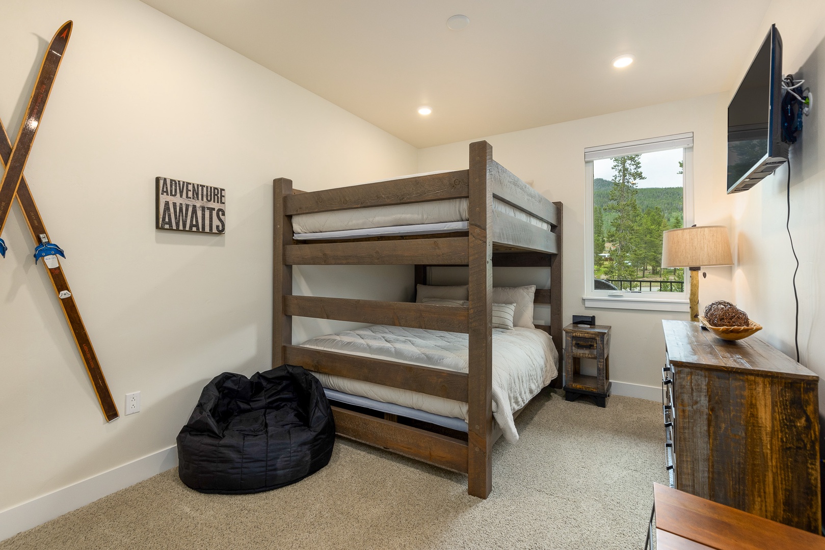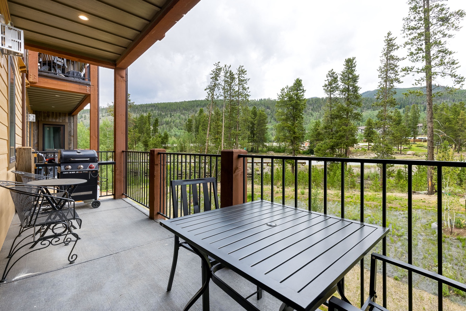 202 Clearwater Lofts 202 Clearwater Lofts A cozy living room with a sectional leather sofa, a round coffee table, a hanging chair, a fireplace with a TV above it, and a large sliding glass door leading to an outdoor patio with a forest view. A fenced outdoor hot tub on a wooden deck in front of multi-story residential buildings with mountains and trees in the background. A covered outdoor patio with a black table and chairs, a barbecue grill, and a scenic view of trees and hills in the background. A scenic landscape featuring a river winding through a lush, green valley with forested mountains in the background under a clear blue sky. A road runs along the valley floor. Open Gallery A cozy living room with a sectional leather sofa, a round coffee table, a hanging chair, a fireplace with a TV above it, and a large sliding glass door leading to an outdoor patio with a forest view. A fenced outdoor hot tub on a wooden deck in front of multi-story residential buildings with mountains and trees in the background. A covered outdoor patio with a black table and chairs, a barbecue grill, and a scenic view of trees and hills in the background. A scenic landscape featuring a river winding through a lush, green valley with forested mountains in the background under a clear blue sky. A road runs along the valley floor. A modern living room with a hanging chair, black leather couches, a coffee table, a fireplace, wall art, and a TV. A sliding glass door leads to a balcony with a scenic view outside. A modern living room with wooden flooring, leather sofas, a hanging chair, a coffee table, a fireplace, and a view into an open kitchen in the background. Modern open-concept kitchen with granite countertops, stainless steel appliances, and wood cabinets, leading into a living area with a fireplace and a view of an outdoor patio. Open-concept living area featuring a kitchen with a large island, bar stools, dining table, and a living room with a hanging chair, couch, and wall-mounted TV. Sliding doors lead to an outdoor space. Modern kitchen with granite countertops, dark wood cabinets, stainless steel appliances, and a central island with four barstools. Adjacent are a dining area and entryway with a white front door. A modern kitchen and dining room with wooden furniture, stainless steel appliances, dark cabinets, and a window view of a green outdoors. A balcony with a table and chairs overlooks a scenic view of buildings and pine trees with mountains in the background. Indoors, a couch and framed picture are visible through a sliding glass door. A bedroom with a large bed, two cushioned chairs near a window, a wall-mounted TV, and a nature-themed painting above the bed. A bedroom with a neatly made bed, a wall-mounted TV, an open door, a window, and a small shelving unit with storage baskets. The room is well-lit with recessed lighting and has a beige color scheme. Two green armchairs with a small wooden table in between are positioned by large windows overlooking a forested landscape. A modern bathroom featuring a double-sink vanity with granite countertop, a large mirror, a glass-enclosed shower with tile walls, and overhead lighting. A bedroom with wooden bunk beds, a black bean bag, a wall-mounted TV, a window with a forest view, a nightstand with a lamp, skis on the wall, and a sign that reads "Adventure Awaits. A bedroom with a bunk bed featuring a double bed on the bottom and a single bed on top. The room has light-colored walls and a door leading to an adjacent room with a wooden table and chairs. A modern bathroom with a bathtub, toilet, dark wood vanity with granite countertop, and a wall mirror. Towels, toiletries, and a wall decoration are visible. A compact laundry area with a stacked washer and dryer is located behind a partially open door. Two framed pictures of trees and a wooden dining table can be seen in the adjacent room. A modern multi-story apartment building with balconies, situated in a mountainous area, with a garage in front and several parked cars nearby. Aerial view of a landscape featuring a mix of dense trees, a winding river through wetland-like vegetation, a few paths, and buildings in the background near a lake. Gallery View Keystone, CO 2 Bedrooms 2 full Baths 8 Guests 1110 sq. ft. Description Rooms Amenities Reviews Calendar Location Welcome to 202 Clearwater lofts! This property is brand new with high-end luxury finishes, mountain views, and quick access to the slopes via shuttle or a short drive. The entryway features a bench and built in hooks to make storing gear a breeze. Just past the entryway is a laundry closet with a full size washer and dryer. The living room has a large flat screen TV, queen sleeper sofa couch and a gas fireplace. Just off the living room is a large balcony with amazing mountain views. The gourmet kitchen has all essentials stocked and features brand new high-end appliances. There is seating for 3 at the kitchen bar and 6 at the dining room table. The primary bedroom features a king sized bed and full en suite bathroom. The guest bedroom features a queen over queen bunk bed. Clearwater Lofts at Keystone are luxury condominiums that offer outdoor recreation all year long – minutes to the Keystone Lake, a short shuttle to the slopes, the Summit County Recreation Path with miles of riding and walking and the Snake River Wetlands right out your door. Building amenities include: hot tub area, ski locker room, underground heated parking garage. PROPERTY FEATURES: -- 2 bedroom/2 bath -- Sleeps: 8 -- Lifts: 5 minute shuttle ride -- Views: Mountain, forest -- Hot Tub: Outdoor shared hot tub -- Outdoor Space: Private deck -- Living Room: Fireplace, large flat screen TV, sleeper sofa -- Dining: Seating for 6 at table and 3 at kitchen bar -- Laundry: Private in-home washer/dryer -- Parking: 1 car allowed in underground garage; unassigned first come first serve parking in front of building (not guaranteed) -- Standard Amenities: High speed Internet, li