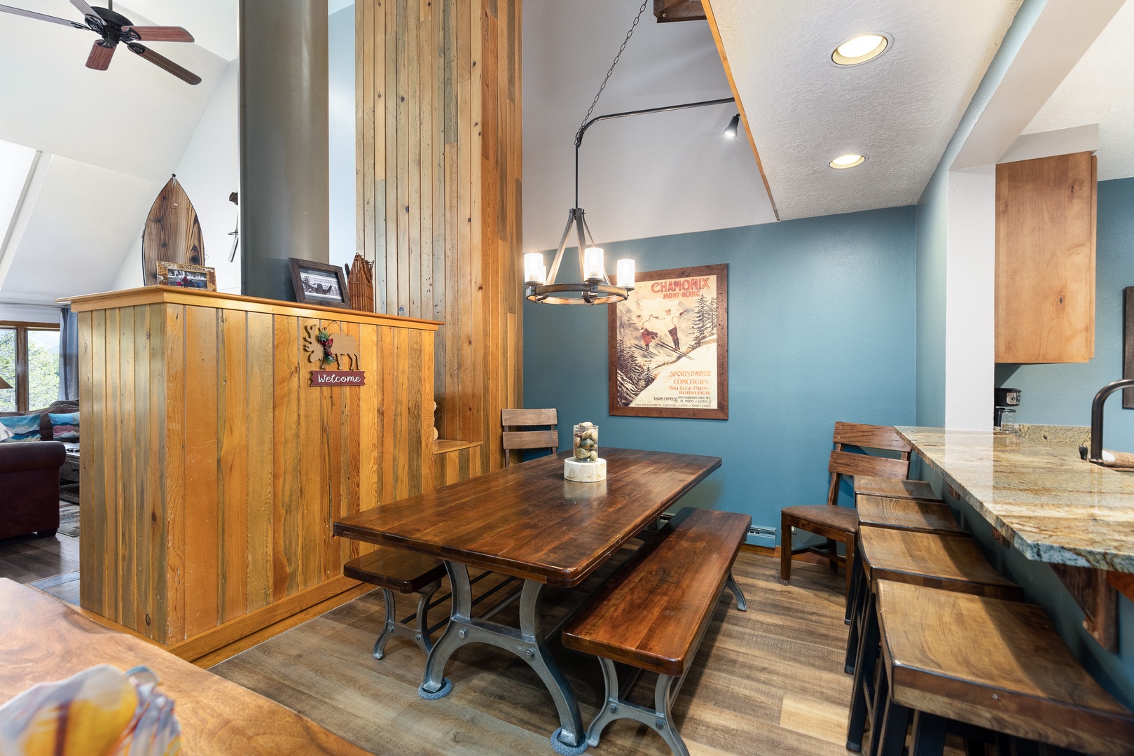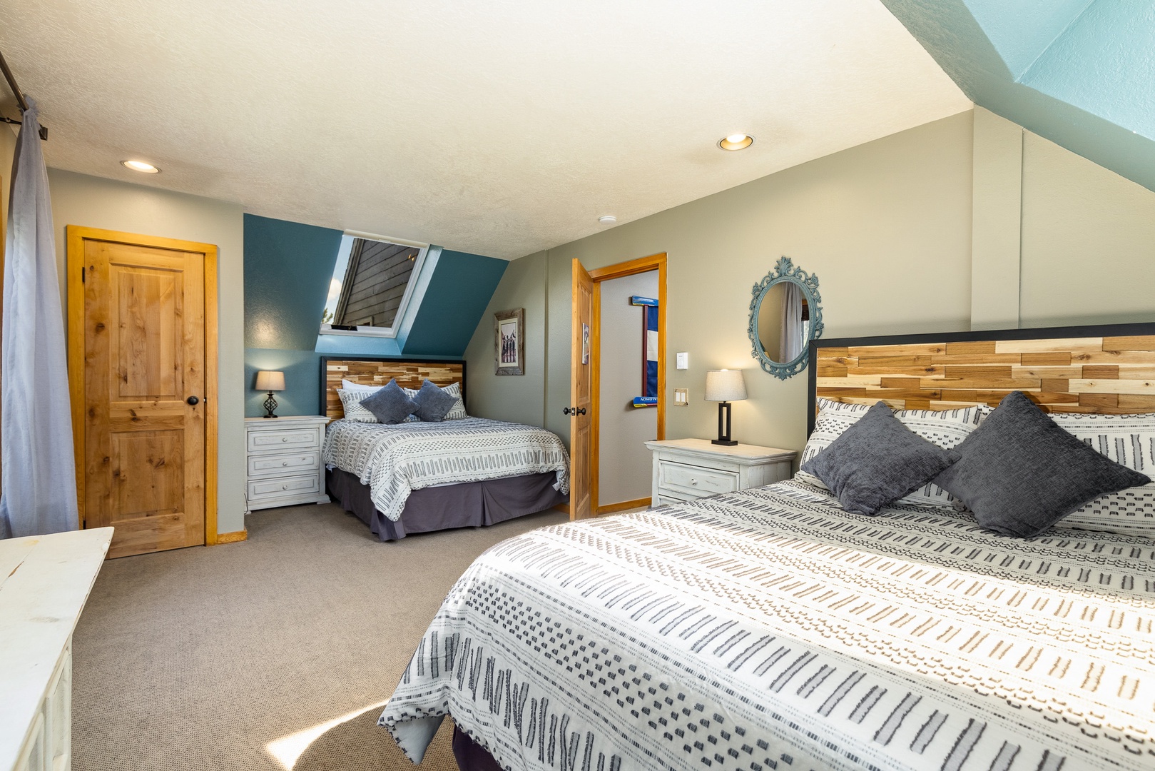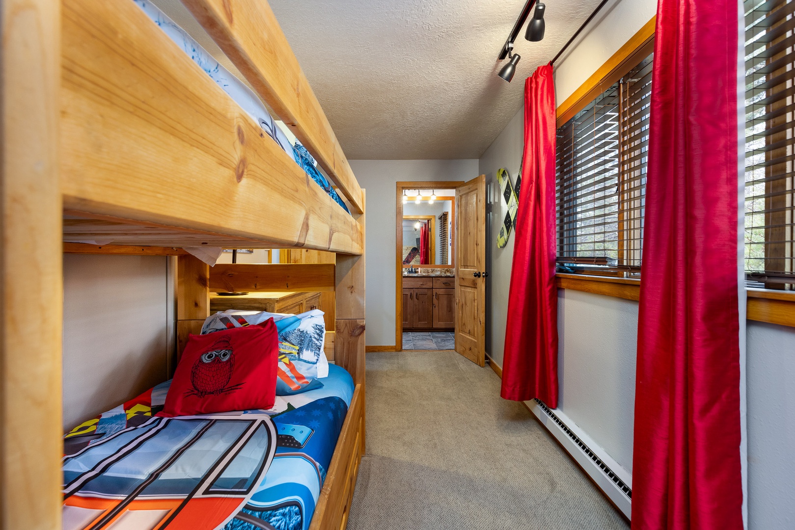 2054 The Pines 2054 The Pines A cozy living and dining area featuring a round table with four chairs, two brown sofas, a wall-mounted snowboard, and various rustic decor and signs. A staircase leads to an upper loft. Indoor swimming pool with chairs lined on the deck, large windows allowing natural light, wooden ceiling with beams, spiral slide, and stairs leading to an upper level. Indoor swimming pool with lounge chairs and large windows offering a view of a snowy mountain landscape. The ceiling features wooden beams. Outdoor patio with metal tables and chairs, barbecue grills, and snow-covered ground, set against a backdrop of snow-topped buildings, trees, and a mountain. Open Gallery A cozy living and dining area featuring a round table with four chairs, two brown sofas, a wall-mounted snowboard, and various rustic decor and signs. A staircase leads to an upper loft. Indoor swimming pool with chairs lined on the deck, large windows allowing natural light, wooden ceiling with beams, spiral slide, and stairs leading to an upper level. Indoor swimming pool with lounge chairs and large windows offering a view of a snowy mountain landscape. The ceiling features wooden beams. Outdoor patio with metal tables and chairs, barbecue grills, and snow-covered ground, set against a backdrop of snow-topped buildings, trees, and a mountain. A cozy living room with large windows offering a scenic view of a lush, forested mountain landscape. The room features a comfortable sofa, a wooden table, and a lamp. A living room with a brown sectional sofa, a wooden coffee table, a flat-screen TV on a wooden stand, and a fireplace. Wall decor includes crisscrossed skis and three landscape pictures. A cozy living room with two brown sofas, a wooden coffee table, and decorative pillows. Skylights and large windows brighten the space. A snowboard is displayed on the wall, and a dining area is visible in the background. A cozy living and dining area with high ceilings, skylights, and large windows. It features cushioned seating, a wooden table with chairs, and scenic outdoor views. Modern living room with vaulted ceilings, wooden flooring, and leather seating. Decor includes mountain and deer artwork, mounted skis, and a stone fireplace. Wooden staircase leads to upper level. A modern kitchen with wood cabinets, granite countertops, a double sink, stainless steel appliances, and a tile floor. Track lighting is installed on the ceiling, and a framed picture hangs on the wall. Interior view of a house featuring a small tiled mudroom on the left, leading to a hallway and a living area. To the right, there is a kitchen countertop with a sink and overhead cabinets. A cozy, rustic dining area with a wooden table and benches, a chandelier, a kitchen with a bar and stools, and light brown walls adorned with decor accents. A cozy dining area with a wooden table, benches, and high chairs beside a kitchen counter. The space features wooden paneling, teal walls, a ceiling light fixture, and a poster on the wall. A cozy living room with a wall-mounted TV, wooden coffee table, brown couch, and "SKI" wall decor. A door leads to another room, and there are framed pictures and a floor lamp on the walls. A cozy living room with a brown sofa, patterned pillows, a wooden coffee table, and a wall-mounted TV. Ski-themed decor and artwork. An open doorway reveals a dining area in the background. A hallway with wooden cubbies, some holding towels, hooks, and brown seat cushions; the sign overhead reads, "Please remove your shoes." A wooden door is visible at the end of the hallway. Bedroom with a large window and nature view, patterned bedspread, dresser with mirror, chairs, and a wall-mounted TV. A cozy bedroom with a single bed covered by a colorful quilt, an armchair, wall art, large windows, and an en-suite bathroom. The room is well-lit with natural light from the windows. Bathroom with a double sink vanity, granite countertop, wooden cabinets, glass-enclosed shower, and tiled walls and floor. Mirrors with light fixtures are above the sinks. Toilet and decor on the wall. A room with bunk beds, a wooden dresser, and winter sports decor. A red curtain is on the left, and there is a doorway leading to another room on the right. A room with two wooden bunk beds, each with colorful bedding and pillows. A surfboard is mounted on the wall above one of the beds. A small window is on the left wall. A small bedroom with wooden bunk beds, colorful bedding, and a red curtain by the window. The room leads to a bathroom with a wooden door and a large mirror above the sink. A bathroom with a granite countertop, wooden cabinets, bathtub with shower curtain, towels on a rack, a toilet, and a sign on the wall that reads "SKI PATROL" with a mirror and light above the sink. A hallway with a tapestry of a skier, a flag on the wall, wooden doors, and a handrail leading downstairs. One door is open, revealing part of a bedroom. A bedroom with two double beds, each with patterned bedding and multiple pillows. The room has grey walls, a skylight, a wooden door, and a bedside table with a lamp. A bedroom with two beds, a wooden door, a large window with curtains, a dresser with a lamp, and a round mirror on the wall. The walls are painted in blue and beige tones. A brightly decorated bedroom with a colorful quilt, a wooden dresser, a snowboard mounted on the wall, framed art pieces, and a stained glass window. A bedroom with a large bed featuring plaid bedding, flanked by two bedside tables and lamps. A snowboard and "SKI" artwork hang on the wall above the headboard. A skylight provides natural light. Bathroom with a double vanity, granite countertop, wooden cabinets, towel racks with white towels, toilet, and a bathtub. Wall has a vintage ski poster. A bedroom with a checkered bedspread, wooden furniture, a large mirror, and an adjoining hallway with additional rooms visible through open doors. Warm lighting and decorative art enhance the space. A bathroom