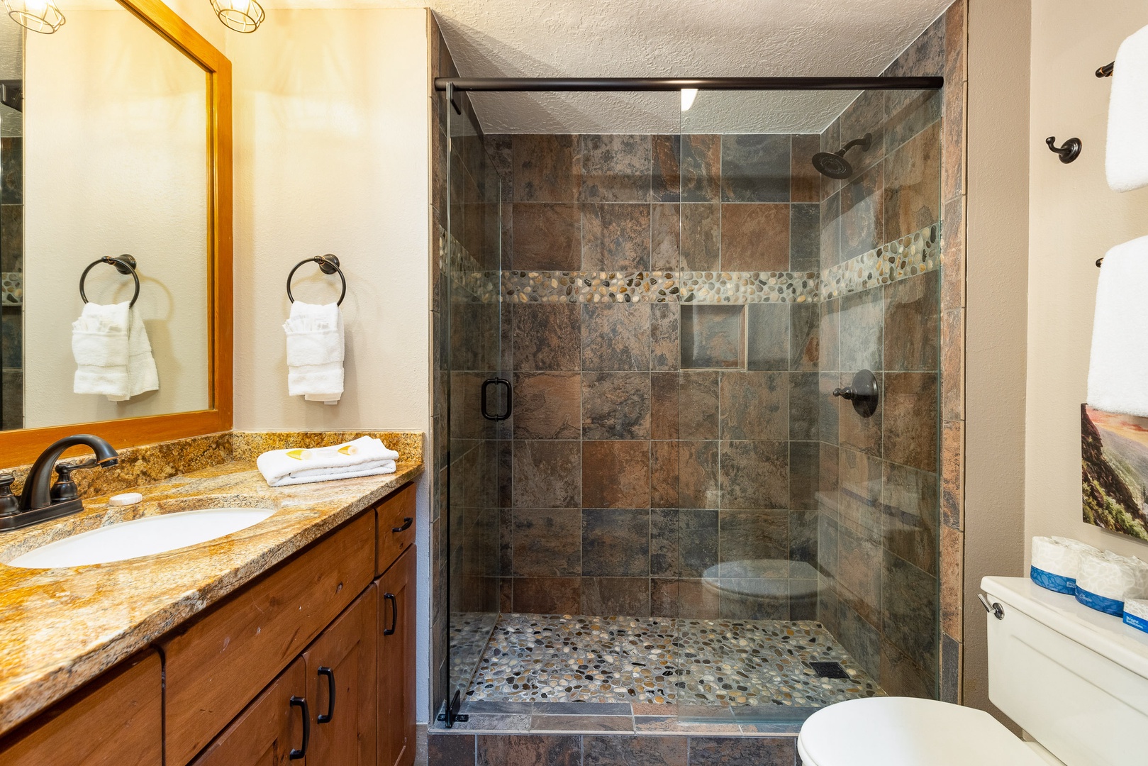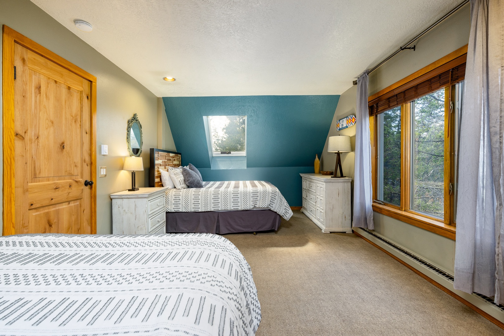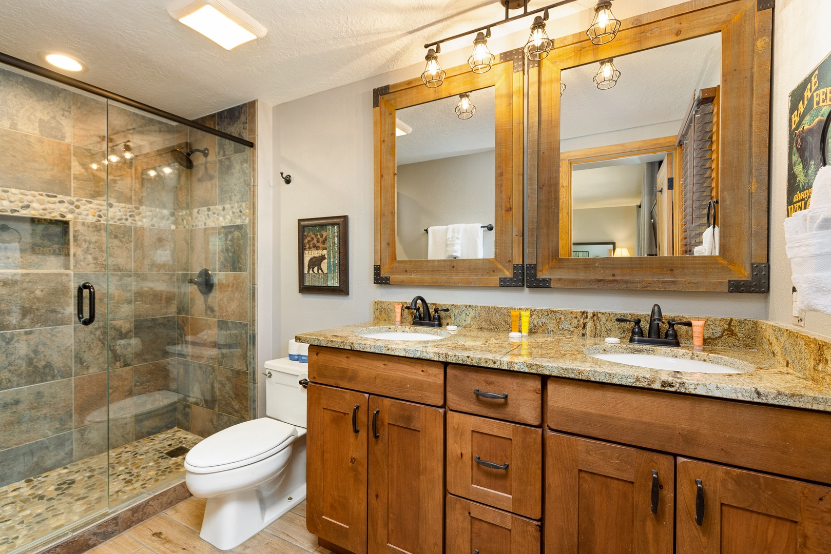 2054 The Pines 2054 The Pines A cozy living and dining area featuring a round table with four chairs, two brown sofas, a wall-mounted snowboard, and various rustic decor and signs. A staircase leads to an upper loft. Indoor swimming pool with chairs lined on the deck, large windows allowing natural light, wooden ceiling with beams, spiral slide, and stairs leading to an upper level. Indoor swimming pool with lounge chairs and large windows offering a view of a snowy mountain landscape. The ceiling features wooden beams. Outdoor patio with metal tables and chairs, barbecue grills, and snow-covered ground, set against a backdrop of snow-topped buildings, trees, and a mountain. Open Gallery A cozy living and dining area featuring a round table with four chairs, two brown sofas, a wall-mounted snowboard, and various rustic decor and signs. A staircase leads to an upper loft. Indoor swimming pool with chairs lined on the deck, large windows allowing natural light, wooden ceiling with beams, spiral slide, and stairs leading to an upper level. Indoor swimming pool with lounge chairs and large windows offering a view of a snowy mountain landscape. The ceiling features wooden beams. Outdoor patio with metal tables and chairs, barbecue grills, and snow-covered ground, set against a backdrop of snow-topped buildings, trees, and a mountain. A cozy living room with large windows offering a scenic view of a lush, forested mountain landscape. The room features a comfortable sofa, a wooden table, and a lamp. A living room with a brown sectional sofa, a wooden coffee table, a flat-screen TV on a wooden stand, and a fireplace. Wall decor includes crisscrossed skis and three landscape pictures. A cozy living room with two brown sofas, a wooden coffee table, and decorative pillows. Skylights and large windows brighten the space. A snowboard is displayed on the wall, and a dining area is visible in the background. A cozy living and dining area with high ceilings, skylights, and large windows. It features cushioned seating, a wooden table with chairs, and scenic outdoor views. Modern living room with vaulted ceilings, wooden flooring, and leather seating. Decor includes mountain and deer artwork, mounted skis, and a stone fireplace. Wooden staircase leads to upper level. A modern kitchen with wood cabinets, granite countertops, a double sink, stainless steel appliances, and a tile floor. Track lighting is installed on the ceiling, and a framed picture hangs on the wall. Interior view of a house featuring a small tiled mudroom on the left, leading to a hallway and a living area. To the right, there is a kitchen countertop with a sink and overhead cabinets. A cozy, rustic dining area with a wooden table and benches, a chandelier, a kitchen with a bar and stools, and light brown walls adorned with decor accents. A cozy dining area with a wooden table, benches, and high chairs beside a kitchen counter. The space features wooden paneling, teal walls, a ceiling light fixture, and a poster on the wall. A cozy living room with a wall-mounted TV, wooden coffee table, brown couch, and "SKI" wall decor. A door leads to another room, and there are framed pictures and a floor lamp on the walls. A cozy living room with a brown sofa, patterned pillows, a wooden coffee table, and a wall-mounted TV. Ski-themed decor and artwork. An open doorway reveals a dining area in the background. A hallway with wooden cubbies, some holding towels, hooks, and brown seat cushions; the sign overhead reads, "Please remove your shoes." A wooden door is visible at the end of the hallway. Bedroom with a large window and nature view, patterned bedspread, dresser with mirror, chairs, and a wall-mounted TV. A cozy bedroom with a single bed covered by a colorful quilt, an armchair, wall art, large windows, and an en-suite bathroom. The room is well-lit with natural light from the windows. Bathroom with a double sink vanity, granite countertop, wooden cabinets, glass-enclosed shower, and tiled walls and floor. Mirrors with light fixtures are above the sinks. Toilet and decor on the wall. A room with bunk beds, a wooden dresser, and winter sports decor. A red curtain is on the left, and there is a doorway leading to another room on the right. A room with two wooden bunk beds, each with colorful bedding and pillows. A surfboard is mounted on the wall above one of the beds. A small window is on the left wall. A small bedroom with wooden bunk beds, colorful bedding, and a red curtain by the window. The room leads to a bathroom with a wooden door and a large mirror above the sink. A bathroom with a granite countertop, wooden cabinets, bathtub with shower curtain, towels on a rack, a toilet, and a sign on the wall that reads "SKI PATROL" with a mirror and light above the sink. A hallway with a tapestry of a skier, a flag on the wall, wooden doors, and a handrail leading downstairs. One door is open, revealing part of a bedroom. A bedroom with two double beds, each with patterned bedding and multiple pillows. The room has grey walls, a skylight, a wooden door, and a bedside table with a lamp. A bedroom with two beds, a wooden door, a large window with curtains, a dresser with a lamp, and a round mirror on the wall. The walls are painted in blue and beige tones. A brightly decorated bedroom with a colorful quilt, a wooden dresser, a snowboard mounted on the wall, framed art pieces, and a stained glass window. A bedroom with a large bed featuring plaid bedding, flanked by two bedside tables and lamps. A snowboard and "SKI" artwork hang on the wall above the headboard. A skylight provides natural light. Bathroom with a double vanity, granite countertop, wooden cabinets, towel racks with white towels, toilet, and a bathtub. Wall has a vintage ski poster. A bedroom with a checkered bedspread, wooden furniture, a large mirror, and an adjoining hallway with additional rooms visible through open doors. Warm lighting and decorative art enhance the space. A bathroom