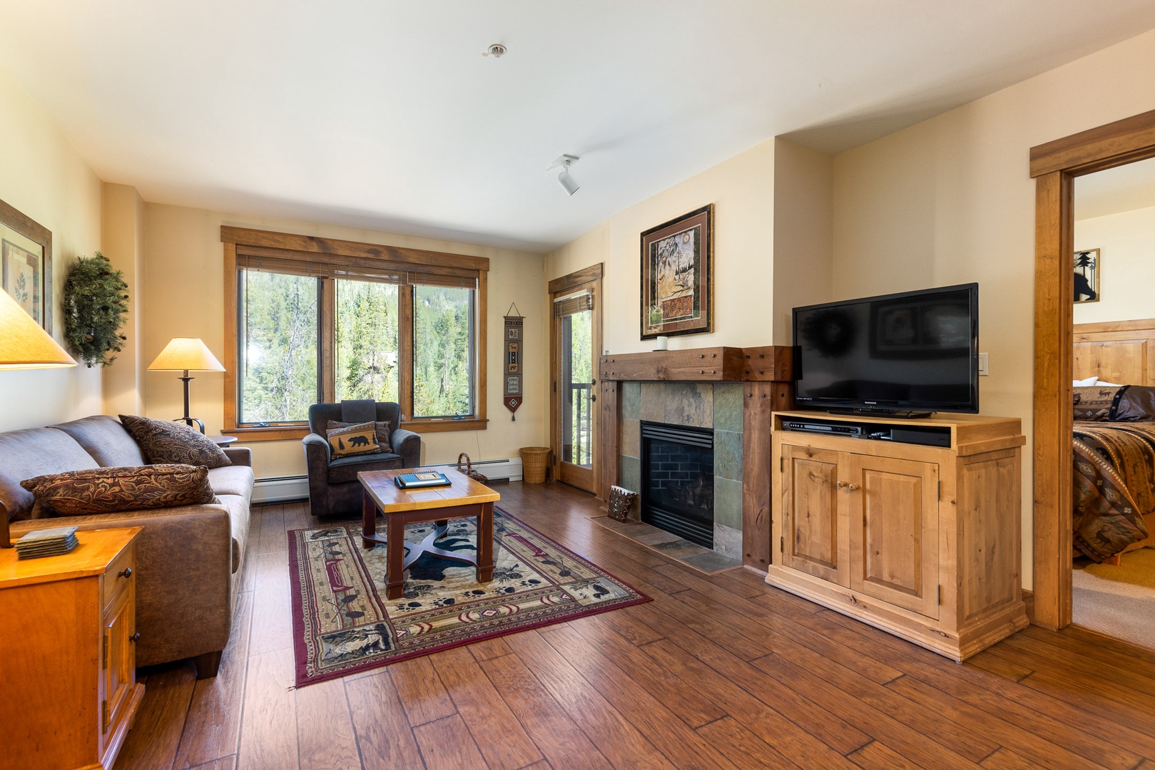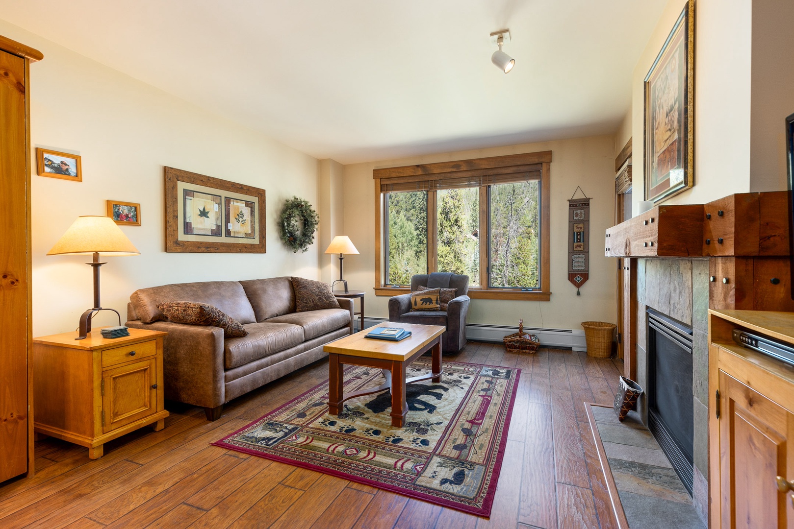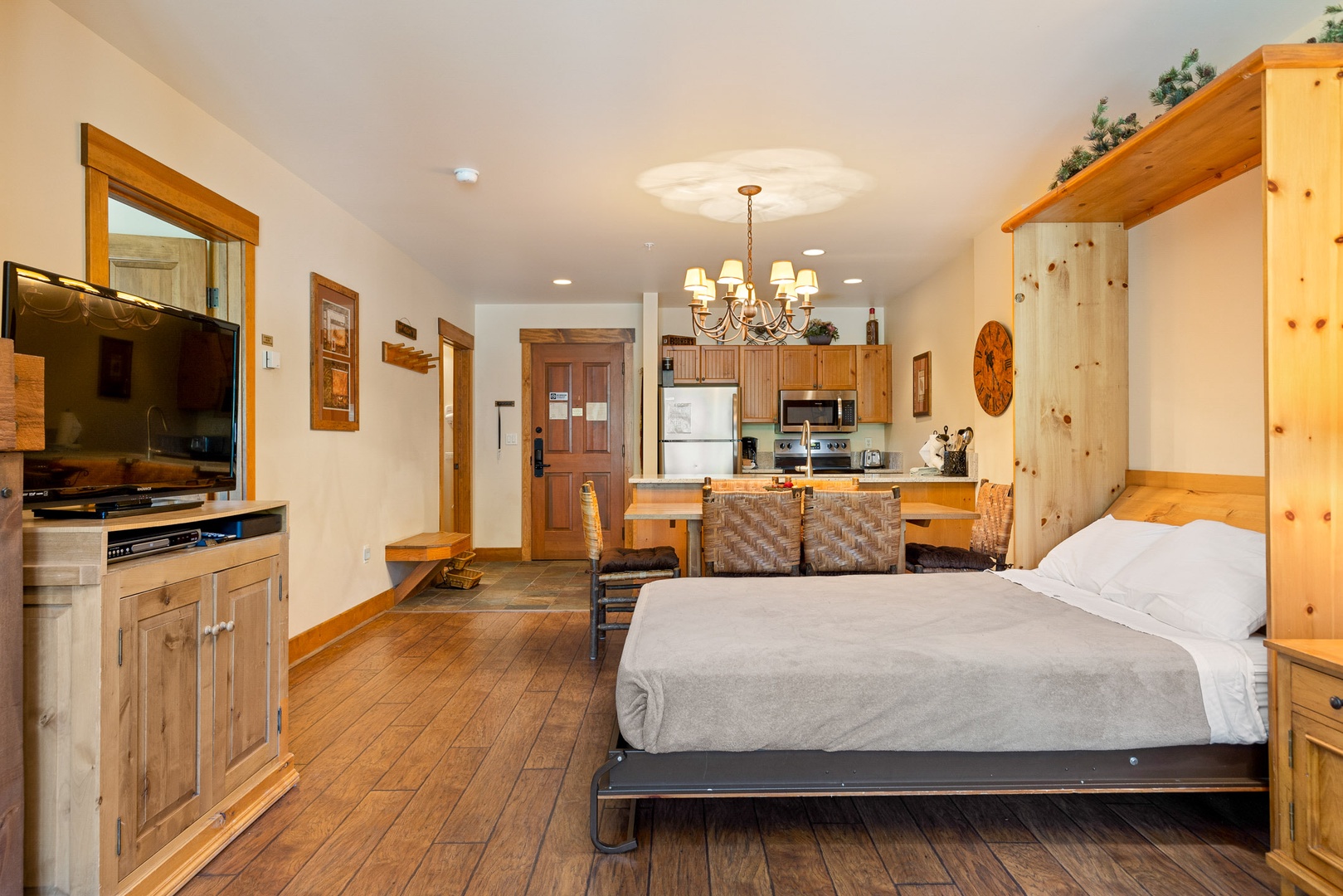 This one bedroom unit in The Springs is a great contender for a family on a budget. Containing one bedroom, two bathrooms, a queen Murphy bed, and a queen sleeper sofa, it easily sleeps six and still has ample room for every guest. The living room features a gas fireplace, flat screen TV and comfortable furniture. Step out onto the patio and enjoy the beautiful aspens and fresh mountain air. The fully equipped kitchen features stainless steel appliances and the dining table seats six comfortably. The primary bedroom features a king sized bed and an en suite bathroom.