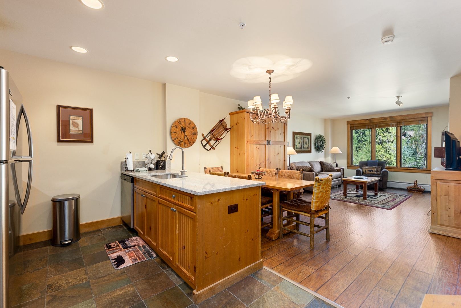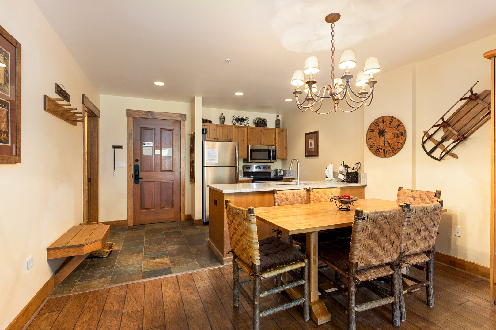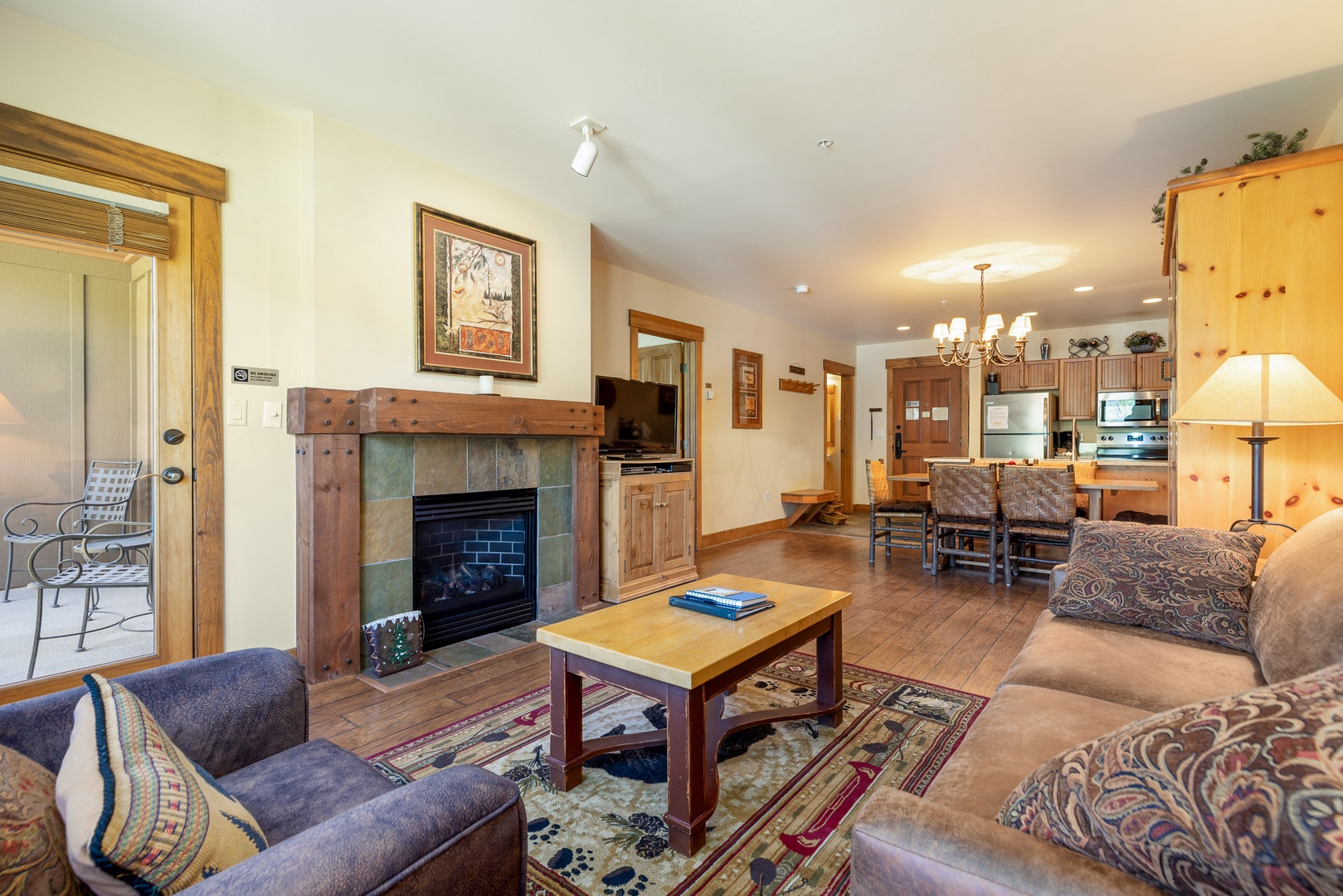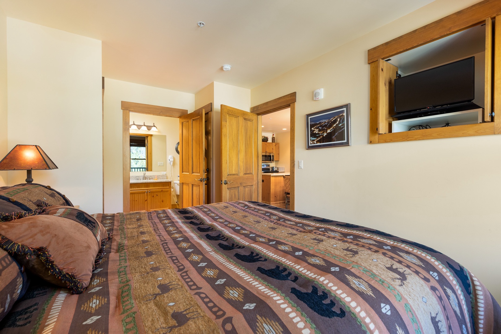 This one bedroom unit in The Springs is a great contender for a family on a budget. Containing one bedroom, two bathrooms, a queen Murphy bed, and a queen sleeper sofa, it easily sleeps six and still has ample room for every guest. The living room features a gas fireplace, flat screen TV and comfortable furniture. Step out onto the patio and enjoy the beautiful aspens and fresh mountain air. The fully equipped kitchen features stainless steel appliances and the dining table seats six comfortably. The primary bedroom features a king sized bed and an en suite bathroom.