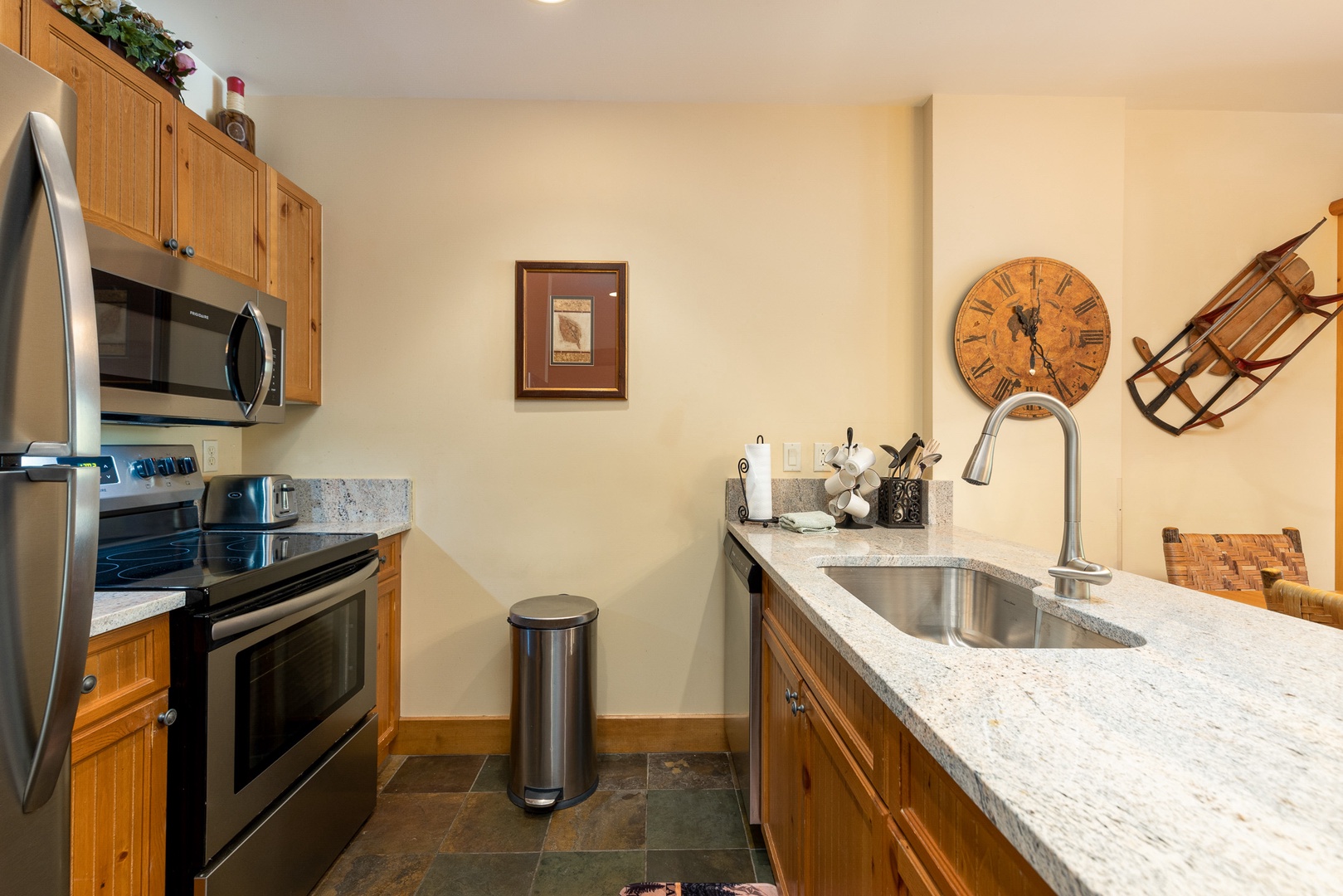 The unit overlooks mountains,it has large windows that let in lots of light,very pretty when it snows. Unit was well stocked, 2nd bathroom very helpful, beds comfy and we loved being steps from Gondola! Sky Run was great, we will return!