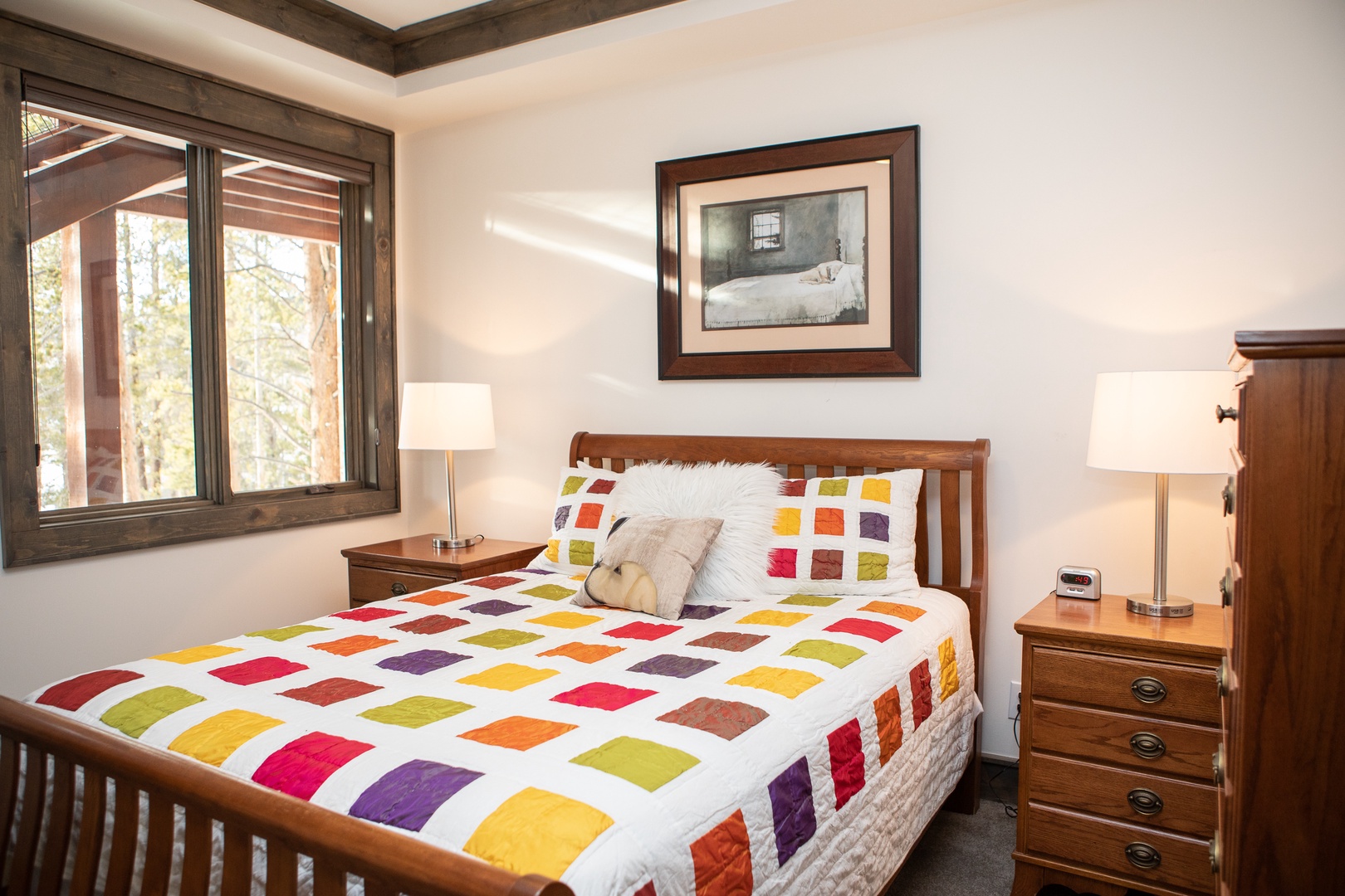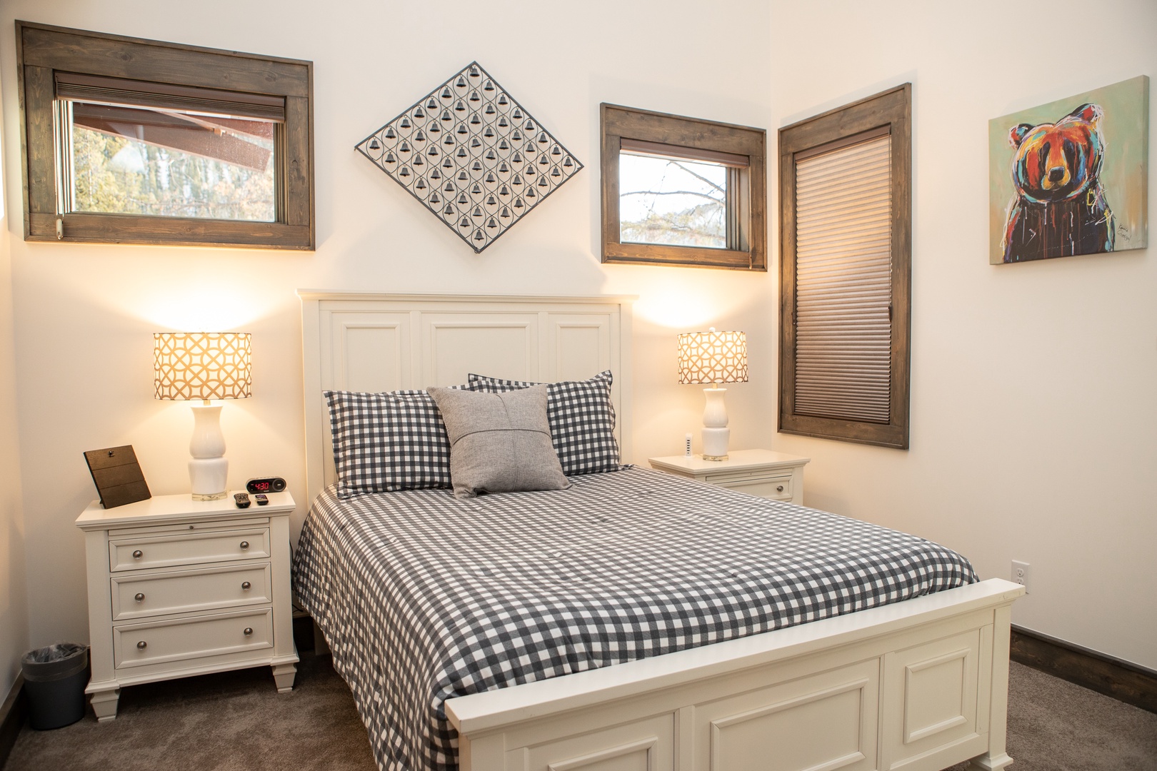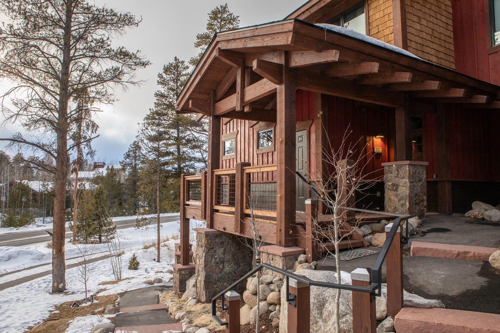 The Seasons 1818 – PRIVATE HOT TUB The Seasons 1818 - PRIVATE HOT TUB A red and yellow wooden house with steep roofs, covered in snow and icicles, set against a clear blue sky. A wooden cabin entrance features a stone foundation and steps, set amidst a snowy landscape with pine trees and a nearby road. A cozy living room featuring a sectional sofa, an armchair, a coffee table, a wall-mounted TV, and large windows with views of trees. A modern kitchen and dining area with white cabinets, marble backsplash, dining table with four upholstered chairs, black stove hood, island with stools, and a stone fireplace with a candle holder. Open Gallery A red and yellow wooden house with steep roofs, covered in snow and icicles, set against a clear blue sky. A wooden cabin entrance features a stone foundation and steps, set amidst a snowy landscape with pine trees and a nearby road. A cozy living room featuring a sectional sofa, an armchair, a coffee table, a wall-mounted TV, and large windows with views of trees. A modern kitchen and dining area with white cabinets, marble backsplash, dining table with four upholstered chairs, black stove hood, island with stools, and a stone fireplace with a candle holder. A modern kitchen with white cabinets, stainless steel appliances, a marble backsplash, and a white island countertop with a vase of red flowers. Two pendant lights hang over the island. Modern kitchen with stainless steel gas stove, white cabinetry, marble backsplash, coffee maker, toaster oven, and sink beneath a large window overlooking a wooded area. A modern kitchen with white cabinets, stainless steel appliances, a marble backsplash, and a vase of red flowers on the island countertop. Modern kitchen with a stainless steel stovetop and range hood, white marble backsplash, and black countertop. Coffee maker, knife set, and small kitchen items are placed on the counter. Modern kitchen with stainless steel sink, black countertop, white cabinets, paper towel roll on the counter, and a window above the sink showcasing an outdoor staircase. Modern kitchen and dining area with a central island, pendant lights, white cabinets, a fireplace, large windows offering outdoor views, and a vase of tulips on the island. Dining area with a wooden table, upholstered chairs, a fireplace, a window with a view of trees outside, and a modern light fixture above the table. A modern living room with a beige sofa, wooden coffee table, and brown armchair. The open kitchen area has white cabinets, stainless steel appliances, and an island with bar stools. A living room featuring a sectional sofa, a patterned armchair, a coffee table, a TV mounted on the wall, and a floor lamp next to a window. The decor is modern with wooden accents. A cozy living room with a wall-mounted TV, a wooden coffee table, a couch, and an armchair. There is a console below the TV and tree wall decals are visible in the hallway. A modern open-concept living room and kitchen with dark wood accents, a gray sofa, patterned armchair, stainless steel appliances, dark double doors, and a small entryway visible in the background. A hallway with wooden flooring and tree silhouette decals on the wall. A window with a view of trees is at the end of the hall, next to a brown chair and a drawer. Two birds are in flight in the decal. A bedroom with a checkered bedspread, two lamps on nightstands, and framed artworks on the walls. Two windows allow natural light into the room. A bedroom with a white bed, plaid bedding, two nightstands with lamps, framed artwork on the walls, and two windows with wooden frames. A small black device and an alarm clock are on the left nightstand. Bedroom with a checkered bedspread, wall-mounted TV, white dresser, and an open door leading to a bathroom. Another door, partially visible, leads to the hallway. A bathroom with a sink, mirror, light fixture, and shelves holding towels. The countertop has a soap dispenser and toiletries. Modern bathroom with a large mirror, sink, and storage cabinet below. Towels are neatly stacked on floating shelves, and toiletries are placed near the sink. The space is well-lit with contemporary fixtures. A tiled shower with a geometric pattern on the walls, featuring a small corner shelf and a square showerhead mounted on the upper corner. A neatly made bed with a colorful patchwork quilt is flanked by two wooden nightstands, each with a lamp. A framed picture hangs above the bed, and a window on the left allows natural light to enter. A neatly made wooden bed with a patchwork quilt, fluffy pillows, a nightstand with a lamp, a dresser with decor, and framed wall art in a bright bedroom. A bedroom with a wooden bed frame featuring a colorful patchwork quilt, two side tables with lamps, a window with a tree view, and wall art above the bed. A shower corner with gray subway tile walls, a showerhead, and a small corner shelf. Modern bathroom with gray tiled bathtub and shower, white toilet and vanity, metal shelves with folded towels, soap dispenser, mirror, and wall-mounted decor. A laundry closet with a stacked washer and dryer, cleaning supplies on the door rack, and a glimpse of a bedroom on the left. Outdoor hot tub on a wooden deck in a snowy setting surrounded by trees, with yellow caution signs on the supporting wooden posts. Outdoor patio featuring a hot tub, wooden dining table with chairs, and a ladder leading to an upper deck. The patio is adjacent to a red-paneled house with sliding glass doors. Outdoor patio with a wooden table and black chairs, overlooking a snowy landscape with pine trees and mountains in the background. A wooden deck overlooks a snowy landscape with tall trees and a mountain in the background. The road is visible just beyond the trees. A wooden door with a keypad lock is set into a red wall. Above the door light, there is a sign displaying the number "1818. A small entryway with a wooden bench, cubby storage with baskets above, a wooden door with windows, a colorful