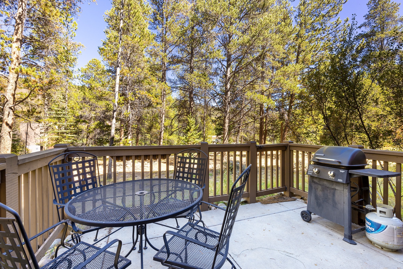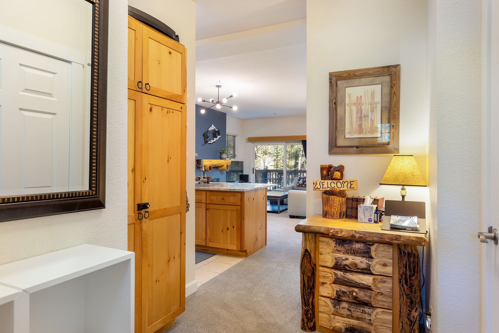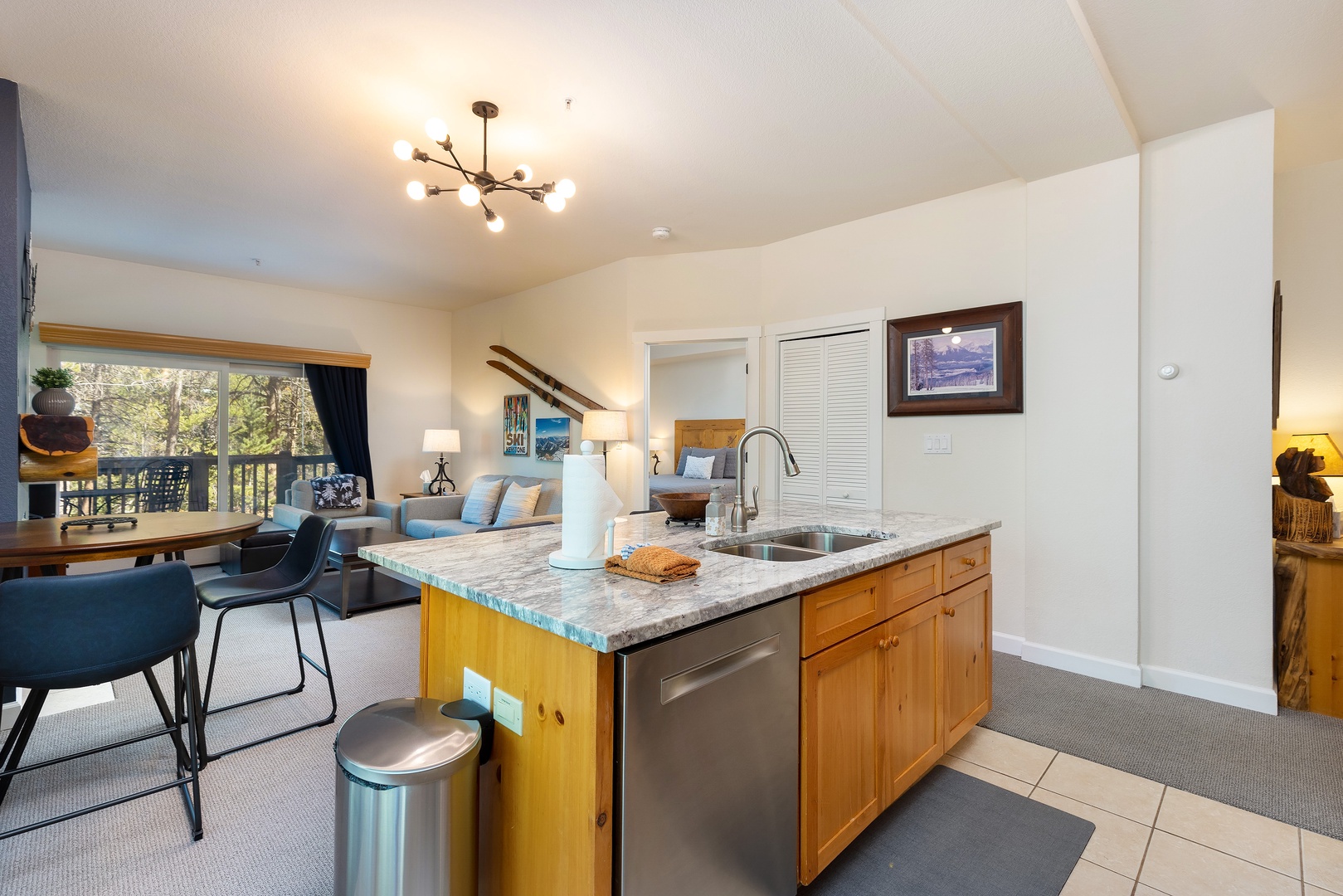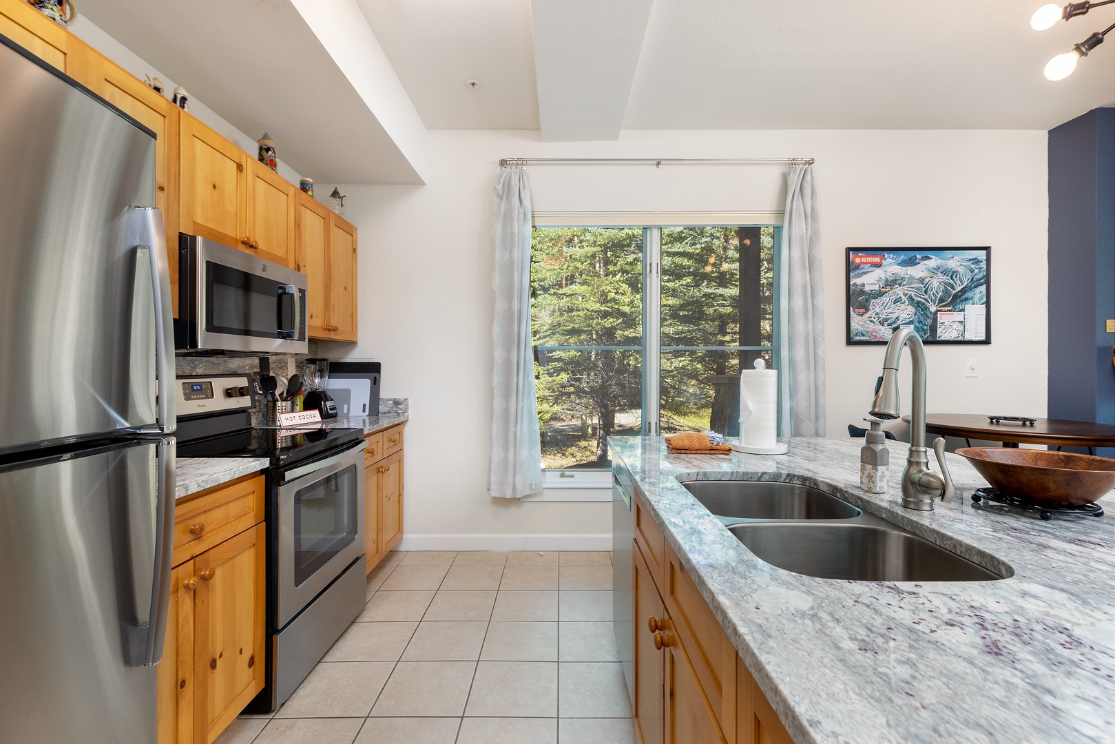 This spacious 2-bedroom condo is newly updated and tastefully furnished featuring great amenities and location! New updated flooring throughout the property provides a modern wood feel to this townhome. The living room features a gas fireplace and flat screen TV to cozy up in front of. A private patio is situated off of the living room allowing for ample light and wooded views. The gourmet kitchen is fully equipped for dining in, and the table seats 4 people comfortably with an additional 2 seats at the breakfast bar. There is a private washer and dryer in the unit for your convenience and plenty of ski and snowboard storage in the entry.
