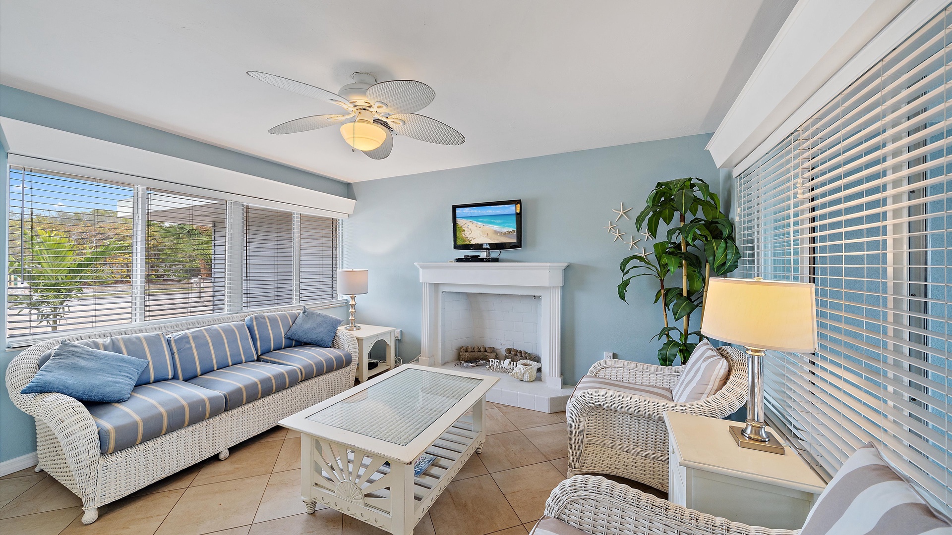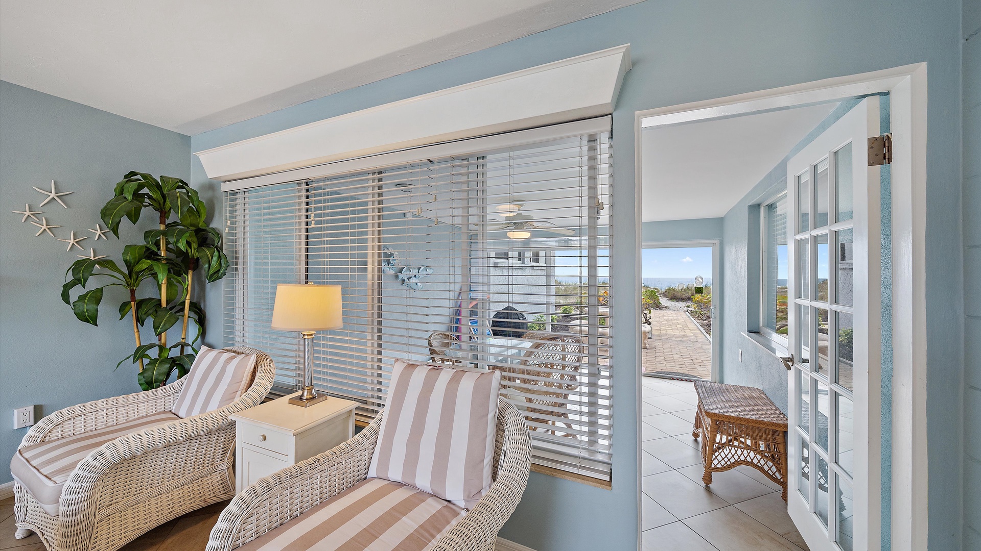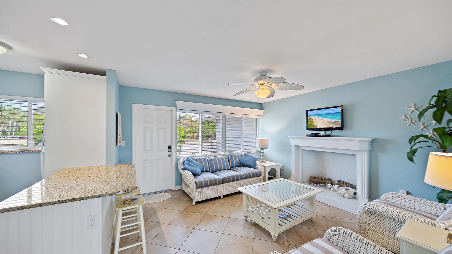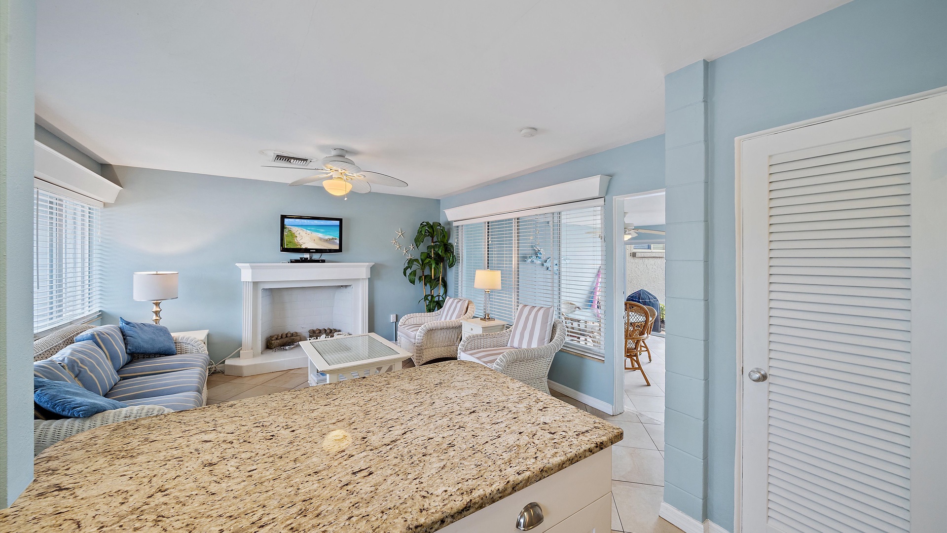 Las Hermanas 2 Home Florida Longboat Key Las Hermanas 2 Back to Search Results Las Hermanas 2 A cozy living room with light blue walls, white furniture, a ceiling fan, a TV above the fireplace, and large windows showcasing an outdoor view. A potted plant is beside the fireplace. A bedroom with a king-size bed featuring floral bedding, and flanked by two bedside tables with lamps. There is a ceiling fan, a chest of drawers on the left, and a window with outdoor views. A single-story beachfront house with a gray roof and a landscaped front yard, featuring a single SUV parked in the driveway. The ocean is visible in the background under a blue sky. A sunroom with light blue walls featuring a glass-top table with four wicker chairs, a wicker bench, a ceiling fan, and decorative fish on the wall. Windows and a door provide a view of another room. A compact kitchen with light blue walls, white cabinets, and granite countertops. There is a microwave, stove, and a small dining area with two stools. A cabinet with towels is visible in the background. Open Gallery A cozy living room with light blue walls, white furniture, a ceiling fan, a TV above the fireplace, and large windows showcasing an outdoor view. A potted plant is beside the fireplace. A bedroom with a king-size bed featuring floral bedding, and flanked by two bedside tables with lamps. There is a ceiling fan, a chest of drawers on the left, and a window with outdoor views. A single-story beachfront house with a gray roof and a landscaped front yard, featuring a single SUV parked in the driveway. The ocean is visible in the background under a blue sky. A sunroom with light blue walls featuring a glass-top table with four wicker chairs, a wicker bench, a ceiling fan, and decorative fish on the wall. Windows and a door provide a view of another room. A compact kitchen with light blue walls, white cabinets, and granite countertops. There is a microwave, stove, and a small dining area with two stools. A cabinet with towels is visible in the background. A clean bathroom features a granite countertop sink, a tiled bathtub with a curtain, a wall-mounted showerhead, a white towel on a rack, and a window with white shutters above the bathtub. White lounge chairs arranged on a sandy beach with grassy patches in the foreground and trees and buildings in the background under a blue sky. A light blue living room with a striped couch, wicker chairs, coffee table, plants, and a small TV above a white fireplace. Large windows with blinds let in natural light. A bright living room features wicker furniture, a glass coffee table, two lamps, a plant, and a small TV above a white fireplace. Large windows with blinds let in natural light. Cozy living room with blue walls, white furniture, a ceiling fan, and a wall-mounted TV above a fireplace. Large windows and a glass-top coffee table add a bright and airy feel. A brightly lit living room with blue walls, a white wicker couch with blue cushions, a glass coffee table, and large windows with blinds. The open kitchen features white cabinets and a small breakfast bar. A beach-themed living area with blue walls, striped armchairs, a ceiling fan, a small kitchen with white cabinets, and a breakfast bar with two stools. Blinds cover the window, showing an outdoor view. A small kitchen and living area with blue walls, white cabinets, a striped blue couch, a ceiling fan, a window, and a white door. Two stools are by the kitchen counter. The room is well-lit. A small living area with a fireplace, a TV mounted above it, and wicker furniture. The room has blue walls, a ceiling fan, and large windows with white blinds. A granite counter is at the foreground. A bright living room with blue walls, a ceiling fan, and a wall-mounted TV. The room has white furniture and leads into a bedroom with floral bedding. A granite kitchen island is also visible. A small, well-lit kitchen with white cabinets, granite countertops, a white electric stove, microwave, and a coffee maker. A window with blinds overlooks greenery outside. A small kitchen features white cabinets, a granite countertop, a microwave above an electric stove, a coffee maker, and a sink by a window with blinds. A modern kitchen features granite countertops, white cabinets, and stainless steel appliances including a stovetop and microwave. A door in the center leads to an adjacent room. A small kitchen with white cabinetry, granite countertops, a single-basin sink, a window with blinds, and a white refrigerator. A compact kitchen featuring a granite countertop with an electric stove, a built-in microwave, white cabinets, a coffee maker, a paper towel holder, and a sink with a gooseneck faucet. A room with two wicker chairs and a table, separated by blinds from a sunroom with a view of a patio and garden. A lamp and a potted plant are next to the chairs. A room with a glass dining table and chairs, a ceiling fan, and sliding doors opening to a patio with outdoor furniture. A window with blinds is on the right. Beach and ocean visible outside. A room with pale blue walls, a ceiling fan, a glass-top table with wicker chairs, a wicker bench, a window, and French doors leading to a patio. Decorative fish adorn the wall. A sunroom with sliding glass doors opens to a patio area featuring a white picnic table set on a brick pathway, overlooking a scenic ocean view. Beach accessories like chairs, noodles, and a boogie board are stored in the corner. A dining area with a glass table and wicker chairs overlooks a patio through sliding glass doors. Surfboards, a decorative fish sculpture, and a ceiling fan are visible. The ocean is in the background. Indoor patio with ceiling fan, glass dining table, and wicker chairs. Sliding doors lead to outdoor seating, beach gear is stored around the room. View of the ocean through glass doors. A sunroom features a glass-top table with four wicker chairs, wall-mounted decorations, a ceiling fan, and a basket of pool noodles. A window and d