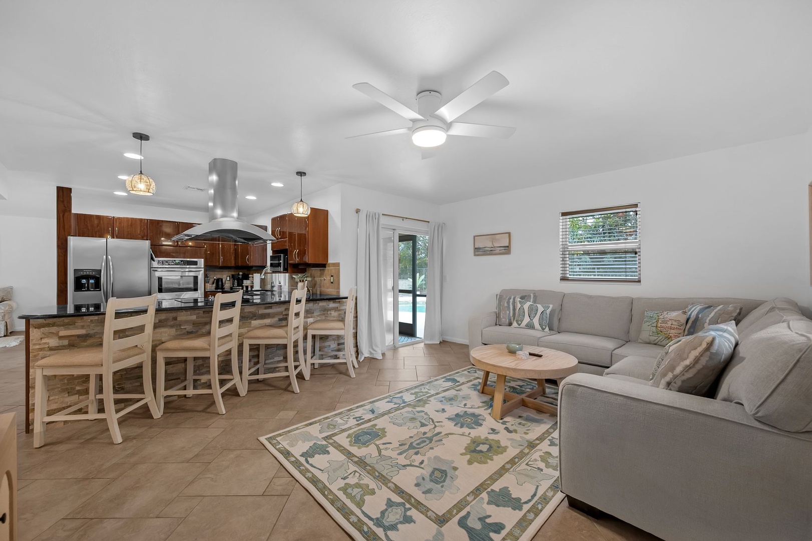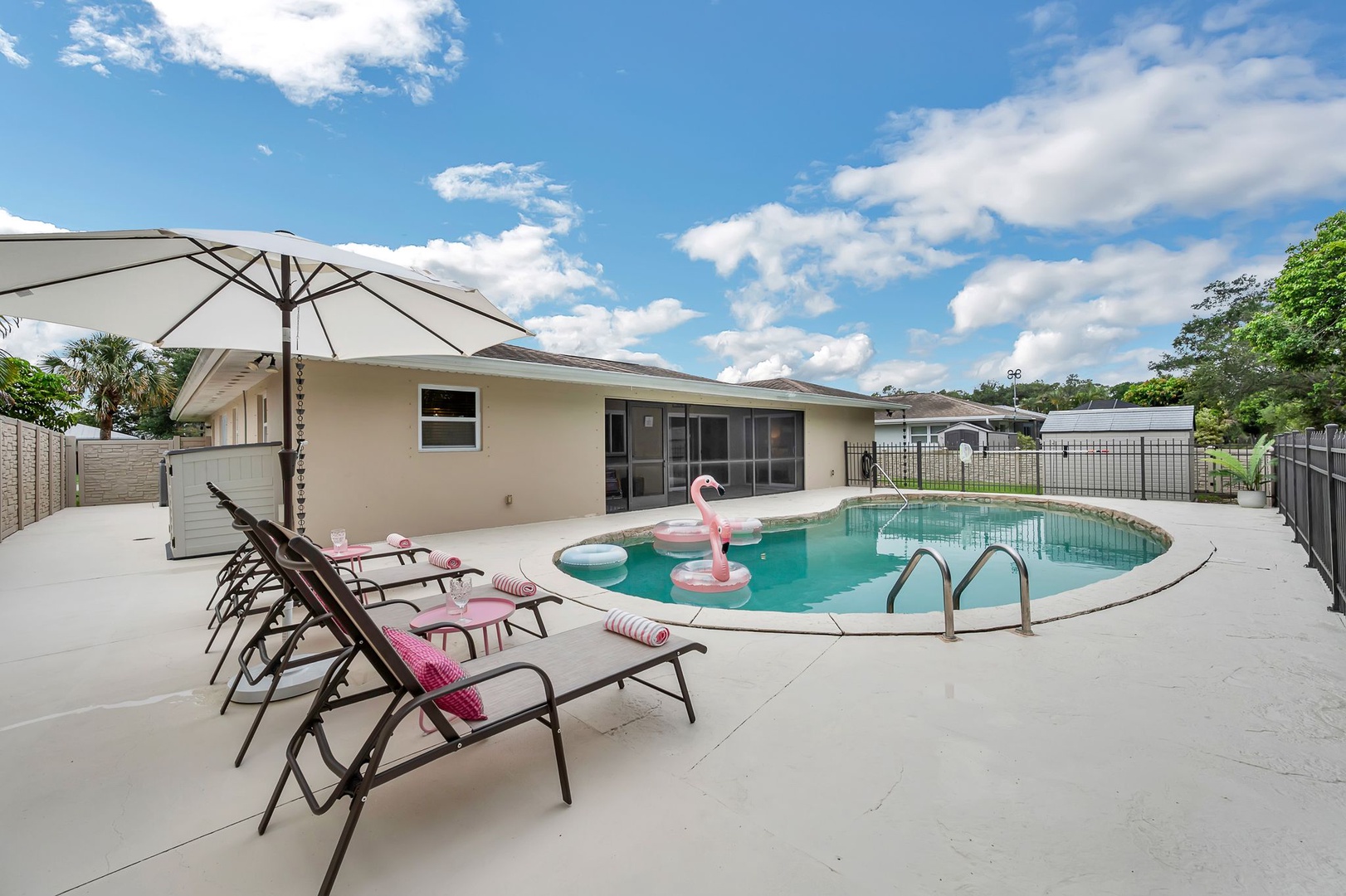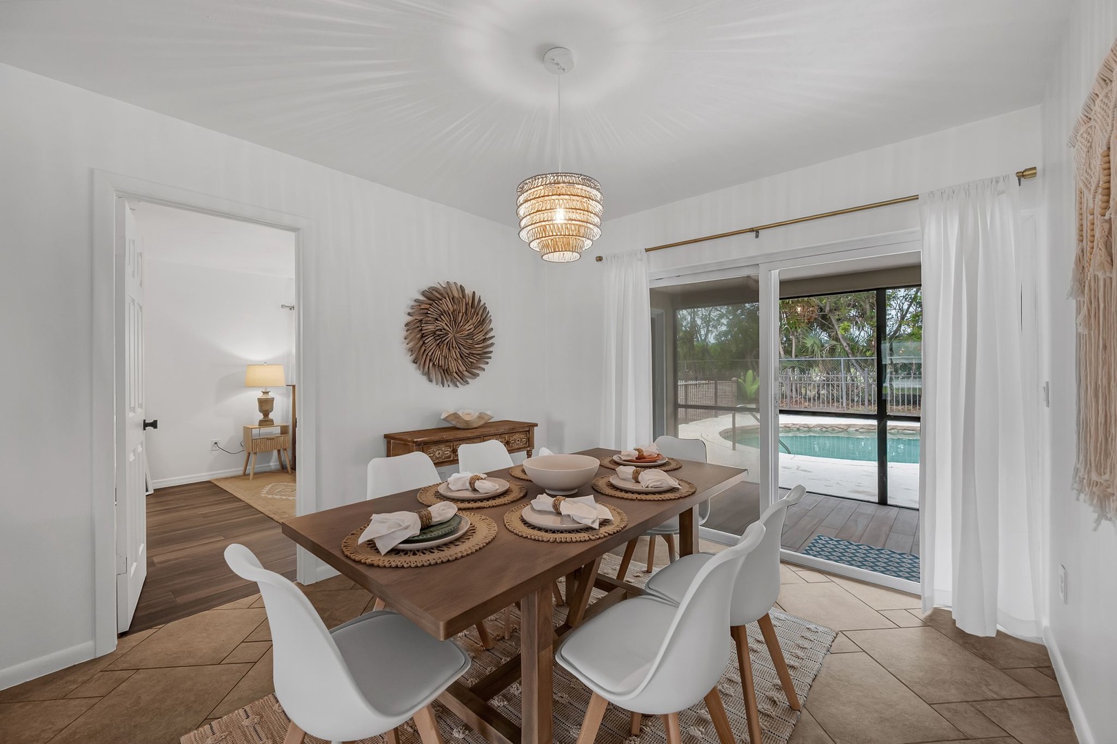 Escape to sunny Naples, enjoy the ultimate getaway in a spacious, comfortable 3-bedroom, 3-bathroom home. Family-friendly neighborhood with basketball courts and playgrounds. Nestled on a quiet street with a serene golf course as your backdrop. The property offers the perfect blend of relaxation and convenience, with easy access to everything Naples and Marco Island have to offer. Offering a large, sparkling saltwater in-ground pool, a fully fenced-in yard in addition to a separate fence around the pool. Your mind will be at ease with little ones playing. There's no better place to unwind after a day of exploring all that Naples has to offer—located just 12 minutes from Downtown Naples and the beaches. Guests say they have the best of Naples right at their fingertips! 65 inch smart TV. Fully equipped kitchen, new appliances and a seat up counter for 4 to watch meals unfold from the family chefs. Dining table seats six with views of the pool.