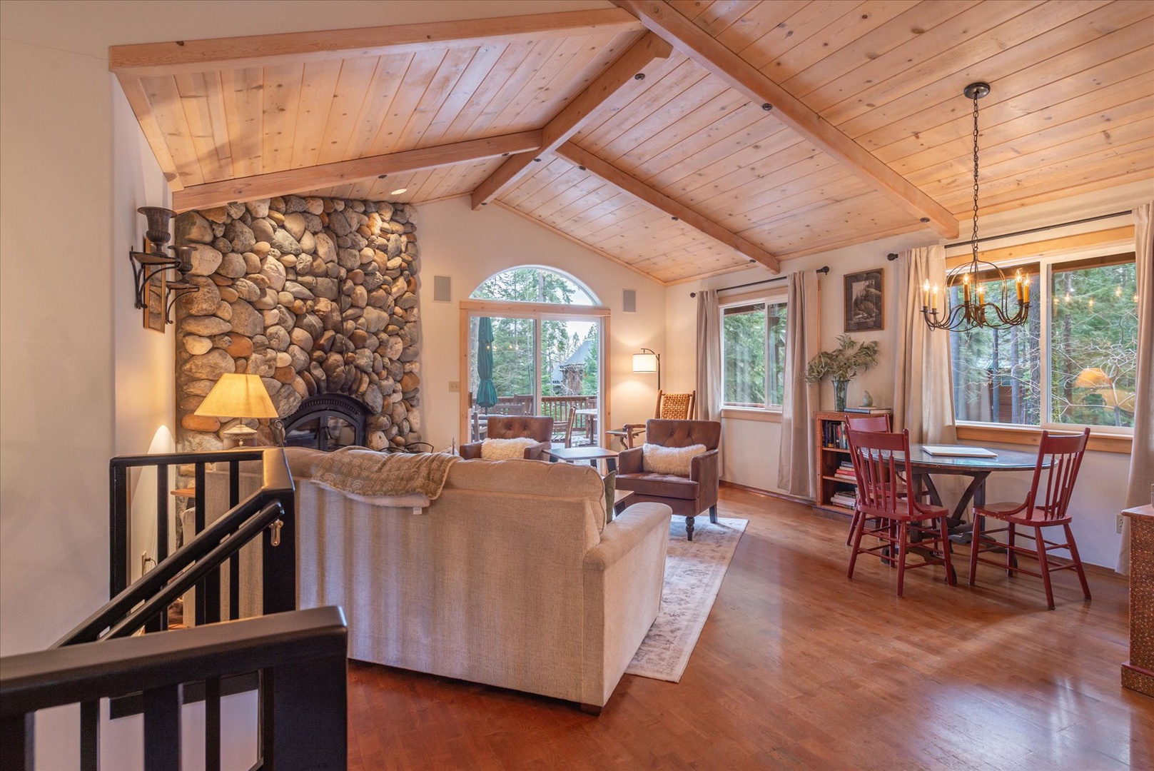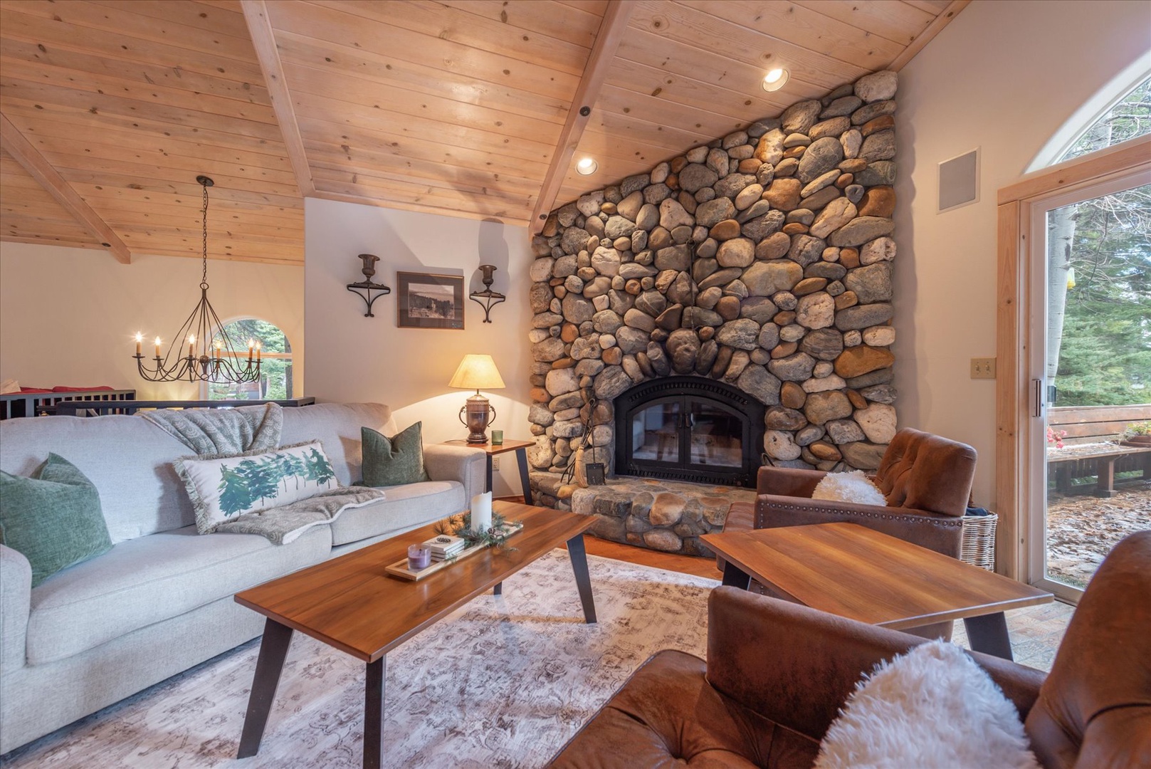 Tahoe Pines Beach Retreat Home California North Lake Tahoe Tahoe Pines Beach Retreat Tahoe Pines Beach Retreat Curl up in this cozy living room, where vaulted wood ceilings and forest views create the perfect mountain retreat for unwinding after your adventures. Feel at home in the second living area, complete with forest views, a built in bookshelf and smart TV, ready for you to stream your favorite shows. Picture yourself preparing meals in this inviting kitchen with its beautiful wood ceiling and cabinets. Natural light streams through the window above the sink, offering peaceful forest views while you cook. Drift off to sleep under exposed wooden beams that create a cozy alpine feel. Your comfortable bed awaits with crisp linens and warm ambient lighting from bedside lamps that cast a gentle glow. Welcome to your mountain escape! This charming wooden cabin nestled among towering pines offers the perfect forest retreat complete with an upper deck where you can breathe in the fresh mountain air. Open Gallery Curl up in this cozy living room, where vaulted wood ceilings and forest views create the perfect mountain retreat for unwinding after your adventures. Feel at home in the second living area, complete with forest views, a built in bookshelf and smart TV, ready for you to stream your favorite shows. Picture yourself preparing meals in this inviting kitchen with its beautiful wood ceiling and cabinets. Natural light streams through the window above the sink, offering peaceful forest views while you cook. Drift off to sleep under exposed wooden beams that create a cozy alpine feel. Your comfortable bed awaits with crisp linens and warm ambient lighting from bedside lamps that cast a gentle glow. Welcome to your mountain escape! This charming wooden cabin nestled among towering pines offers the perfect forest retreat complete with an upper deck where you can breathe in the fresh mountain air. Nestled among towering pines, your cozy mountain cabin awaits in this quiet wooded neighborhood. Bathe in the tranquility of the forest with the stunning surroundings of this wood-sided cabin. Take a walk around the corner to the HOA beach and private pier, access included with your booking. Curl up by the fireplace under the cathedral-ceiling retreat where rustic wood beams frame mountain views and cozy evenings await. Feel the mountain air as you climb the welcoming wooden steps under the covered entryway. Feel right at home as you cross the threshold into your own charming cabin, complete with rustic touches. Step inside and be greeted by the warmth of this home, then head upstairs to the living area or downstairs to the bedrooms. You'll love the exposed wood beams overhead and the inviting leather seating, perfect for mountain evenings and cozying up by your stunning stone fireplace in this warm living space. Modern comfort awaits as you unwind by the stone fireplace in this perfectly appointed open-concept living space. This spacious living room, with a cozy sitting area and game table, is framed by the vaulted ceilings and forest views. Sink into the plush leather armchairs and feel the warmth of natural wood beams overhead as sunlight filters through your forest views, creating the perfect mountain retreat atmosphere. Step onto your private forest deck where towering pines create a natural cathedral around you. Imagine sipping morning coffee at the dual outdoor tables, breathing in the crisp mountain air. Gather around your cozy nook, lit by an elegant chandelier to light up fun-filled evenings ready for game night with the bookshelf stocked with boardgames. This open-concept cabin will be your home away from home, as you move seamlessly between the living spaces. Cozy up in your mountain retreat where rustic wood beams frame an inviting open-concept space. Sink into the plush red sectional sofa and feel the warmth of home as natural light streams through windows. Gather around this beautiful rustic kitchen where warm wood tones and charming chandeliers create the perfect atmosphere for your mountain getaway meals and morning coffee conversations. Your fully equipped kitchen welcomes you with warm wood cabinetry and modern appliances, perfect for preparing meals while enjoying views of the surrounding forest through large windows. Your kitchen awaits with stainless steel appliances, sprawling countertops, warm wood cabinets, ready for you to create memorable meals during your stay. Drift off to peaceful dreams in your cozy master bedroom sanctuary complete with ensuite bathroom. Rustic wood beams frame fluffy white linens and warm lamplight creates the perfect atmosphere for rest. Step into your private master bathroom featuring a luxurious glass-enclosed shower, warm wood vanity, and thoughtful touches like plush towels and premium amenities. Step into your serene mountain retreat where the rustic four-poster bed invites you to sink into plaid comfort. Natural light streams through your window, revealing forest views that'll greet you each morning. Your cozy bunk room awaits with cheerful bedding and warm wood furnishings - perfect for families or friends to share stories and laughter before drifting off to sleep together. And kids will love their secret play area, accessible through the closet. Your kids will love this charming bunk room with four cozy beds and cheerful floral linens. Step into your spacious walk-in shower with premium amenities, and warm natural light filtering through the window. Fresh towels await as you unwind in this beautifully appointed bathroom. Your dedicated laundry space makes staying fresh effortless, with modern washer and dryer plus thoughtfully organized shelving for all your essentials. Hit the slopes at nearby Homewood, a family friendly resort known for its incredible lake views and untouched snow. Head for a waterfront meal at Sunnyside Resort, known for it's marina and restaurant in a scenic lakeside setting. A short hike up local Eage Rock will lead y