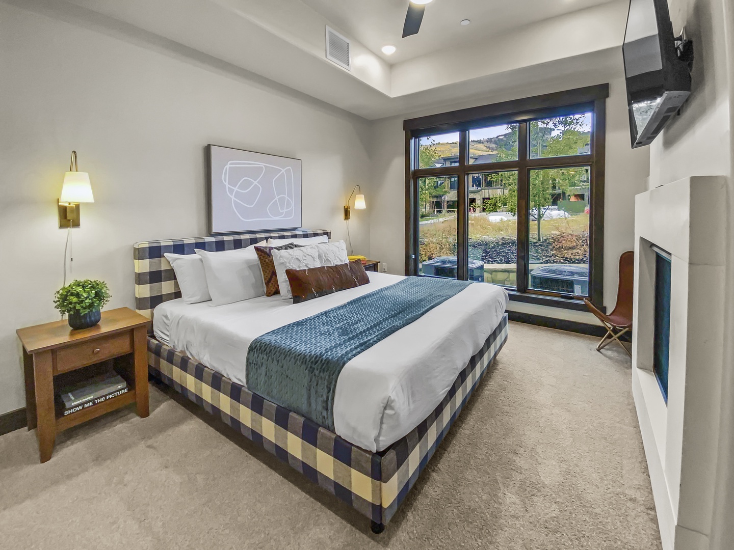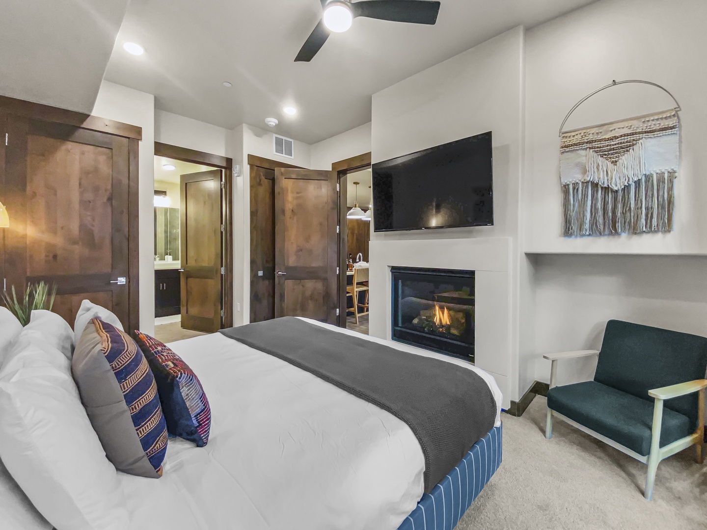 Primary Bedroom: King Bed, Smart TV, Fireplace, and Ensuite Bathroom