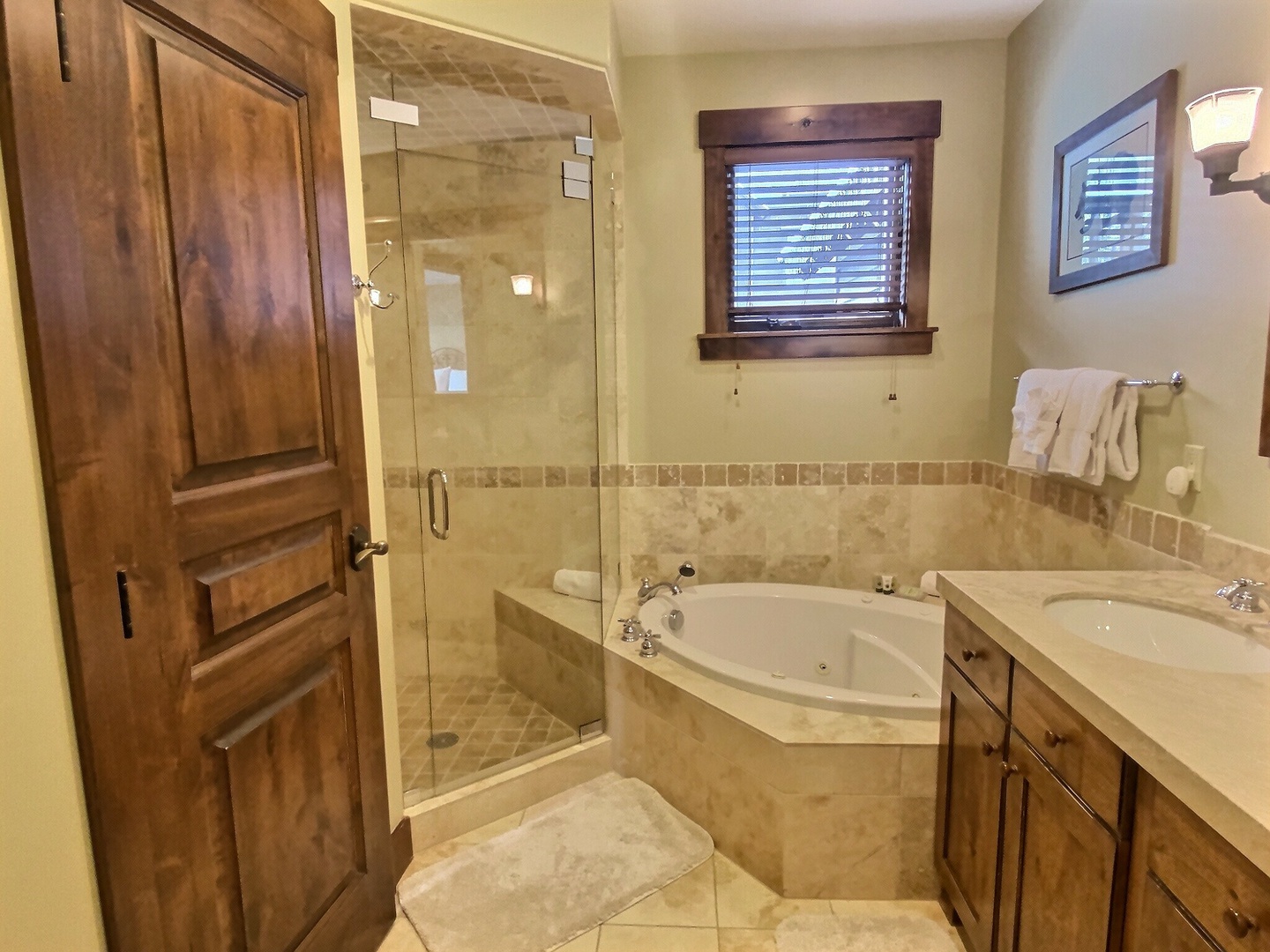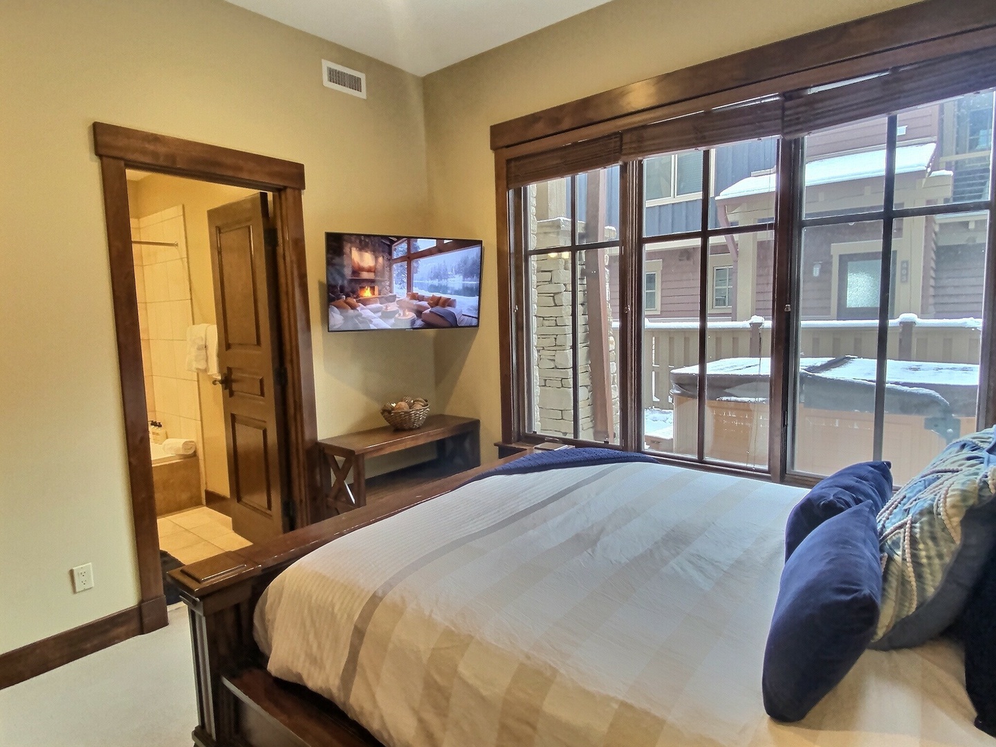 -Primary Bedroom: King bed, Smart TV, private balcony, and a luxurious en suite with a jetted tub and spacious shower.