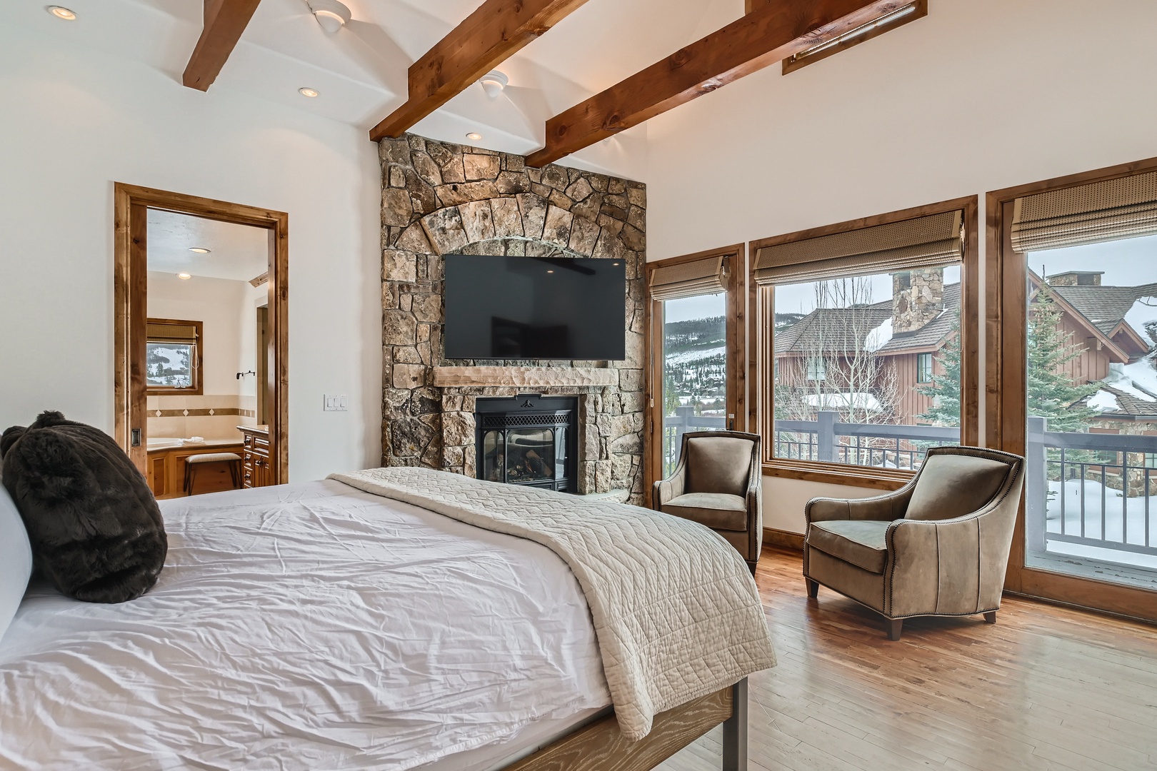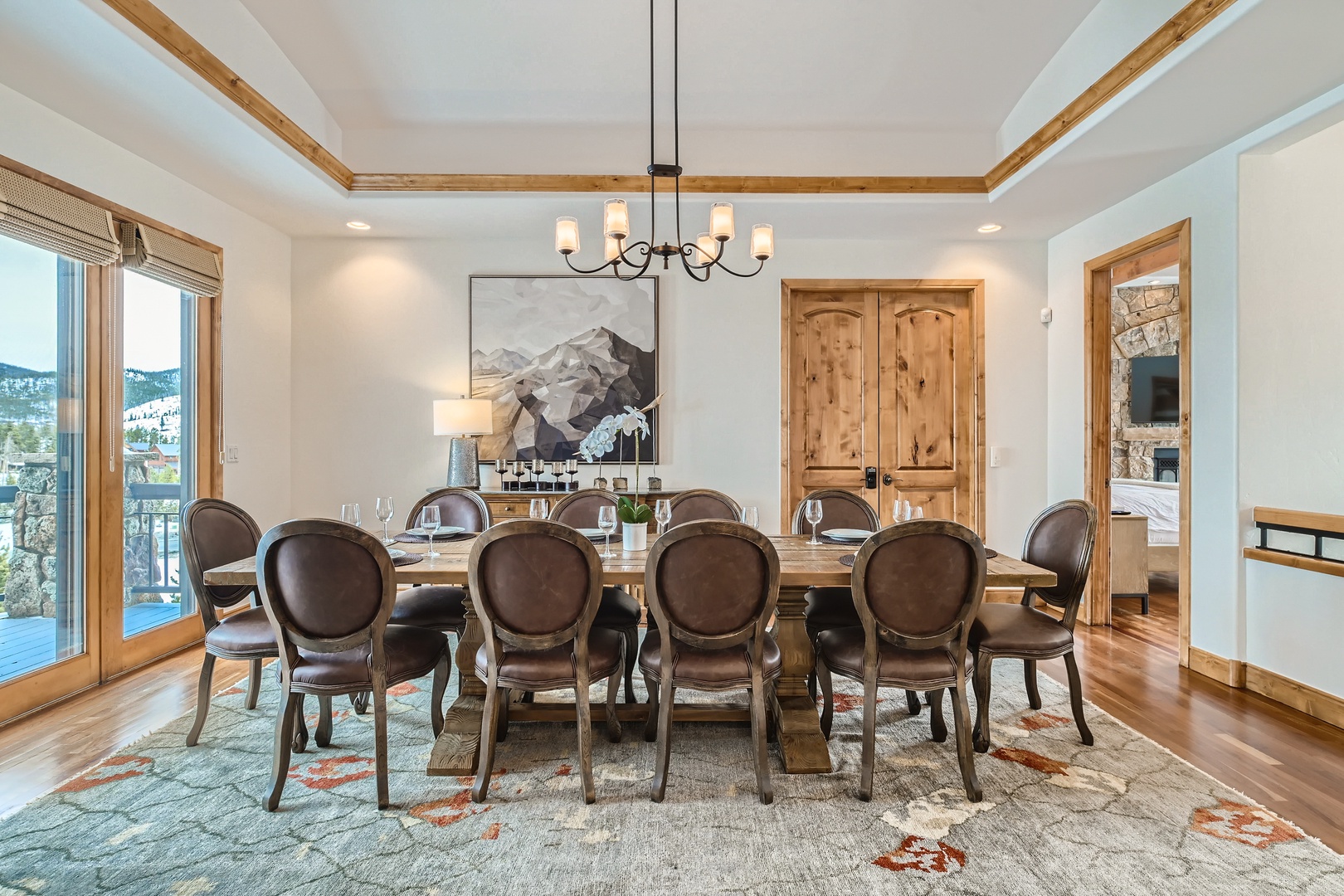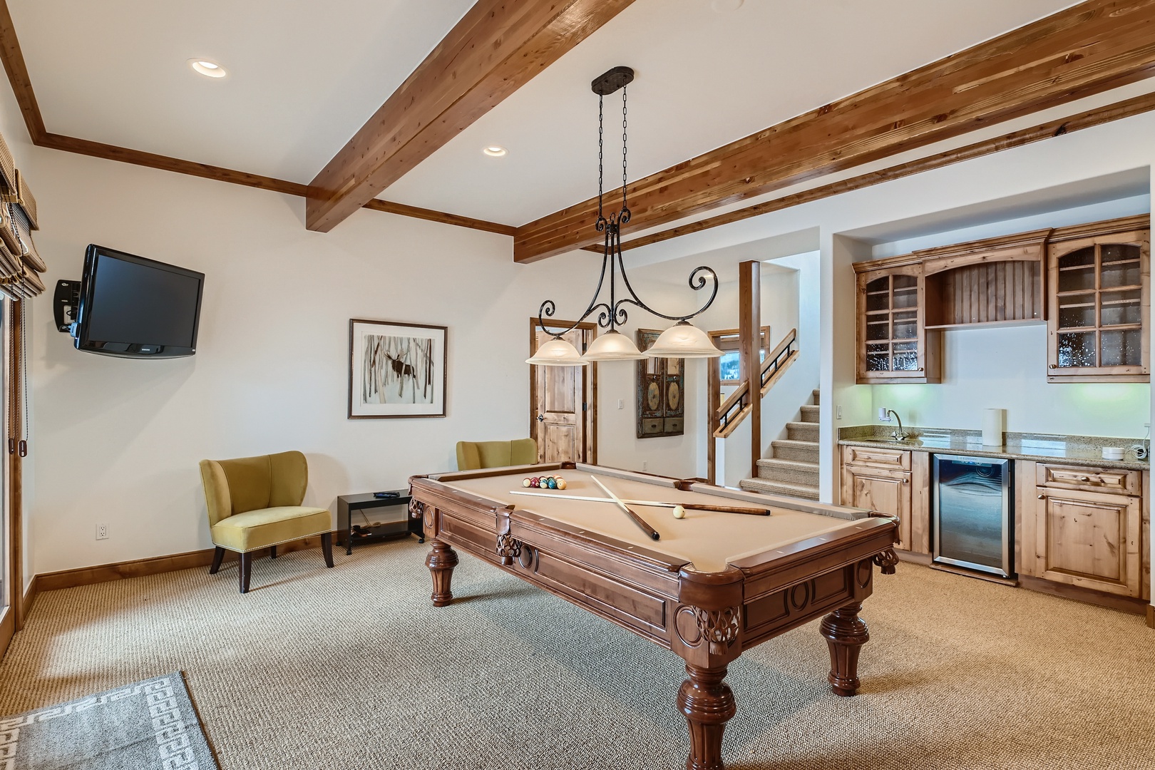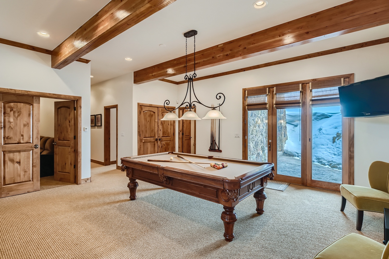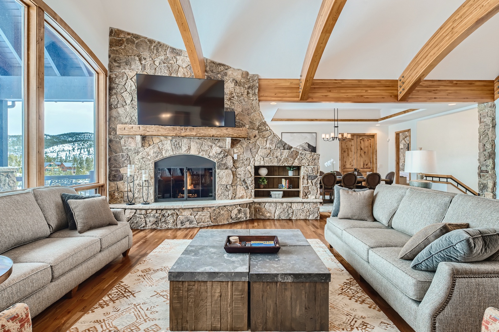 Apres & Fairway Retreat Apres & Fairway Retreat A two-story house with dark exterior colors and stone details is surrounded by trees at sunset, with a pink and purple sky in the background. A cozy bedroom with a wooden bed, stone fireplace, TV, hardwood floors, two bedside tables with lamps, and a mix of modern and rustic elements. An outdoor hot tub with jets running, nestled under a wooded deck with stone pillars, overlooks a rocky landscape and distant hills during sunset. Room with a wooden pool table under a chandelier, carpeted floor, wooden beams, and doors leading outside. Snow is visible through the glass doors. A covered outdoor deck with a dining table and chairs overlooks a lush golf course and mountain landscape under a pink sunset sky. Open Gallery A two-story house with dark exterior colors and stone details is surrounded by trees at sunset, with a pink and purple sky in the background. A cozy bedroom with a wooden bed, stone fireplace, TV, hardwood floors, two bedside tables with lamps, and a mix of modern and rustic elements. An outdoor hot tub with jets running, nestled under a wooded deck with stone pillars, overlooks a rocky landscape and distant hills during sunset. Room with a wooden pool table under a chandelier, carpeted floor, wooden beams, and doors leading outside. Snow is visible through the glass doors. A covered outdoor deck with a dining table and chairs overlooks a lush golf course and mountain landscape under a pink sunset sky. Exterior view of a stone and wood house with a large, arched front door, steps leading up to a porch, and a chandelier visible inside. Trees are next to the porch, and the sky shows a hint of sunset. A wooden door with glass panels leads to a porch. Inside, a bench sits against a wall, which is adorned with a large circular mirror. A living space with wooden arches, large windows showcasing a snowy landscape, a rustic bench, and a circular mirror on the wall. The area includes a seating area, dining table, and kitchen. A spacious living room features a stone fireplace, TV, two gray sofas, wooden beams on the ceiling, and a view of a snowy landscape through large windows. A spacious living room with large windows, stone fireplace, gray sofas, leather chairs, wooden beams, and a TV mounted above the fireplace. The room has wooden floors and a view of an outdoor scene. A cozy living room features a stone fireplace, a large TV above it, a gray couch, and armchairs. Large windows offer a snowy mountain view. A wooden coffee table and a lamp complete the decor. A spacious living room with wooden beams, large windows showcasing a snowy mountain view, a stone fireplace, gray sofas, and modern decor. A spacious living room with gray sofas, a large wooden coffee table, exposed wooden beams, and two hanging light fixtures. The room opens to a kitchen with wooden cabinetry and a dining area. A spacious living room with wooden beams, a stone fireplace, a large TV mounted above it, and modern furniture including a sectional sofa, armchairs, and a wooden coffee table. Spacious living room with wooden beams, modern furniture including two gray sofas facing a wooden coffee table, and an open kitchen and dining area in the background. Large windows offer natural light. Modern kitchen with wooden cabinets, a curved granite countertop island, and four black barstools. The space features pendant lighting, stainless steel appliances, and a mix of wood and tile flooring. A spacious kitchen with wooden beams and granite countertops, featuring a gas stove, double ovens, and a stone fireplace in the background. Large windows overlook a scenic outdoor view. A modern kitchen with stainless steel appliances, wooden cabinets, a double-door refrigerator, an oven, a stove, and a large window overlooking a snowy landscape. A kitchen with wooden cabinets, a double oven, a stove, a coffee maker, a toaster, and a sink. Large windows provide natural light and views of a snowy landscape outside. A rustic kitchen with wooden cabinets, a double sink beneath windows, a refrigerator with wooden panel doors, and a knife block on the counter. A wooden dining table with four chairs in a spacious room featuring a stone wall with a fireplace, a mounted TV, and large windows offering a view of a snowy landscape. A dining room with a large wooden table, ten brown leather chairs, a chandelier, and a wall painting. The room has wooden doors, windows with blinds, and a patterned rug on the floor. A dining table is set with white plates, wine glasses, and a centerpiece of white flowers, positioned in front of large windows in a room with stone walls. A dining room with a long table set for eight people. There's a chandelier above the table, wooden double doors, large windows, and a painting on the wall. The room has a rustic yet modern decor. A cozy bedroom with a wooden floor featuring a bed, a stone fireplace with a TV above, and wooden beams on the ceiling. A cozy bedroom features a bed with white linens, a stone fireplace with a TV mounted above it, two armchairs by large windows, and wooden beams on the ceiling. Snow-covered scenery is visible outside. A cozy bedroom with a fireplace, TV, and large windows showing a snowy landscape. Two armchairs and a small table sit near the window. The bed is in the foreground, covered with a white quilt. Spacious bathroom with a glass-enclosed shower, dual sinks with wooden cabinetry, two mirrors, tiled floor, and a bench. A bathroom featuring a large bathtub with a wooden enclosure, folded towels on a bench, and a window with a nature view. A bathroom with wooden cabinets, a single sink, a large mirror with lights above, tiled flooring, and wooden doors. Another room with a bed is visible through an open door. A basement room features a pool table with cue sticks, a set of balls, green chairs, a television, wooden cabinets with shelves, a mini-fridge, a sink, and stairs leading to the upper floor. A room with a billiards table, two crossed 