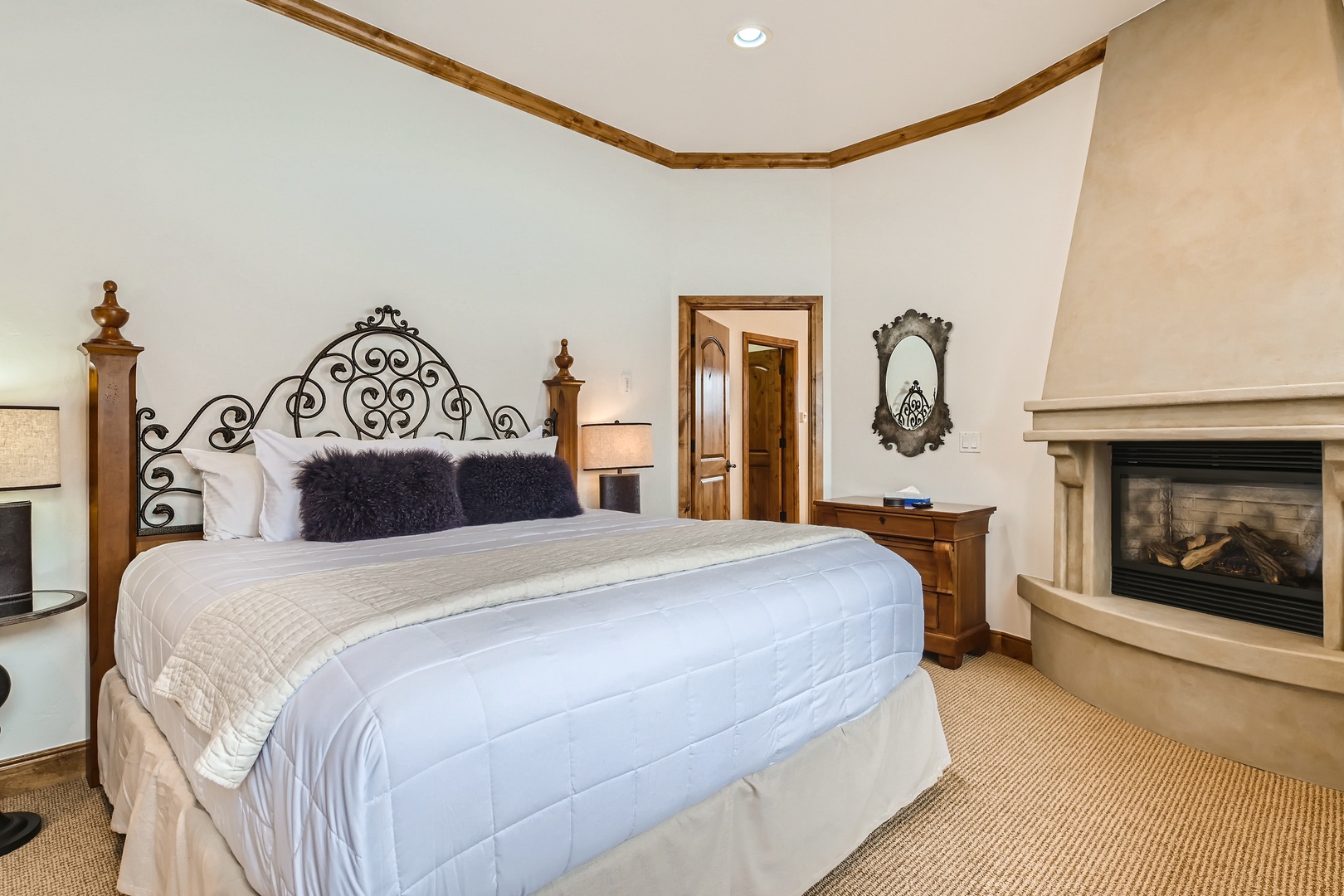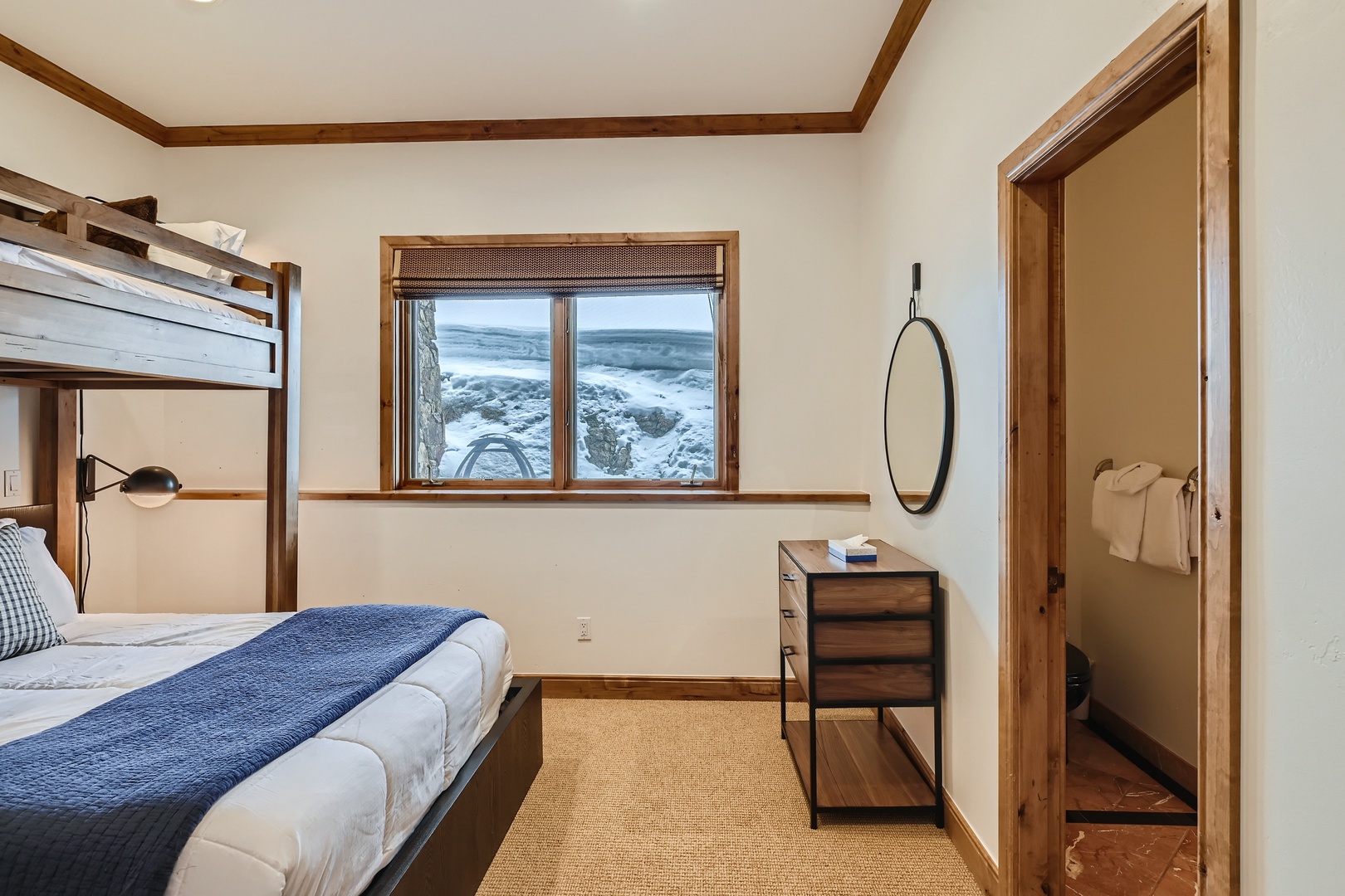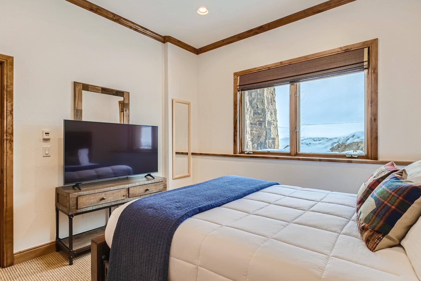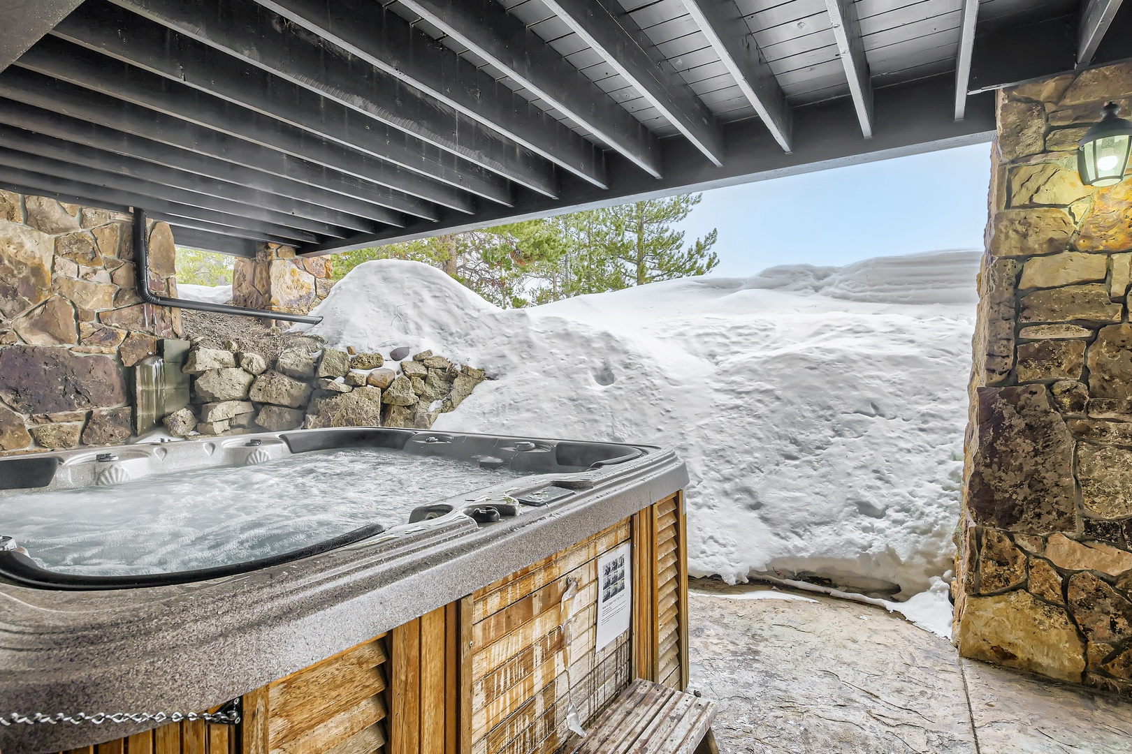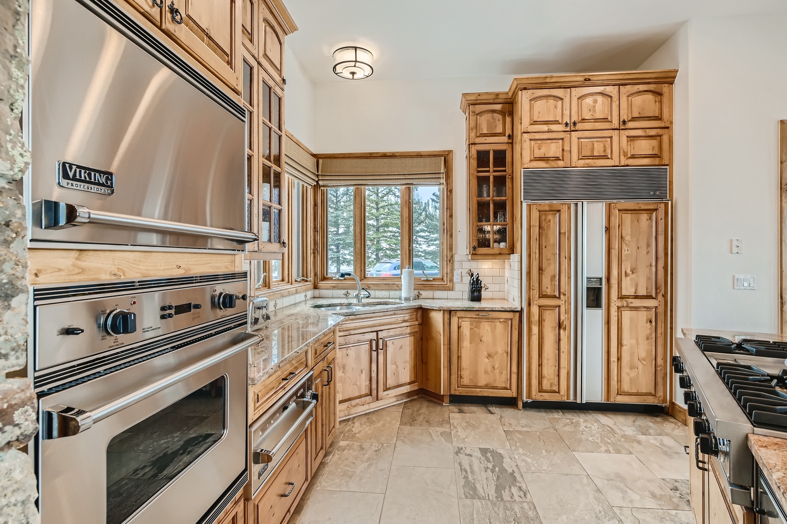 Apres & Fairway Retreat Apres & Fairway Retreat A two-story house with dark exterior colors and stone details is surrounded by trees at sunset, with a pink and purple sky in the background. A cozy bedroom with a wooden bed, stone fireplace, TV, hardwood floors, two bedside tables with lamps, and a mix of modern and rustic elements. An outdoor hot tub with jets running, nestled under a wooded deck with stone pillars, overlooks a rocky landscape and distant hills during sunset. Room with a wooden pool table under a chandelier, carpeted floor, wooden beams, and doors leading outside. Snow is visible through the glass doors. A covered outdoor deck with a dining table and chairs overlooks a lush golf course and mountain landscape under a pink sunset sky. Open Gallery A two-story house with dark exterior colors and stone details is surrounded by trees at sunset, with a pink and purple sky in the background. A cozy bedroom with a wooden bed, stone fireplace, TV, hardwood floors, two bedside tables with lamps, and a mix of modern and rustic elements. An outdoor hot tub with jets running, nestled under a wooded deck with stone pillars, overlooks a rocky landscape and distant hills during sunset. Room with a wooden pool table under a chandelier, carpeted floor, wooden beams, and doors leading outside. Snow is visible through the glass doors. A covered outdoor deck with a dining table and chairs overlooks a lush golf course and mountain landscape under a pink sunset sky. Exterior view of a stone and wood house with a large, arched front door, steps leading up to a porch, and a chandelier visible inside. Trees are next to the porch, and the sky shows a hint of sunset. A wooden door with glass panels leads to a porch. Inside, a bench sits against a wall, which is adorned with a large circular mirror. A living space with wooden arches, large windows showcasing a snowy landscape, a rustic bench, and a circular mirror on the wall. The area includes a seating area, dining table, and kitchen. A spacious living room features a stone fireplace, TV, two gray sofas, wooden beams on the ceiling, and a view of a snowy landscape through large windows. A spacious living room with large windows, stone fireplace, gray sofas, leather chairs, wooden beams, and a TV mounted above the fireplace. The room has wooden floors and a view of an outdoor scene. A cozy living room features a stone fireplace, a large TV above it, a gray couch, and armchairs. Large windows offer a snowy mountain view. A wooden coffee table and a lamp complete the decor. A spacious living room with wooden beams, large windows showcasing a snowy mountain view, a stone fireplace, gray sofas, and modern decor. A spacious living room with gray sofas, a large wooden coffee table, exposed wooden beams, and two hanging light fixtures. The room opens to a kitchen with wooden cabinetry and a dining area. A spacious living room with wooden beams, a stone fireplace, a large TV mounted above it, and modern furniture including a sectional sofa, armchairs, and a wooden coffee table. Spacious living room with wooden beams, modern furniture including two gray sofas facing a wooden coffee table, and an open kitchen and dining area in the background. Large windows offer natural light. Modern kitchen with wooden cabinets, a curved granite countertop island, and four black barstools. The space features pendant lighting, stainless steel appliances, and a mix of wood and tile flooring. A spacious kitchen with wooden beams and granite countertops, featuring a gas stove, double ovens, and a stone fireplace in the background. Large windows overlook a scenic outdoor view. A modern kitchen with stainless steel appliances, wooden cabinets, a double-door refrigerator, an oven, a stove, and a large window overlooking a snowy landscape. A kitchen with wooden cabinets, a double oven, a stove, a coffee maker, a toaster, and a sink. Large windows provide natural light and views of a snowy landscape outside. A rustic kitchen with wooden cabinets, a double sink beneath windows, a refrigerator with wooden panel doors, and a knife block on the counter. A wooden dining table with four chairs in a spacious room featuring a stone wall with a fireplace, a mounted TV, and large windows offering a view of a snowy landscape. A dining room with a large wooden table, ten brown leather chairs, a chandelier, and a wall painting. The room has wooden doors, windows with blinds, and a patterned rug on the floor. A dining table is set with white plates, wine glasses, and a centerpiece of white flowers, positioned in front of large windows in a room with stone walls. A dining room with a long table set for eight people. There's a chandelier above the table, wooden double doors, large windows, and a painting on the wall. The room has a rustic yet modern decor. A cozy bedroom with a wooden floor featuring a bed, a stone fireplace with a TV above, and wooden beams on the ceiling. A cozy bedroom features a bed with white linens, a stone fireplace with a TV mounted above it, two armchairs by large windows, and wooden beams on the ceiling. Snow-covered scenery is visible outside. A cozy bedroom with a fireplace, TV, and large windows showing a snowy landscape. Two armchairs and a small table sit near the window. The bed is in the foreground, covered with a white quilt. Spacious bathroom with a glass-enclosed shower, dual sinks with wooden cabinetry, two mirrors, tiled floor, and a bench. A bathroom featuring a large bathtub with a wooden enclosure, folded towels on a bench, and a window with a nature view. A bathroom with wooden cabinets, a single sink, a large mirror with lights above, tiled flooring, and wooden doors. Another room with a bed is visible through an open door. A basement room features a pool table with cue sticks, a set of balls, green chairs, a television, wooden cabinets with shelves, a mini-fridge, a sink, and stairs leading to the upper floor. A room with a billiards table, two crossed 