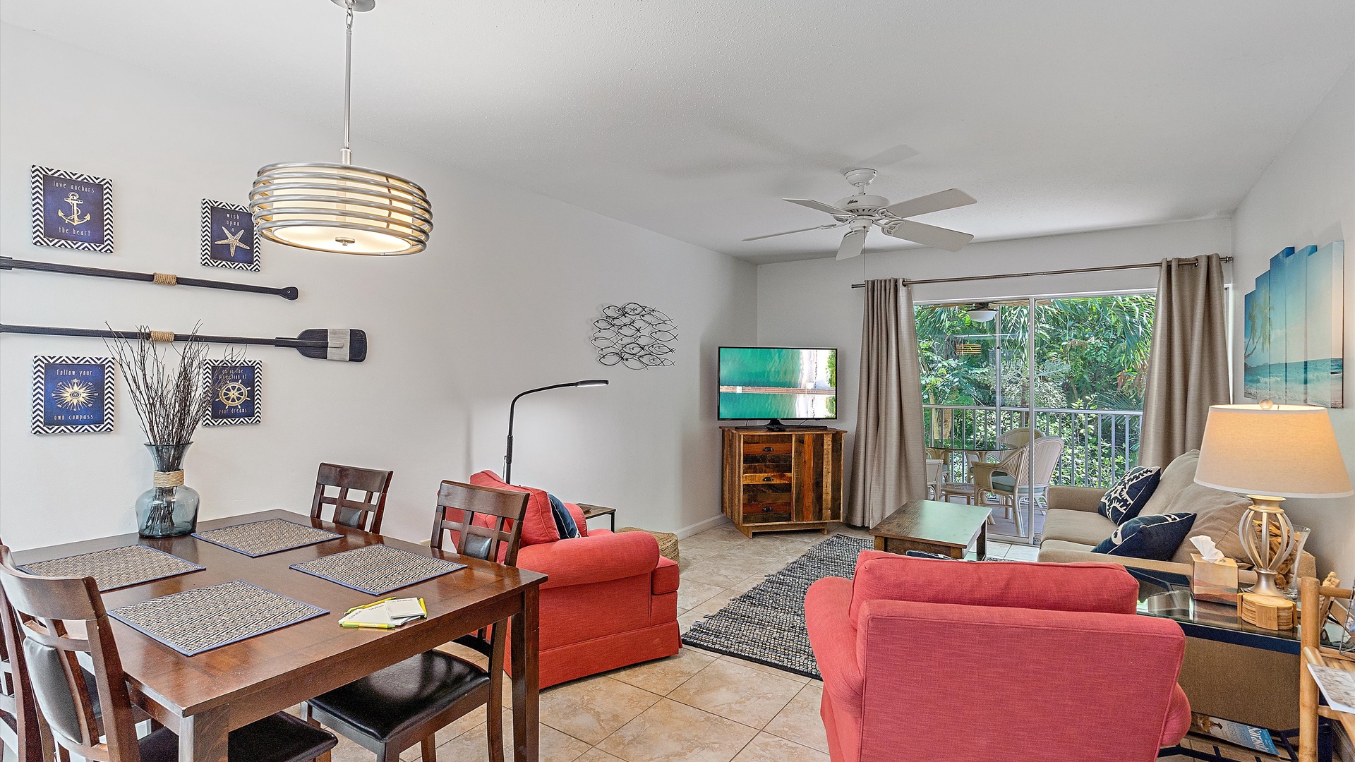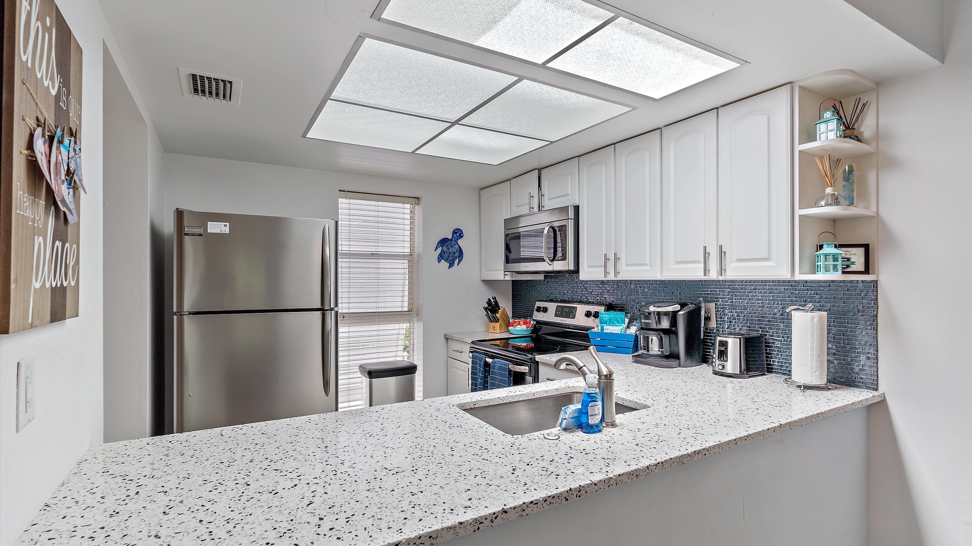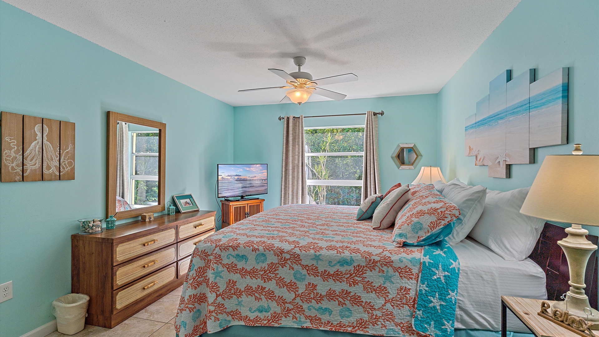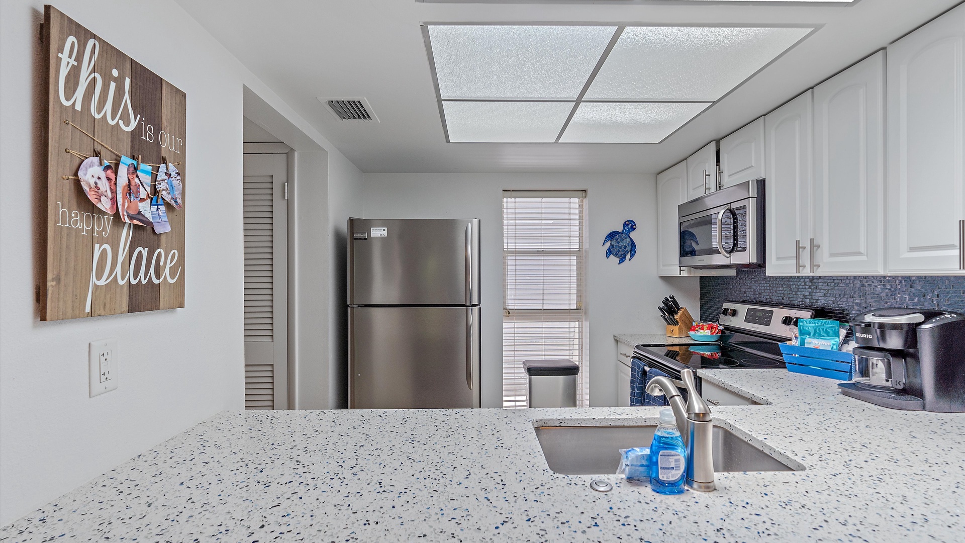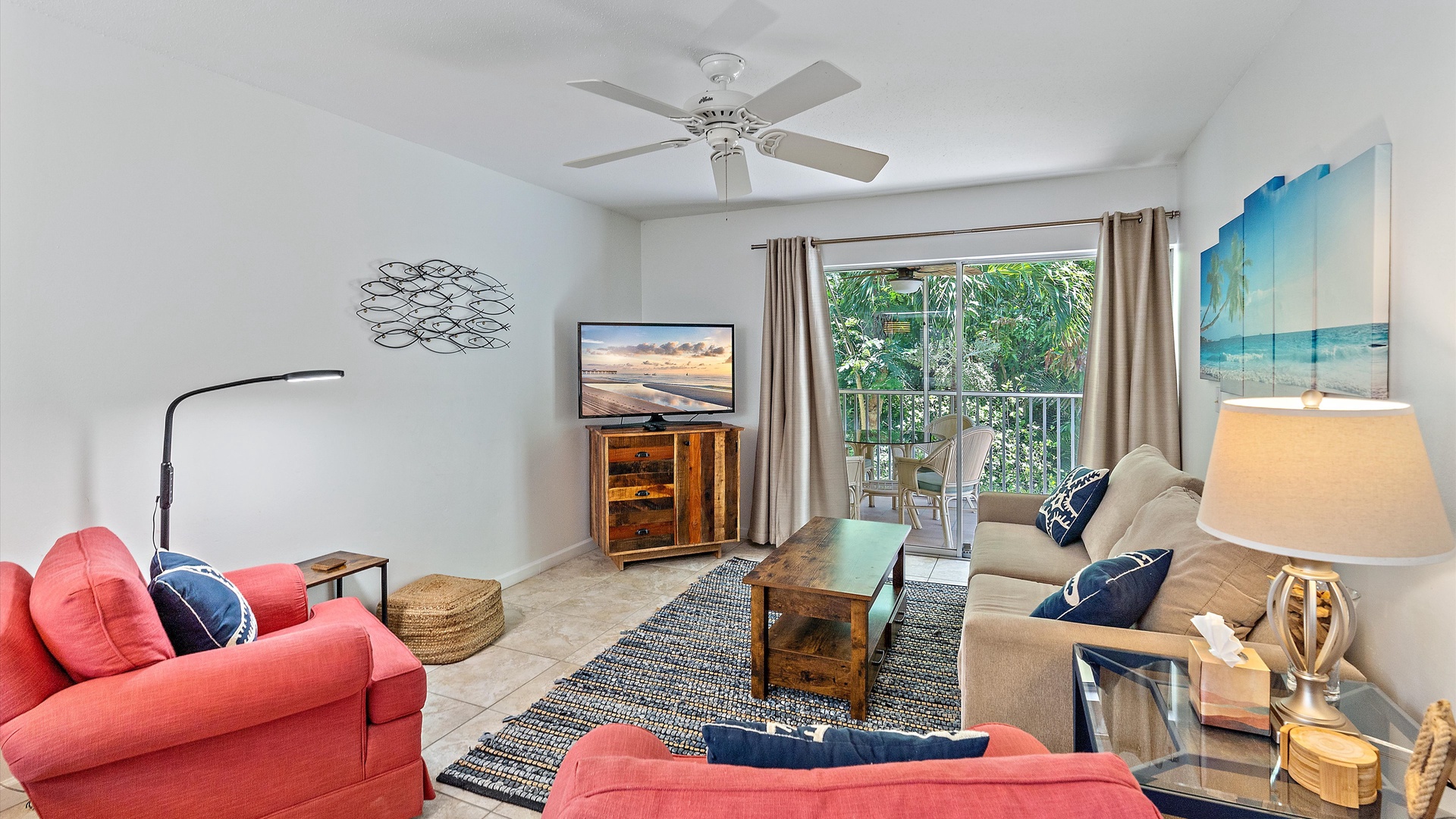 It’s a Shore Thing at Beach Castle #14 Home Florida Sarasota It's a Shore Thing at Beach Castle #14 It's a Shore Thing at Beach Castle #14 A cozy living room with a gray sofa, blue cushions, a wooden coffee table, a TV on a wooden stand, a ceiling fan, beach-themed artwork, and a sliding door leading to a balcony with outdoor seating. A bedroom with turquoise walls, wood furniture, and a bed with coral-themed bedding. The room has a ceiling fan, a TV on a dresser, a window with gray curtains, and beach-themed decor. A small, modern kitchen and dining area with a wood table, four chairs, wall decor of paddles, and nautical-themed art. The kitchen features a stainless steel refrigerator and an open shelf design. A modern kitchen featuring a stainless steel refrigerator, stove, and microwave, blue tiled backsplash, white cabinets, and a speckled countertop with a sink. Outdoor swimming pool and hot tub surrounded by lounge chairs, palm trees, and greenery, with a yellow building in the background under a blue sky. Open Gallery A cozy living room with a gray sofa, blue cushions, a wooden coffee table, a TV on a wooden stand, a ceiling fan, beach-themed artwork, and a sliding door leading to a balcony with outdoor seating. A bedroom with turquoise walls, wood furniture, and a bed with coral-themed bedding. The room has a ceiling fan, a TV on a dresser, a window with gray curtains, and beach-themed decor. A small, modern kitchen and dining area with a wood table, four chairs, wall decor of paddles, and nautical-themed art. The kitchen features a stainless steel refrigerator and an open shelf design. A modern kitchen featuring a stainless steel refrigerator, stove, and microwave, blue tiled backsplash, white cabinets, and a speckled countertop with a sink. Outdoor swimming pool and hot tub surrounded by lounge chairs, palm trees, and greenery, with a yellow building in the background under a blue sky. A screened-in porch with a glass table and wicker chairs overlooks lush greenery. A tropical-style ceiling fan is mounted above. A sandy path leads through grass to a beach with a few people near the water, under a clear blue sky with some clouds. A grassy lawn leads to a wooden dock extending into a body of water, with trees and bushes on both sides under a blue sky with scattered clouds. A yellow two-story building with closed white shutters, a balcony, and surrounded by various tropical plants. A gravel pathway and landscaped garden are visible in the foreground. A living room with a beige sofa, red armchair, and blue-patterned cushions. Beach-themed wall art features palm trees and ocean. A side table with a lamp and small decor items is also visible. A cozy living room features a ceiling fan, a wall-mounted TV, a beige sofa, and red armchairs. A sliding glass door leads to a small balcony with garden views. The room is decorated with beach-themed art. A living room with two red armchairs, blue pillows, a brown coffee table, a floor lamp, and a ceiling fan. The background shows an open kitchen and dining area with a wooden table and chairs. A living room and dining area featuring a dining table with place settings, armchairs, a TV, ceiling fan, artwork on the walls, and a large window with a view of greenery outside. A dining area with a wooden table set for four and nautical wall decor. To the right, a red couch faces a TV on a wooden stand. A modern light fixture hangs above the table. A cozy living room with red armchairs, a side table with a lamp, and nautical-themed decor. The room leads into a small kitchen with a dining counter and wooden chairs. A modern kitchen and dining area with white cabinets, stainless steel appliances, a granite countertop, a wooden dining table, and nautical-themed wall decor. A view from a kitchen with white cabinets and granite counters into a living room with red and beige furniture, a wall-mounted TV, and a balcony view. A wall sign reads "this is our happy place. Modern kitchen featuring white cabinets, stainless steel appliances, a speckled countertop, sink, and a decorative sign on the wall. Modern kitchen with white cabinets, stainless steel appliances, and a speckled countertop. Decorative nautical elements are on the wall, including a blue turtle and paddle. Dining table in the background. Modern kitchen with white cabinets, granite countertops, and stainless steel sink, adjacent to a dining area with a wooden table and chairs, and a living room with a red couch and TV, leading to a balcony. A modern kitchen features a stainless steel stove with a microwave above it, a coffee maker, toaster, knife block, and a decorative turtle on the wall. The backsplash is a mosaic of small blue tiles. A modern kitchen with white cabinets, a stainless steel microwave, and an electric stove. On the counter are a coffee maker, mugs, and a basket. The background shows a dining area and a wall-mounted TV. Modern open-plan kitchen and living room with granite countertops, dining table, and seating area with red couches and a TV. A balcony with greenery is visible through the sliding glass doors. A kitchen hallway with a metallic refrigerator on the right, a white tiled floor, and a sign on the wall with the text "this is our happy place." A door and a patterned shower curtain are visible in the distance. A bedroom with aqua-colored walls features a large bed with a coral-patterned comforter, two nightstands with lamps, a ceiling fan, and a window with beige curtains. A seascape artwork hangs above the bed. A bedroom with a large bed featuring coral pattern bedding. The walls are painted light blue with beach-themed decorations. A doorway leads to a bathroom with white cabinetry and a fish wall decor. A bedroom featuring a bed with coral-patterned bedding, a ceiling fan, a dresser with a mirror, and light blue walls. A closet and open doors are visible in the background. A bathroom with a speckled countertop, a sink, a rolled towel, toiletries, a mirror, a colorful fish