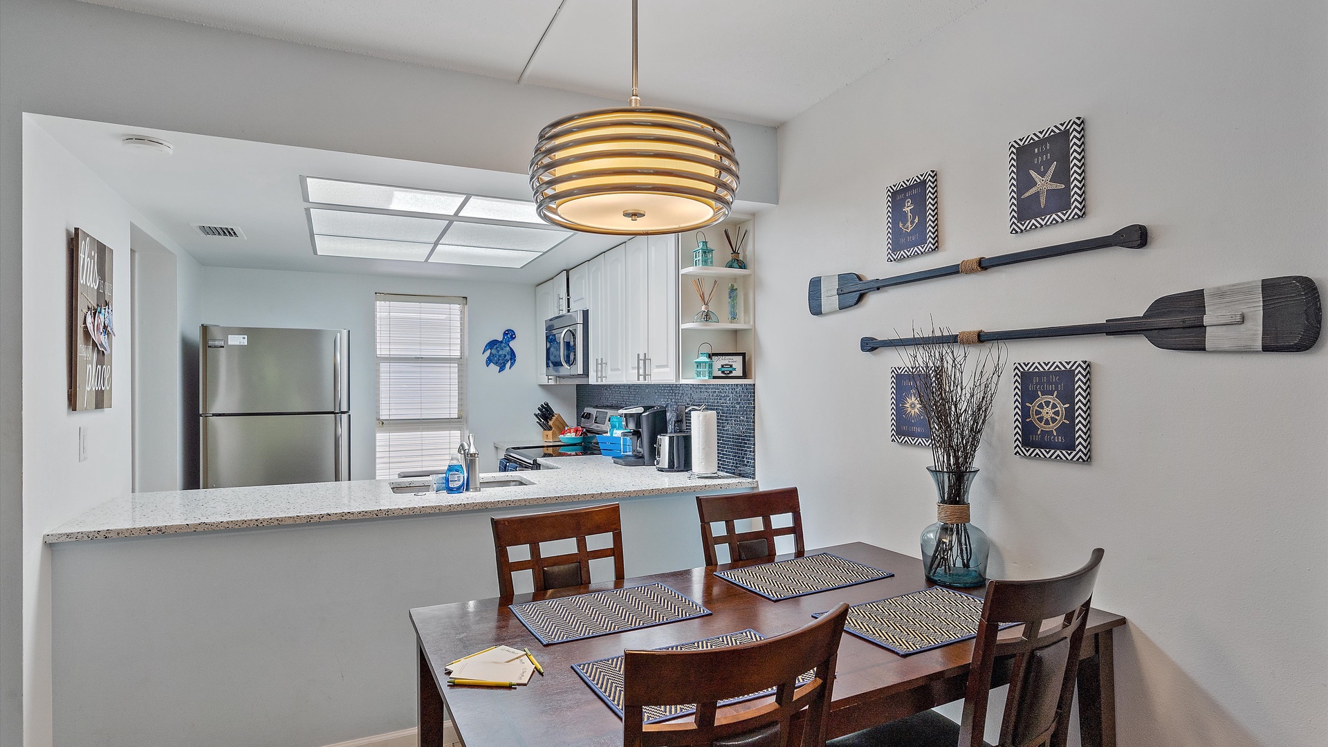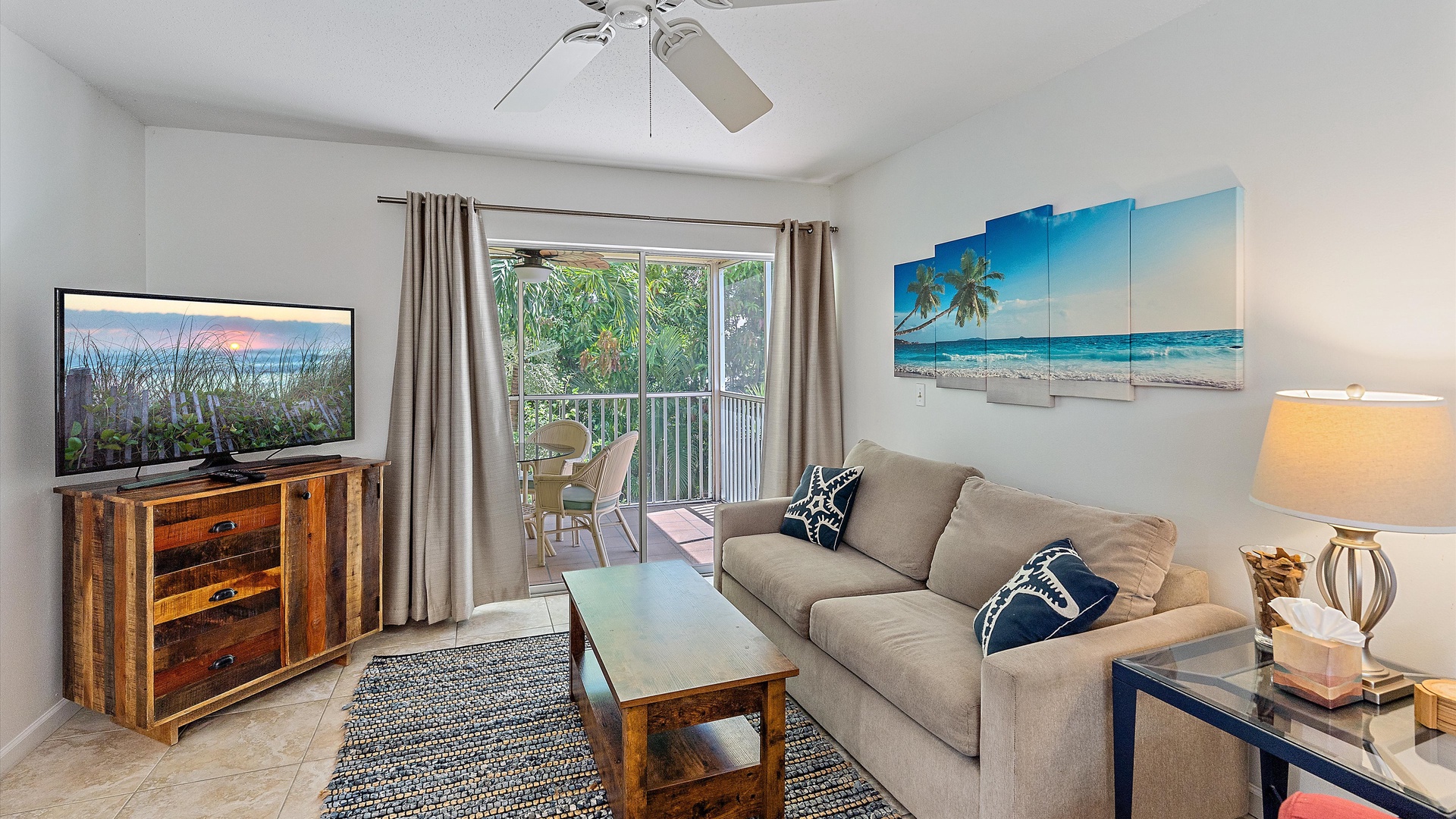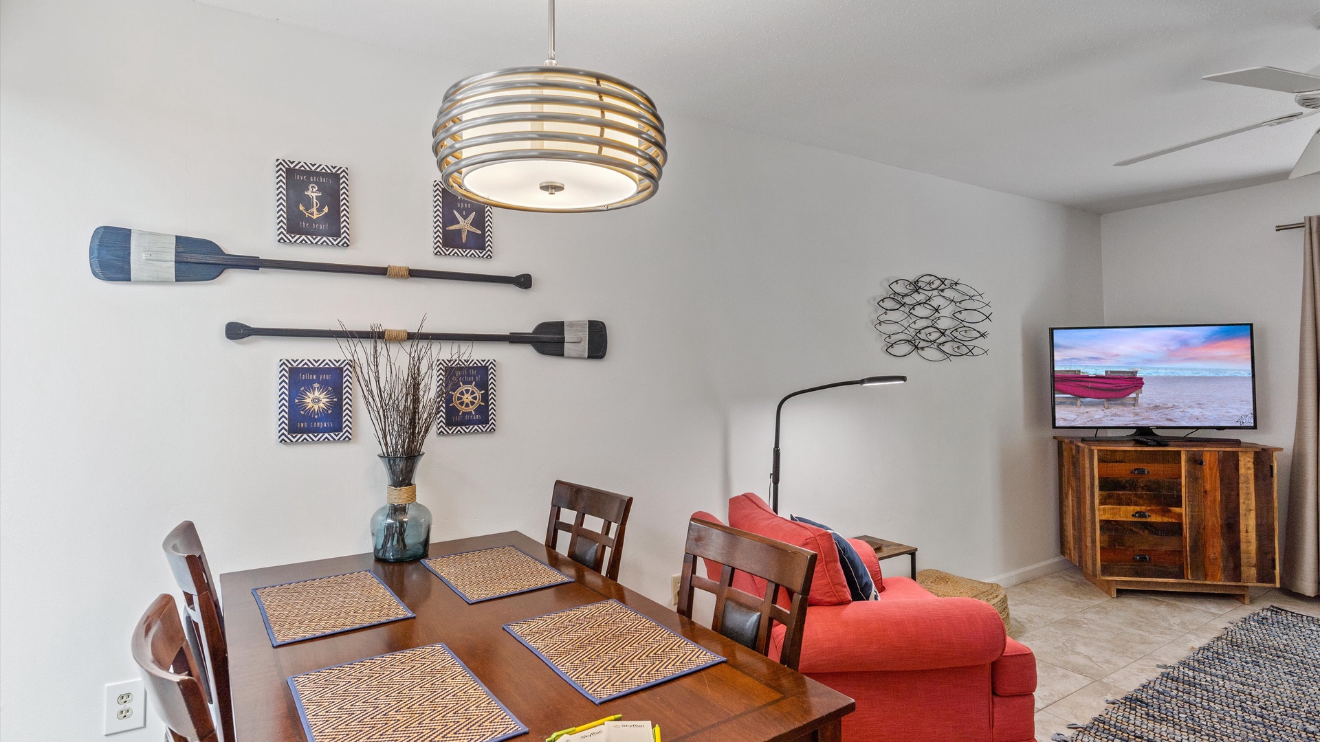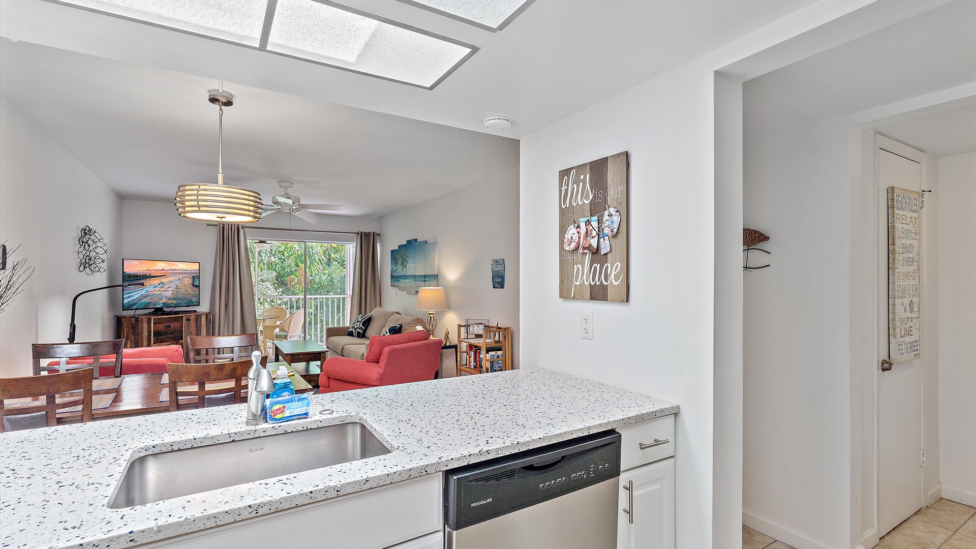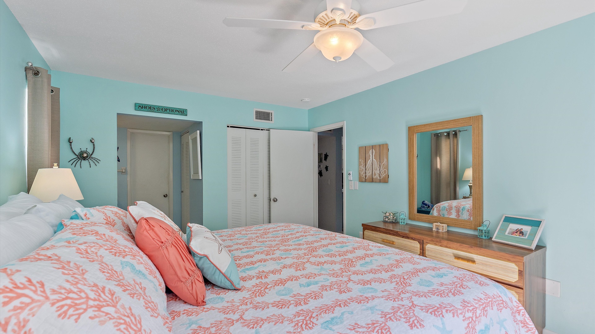 It’s a Shore Thing at Beach Castle #14 Home Florida Sarasota It's a Shore Thing at Beach Castle #14 It's a Shore Thing at Beach Castle #14 A cozy living room with a gray sofa, blue cushions, a wooden coffee table, a TV on a wooden stand, a ceiling fan, beach-themed artwork, and a sliding door leading to a balcony with outdoor seating. A bedroom with turquoise walls, wood furniture, and a bed with coral-themed bedding. The room has a ceiling fan, a TV on a dresser, a window with gray curtains, and beach-themed decor. A small, modern kitchen and dining area with a wood table, four chairs, wall decor of paddles, and nautical-themed art. The kitchen features a stainless steel refrigerator and an open shelf design. A modern kitchen featuring a stainless steel refrigerator, stove, and microwave, blue tiled backsplash, white cabinets, and a speckled countertop with a sink. Outdoor swimming pool and hot tub surrounded by lounge chairs, palm trees, and greenery, with a yellow building in the background under a blue sky. Open Gallery A cozy living room with a gray sofa, blue cushions, a wooden coffee table, a TV on a wooden stand, a ceiling fan, beach-themed artwork, and a sliding door leading to a balcony with outdoor seating. A bedroom with turquoise walls, wood furniture, and a bed with coral-themed bedding. The room has a ceiling fan, a TV on a dresser, a window with gray curtains, and beach-themed decor. A small, modern kitchen and dining area with a wood table, four chairs, wall decor of paddles, and nautical-themed art. The kitchen features a stainless steel refrigerator and an open shelf design. A modern kitchen featuring a stainless steel refrigerator, stove, and microwave, blue tiled backsplash, white cabinets, and a speckled countertop with a sink. Outdoor swimming pool and hot tub surrounded by lounge chairs, palm trees, and greenery, with a yellow building in the background under a blue sky. A screened-in porch with a glass table and wicker chairs overlooks lush greenery. A tropical-style ceiling fan is mounted above. A sandy path leads through grass to a beach with a few people near the water, under a clear blue sky with some clouds. A grassy lawn leads to a wooden dock extending into a body of water, with trees and bushes on both sides under a blue sky with scattered clouds. A yellow two-story building with closed white shutters, a balcony, and surrounded by various tropical plants. A gravel pathway and landscaped garden are visible in the foreground. A living room with a beige sofa, red armchair, and blue-patterned cushions. Beach-themed wall art features palm trees and ocean. A side table with a lamp and small decor items is also visible. A cozy living room features a ceiling fan, a wall-mounted TV, a beige sofa, and red armchairs. A sliding glass door leads to a small balcony with garden views. The room is decorated with beach-themed art. A living room with two red armchairs, blue pillows, a brown coffee table, a floor lamp, and a ceiling fan. The background shows an open kitchen and dining area with a wooden table and chairs. A living room and dining area featuring a dining table with place settings, armchairs, a TV, ceiling fan, artwork on the walls, and a large window with a view of greenery outside. A dining area with a wooden table set for four and nautical wall decor. To the right, a red couch faces a TV on a wooden stand. A modern light fixture hangs above the table. A cozy living room with red armchairs, a side table with a lamp, and nautical-themed decor. The room leads into a small kitchen with a dining counter and wooden chairs. A modern kitchen and dining area with white cabinets, stainless steel appliances, a granite countertop, a wooden dining table, and nautical-themed wall decor. A view from a kitchen with white cabinets and granite counters into a living room with red and beige furniture, a wall-mounted TV, and a balcony view. A wall sign reads "this is our happy place. Modern kitchen featuring white cabinets, stainless steel appliances, a speckled countertop, sink, and a decorative sign on the wall. Modern kitchen with white cabinets, stainless steel appliances, and a speckled countertop. Decorative nautical elements are on the wall, including a blue turtle and paddle. Dining table in the background. Modern kitchen with white cabinets, granite countertops, and stainless steel sink, adjacent to a dining area with a wooden table and chairs, and a living room with a red couch and TV, leading to a balcony. A modern kitchen features a stainless steel stove with a microwave above it, a coffee maker, toaster, knife block, and a decorative turtle on the wall. The backsplash is a mosaic of small blue tiles. A modern kitchen with white cabinets, a stainless steel microwave, and an electric stove. On the counter are a coffee maker, mugs, and a basket. The background shows a dining area and a wall-mounted TV. Modern open-plan kitchen and living room with granite countertops, dining table, and seating area with red couches and a TV. A balcony with greenery is visible through the sliding glass doors. A kitchen hallway with a metallic refrigerator on the right, a white tiled floor, and a sign on the wall with the text "this is our happy place." A door and a patterned shower curtain are visible in the distance. A bedroom with aqua-colored walls features a large bed with a coral-patterned comforter, two nightstands with lamps, a ceiling fan, and a window with beige curtains. A seascape artwork hangs above the bed. A bedroom with a large bed featuring coral pattern bedding. The walls are painted light blue with beach-themed decorations. A doorway leads to a bathroom with white cabinetry and a fish wall decor. A bedroom featuring a bed with coral-patterned bedding, a ceiling fan, a dresser with a mirror, and light blue walls. A closet and open doors are visible in the background. A bathroom with a speckled countertop, a sink, a rolled towel, toiletries, a mirror, a colorful fish
