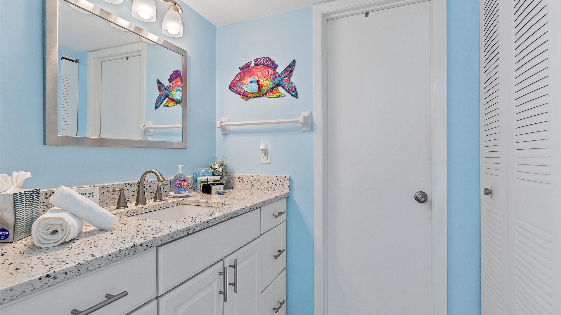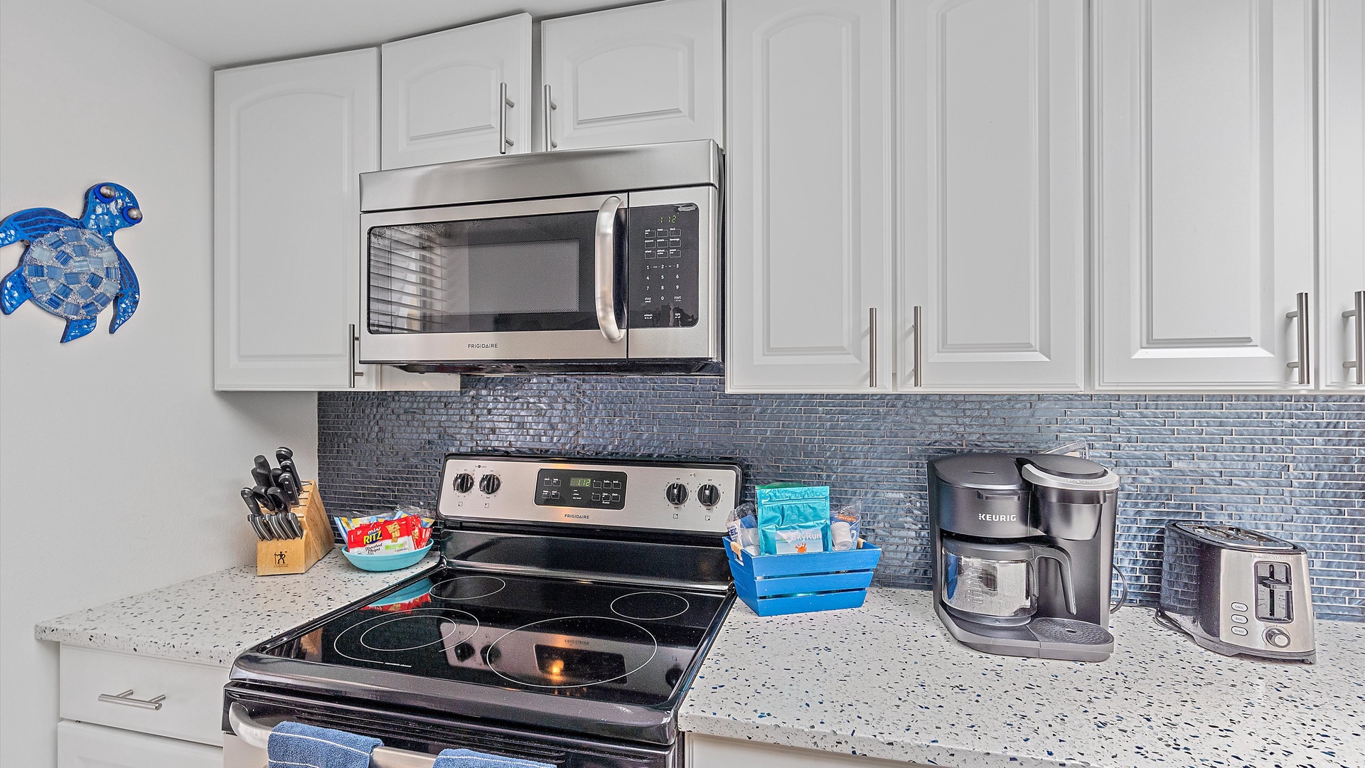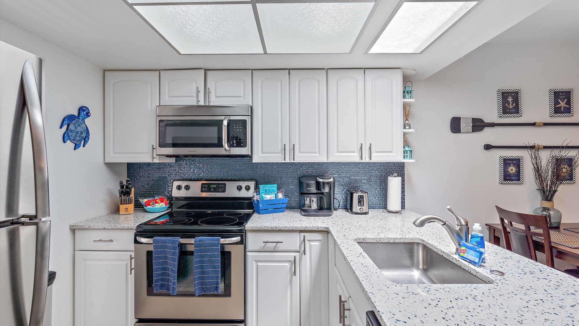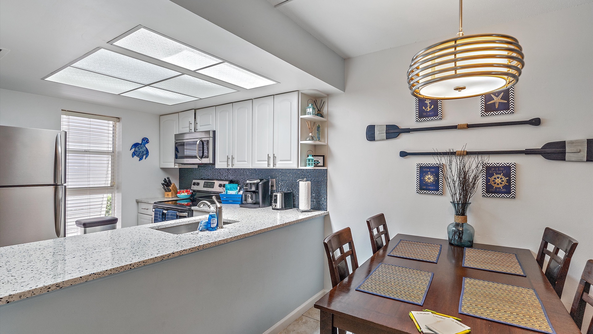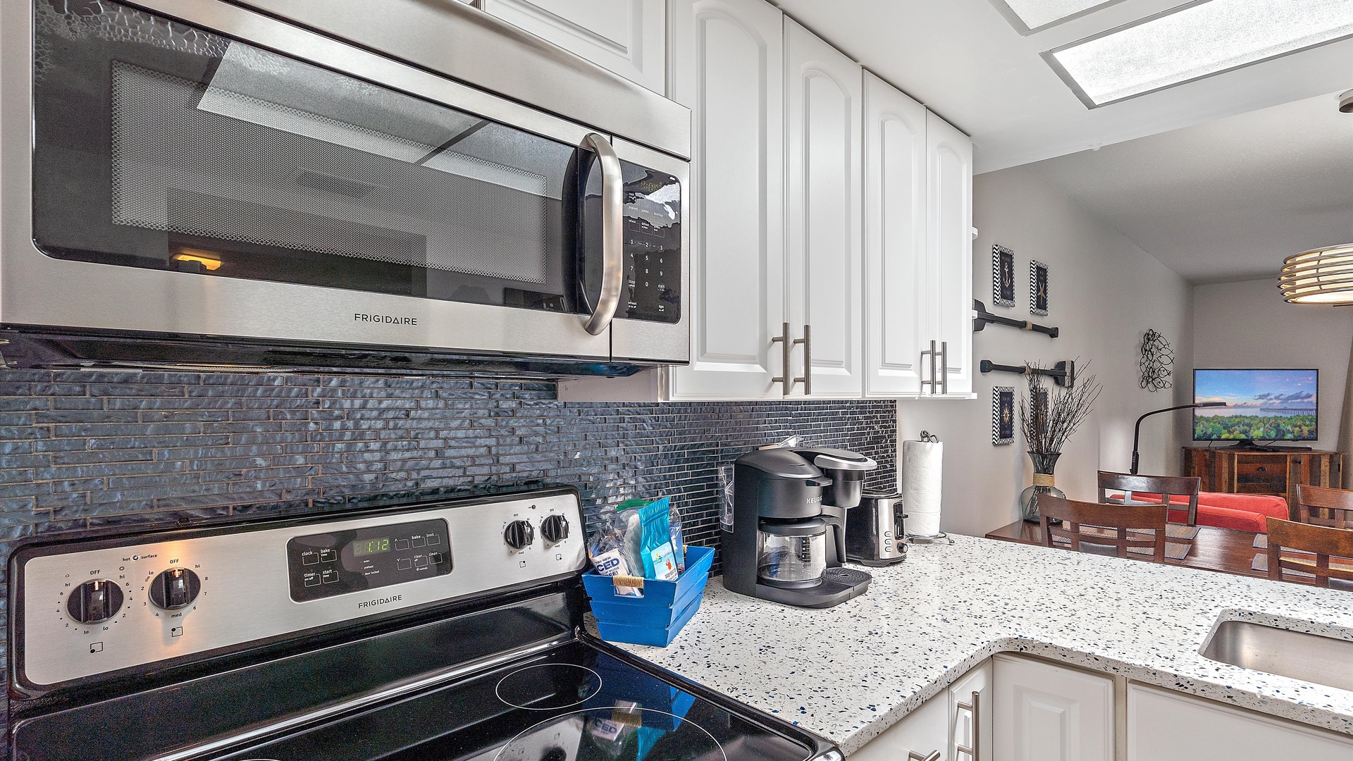 It’s a Shore Thing at Beach Castle #14 Home Florida Sarasota It's a Shore Thing at Beach Castle #14 It's a Shore Thing at Beach Castle #14 A cozy living room with a gray sofa, blue cushions, a wooden coffee table, a TV on a wooden stand, a ceiling fan, beach-themed artwork, and a sliding door leading to a balcony with outdoor seating. A bedroom with turquoise walls, wood furniture, and a bed with coral-themed bedding. The room has a ceiling fan, a TV on a dresser, a window with gray curtains, and beach-themed decor. A small, modern kitchen and dining area with a wood table, four chairs, wall decor of paddles, and nautical-themed art. The kitchen features a stainless steel refrigerator and an open shelf design. A modern kitchen featuring a stainless steel refrigerator, stove, and microwave, blue tiled backsplash, white cabinets, and a speckled countertop with a sink. Outdoor swimming pool and hot tub surrounded by lounge chairs, palm trees, and greenery, with a yellow building in the background under a blue sky. Open Gallery A cozy living room with a gray sofa, blue cushions, a wooden coffee table, a TV on a wooden stand, a ceiling fan, beach-themed artwork, and a sliding door leading to a balcony with outdoor seating. A bedroom with turquoise walls, wood furniture, and a bed with coral-themed bedding. The room has a ceiling fan, a TV on a dresser, a window with gray curtains, and beach-themed decor. A small, modern kitchen and dining area with a wood table, four chairs, wall decor of paddles, and nautical-themed art. The kitchen features a stainless steel refrigerator and an open shelf design. A modern kitchen featuring a stainless steel refrigerator, stove, and microwave, blue tiled backsplash, white cabinets, and a speckled countertop with a sink. Outdoor swimming pool and hot tub surrounded by lounge chairs, palm trees, and greenery, with a yellow building in the background under a blue sky. A screened-in porch with a glass table and wicker chairs overlooks lush greenery. A tropical-style ceiling fan is mounted above. A sandy path leads through grass to a beach with a few people near the water, under a clear blue sky with some clouds. A grassy lawn leads to a wooden dock extending into a body of water, with trees and bushes on both sides under a blue sky with scattered clouds. A yellow two-story building with closed white shutters, a balcony, and surrounded by various tropical plants. A gravel pathway and landscaped garden are visible in the foreground. A living room with a beige sofa, red armchair, and blue-patterned cushions. Beach-themed wall art features palm trees and ocean. A side table with a lamp and small decor items is also visible. A cozy living room features a ceiling fan, a wall-mounted TV, a beige sofa, and red armchairs. A sliding glass door leads to a small balcony with garden views. The room is decorated with beach-themed art. A living room with two red armchairs, blue pillows, a brown coffee table, a floor lamp, and a ceiling fan. The background shows an open kitchen and dining area with a wooden table and chairs. A living room and dining area featuring a dining table with place settings, armchairs, a TV, ceiling fan, artwork on the walls, and a large window with a view of greenery outside. A dining area with a wooden table set for four and nautical wall decor. To the right, a red couch faces a TV on a wooden stand. A modern light fixture hangs above the table. A cozy living room with red armchairs, a side table with a lamp, and nautical-themed decor. The room leads into a small kitchen with a dining counter and wooden chairs. A modern kitchen and dining area with white cabinets, stainless steel appliances, a granite countertop, a wooden dining table, and nautical-themed wall decor. A view from a kitchen with white cabinets and granite counters into a living room with red and beige furniture, a wall-mounted TV, and a balcony view. A wall sign reads "this is our happy place. Modern kitchen featuring white cabinets, stainless steel appliances, a speckled countertop, sink, and a decorative sign on the wall. Modern kitchen with white cabinets, stainless steel appliances, and a speckled countertop. Decorative nautical elements are on the wall, including a blue turtle and paddle. Dining table in the background. Modern kitchen with white cabinets, granite countertops, and stainless steel sink, adjacent to a dining area with a wooden table and chairs, and a living room with a red couch and TV, leading to a balcony. A modern kitchen features a stainless steel stove with a microwave above it, a coffee maker, toaster, knife block, and a decorative turtle on the wall. The backsplash is a mosaic of small blue tiles. A modern kitchen with white cabinets, a stainless steel microwave, and an electric stove. On the counter are a coffee maker, mugs, and a basket. The background shows a dining area and a wall-mounted TV. Modern open-plan kitchen and living room with granite countertops, dining table, and seating area with red couches and a TV. A balcony with greenery is visible through the sliding glass doors. A kitchen hallway with a metallic refrigerator on the right, a white tiled floor, and a sign on the wall with the text "this is our happy place." A door and a patterned shower curtain are visible in the distance. A bedroom with aqua-colored walls features a large bed with a coral-patterned comforter, two nightstands with lamps, a ceiling fan, and a window with beige curtains. A seascape artwork hangs above the bed. A bedroom with a large bed featuring coral pattern bedding. The walls are painted light blue with beach-themed decorations. A doorway leads to a bathroom with white cabinetry and a fish wall decor. A bedroom featuring a bed with coral-patterned bedding, a ceiling fan, a dresser with a mirror, and light blue walls. A closet and open doors are visible in the background. A bathroom with a speckled countertop, a sink, a rolled towel, toiletries, a mirror, a colorful fish