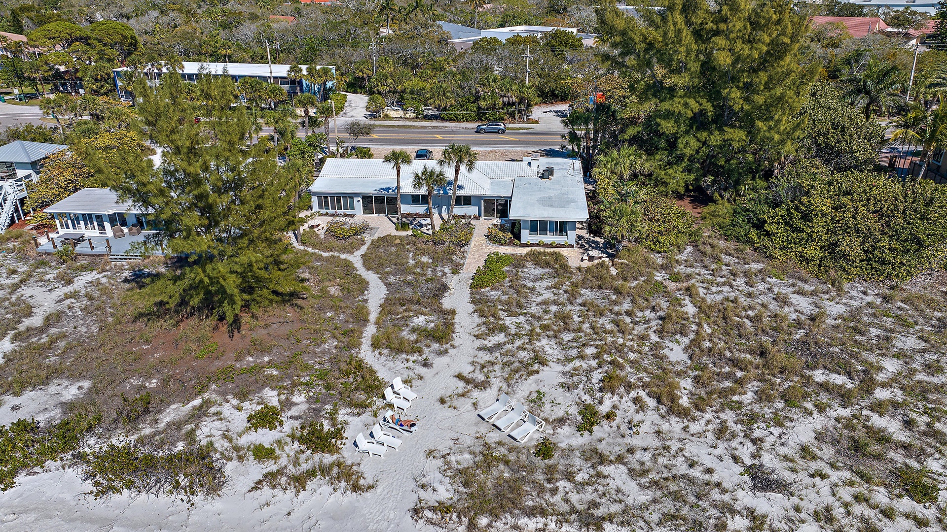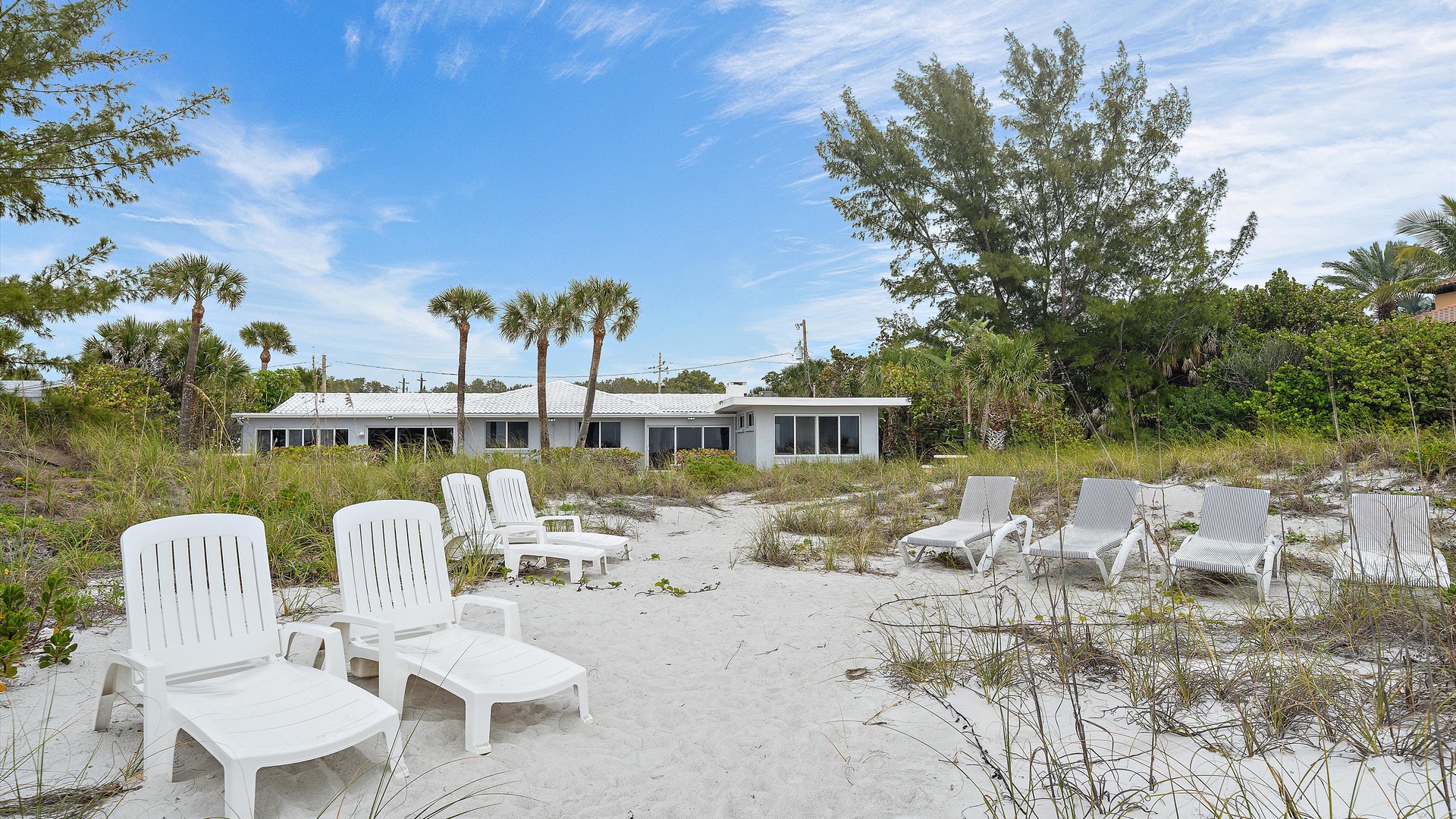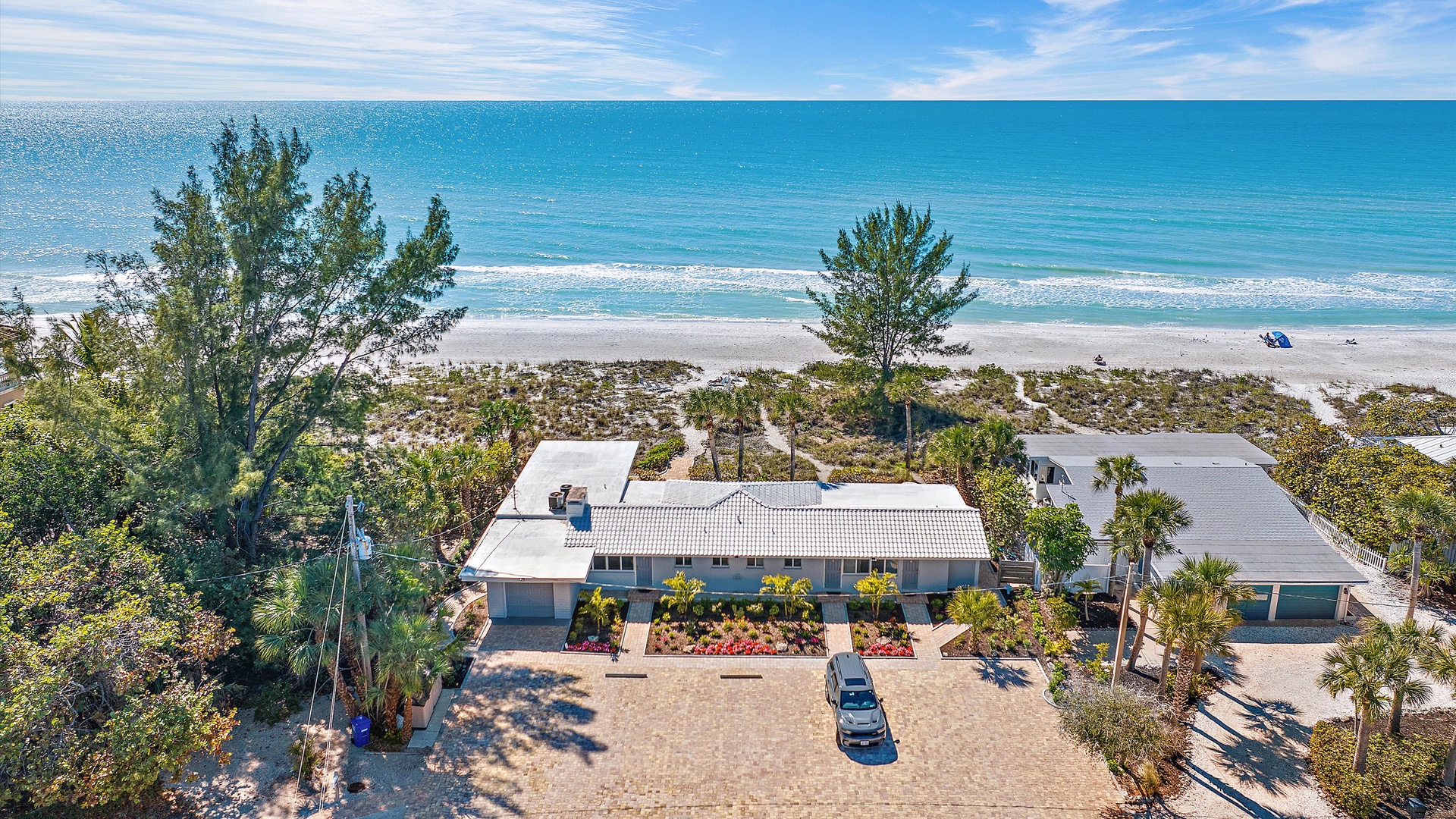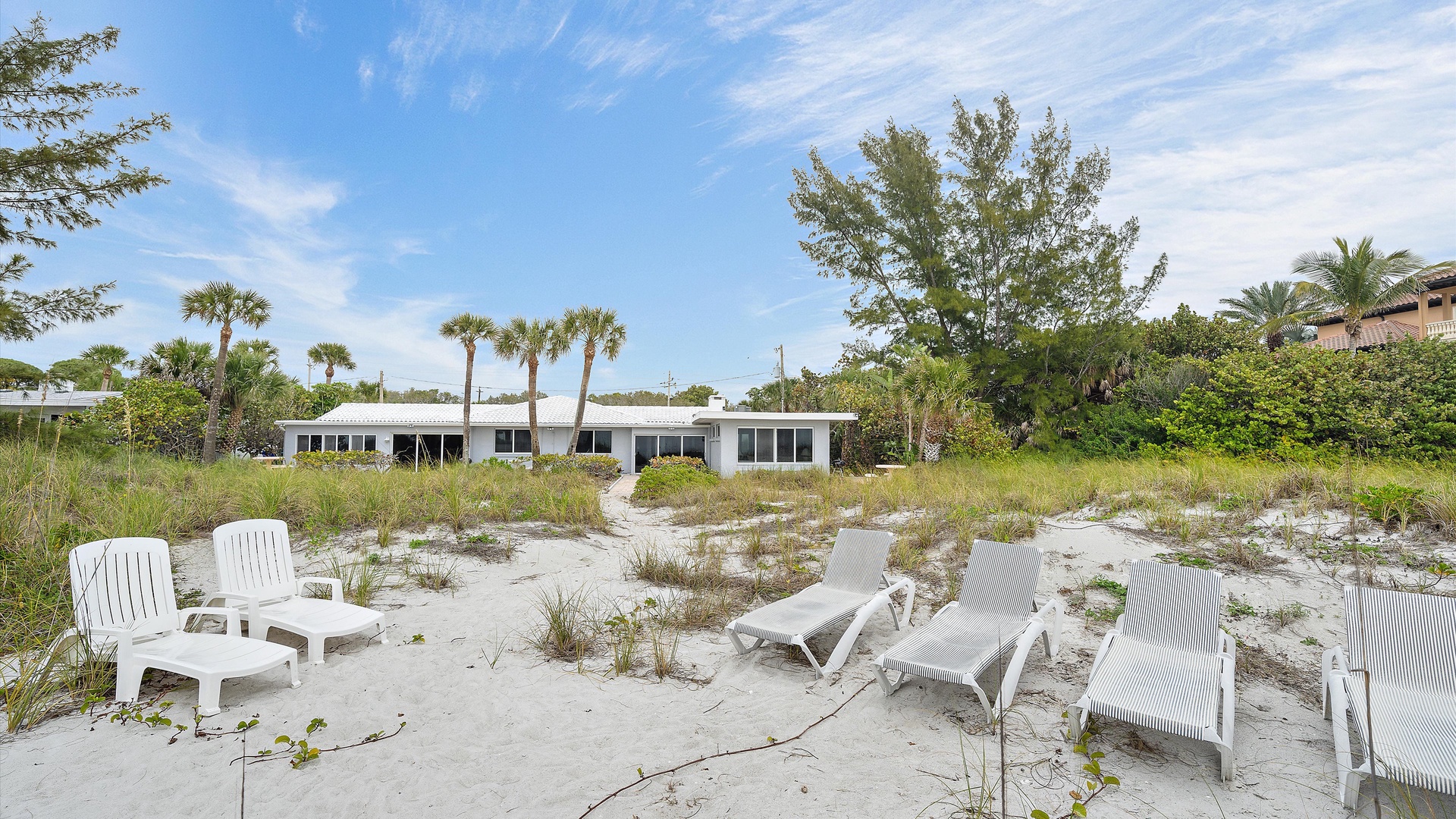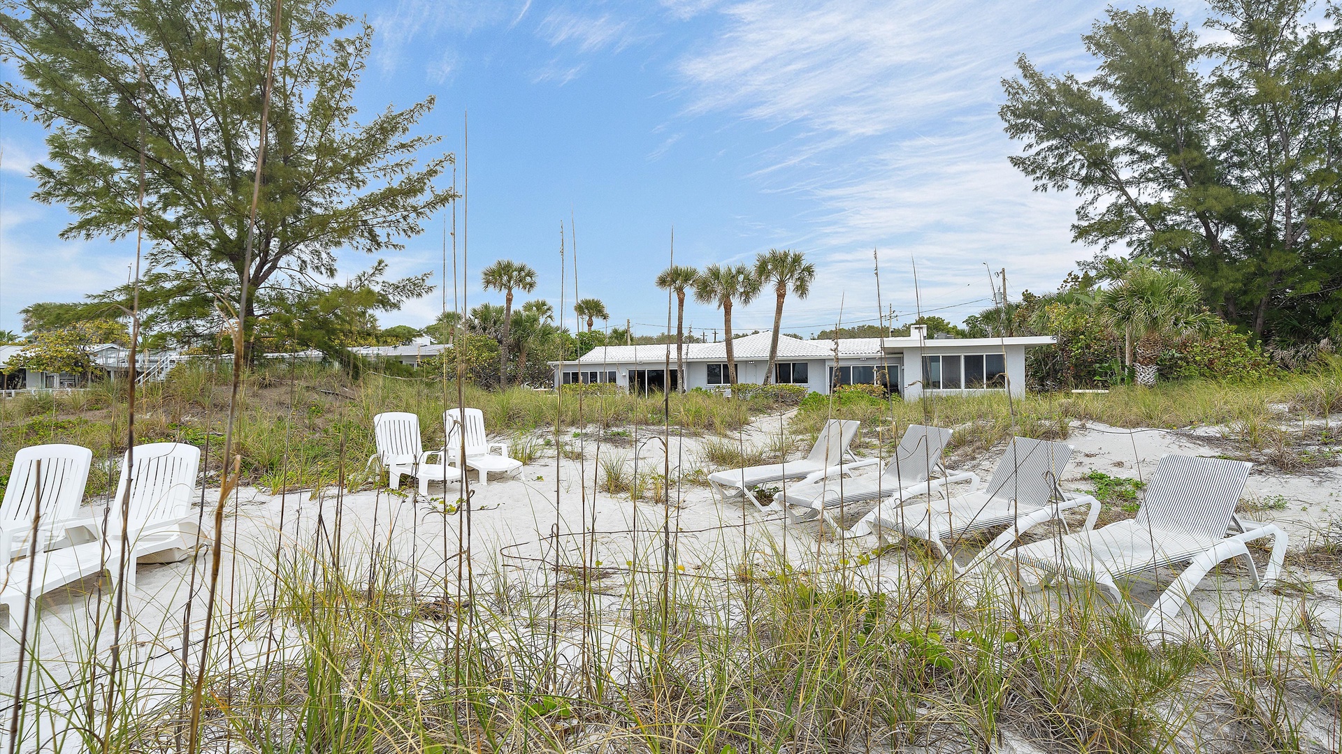 Las Hermanas 3 Home Florida Sarasota Las Hermanas 3 Las Hermanas 3 A cozy living room with a ceiling fan, two white armchairs, a beige sofa, a wooden coffee table, and a TV on a wicker stand. There's a large window and a door leading to a well-lit hallway. A bedroom with a large bed covered in a patterned duvet, a ceiling fan, a window with blinds, framed artwork, a bedside table with a lamp, a chair, and a dresser. A compact kitchen with white cabinets, granite countertops, an electric stove, microwave, refrigerator, and a small sink beneath a window with blinds. A small dining area with a round glass table and four wicker chairs, situated next to large sliding glass doors that open to a patio and garden view. A ceiling fan is mounted above the table. A modern bathroom with a granite countertop, single sink vanity, white bathtub with curtain, white tiled walls, and a window with shutters. There is a towel bar, overhead light, and round mirror. Open Gallery A cozy living room with a ceiling fan, two white armchairs, a beige sofa, a wooden coffee table, and a TV on a wicker stand. There's a large window and a door leading to a well-lit hallway. A bedroom with a large bed covered in a patterned duvet, a ceiling fan, a window with blinds, framed artwork, a bedside table with a lamp, a chair, and a dresser. A compact kitchen with white cabinets, granite countertops, an electric stove, microwave, refrigerator, and a small sink beneath a window with blinds. A small dining area with a round glass table and four wicker chairs, situated next to large sliding glass doors that open to a patio and garden view. A ceiling fan is mounted above the table. A modern bathroom with a granite countertop, single sink vanity, white bathtub with curtain, white tiled walls, and a window with shutters. There is a towel bar, overhead light, and round mirror. Oceanfront property with a sandy beach, a blue ocean, and a clear sky. The house has a driveway with a single car and is surrounded by trees and greenery. White plastic lounge chairs are scattered across a sandy beach area surrounded by tall grass and trees, with several single-story buildings in the background under a partly cloudy sky. A cozy living room with a beige couch, a wooden coffee table, a wall-mounted TV showing a beach scene, and a window letting in natural light. A ceiling fan with wooden blades is above. A cozy living room with beige walls, tiled floor, and a ceiling fan. It features a couch, armchair, coffee table, and a table lamp. An open kitchen with white cabinets is visible in the background. A cozy living room featuring two sofas, a coffee table, a ceiling fan, a small flat-screen TV, framed artwork, and large windows with blinds. A cozy living space with a beige sofa, two patterned pillows, and a lamp by a window with blinds. The room connects to a kitchen area with a bar stool, white cabinets, and a microwave. A cozy living room with a ceiling fan, a beige sofa, a wooden coffee table, a small TV, and a window with blinds. The door is next to the sofa with light streaming in through the window. A cozy living room with two white armchairs, a brown coffee table, and a ceiling fan. A kitchen area with white cabinets is visible in the background. Large windows show an outdoor view. A modern living room with a TV, wicker cabinet, beige sofa, and wall art. A granite countertop with white cabinetry is in the foreground. Windows with blinds bring in natural light. A compact kitchen with white cabinets, granite countertops, an electric stove, a microwave, and a small window with white blinds, offering a view of greenery outside. A compact kitchen with white cabinets, beige walls, granite countertops, an electric stove, a microwave, a small sink, and a window with white blinds offering a view of greenery outside. A kitchen with white cabinets, granite countertops, an electric stovetop, and a white microwave above it. A small door leads to another room in the background. A kitchen with beige walls and tile flooring features white cabinets, a white stove, a microwave, and a granite countertop. There's a framed picture on the wall and a hallway with a louvered door on the right. A cozy living room with a ceiling fan, white furniture, a wooden coffee table, and a TV displaying a scenic view. Large windows with blinds allow natural light. A kitchen countertop is in the foreground. A cozy living room features two white armchairs, a wooden coffee table, a wicker TV stand with a flat-screen TV, and a ceiling fan. The room opens to a sunroom with large windows and a table lamp. A cozy living area with white furniture and blue pillows, a wooden side table with a lit lamp, a window with blinds, and an open door leading to a bright, tiled sunroom. A sunlit room with light beige walls featuring a glass-top dining table and four wicker and wood chairs, a ceiling fan above, and large windows with a view into another room. A sunlit room with tiled flooring features a glass-topped table surrounded by wicker chairs, a ceiling fan above, large windows with an outdoor view, and an open door leading to another room. A sunroom with a glass table and four wicker chairs, a cushioned lounge chair, tiled floor, ceiling fan with light, and large sliding glass doors leading to an outdoor patio area. View through a glass sliding door to a patio with a grill, chairs, table, and greenery. Beyond the patio, there are trees, bushes, and a view of the sky and ocean. A sunroom with a ceiling fan, round glass table, four wicker chairs, and tiled floors. The room has large windows and an open doorway leading to an adjacent area. A sunroom with a wicker chair, a small table holding a microwave and fruit basket, large windows with blinds, and a glass-paneled door leading into the room. Bedroom with King bed Bedroom with King bed Bedroom with King bed A hallway leads to a bedroom; a wooden mirror and cabinet stand on the left with a "BEACH" sign, and a blue floral bedspread is visible t