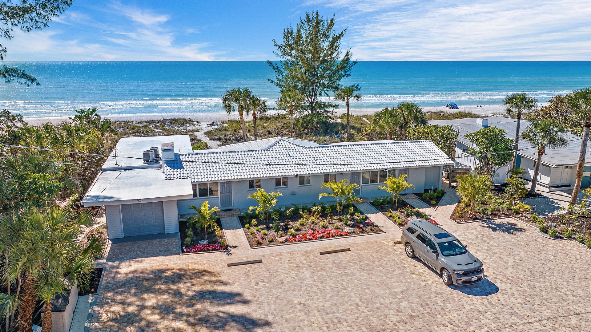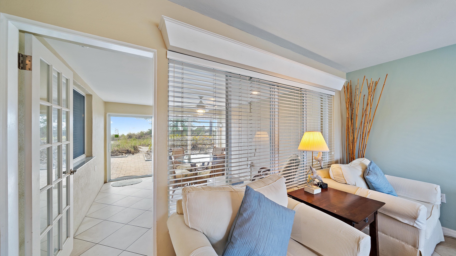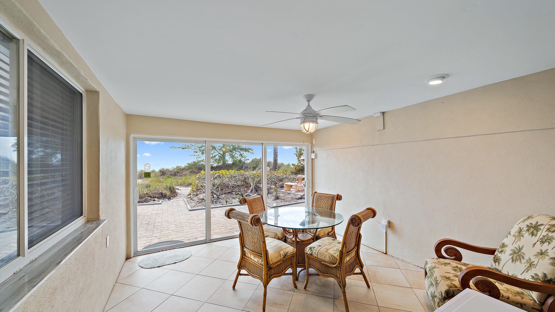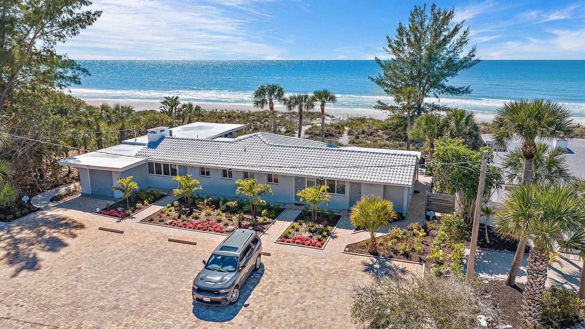 Las Hermanas 3 Home Florida Sarasota Las Hermanas 3 Las Hermanas 3 A cozy living room with a ceiling fan, two white armchairs, a beige sofa, a wooden coffee table, and a TV on a wicker stand. There's a large window and a door leading to a well-lit hallway. A bedroom with a large bed covered in a patterned duvet, a ceiling fan, a window with blinds, framed artwork, a bedside table with a lamp, a chair, and a dresser. A compact kitchen with white cabinets, granite countertops, an electric stove, microwave, refrigerator, and a small sink beneath a window with blinds. A small dining area with a round glass table and four wicker chairs, situated next to large sliding glass doors that open to a patio and garden view. A ceiling fan is mounted above the table. A modern bathroom with a granite countertop, single sink vanity, white bathtub with curtain, white tiled walls, and a window with shutters. There is a towel bar, overhead light, and round mirror. Open Gallery A cozy living room with a ceiling fan, two white armchairs, a beige sofa, a wooden coffee table, and a TV on a wicker stand. There's a large window and a door leading to a well-lit hallway. A bedroom with a large bed covered in a patterned duvet, a ceiling fan, a window with blinds, framed artwork, a bedside table with a lamp, a chair, and a dresser. A compact kitchen with white cabinets, granite countertops, an electric stove, microwave, refrigerator, and a small sink beneath a window with blinds. A small dining area with a round glass table and four wicker chairs, situated next to large sliding glass doors that open to a patio and garden view. A ceiling fan is mounted above the table. A modern bathroom with a granite countertop, single sink vanity, white bathtub with curtain, white tiled walls, and a window with shutters. There is a towel bar, overhead light, and round mirror. Oceanfront property with a sandy beach, a blue ocean, and a clear sky. The house has a driveway with a single car and is surrounded by trees and greenery. White plastic lounge chairs are scattered across a sandy beach area surrounded by tall grass and trees, with several single-story buildings in the background under a partly cloudy sky. A cozy living room with a beige couch, a wooden coffee table, a wall-mounted TV showing a beach scene, and a window letting in natural light. A ceiling fan with wooden blades is above. A cozy living room with beige walls, tiled floor, and a ceiling fan. It features a couch, armchair, coffee table, and a table lamp. An open kitchen with white cabinets is visible in the background. A cozy living room featuring two sofas, a coffee table, a ceiling fan, a small flat-screen TV, framed artwork, and large windows with blinds. A cozy living space with a beige sofa, two patterned pillows, and a lamp by a window with blinds. The room connects to a kitchen area with a bar stool, white cabinets, and a microwave. A cozy living room with a ceiling fan, a beige sofa, a wooden coffee table, a small TV, and a window with blinds. The door is next to the sofa with light streaming in through the window. A cozy living room with two white armchairs, a brown coffee table, and a ceiling fan. A kitchen area with white cabinets is visible in the background. Large windows show an outdoor view. A modern living room with a TV, wicker cabinet, beige sofa, and wall art. A granite countertop with white cabinetry is in the foreground. Windows with blinds bring in natural light. A compact kitchen with white cabinets, granite countertops, an electric stove, a microwave, and a small window with white blinds, offering a view of greenery outside. A compact kitchen with white cabinets, beige walls, granite countertops, an electric stove, a microwave, a small sink, and a window with white blinds offering a view of greenery outside. A kitchen with white cabinets, granite countertops, an electric stovetop, and a white microwave above it. A small door leads to another room in the background. A kitchen with beige walls and tile flooring features white cabinets, a white stove, a microwave, and a granite countertop. There's a framed picture on the wall and a hallway with a louvered door on the right. A cozy living room with a ceiling fan, white furniture, a wooden coffee table, and a TV displaying a scenic view. Large windows with blinds allow natural light. A kitchen countertop is in the foreground. A cozy living room features two white armchairs, a wooden coffee table, a wicker TV stand with a flat-screen TV, and a ceiling fan. The room opens to a sunroom with large windows and a table lamp. A cozy living area with white furniture and blue pillows, a wooden side table with a lit lamp, a window with blinds, and an open door leading to a bright, tiled sunroom. A sunlit room with light beige walls featuring a glass-top dining table and four wicker and wood chairs, a ceiling fan above, and large windows with a view into another room. A sunlit room with tiled flooring features a glass-topped table surrounded by wicker chairs, a ceiling fan above, large windows with an outdoor view, and an open door leading to another room. A sunroom with a glass table and four wicker chairs, a cushioned lounge chair, tiled floor, ceiling fan with light, and large sliding glass doors leading to an outdoor patio area. View through a glass sliding door to a patio with a grill, chairs, table, and greenery. Beyond the patio, there are trees, bushes, and a view of the sky and ocean. A sunroom with a ceiling fan, round glass table, four wicker chairs, and tiled floors. The room has large windows and an open doorway leading to an adjacent area. A sunroom with a wicker chair, a small table holding a microwave and fruit basket, large windows with blinds, and a glass-paneled door leading into the room. Bedroom with King bed Bedroom with King bed Bedroom with King bed A hallway leads to a bedroom; a wooden mirror and cabinet stand on the left with a "BEACH" sign, and a blue floral bedspread is visible t
